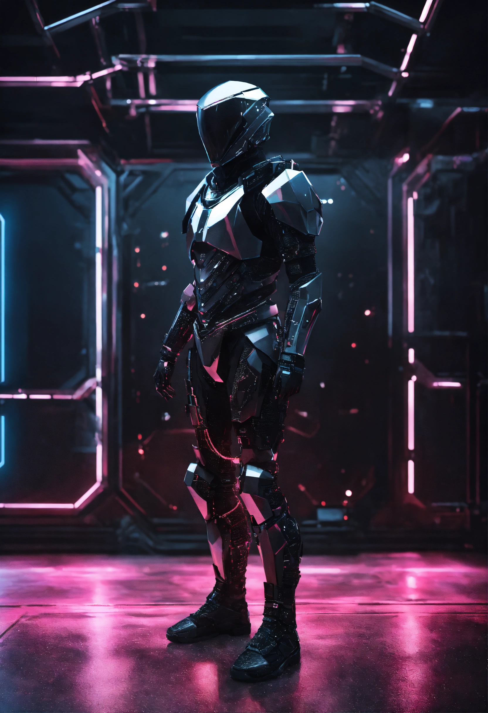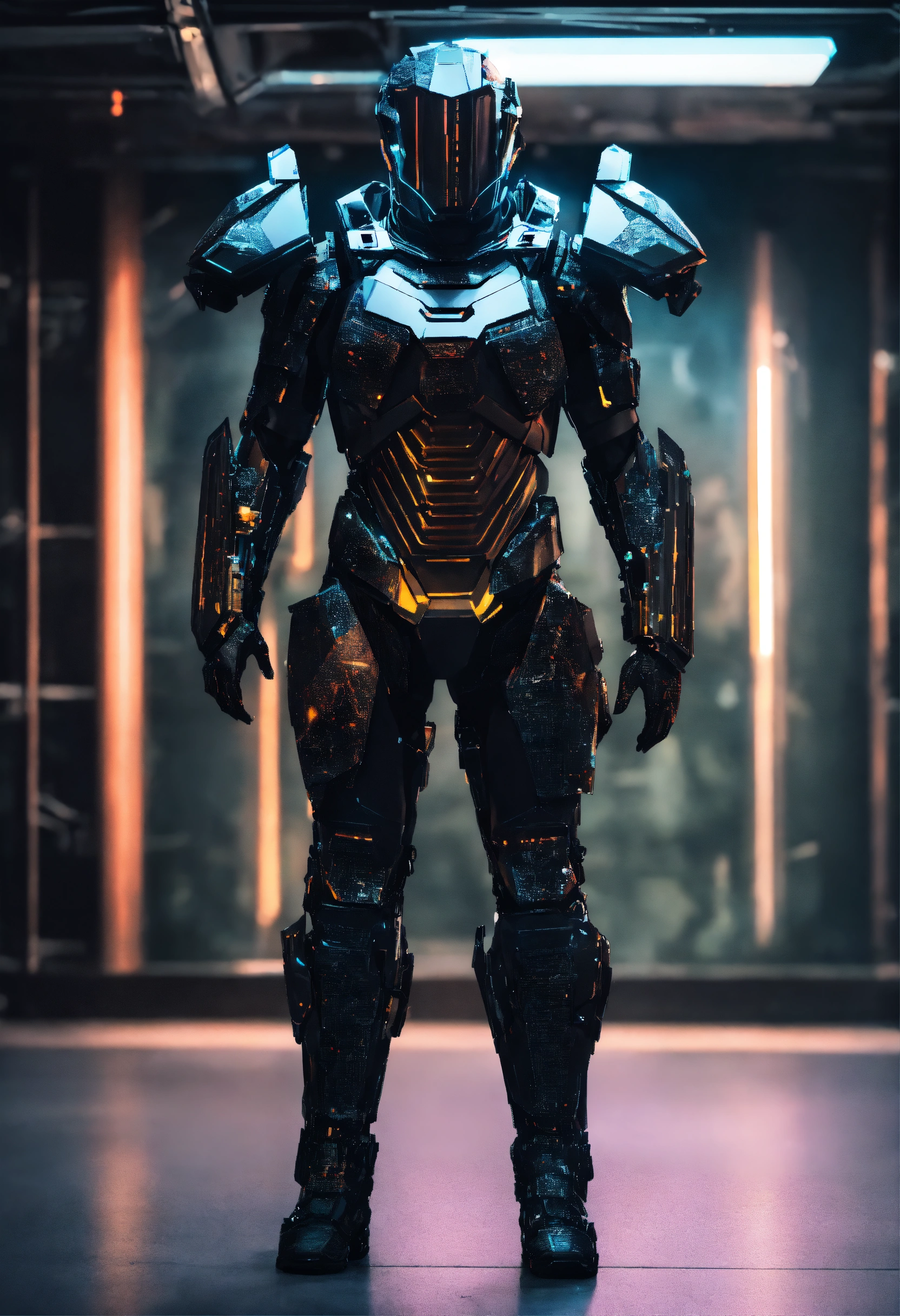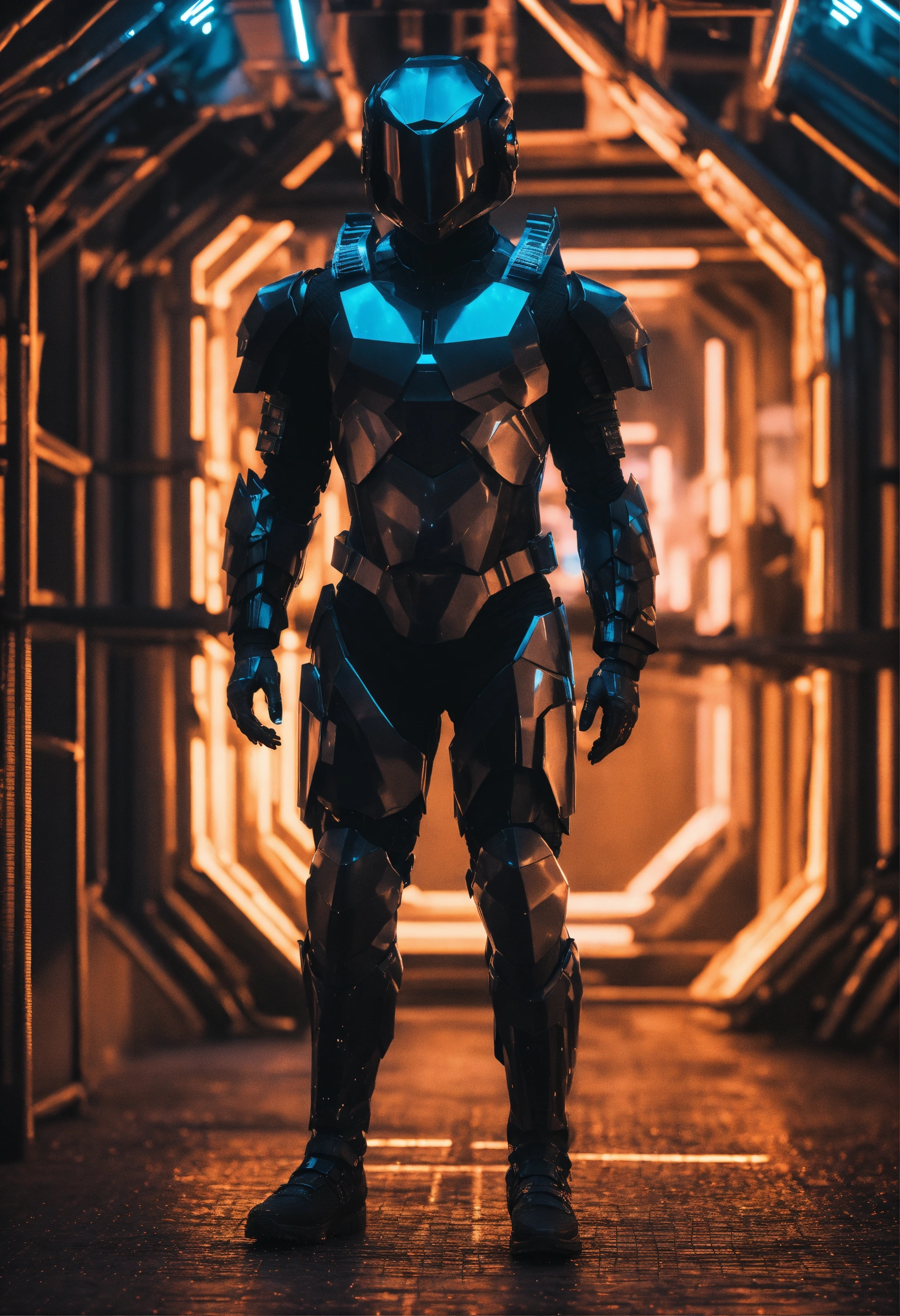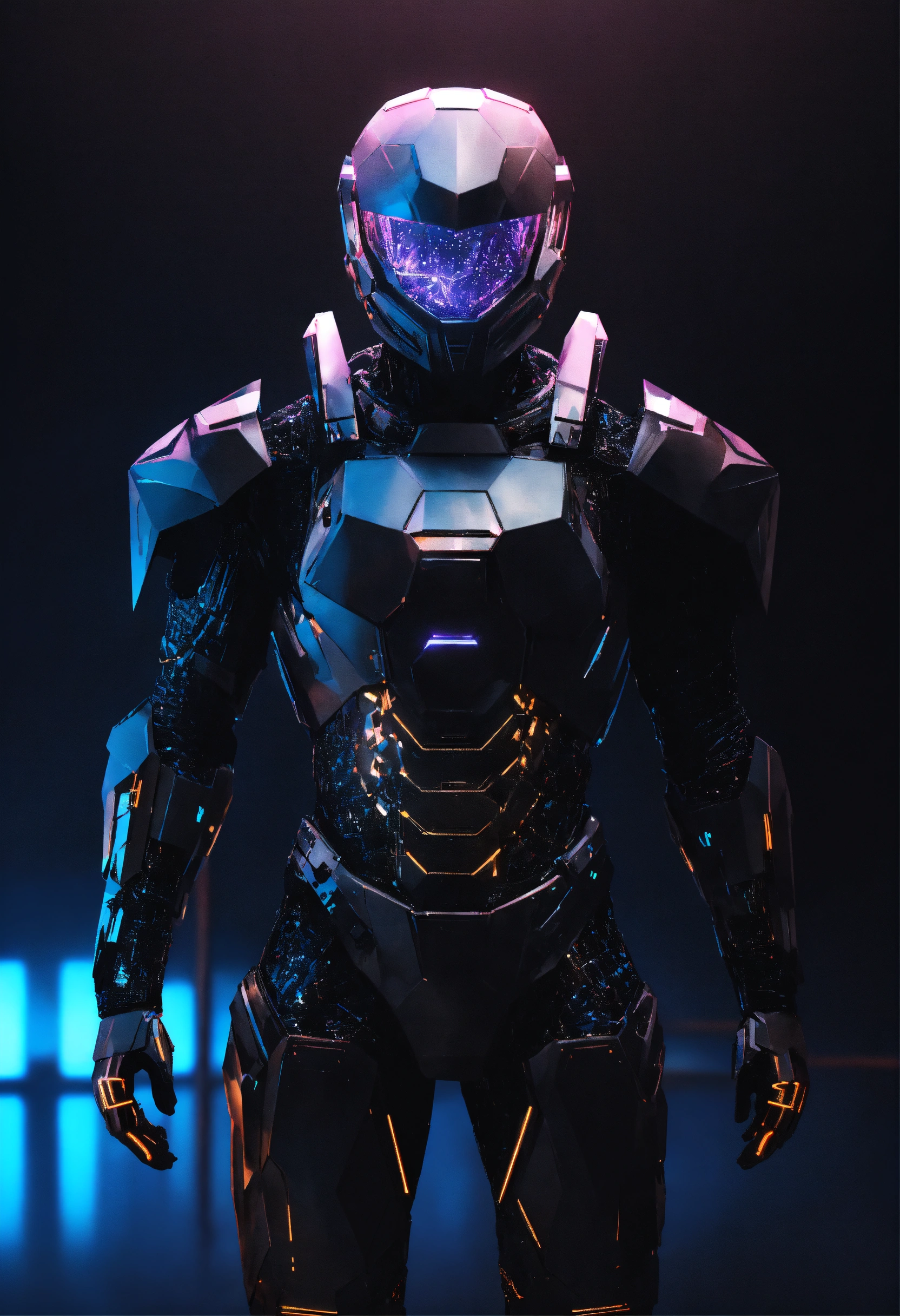 An ultrarealistic full body photograph from the front of a futuristic full body armor made of black polymer and some crystal, gradient, fully crystal hull, for a man, visible wires, mate black torso, imposing, elegant, modern minimalism, low poly lines, dreamy, dystopia, godlike, mysterious, scary. a dark room in the background.