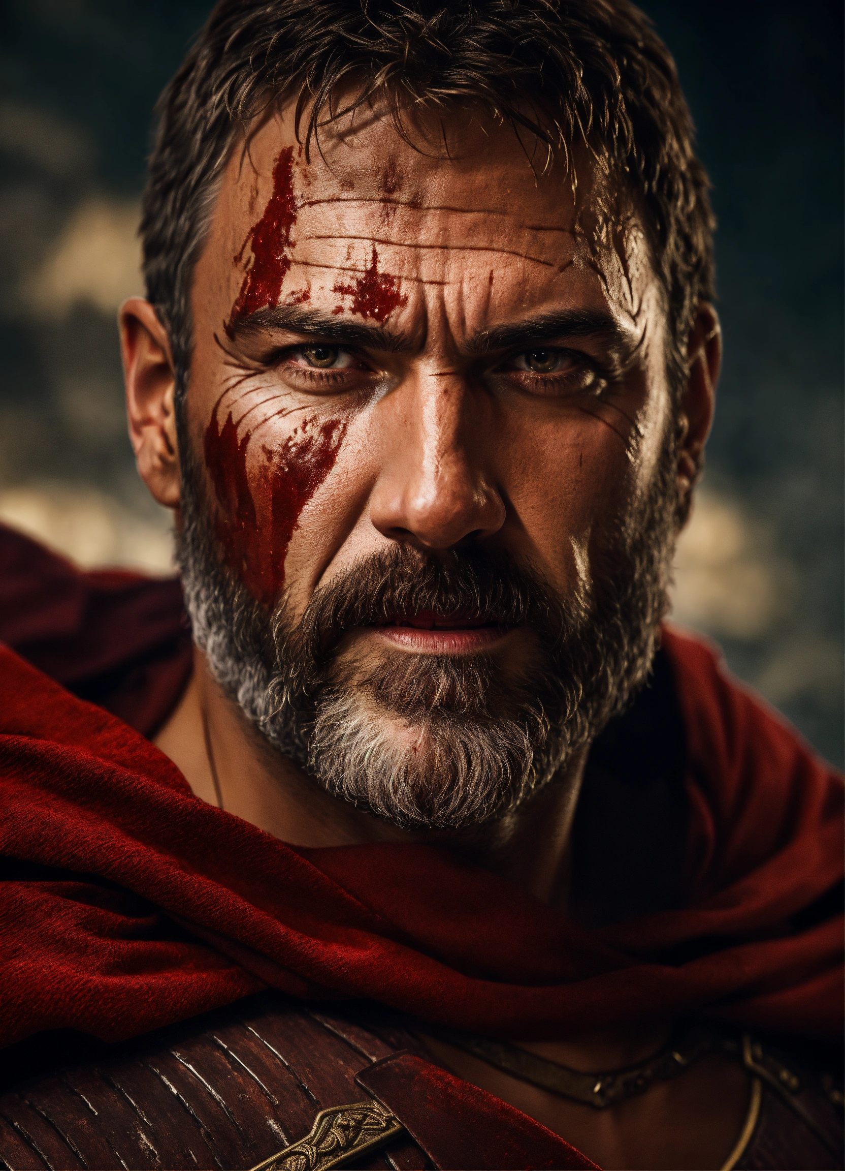 Realistic, a gladiator, strong, 58 years old, scar on the face, short beard, dark brown, brown hair, scarlet gladiator robe, evil features, in an arena, war atmosphere, cinematic lighting, energetic