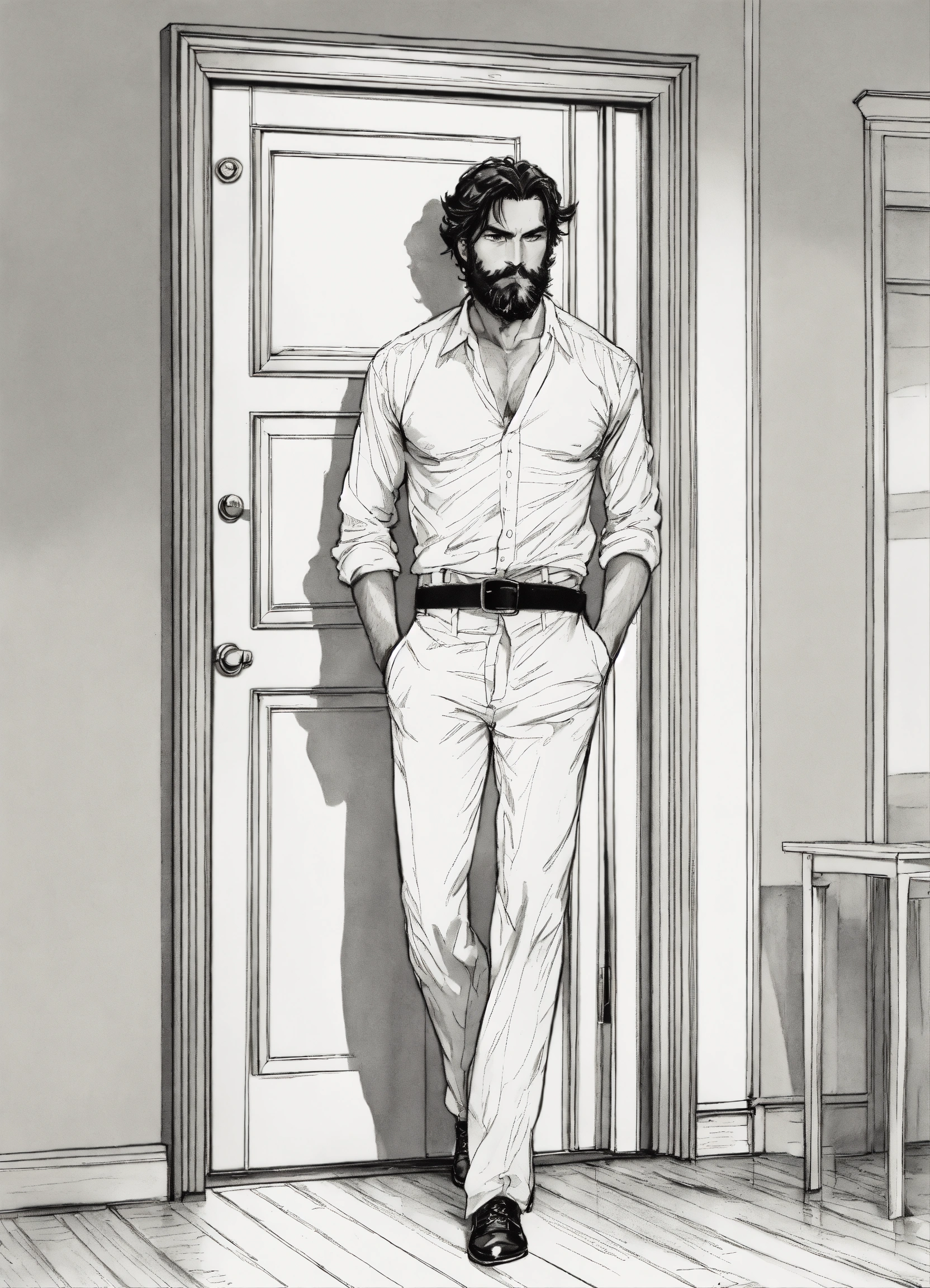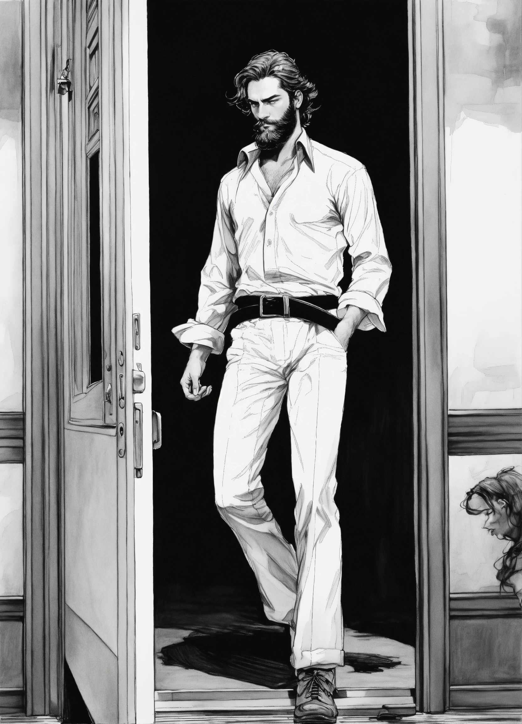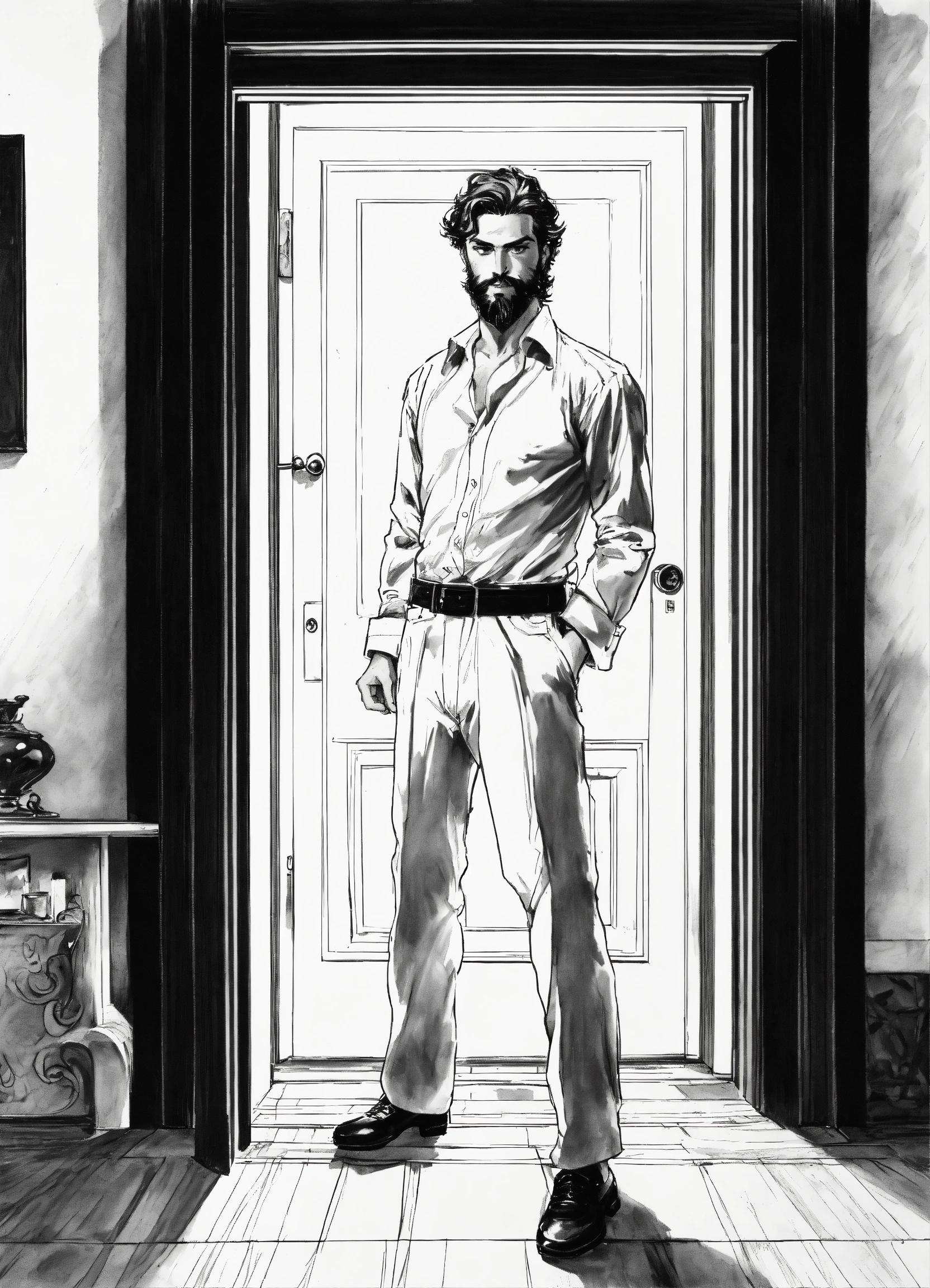 A b/w drawing, milo manara style, a man enters the living room door, dark hair, 2-day beard, white pants and shirt, black belt
