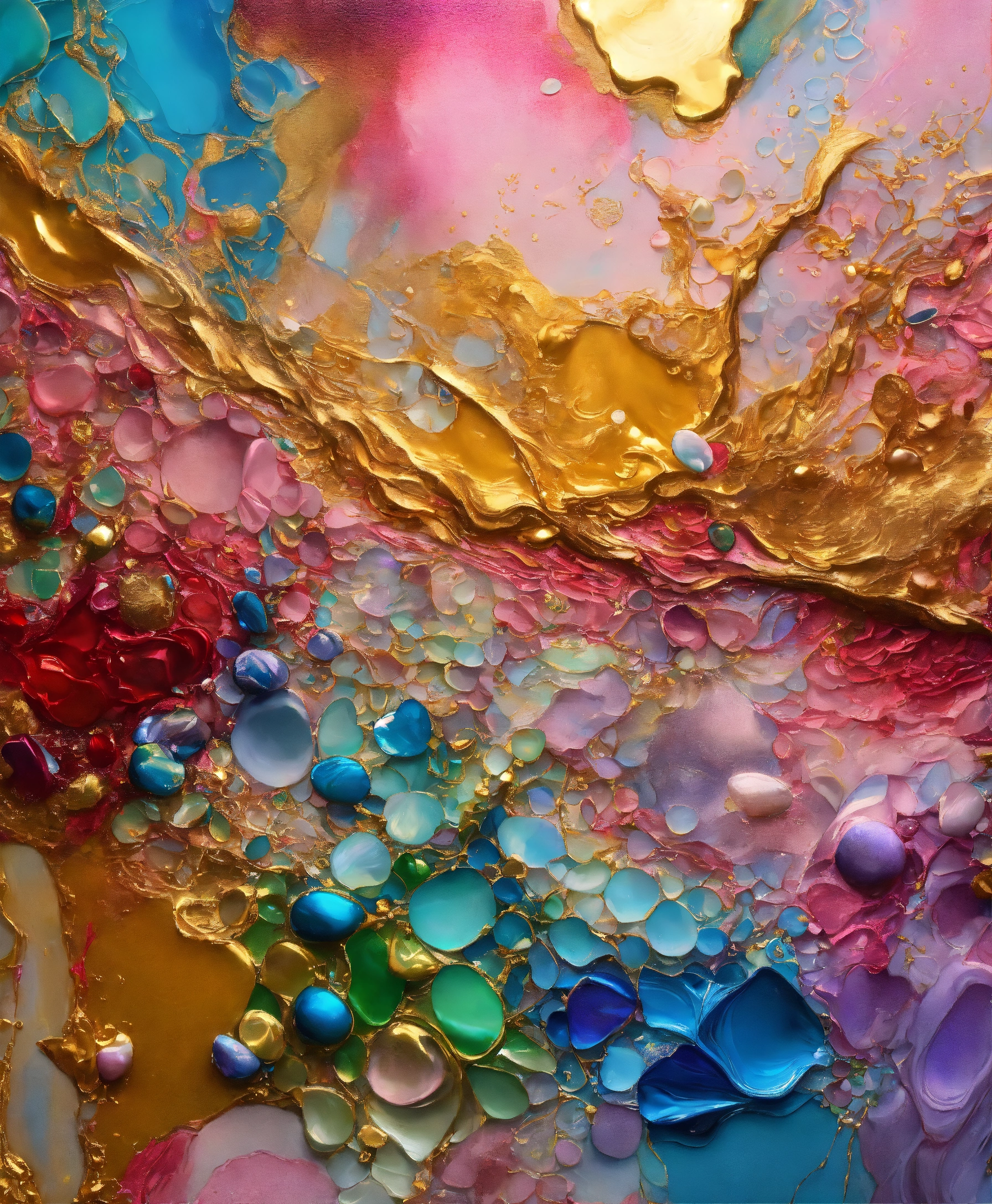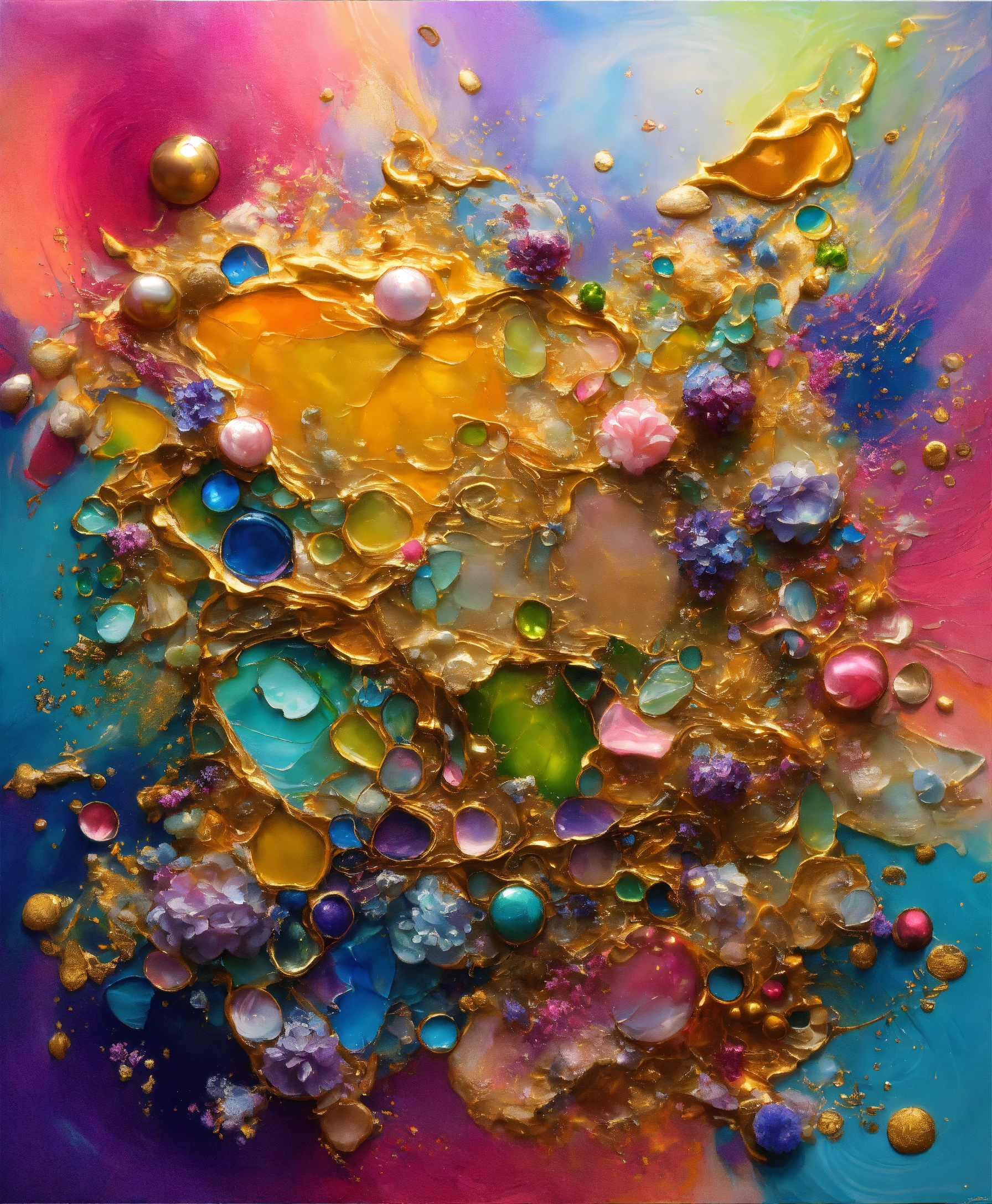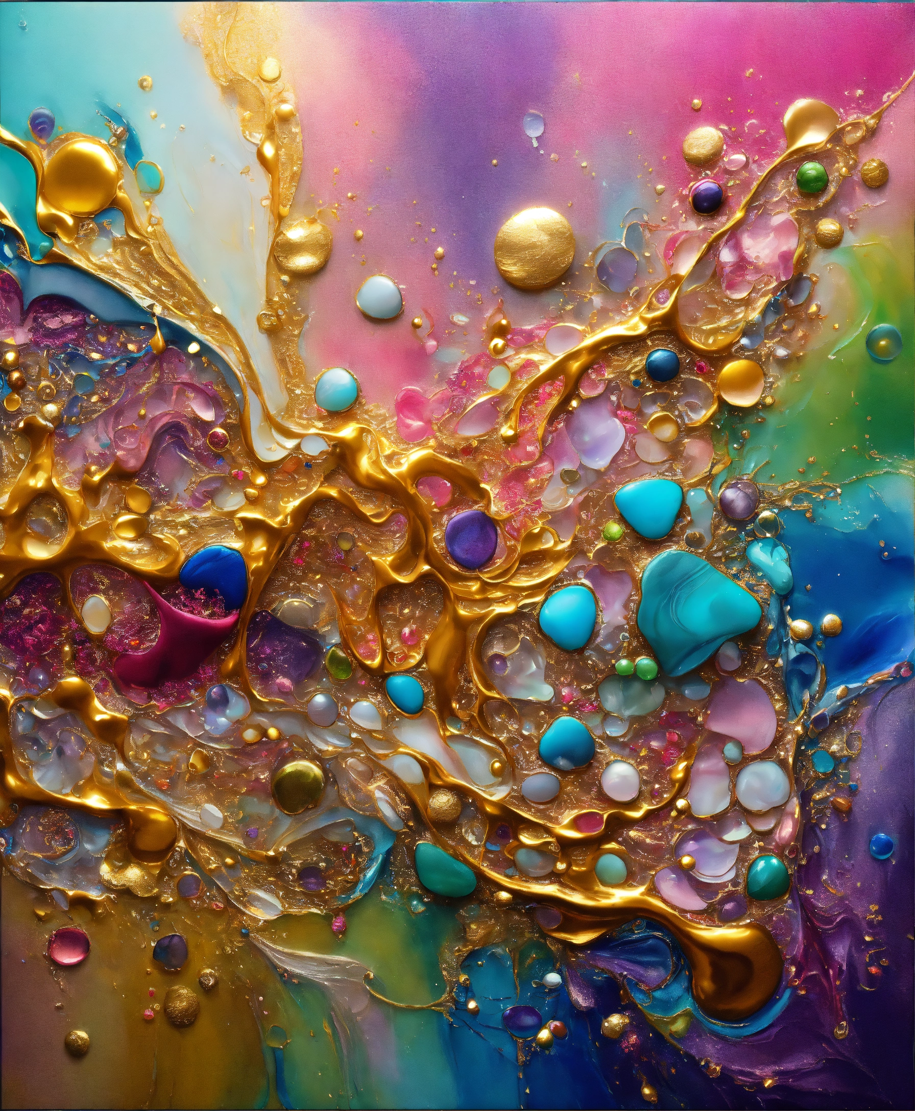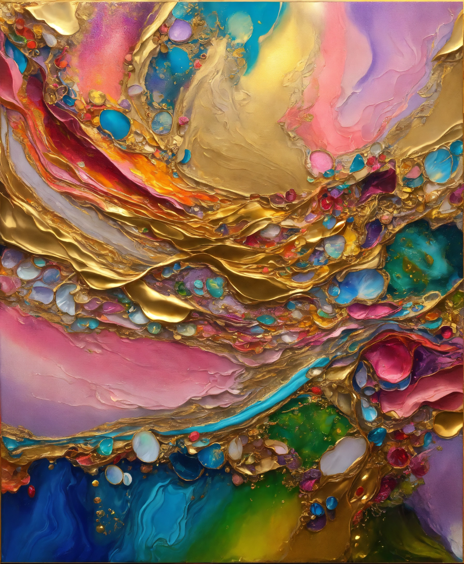 Colorful abstract painting oil and water complex complicated bright vivid colors beautiful opulent wealthy intricate all hues primary secondary and tertiary colors pink peridot sky blue lilac green magenta mother of pearl magnificent amazing sublime delicate hyperdetailed masterpiece complex extraordinary metallic sheen elaborate awesome 24k gold and silver trim 8k