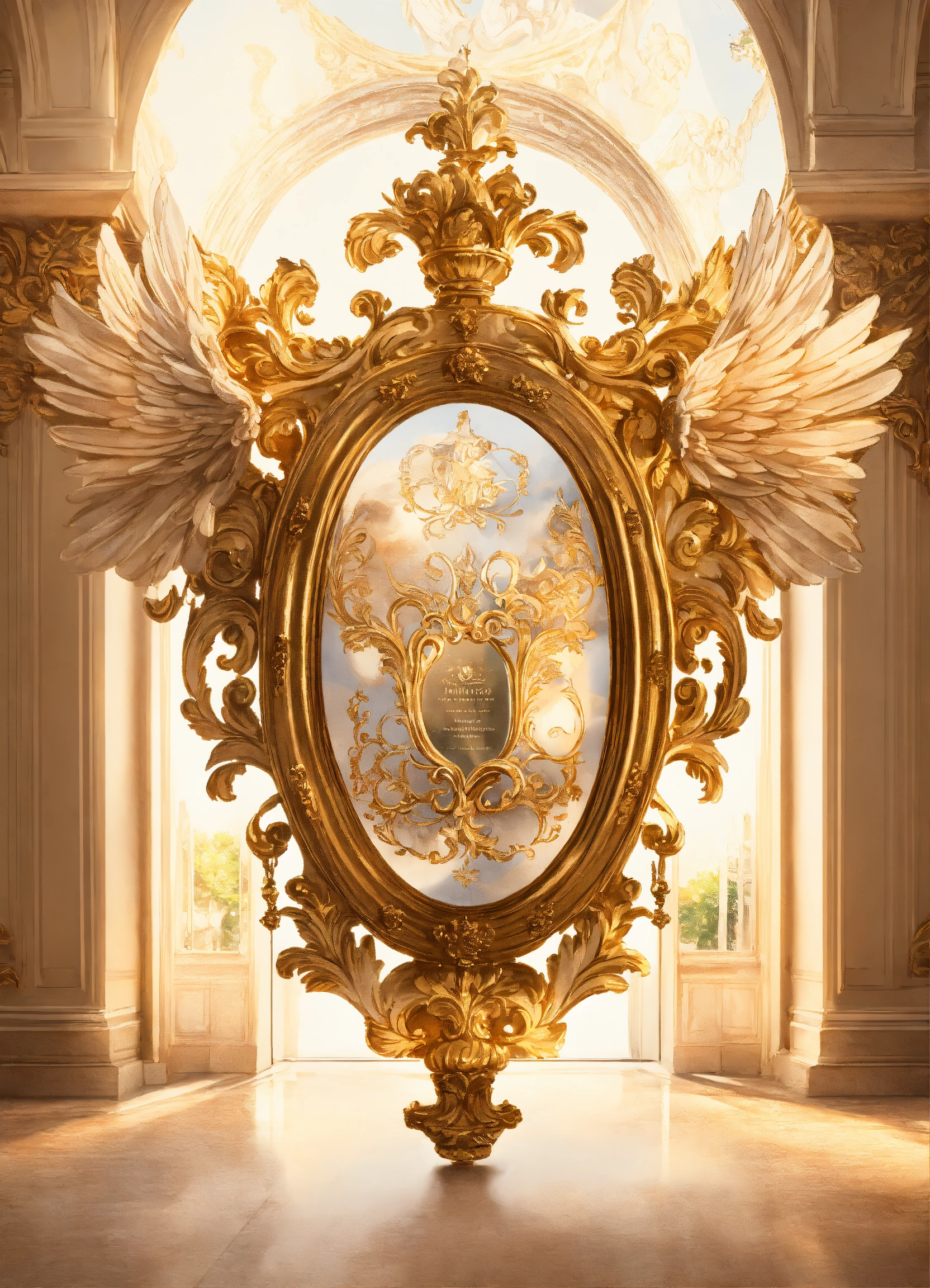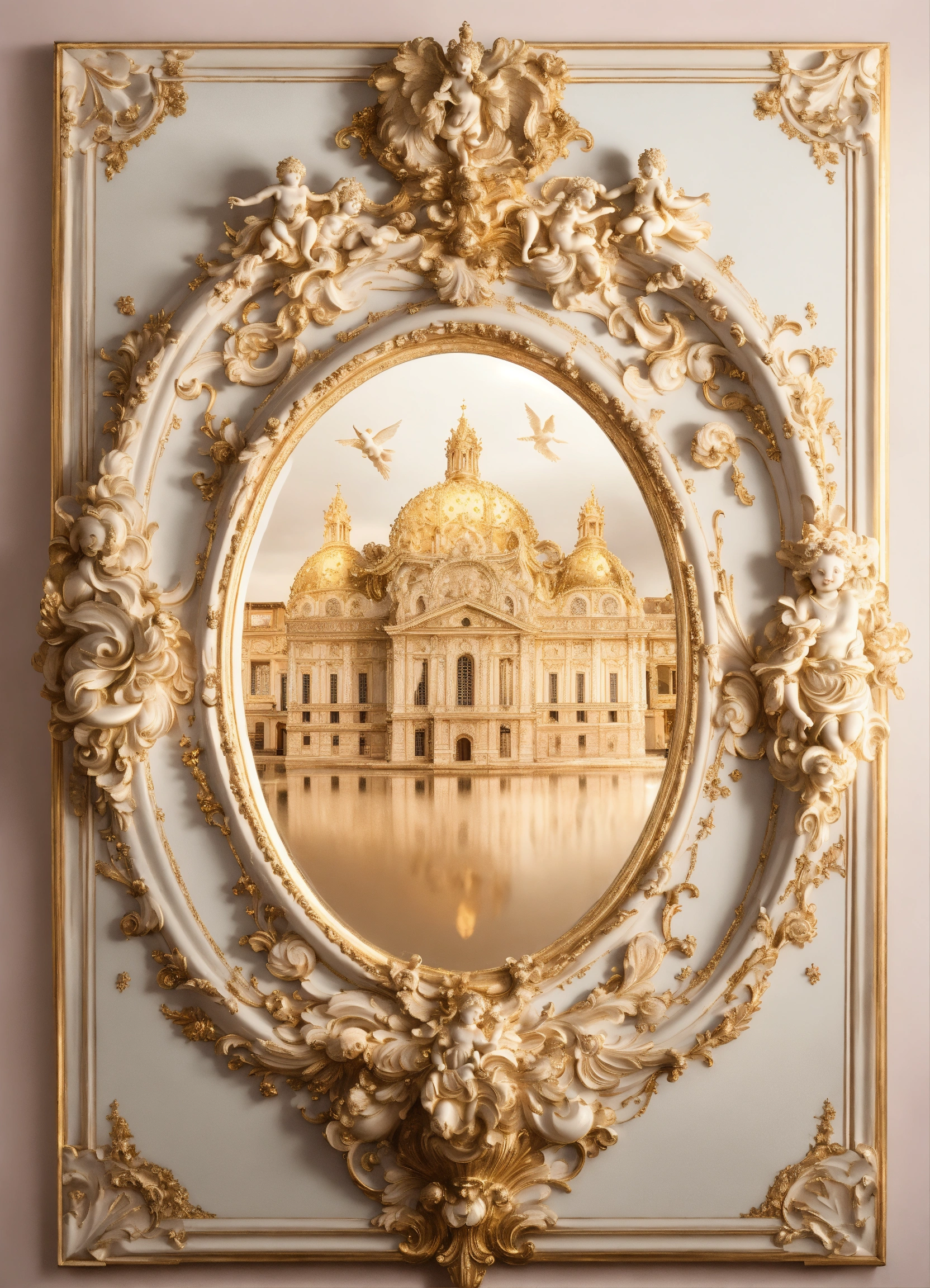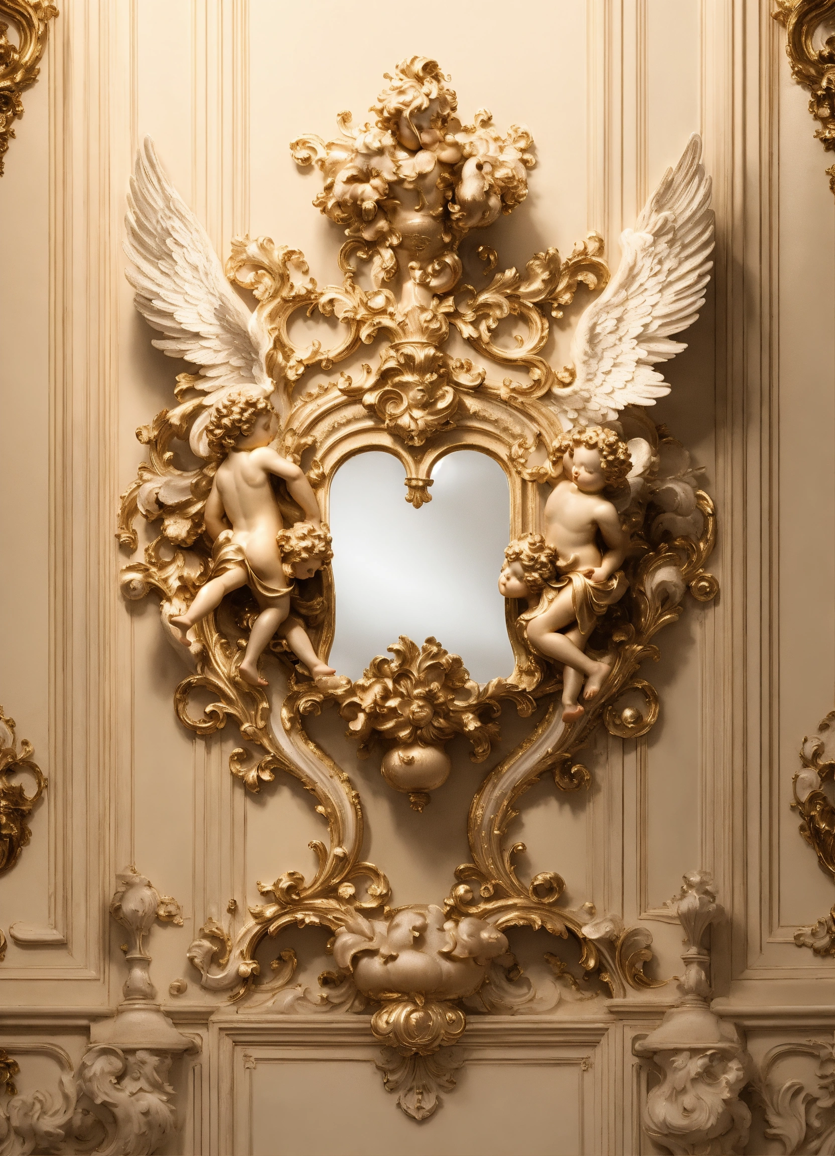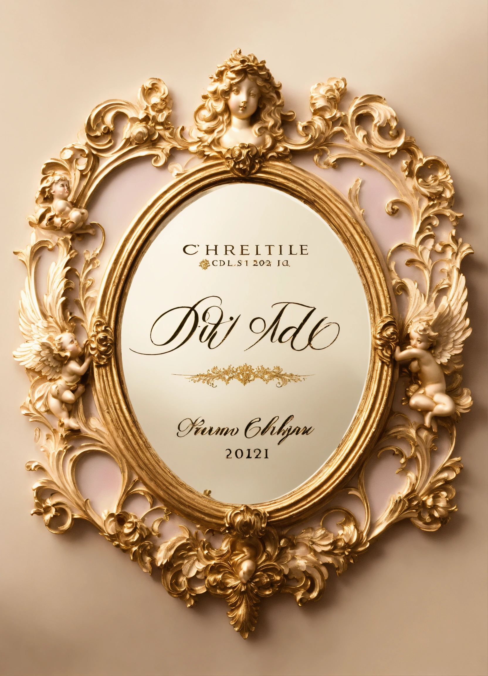 Logo is bold, mirrored, baroque, versailles, rococo style. i’d like the calligraphy of this logo to be ornate, and match the design. logo name di como designs limited and (subtitled est 2021). pearlescent satin glittering ivory white background. angel cherubs flying around the norman style spires