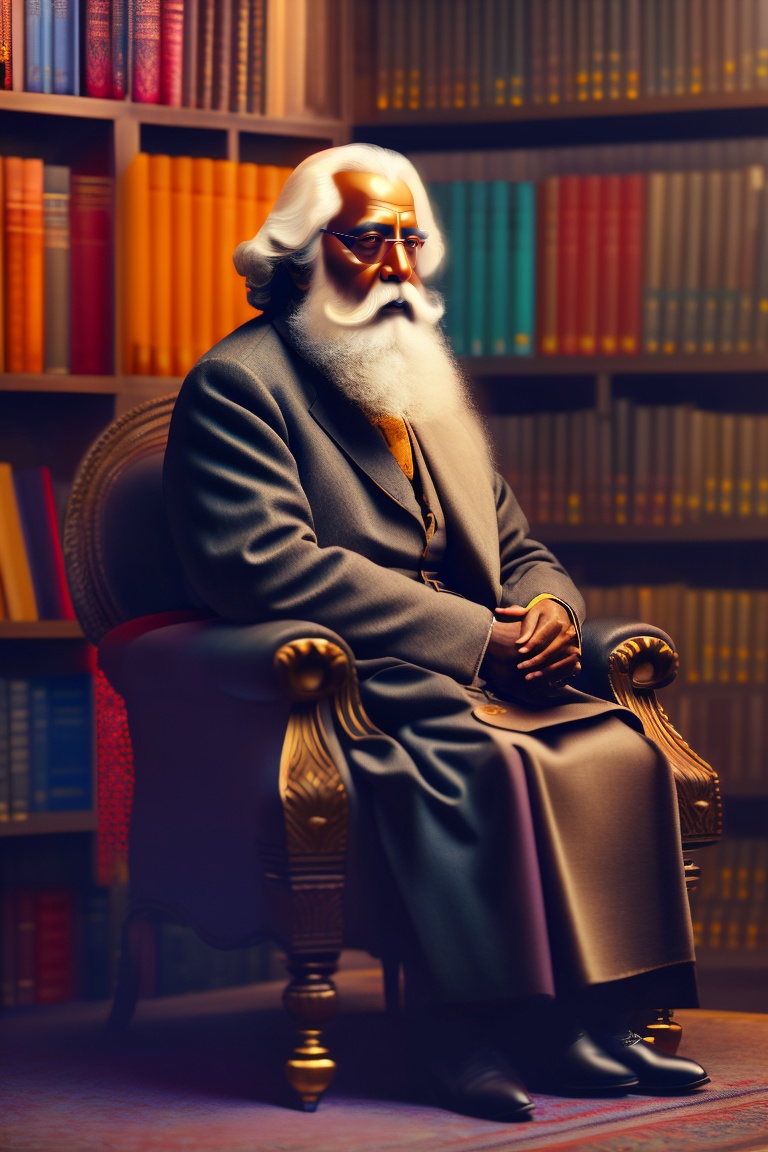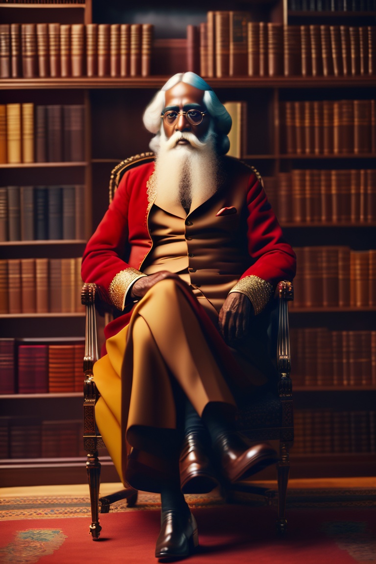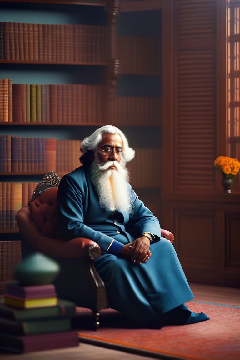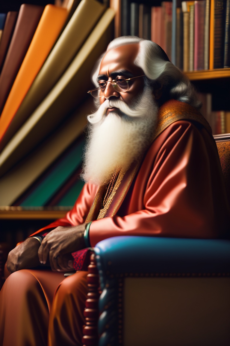 A ravindranath tagore sitting in a chair in front of a colorful many books in a library, 8k, indian flag, cinematic lighting, photographic, eastman kodak color negative film 5251 50t