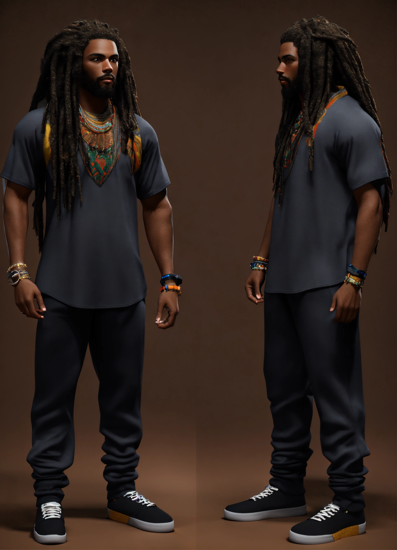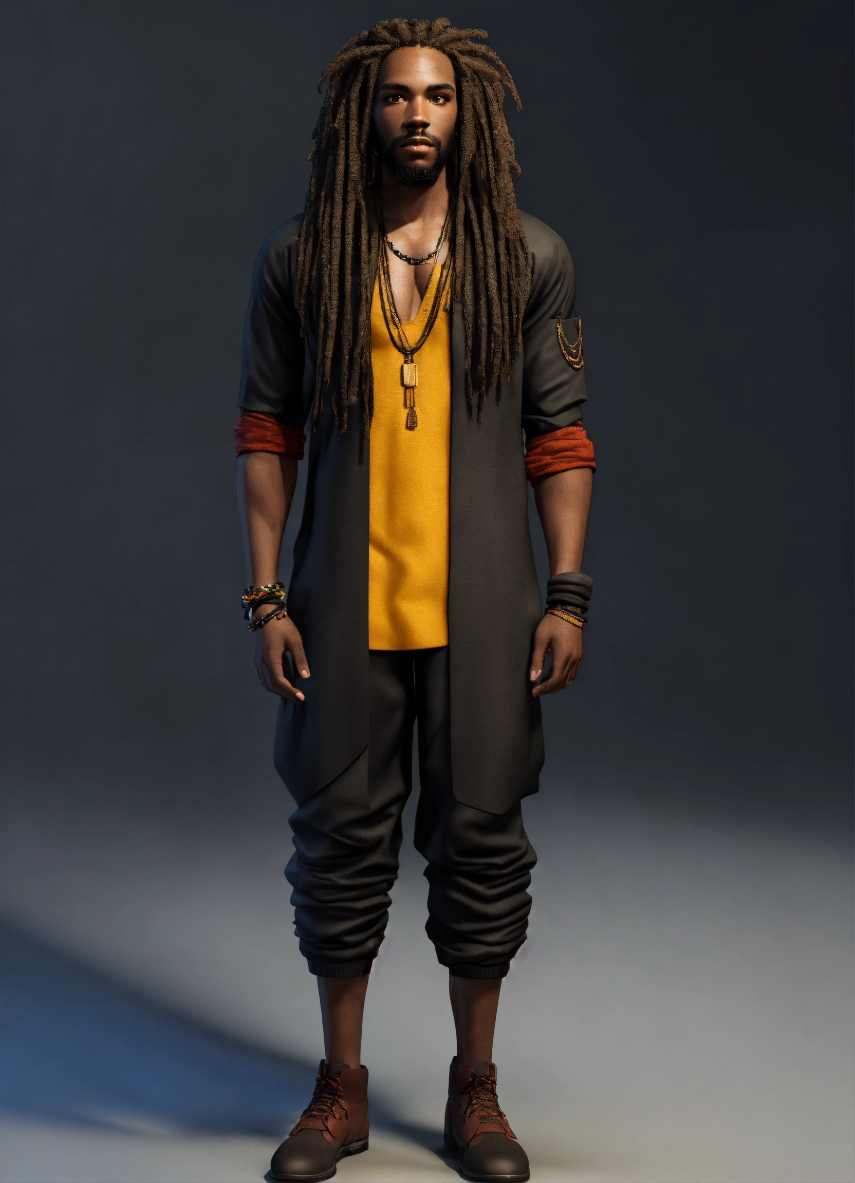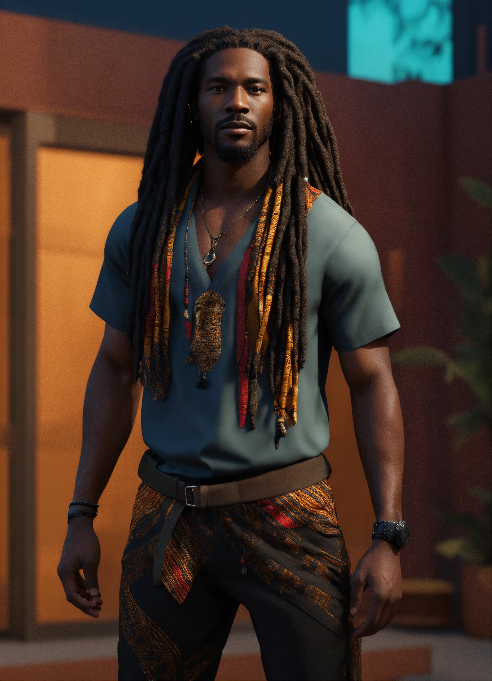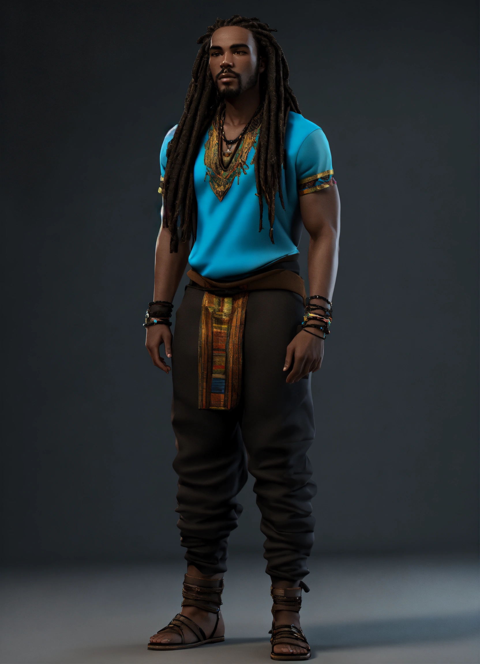 3d render of a black man with long flowing dreadlocks, 6'5" tall, well-built, full body shot, his skin color is jet black, the black of pure onyx, midnight black, the blackest black on the color spectrum, wearing african style shirt and pants