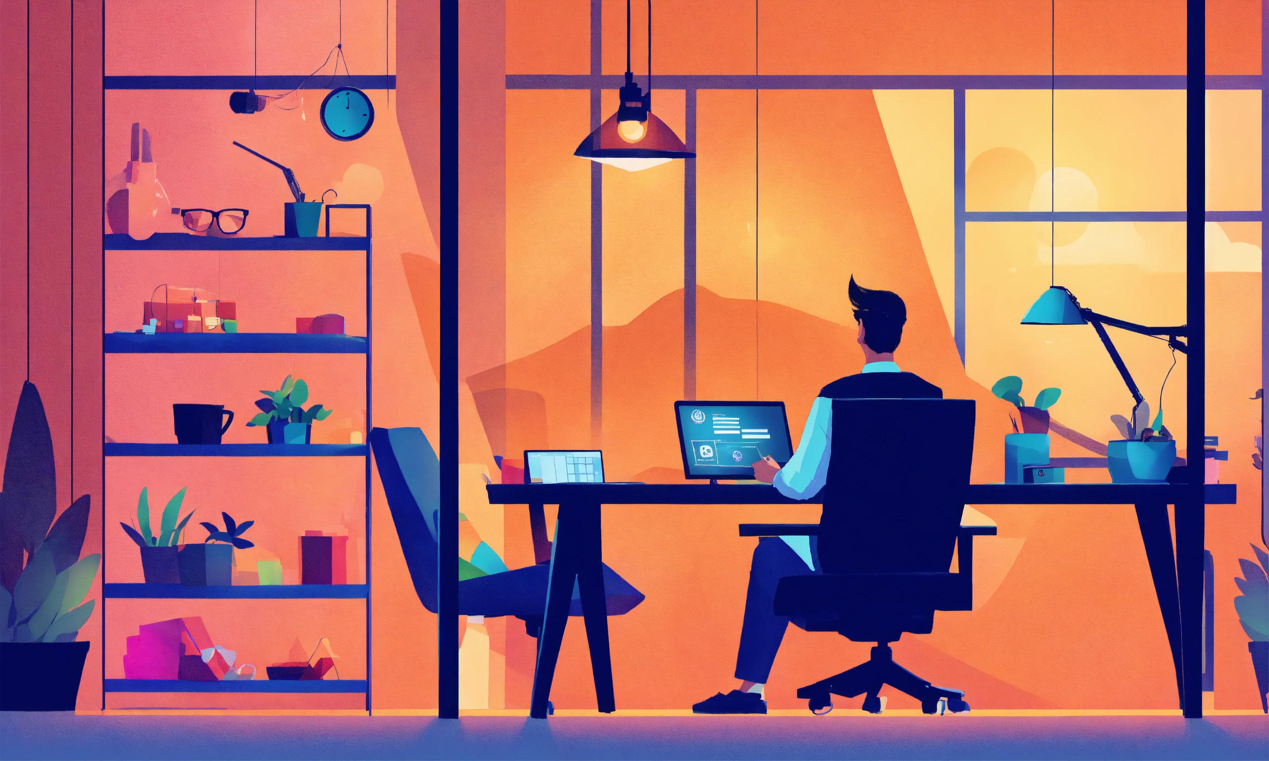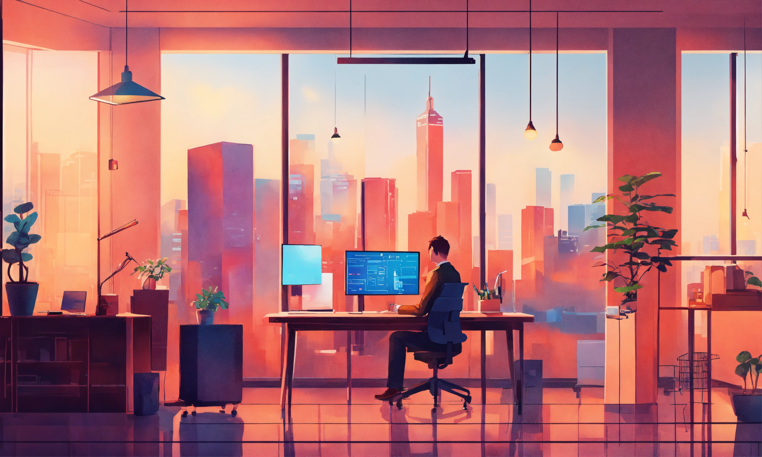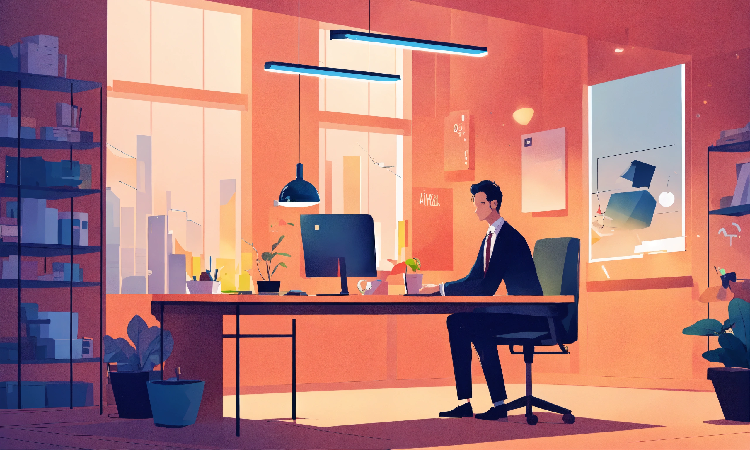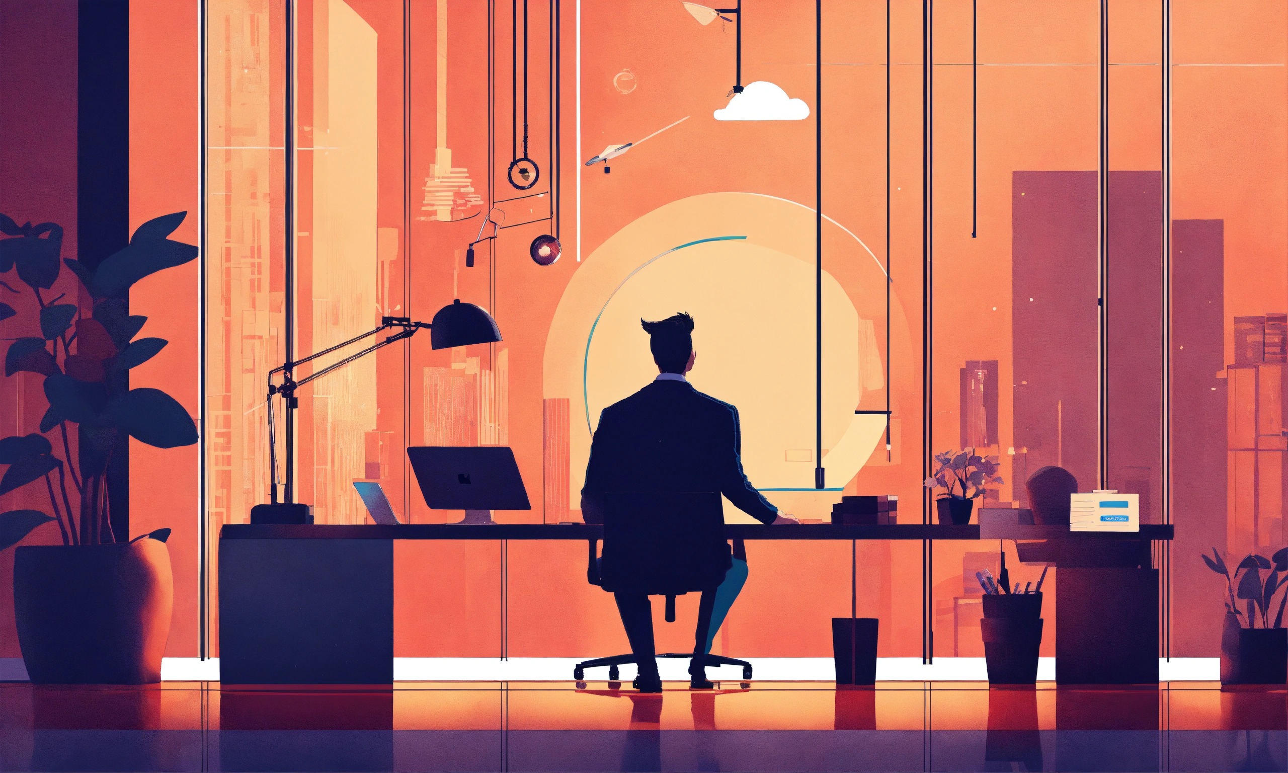 An illustration of an entrepreneur in the office and the market trend of digital transformation, minimalist style.