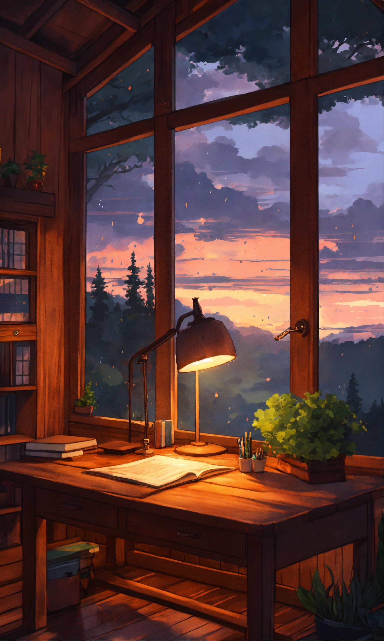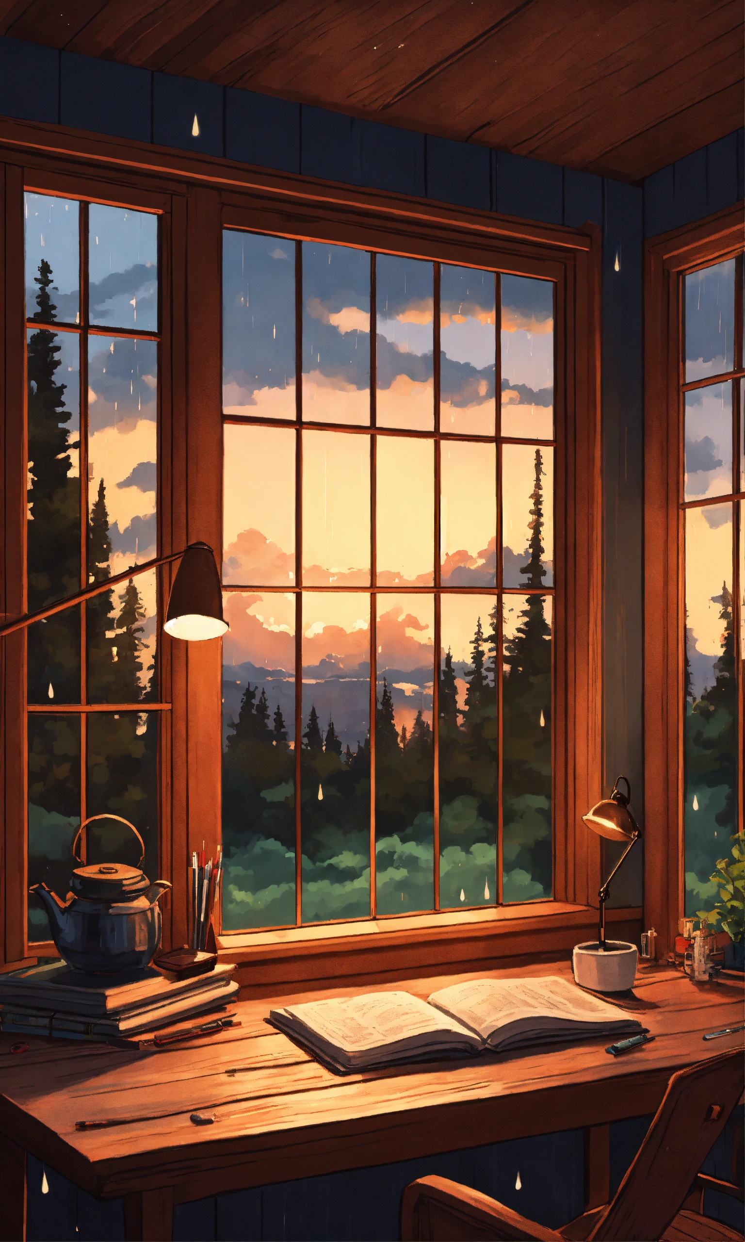 Cozy wooden nordic cabin, anime, studio ghibli, minimalistic, raining outside, dark cloudy evening sunset, big window view with study desk, washed acrylic image, forrest outside, anime lofi artwork