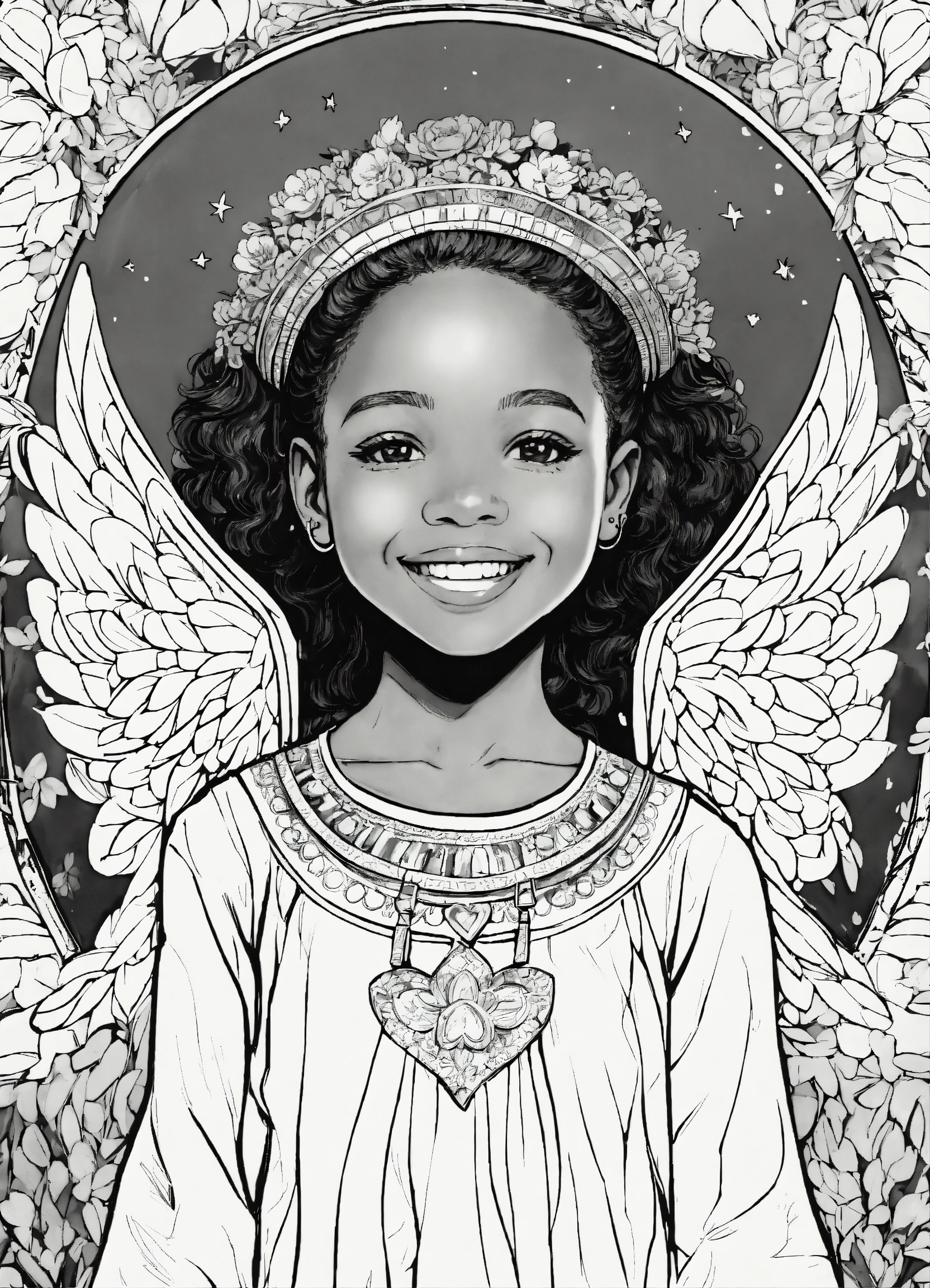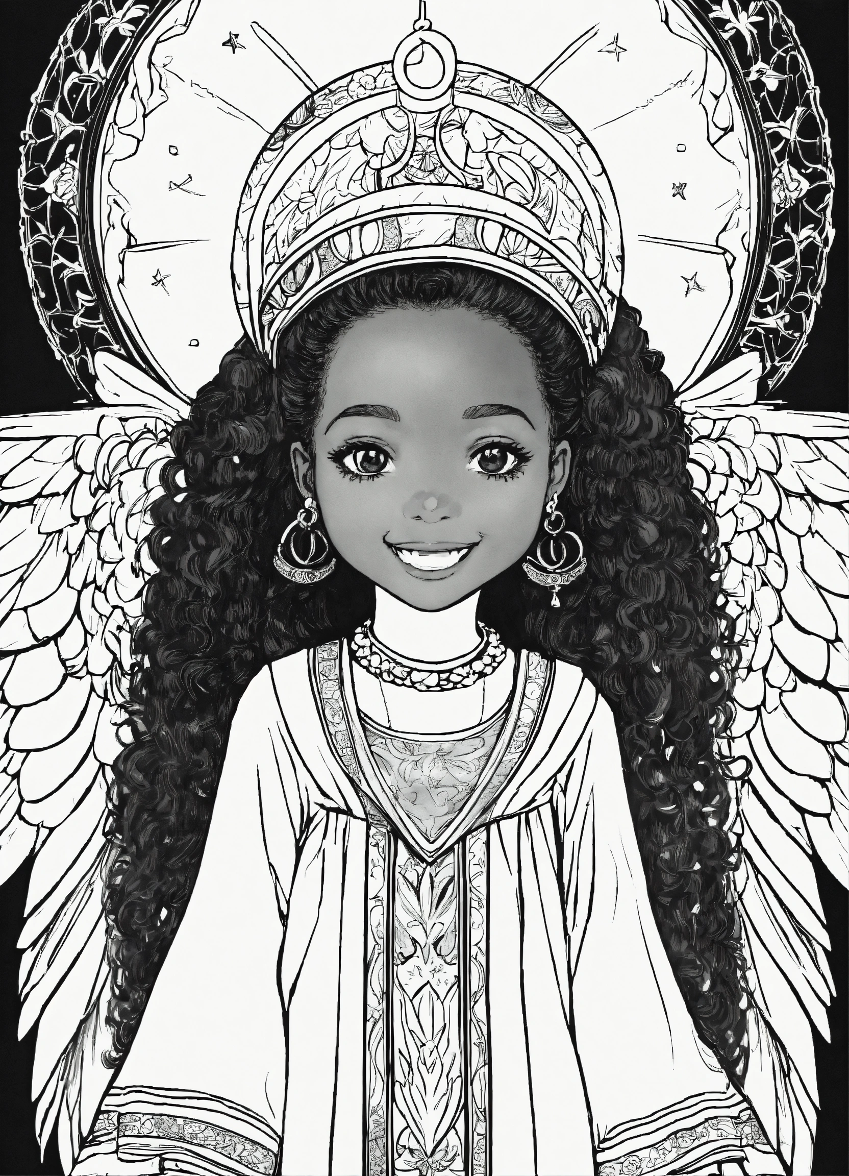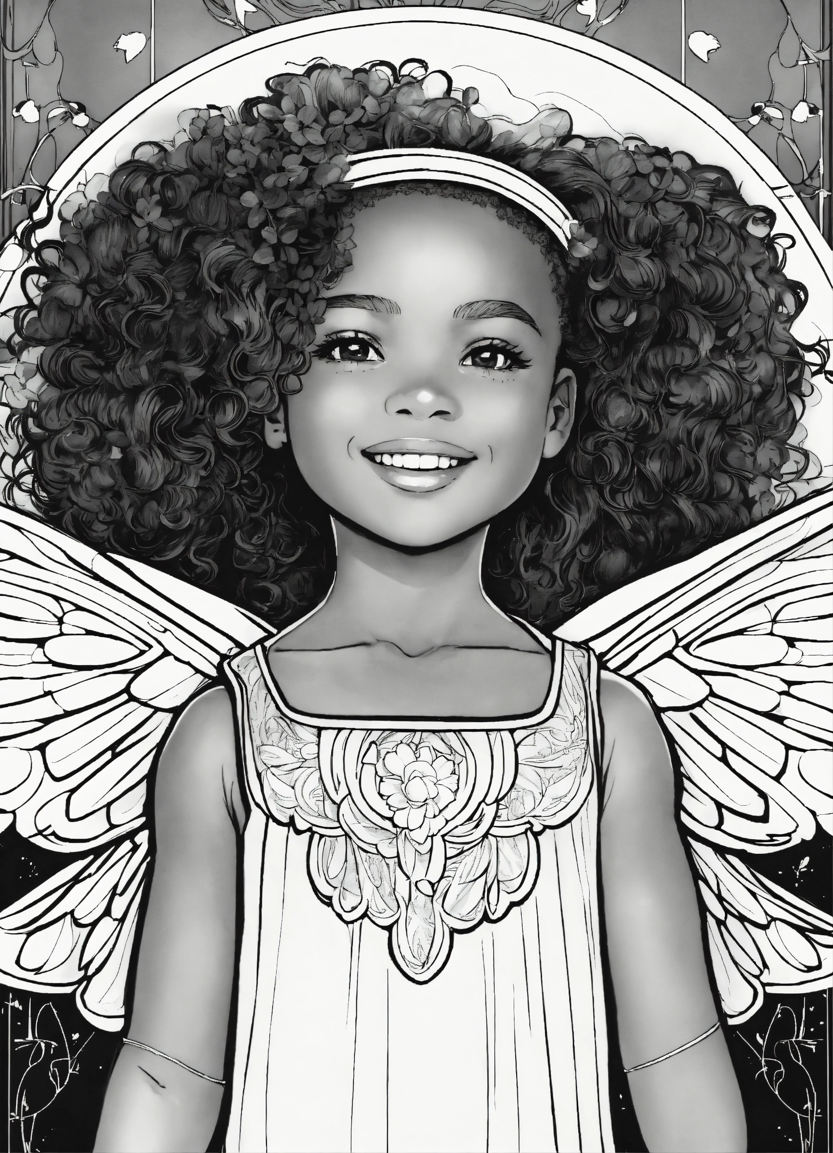 Black and white coloring pages of young african american girl dressed in angelic attire with a smile looking upward