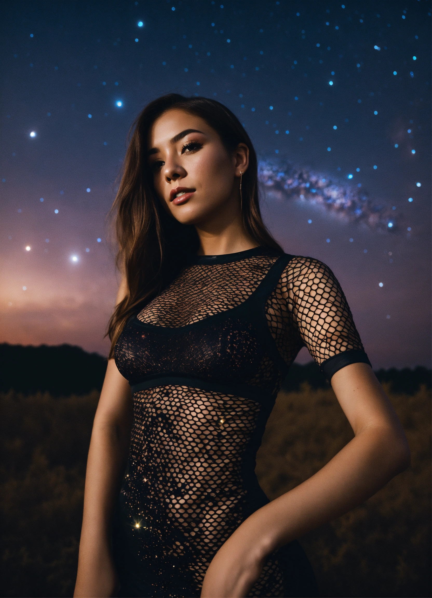 A real photo of a 23 year old girl, she is wearing a spandex fishnet slimfit dress, in the sky we see the galaxy