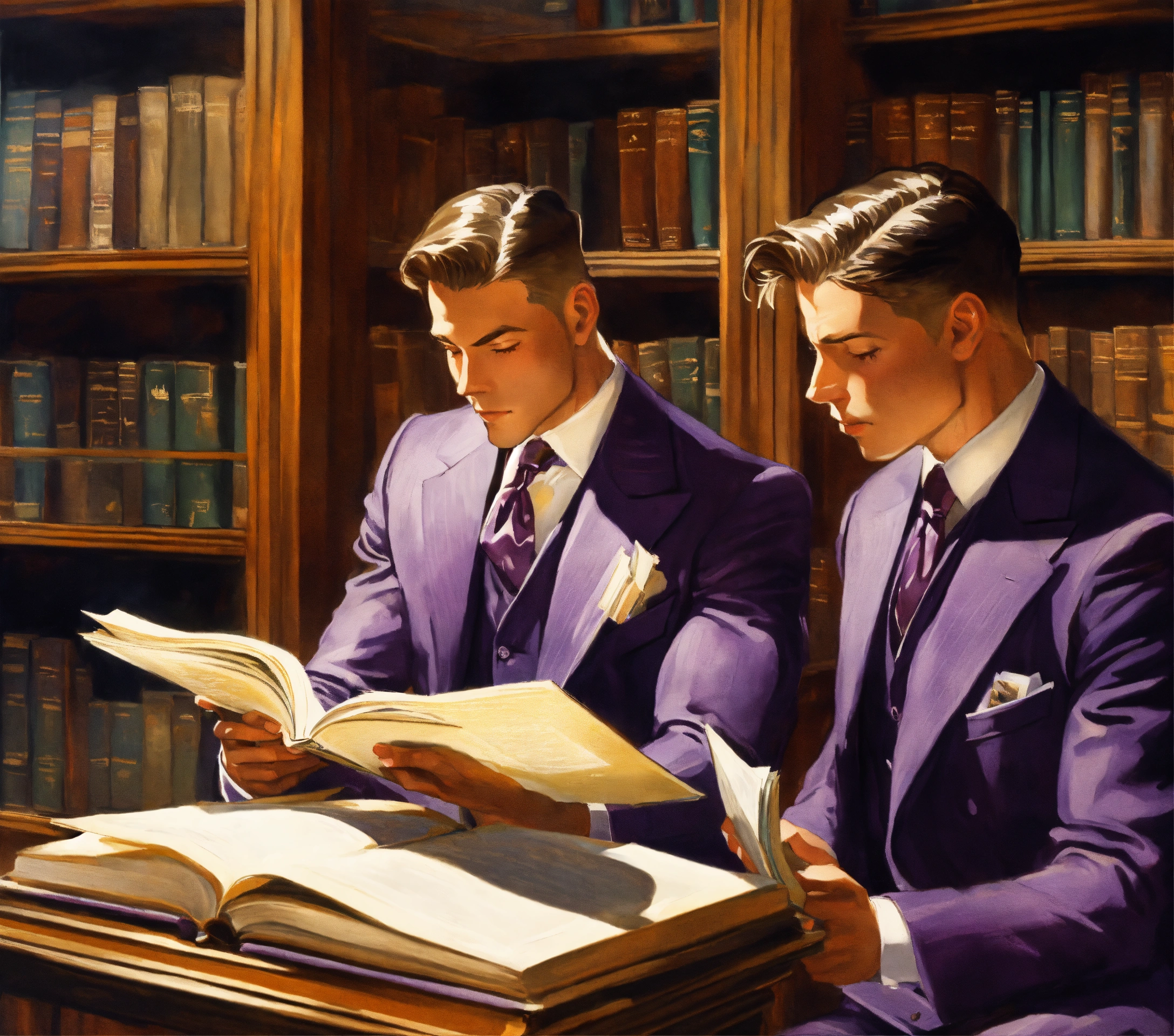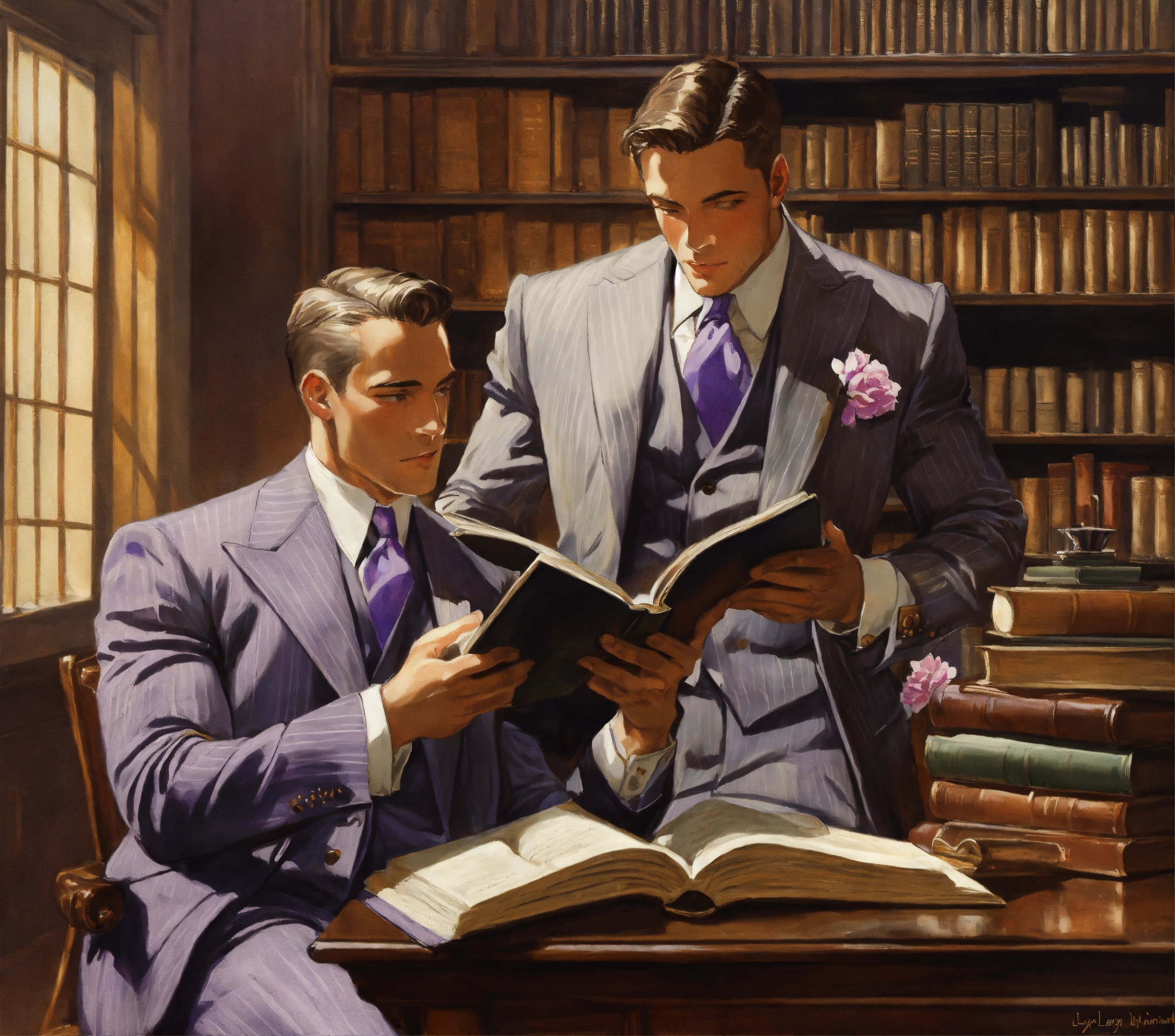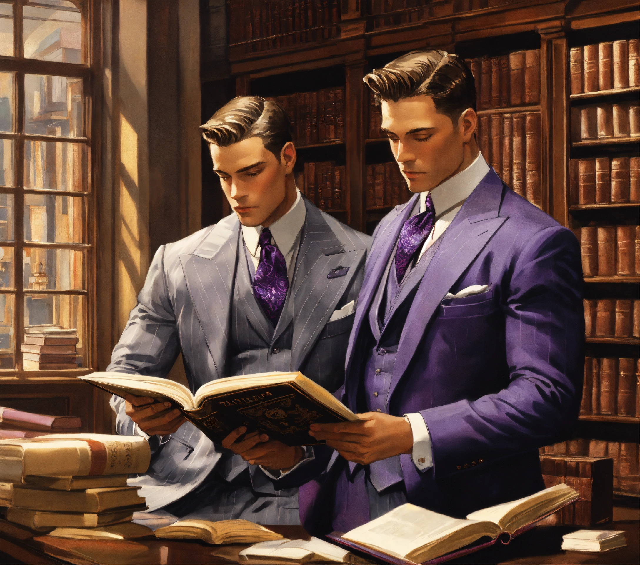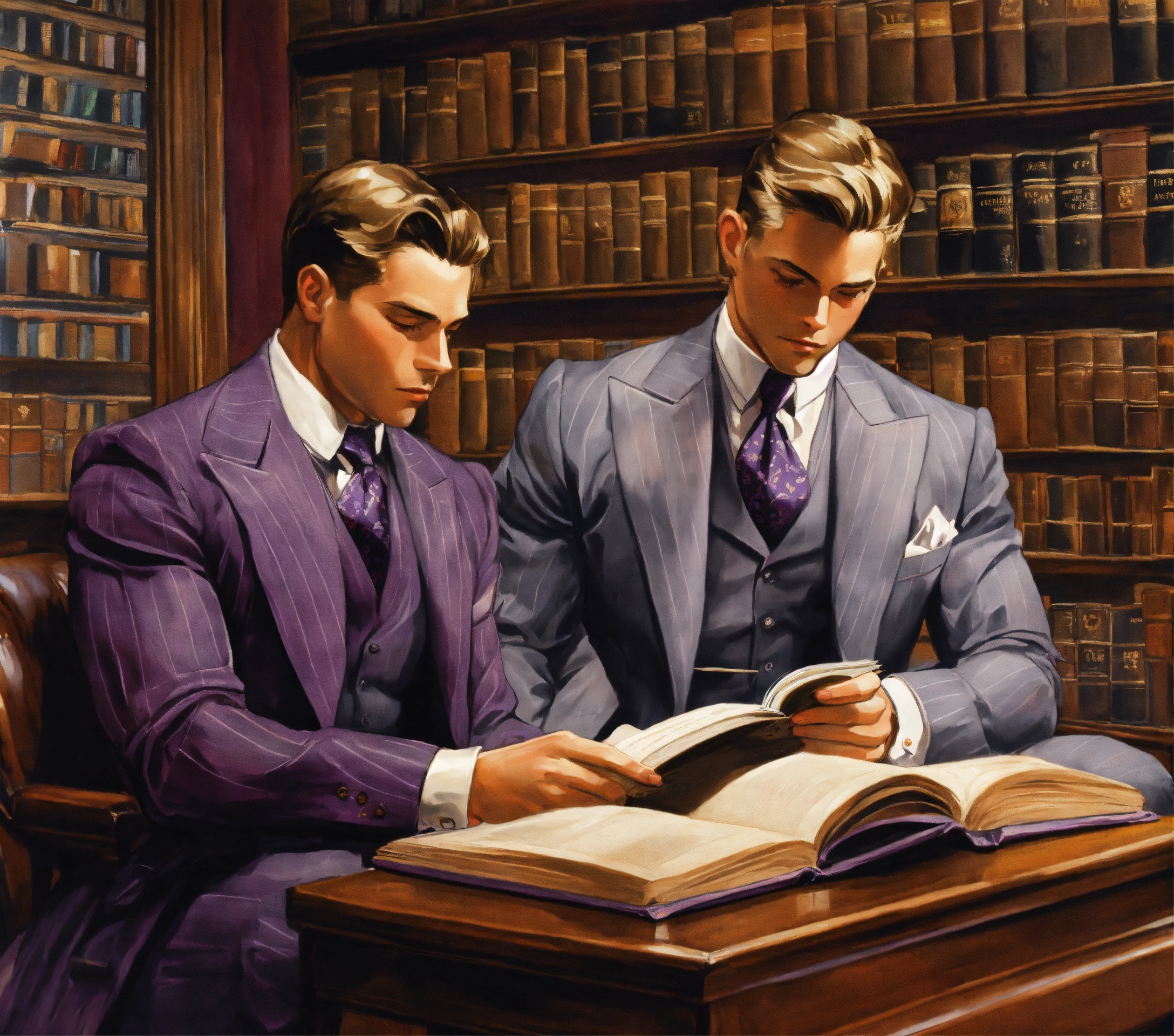 Two muscled male lawyers in grey pinstripe vested suit, purple shirt, reading in a library, leyendecker style