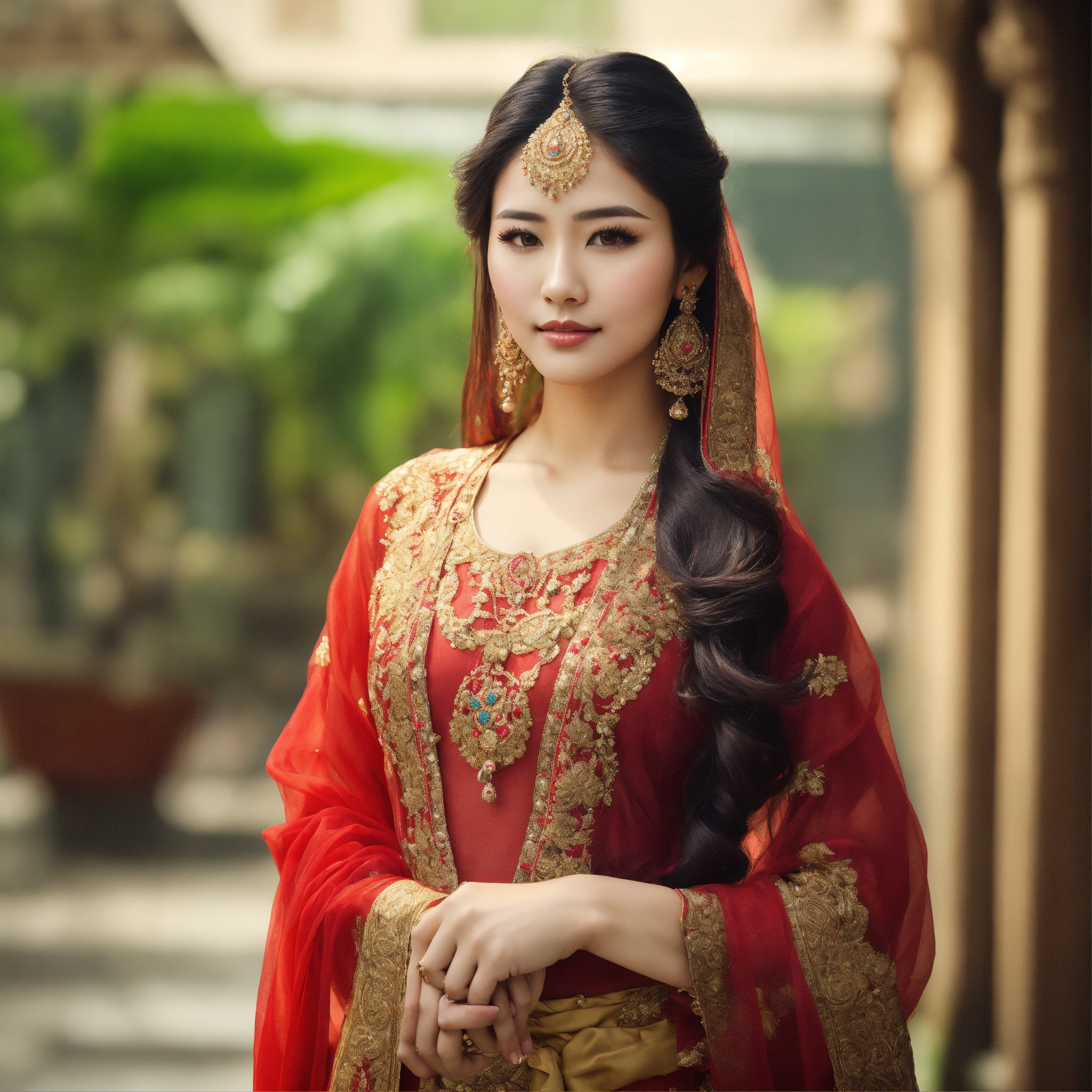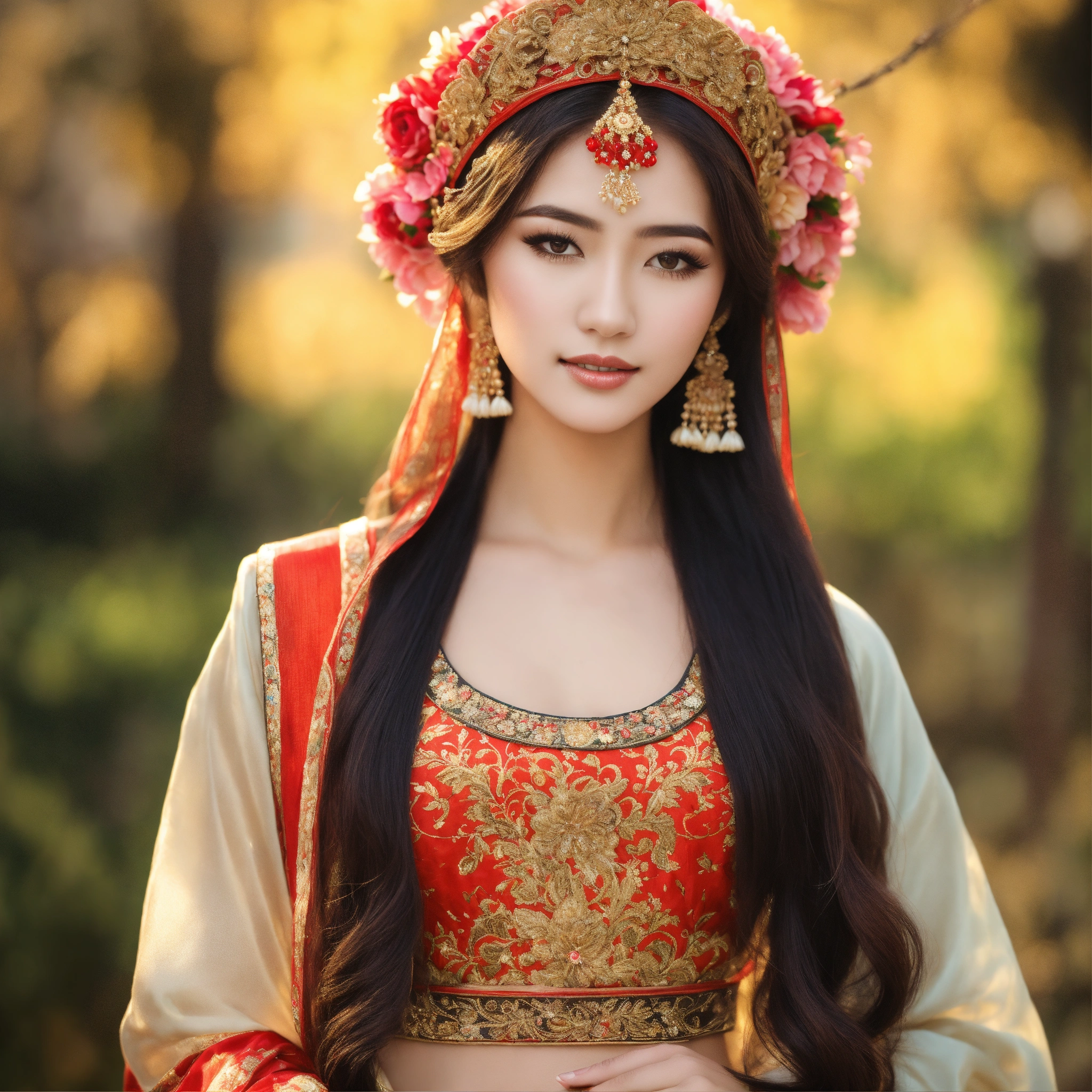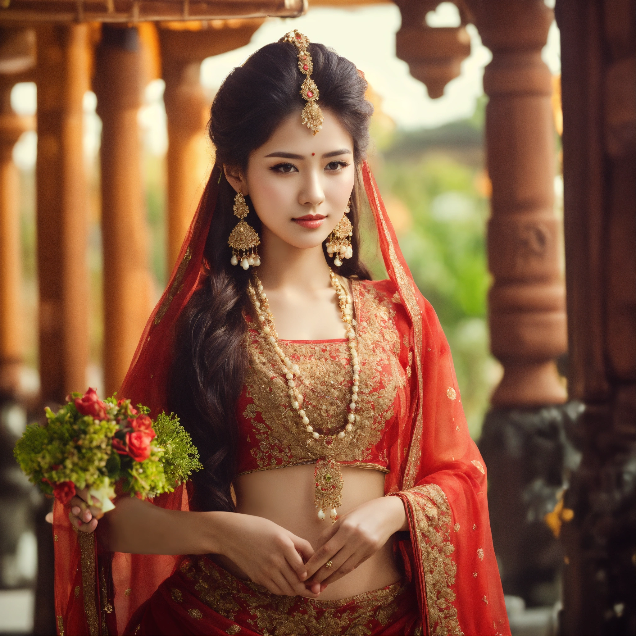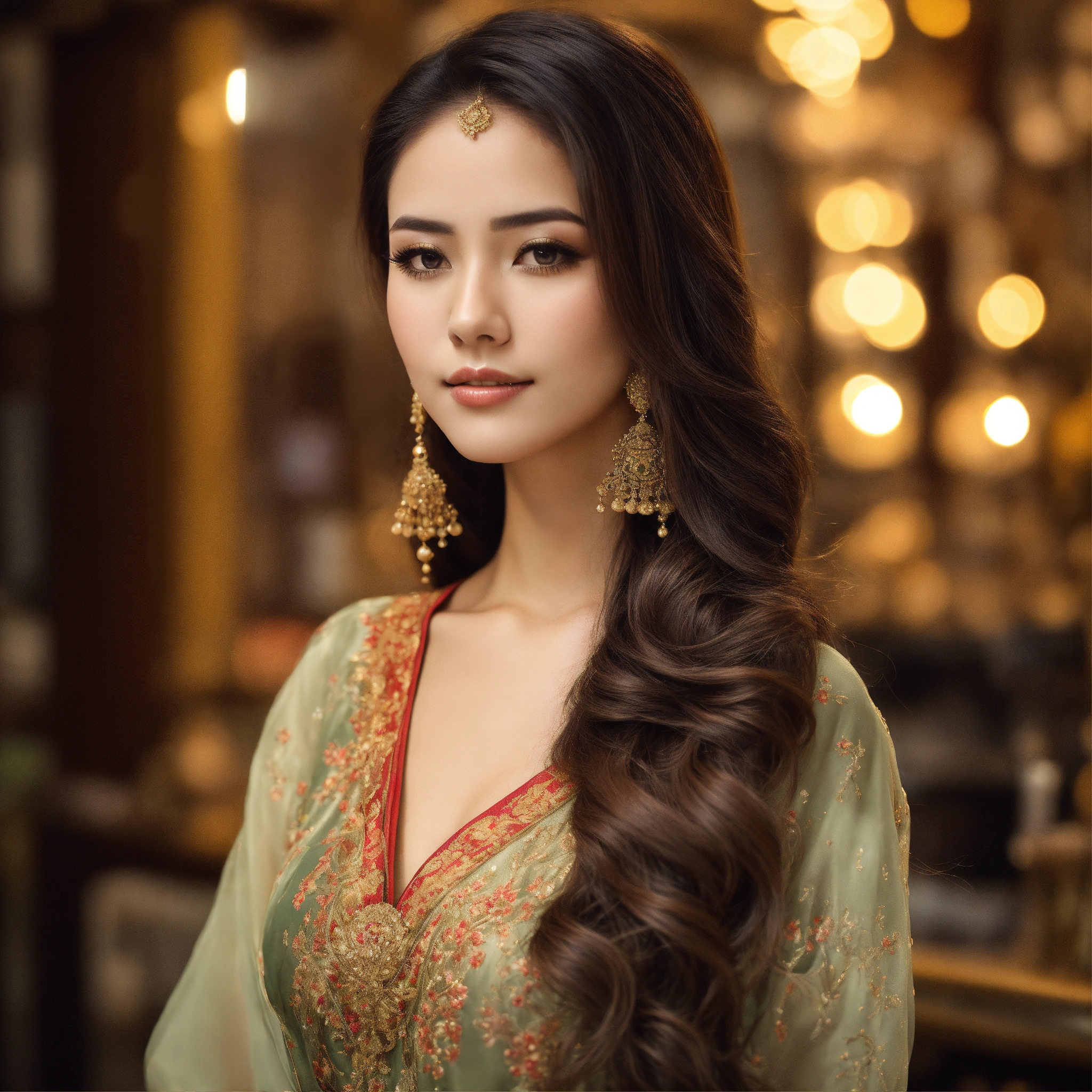 Create a image long hair beautiful lady with traditional look full compilate body with slim waist, she hold her hand a product of hair serum which i provide you .