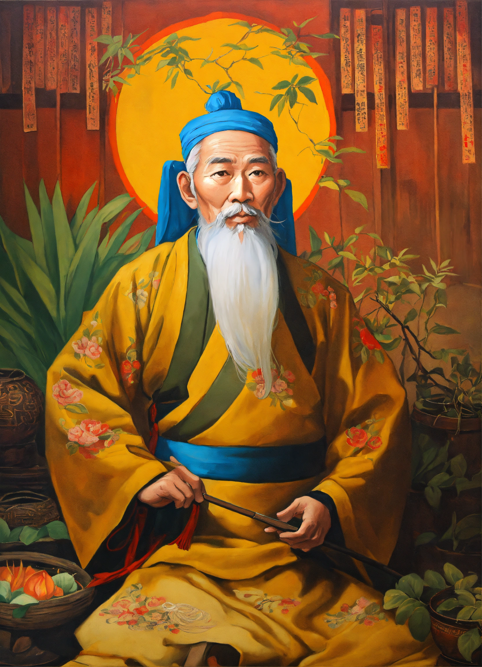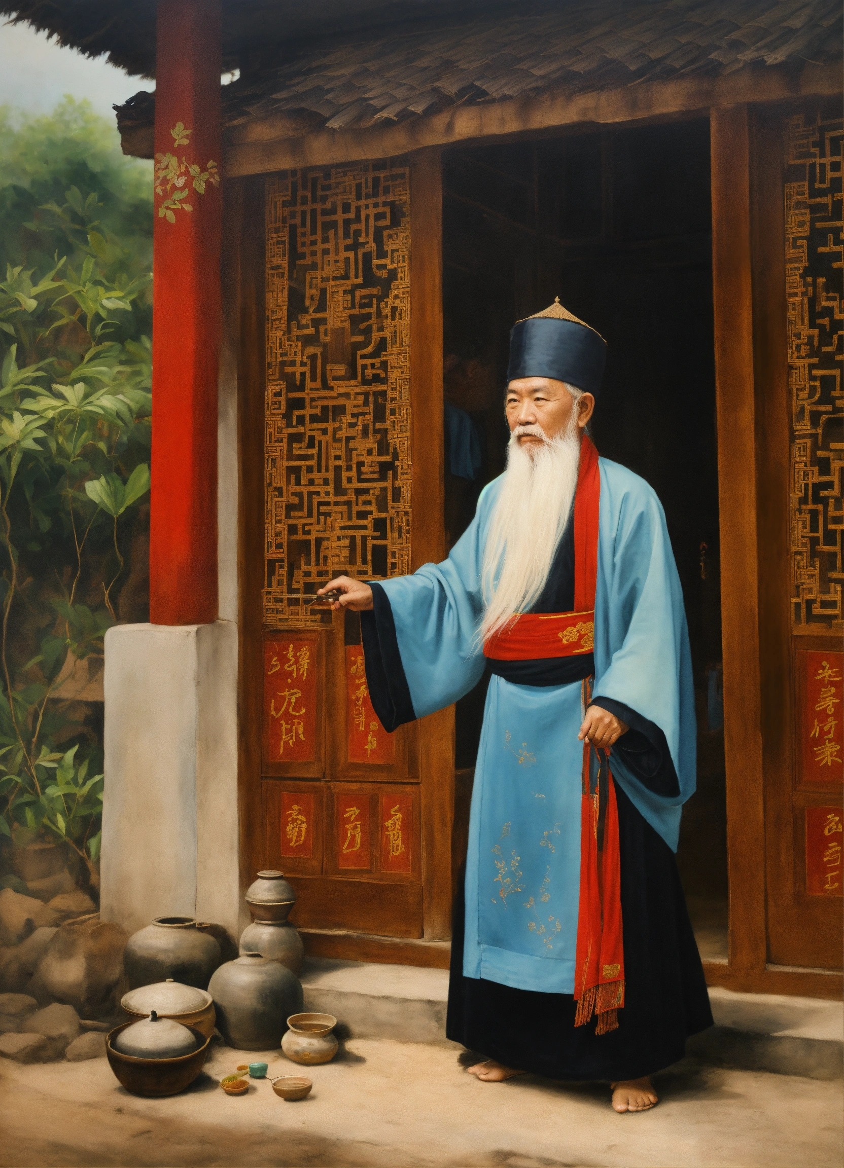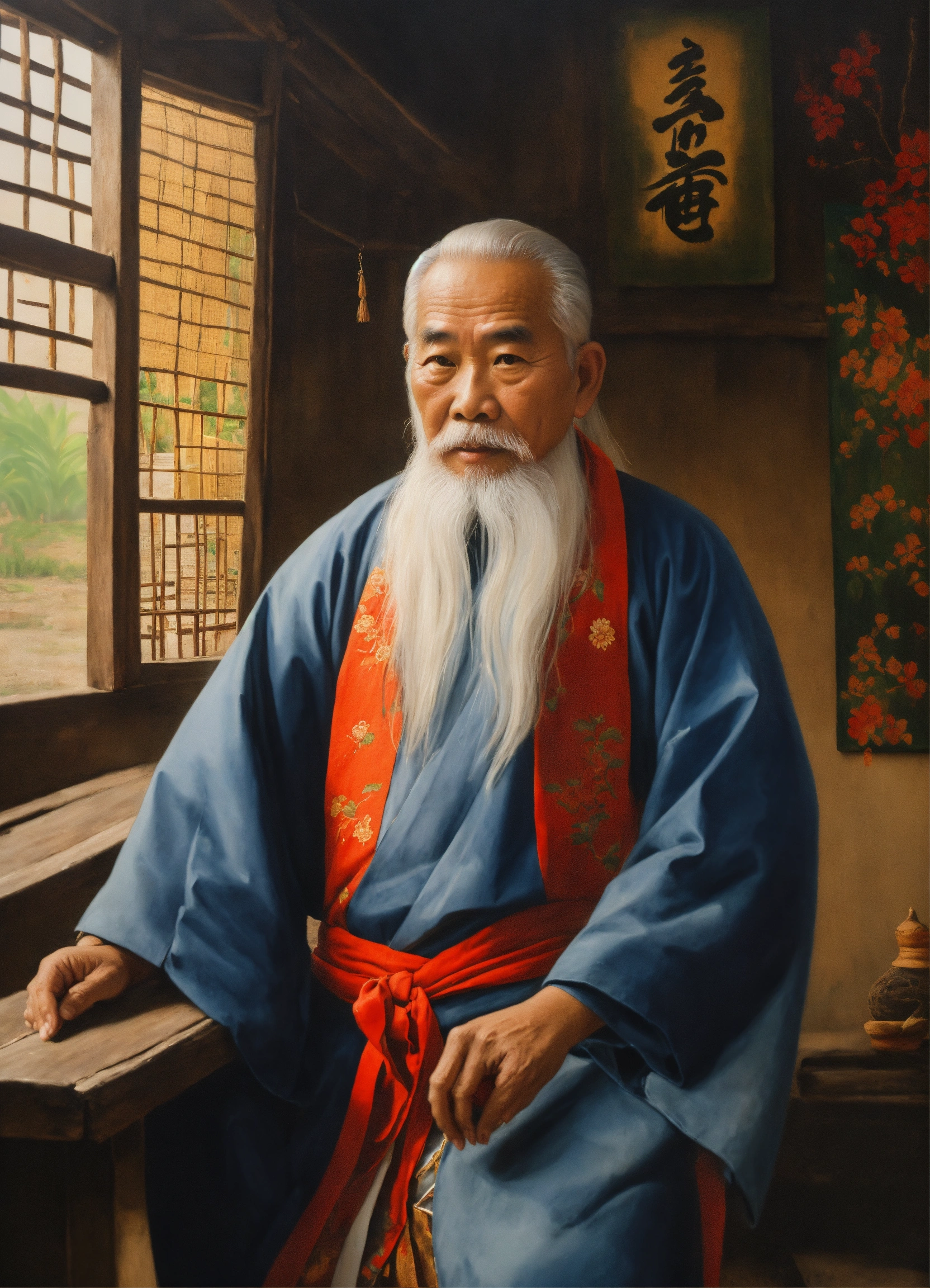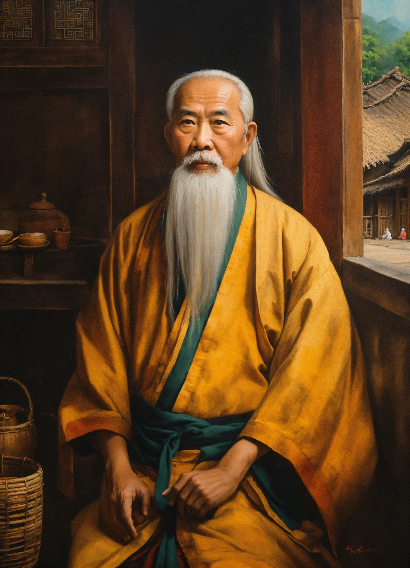 From a distance, the painting depicts the image of chu van an, a master of the vietnamese people, dressed in the attire of a teacher. he is portrayed as a 60-year-old vietnamese educator from the 11th century, with long, white hair and a long beard, standing inside an old, thatched house.