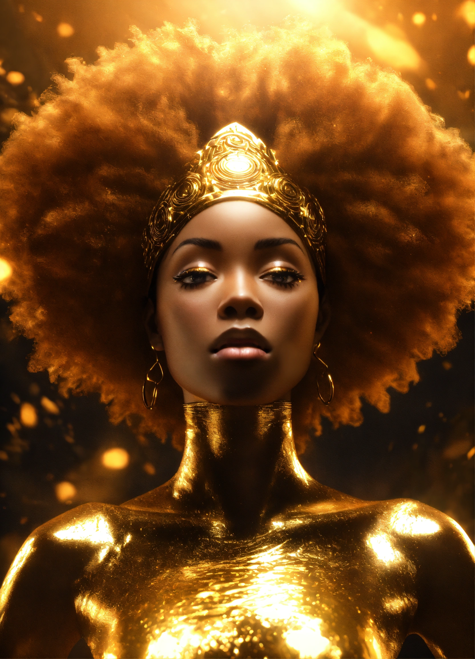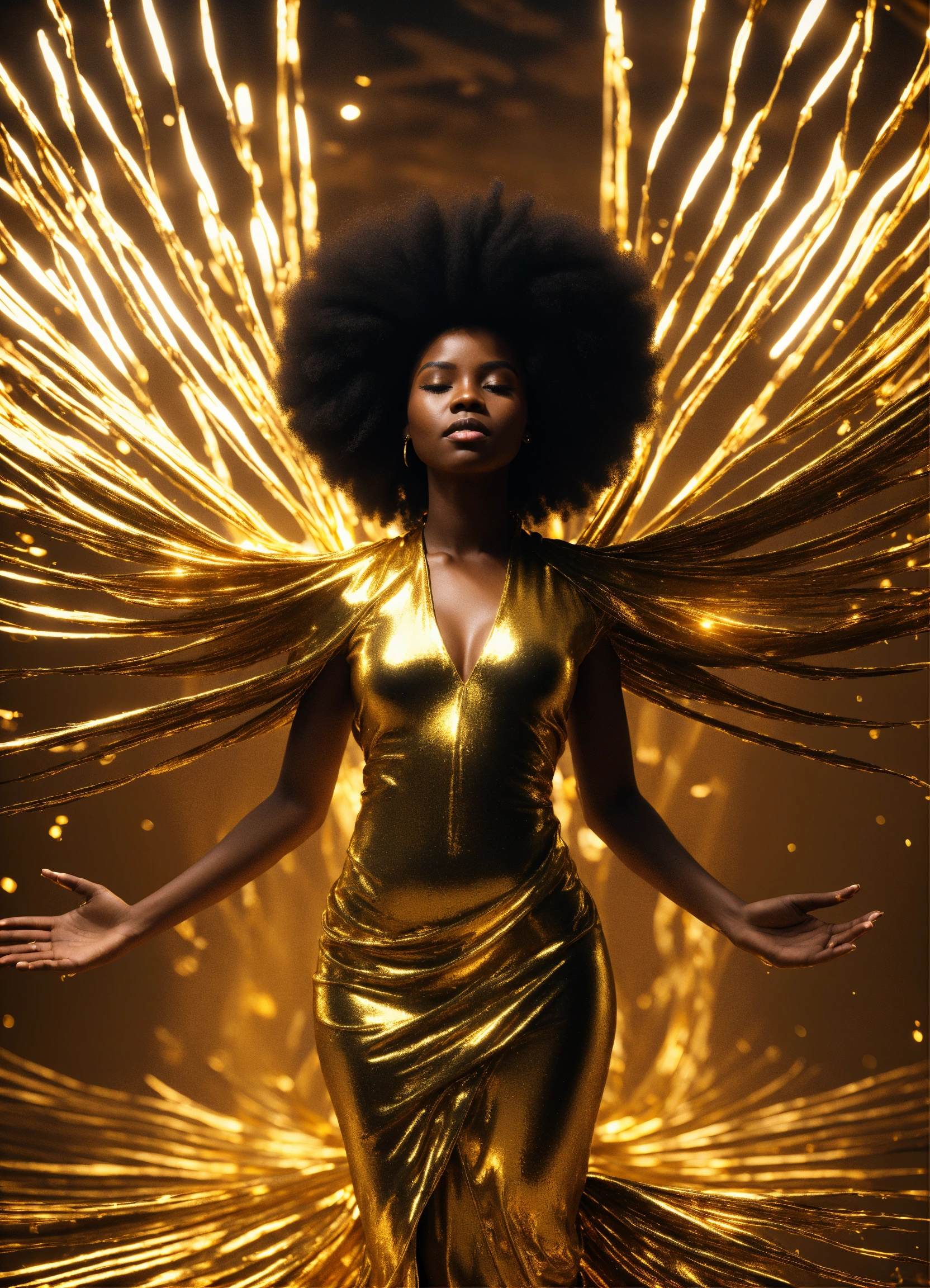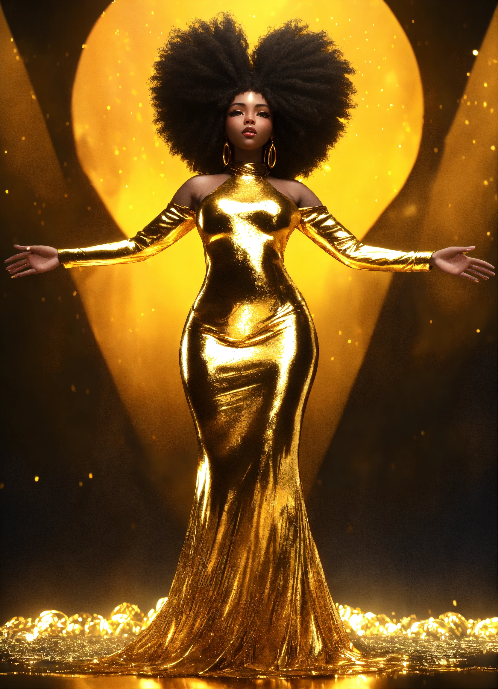 3d render of black woman with afro, full body shot, standing, arms outstretched to sides palms up, eyes open looking directly into camera, liquid gold flows through her entire face and body, illuminating her form from within, wearing long, flowing gold african style clothing