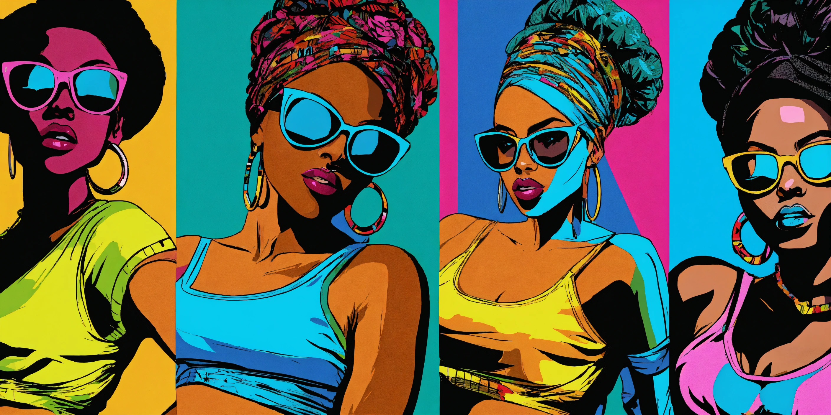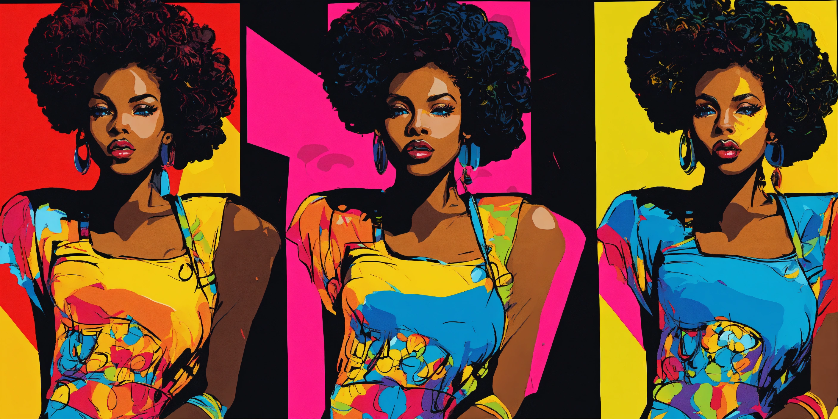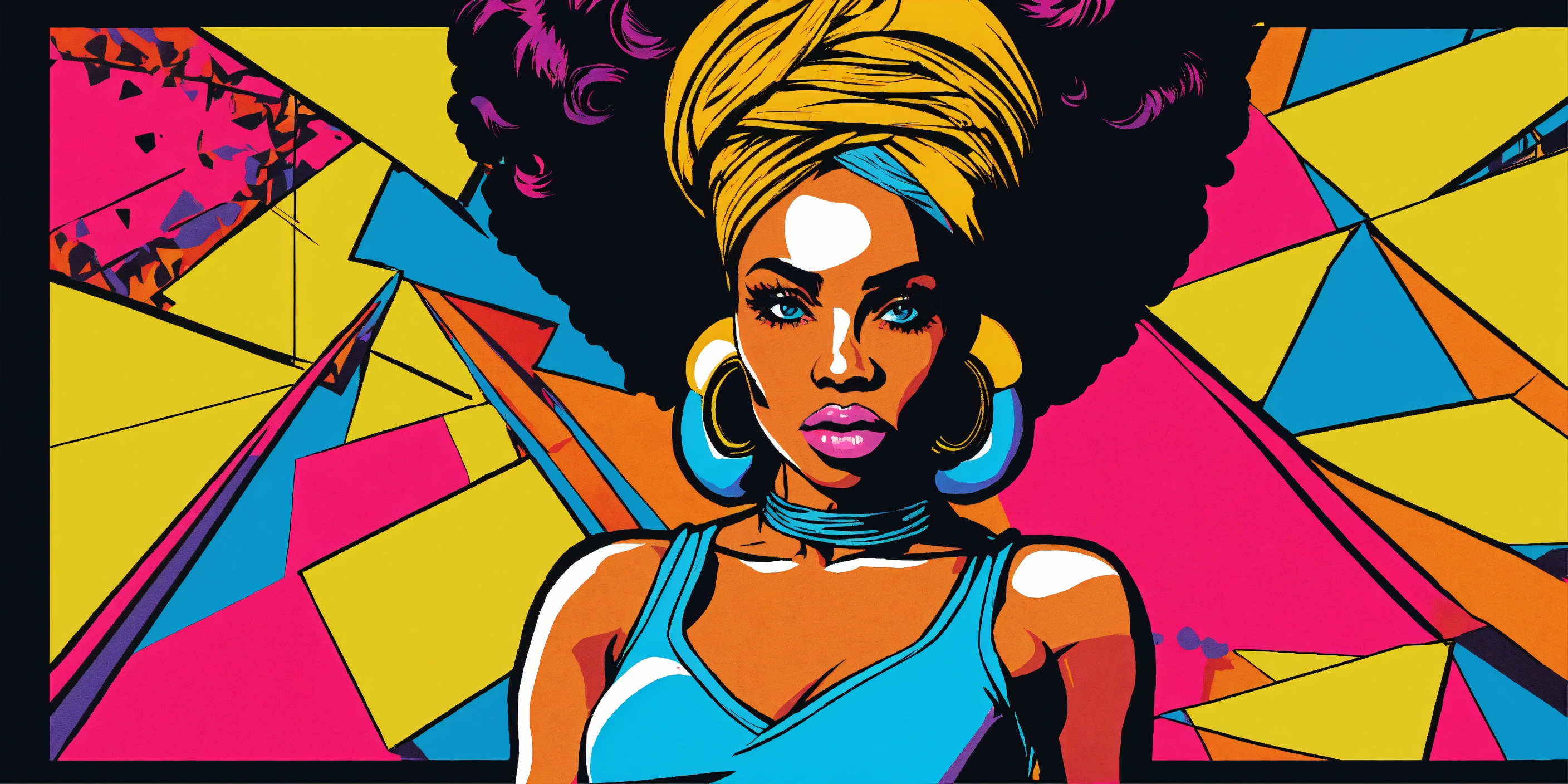 Pop art rebel rebel black woman in rebelinspired pop art clothing, striking a defiant pose amidst bold pop art statements — t-shirt design graphic, vector, contour, black background.
