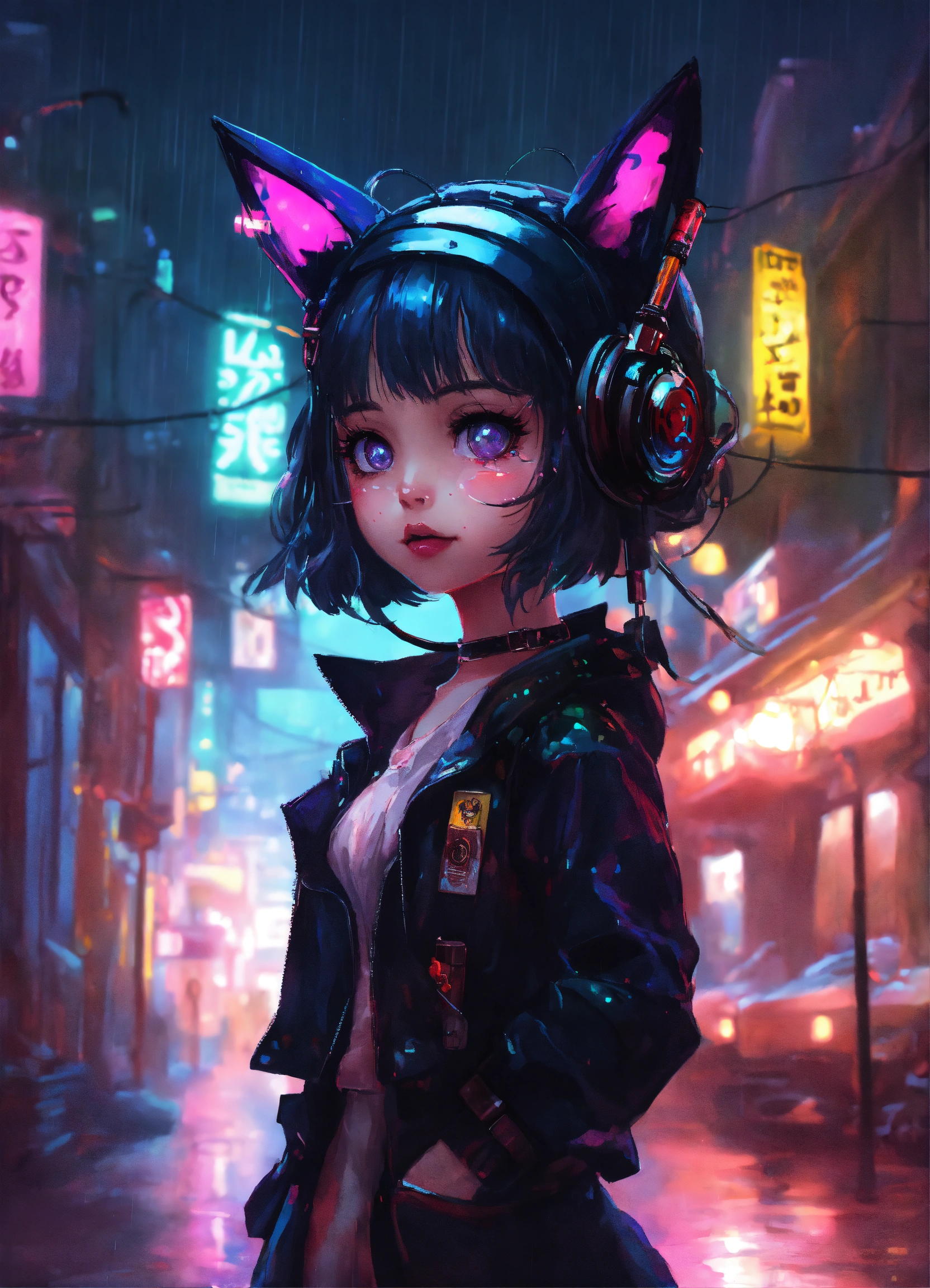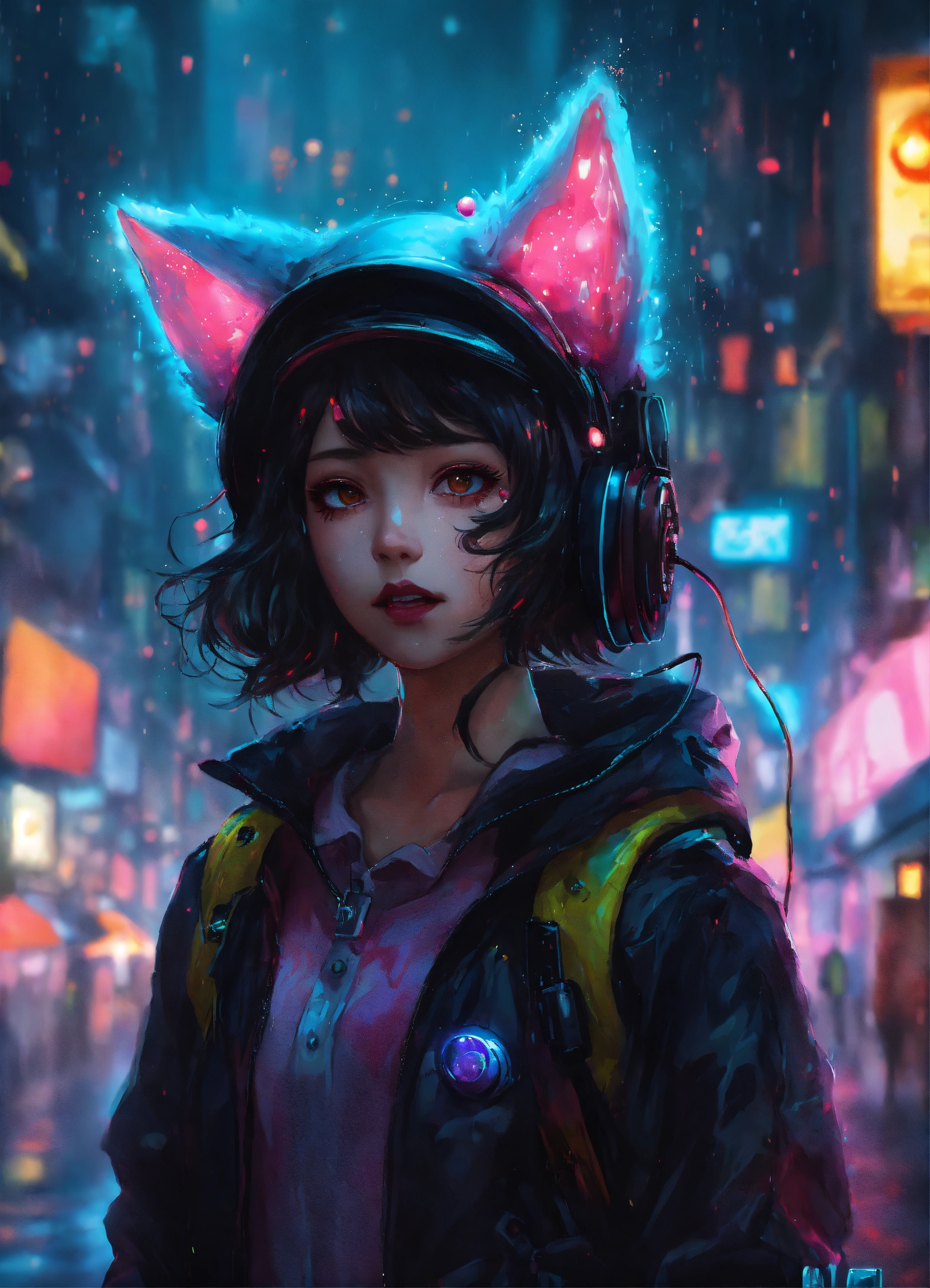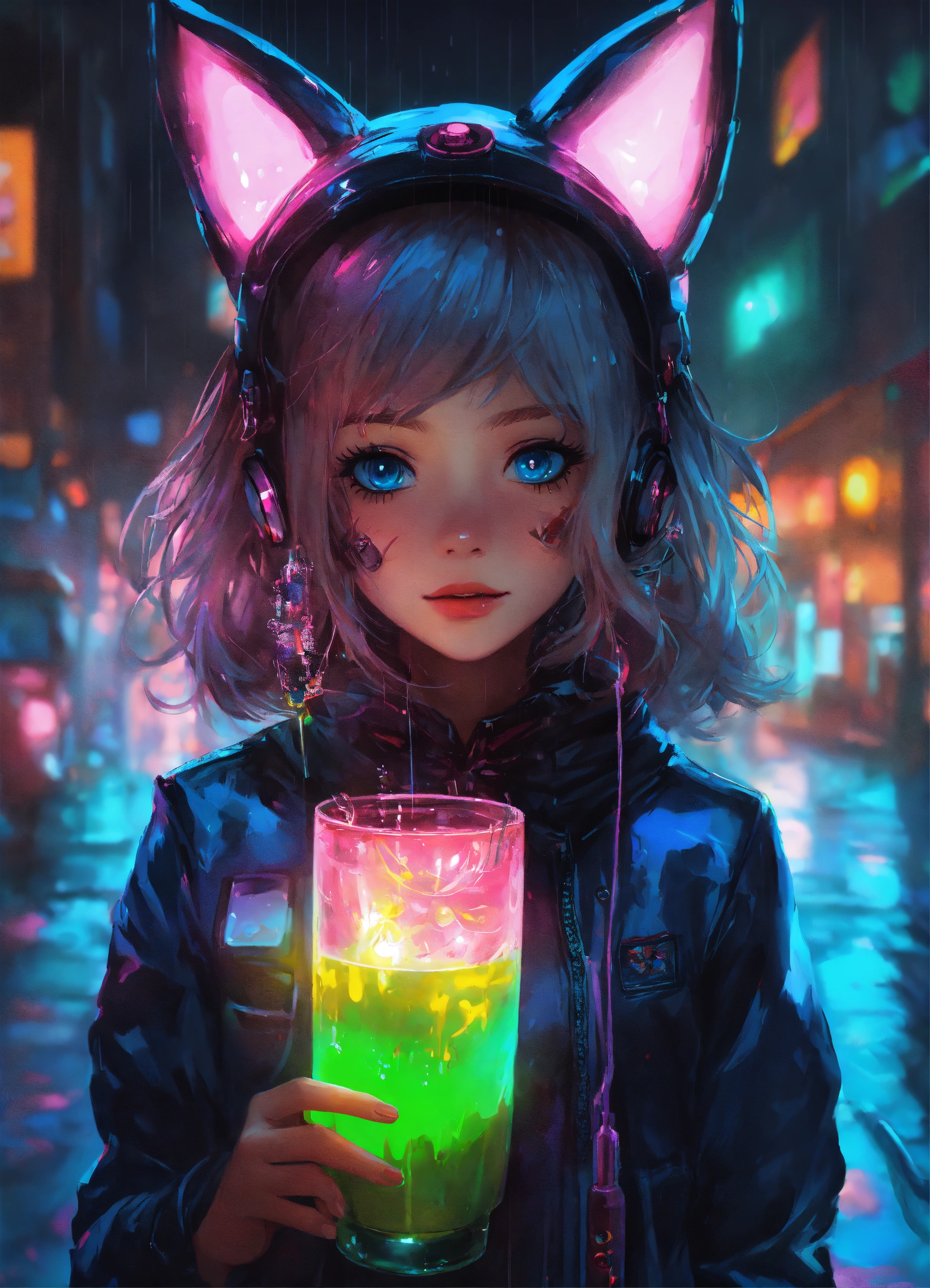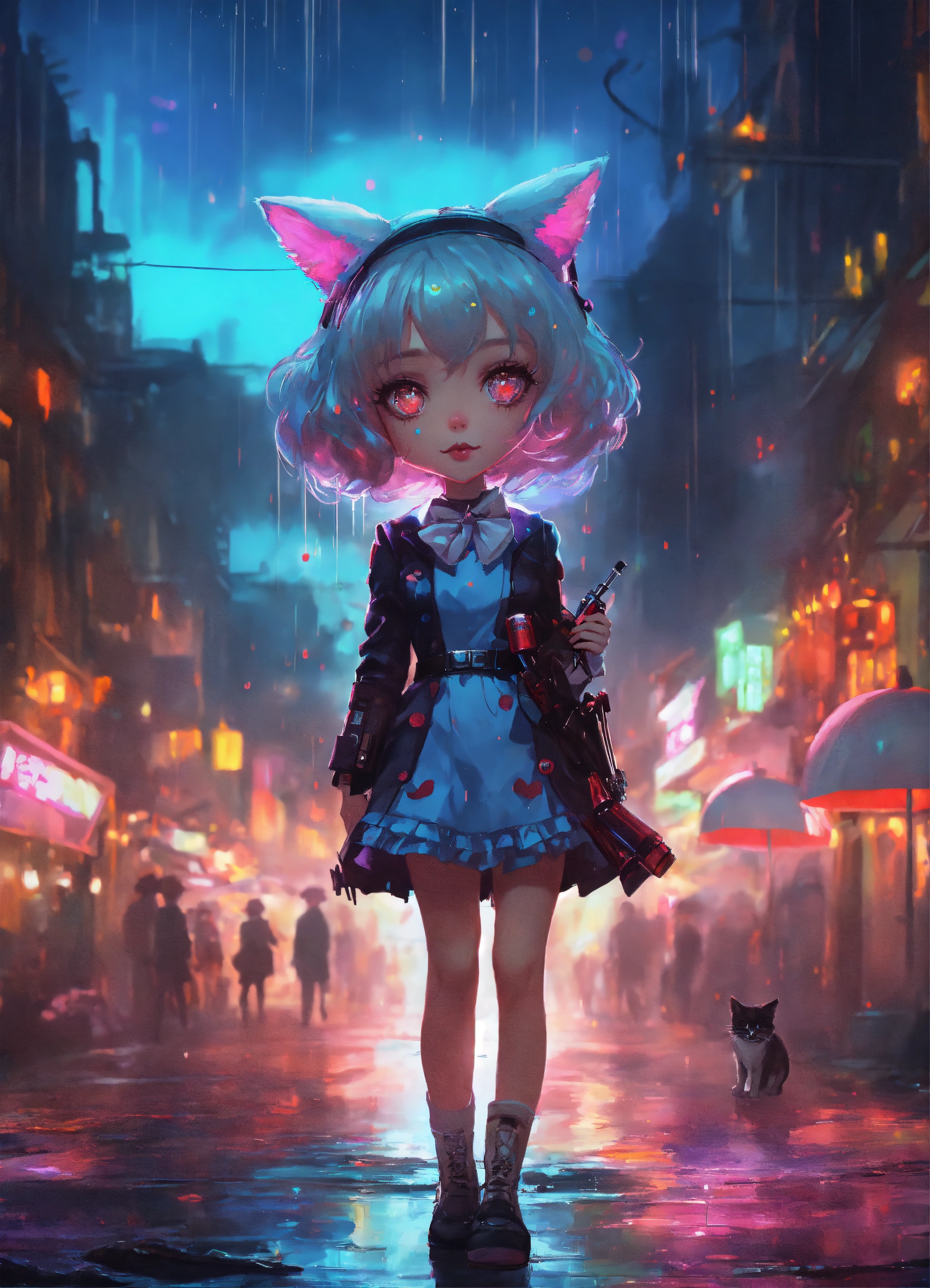 A running creepy little cyborg anime alice in wonderland with cat ears, with a molotov cocktail in hand, l, black, perfect face, trending on artstation, neon lights, rainy night, abstract painting by mark ryden