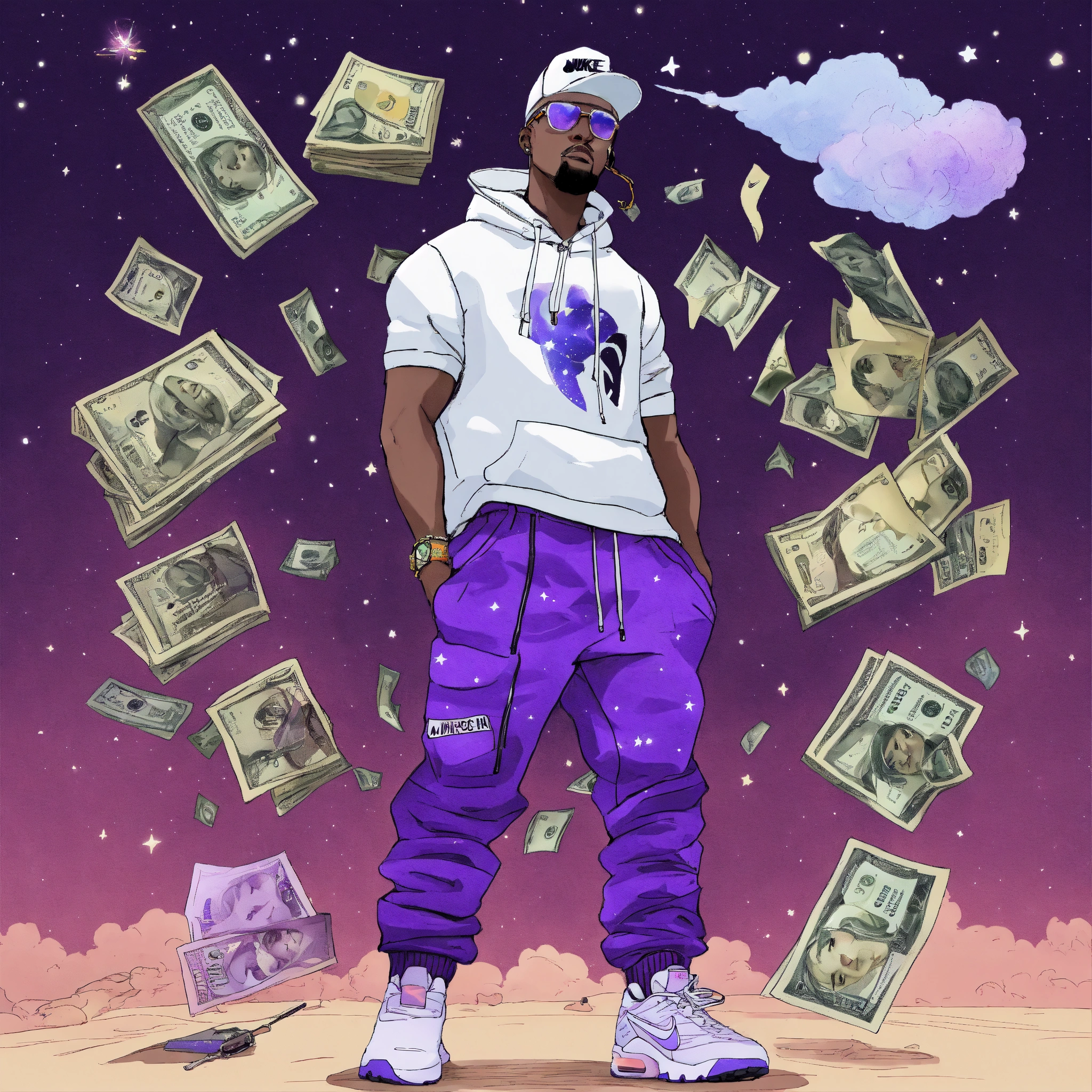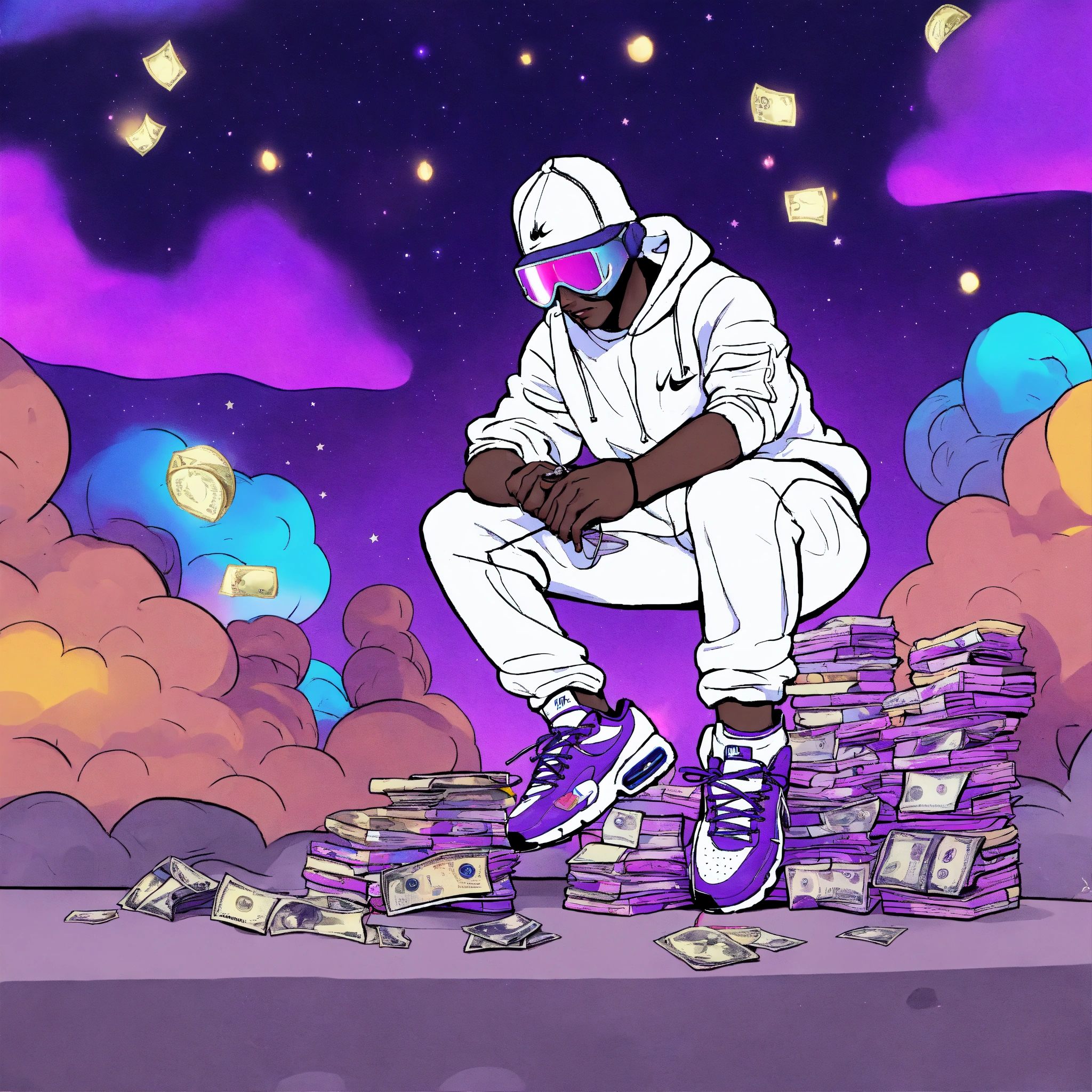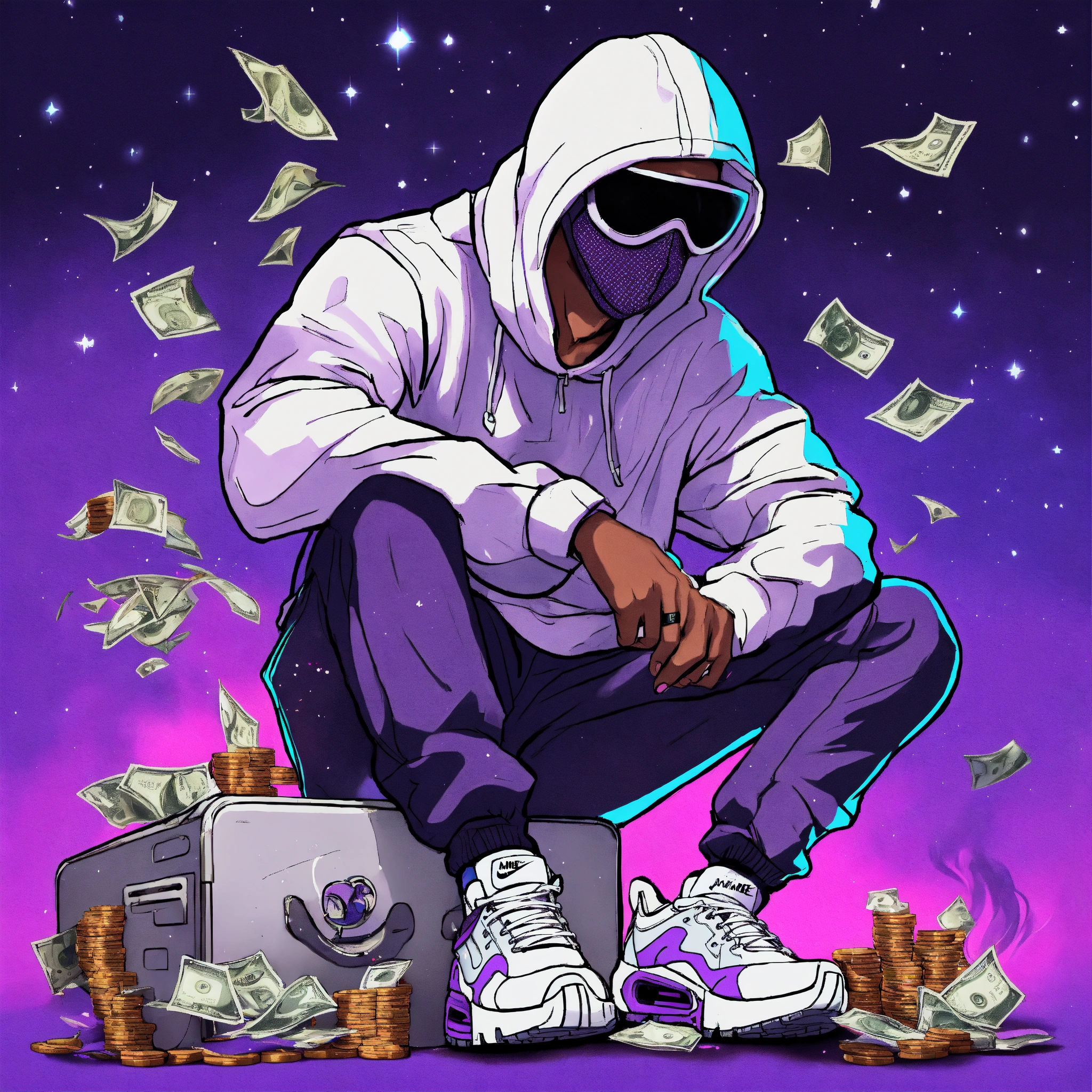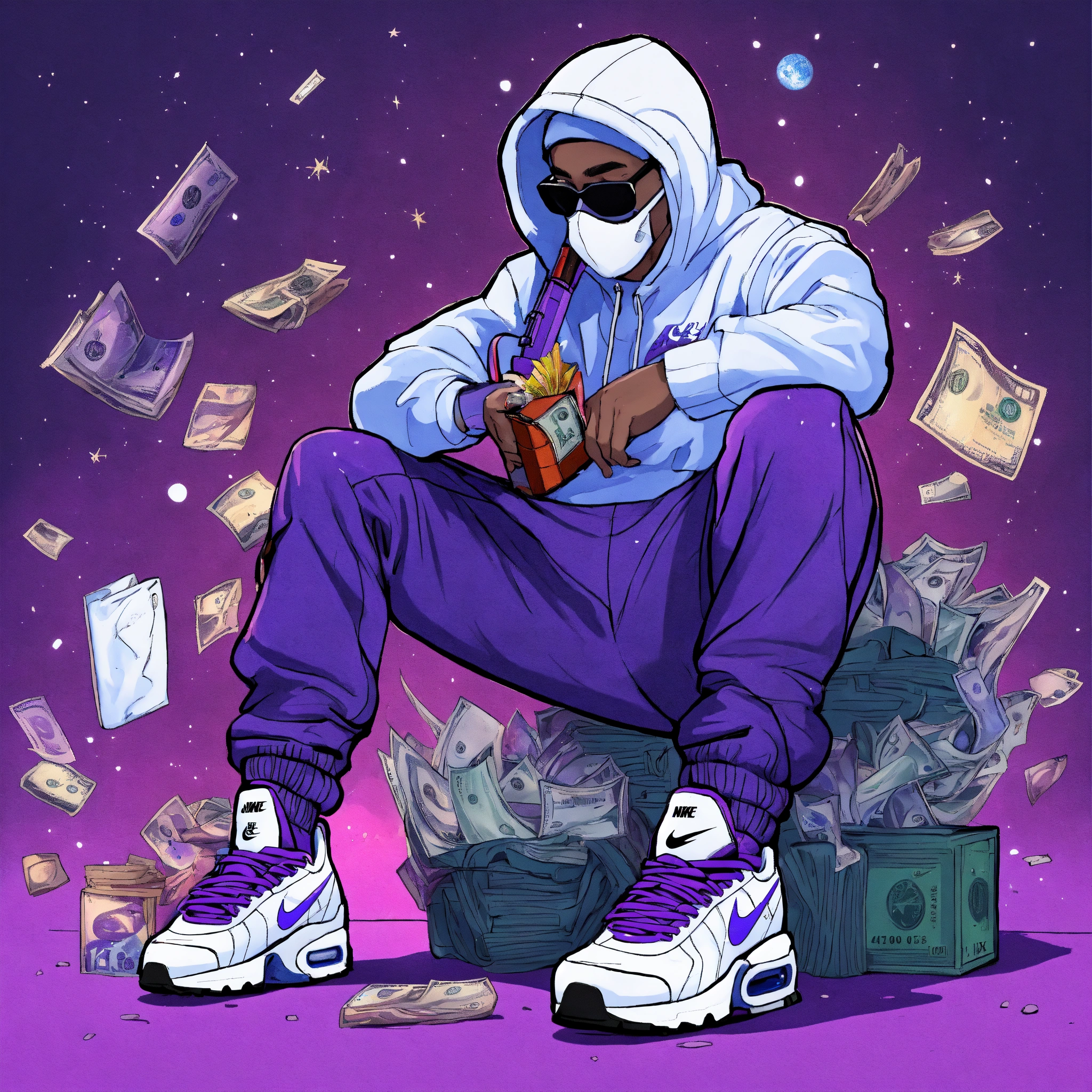 Criminal, hip hop, white ski mask, jogging pants, nike air max plus, pistol, drawing, art, 4k, cartoon style, bundles of money, ghetto, galaxy, stars, smoke, purple