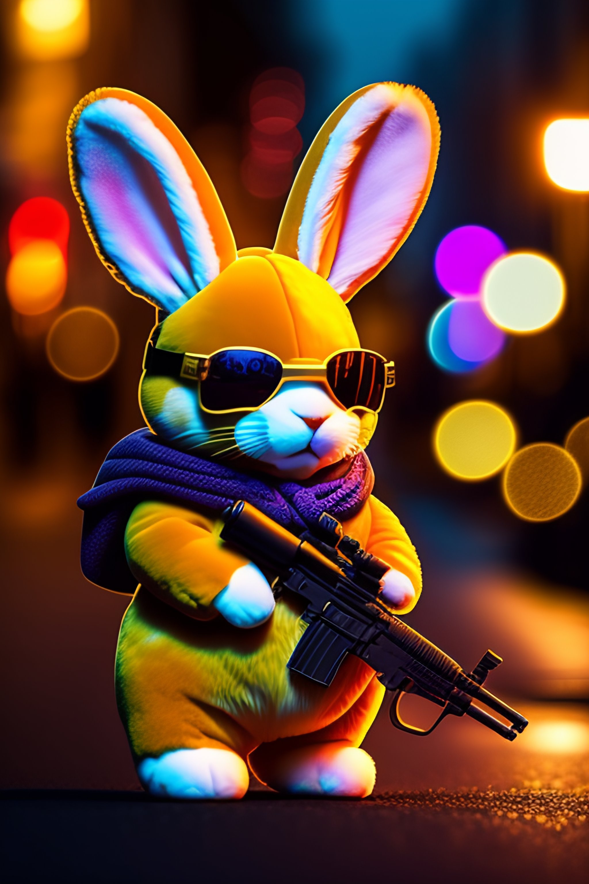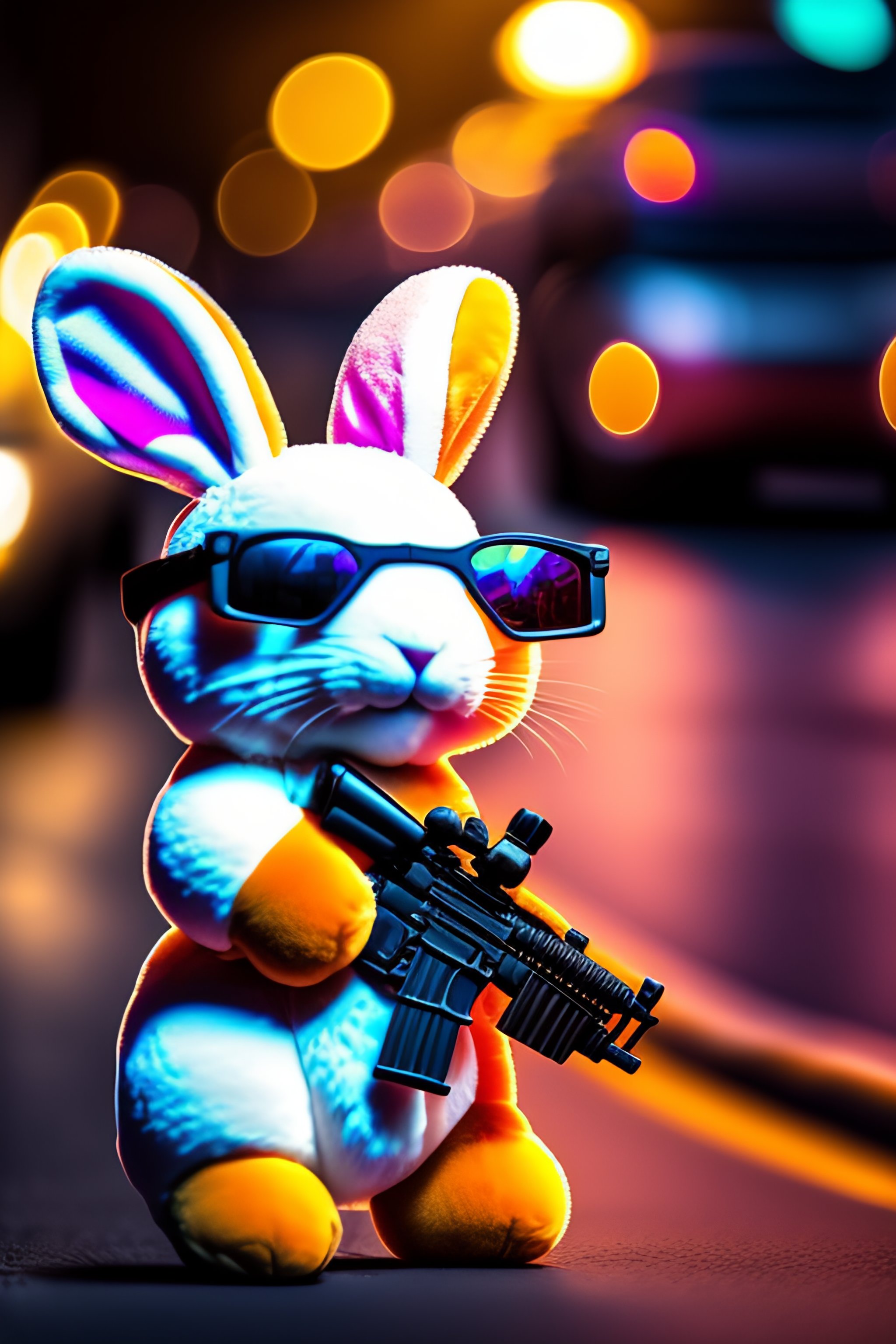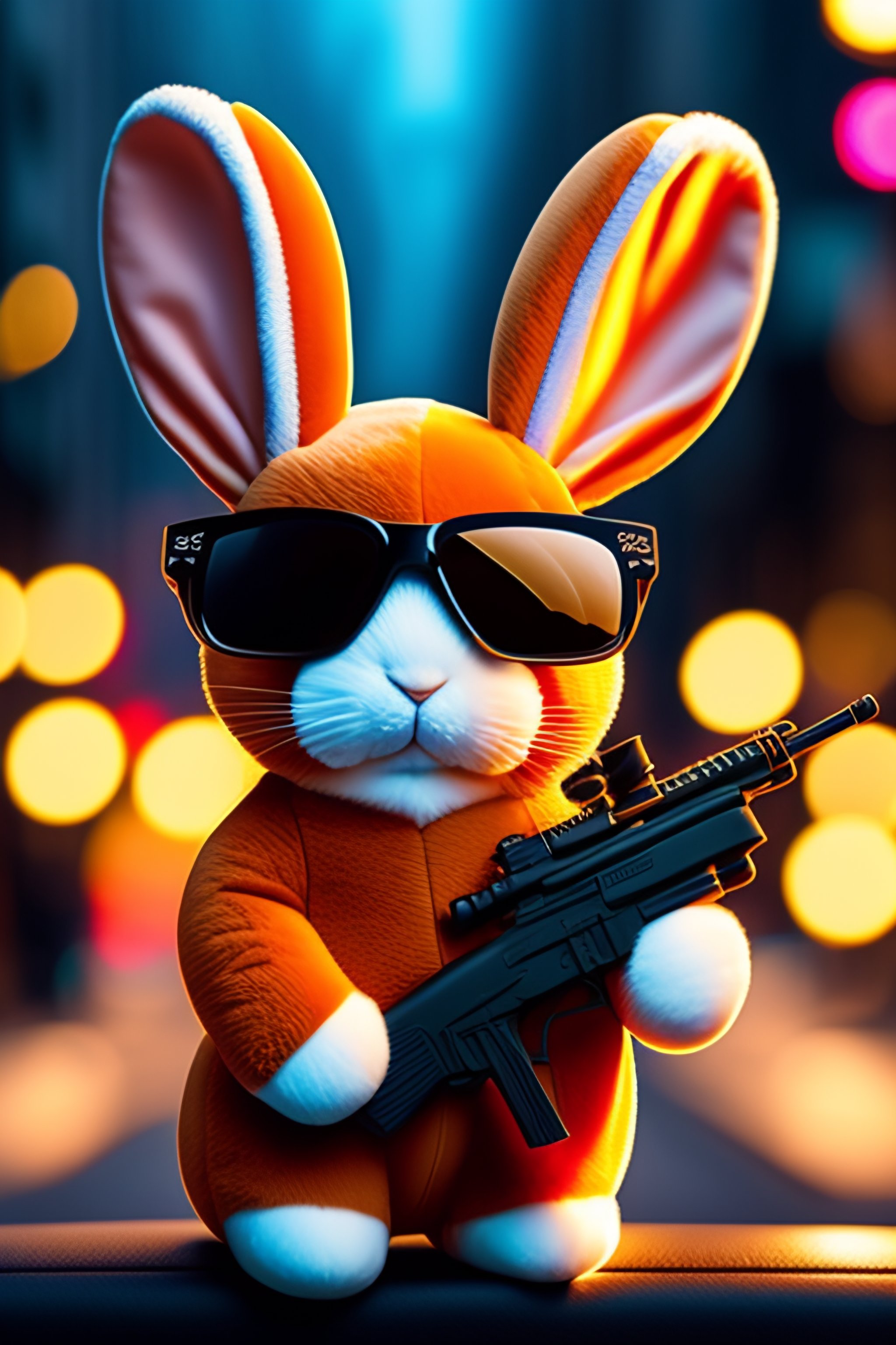Plush rabbit with gun and sunglasses in front of bank robbing 8k