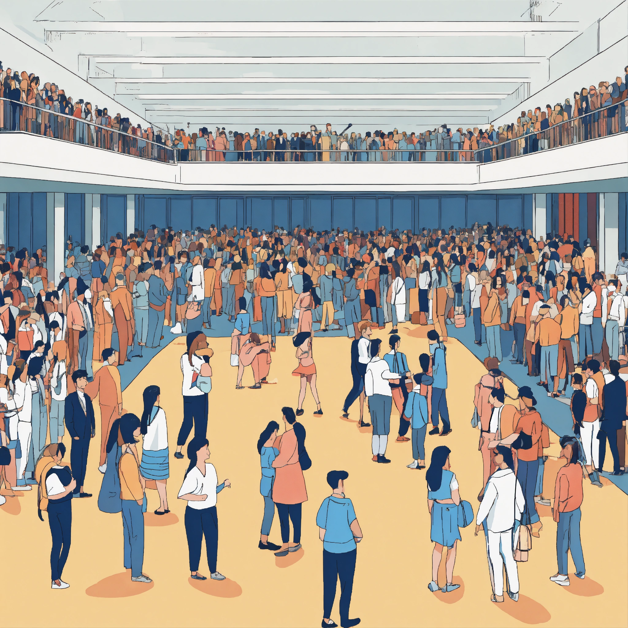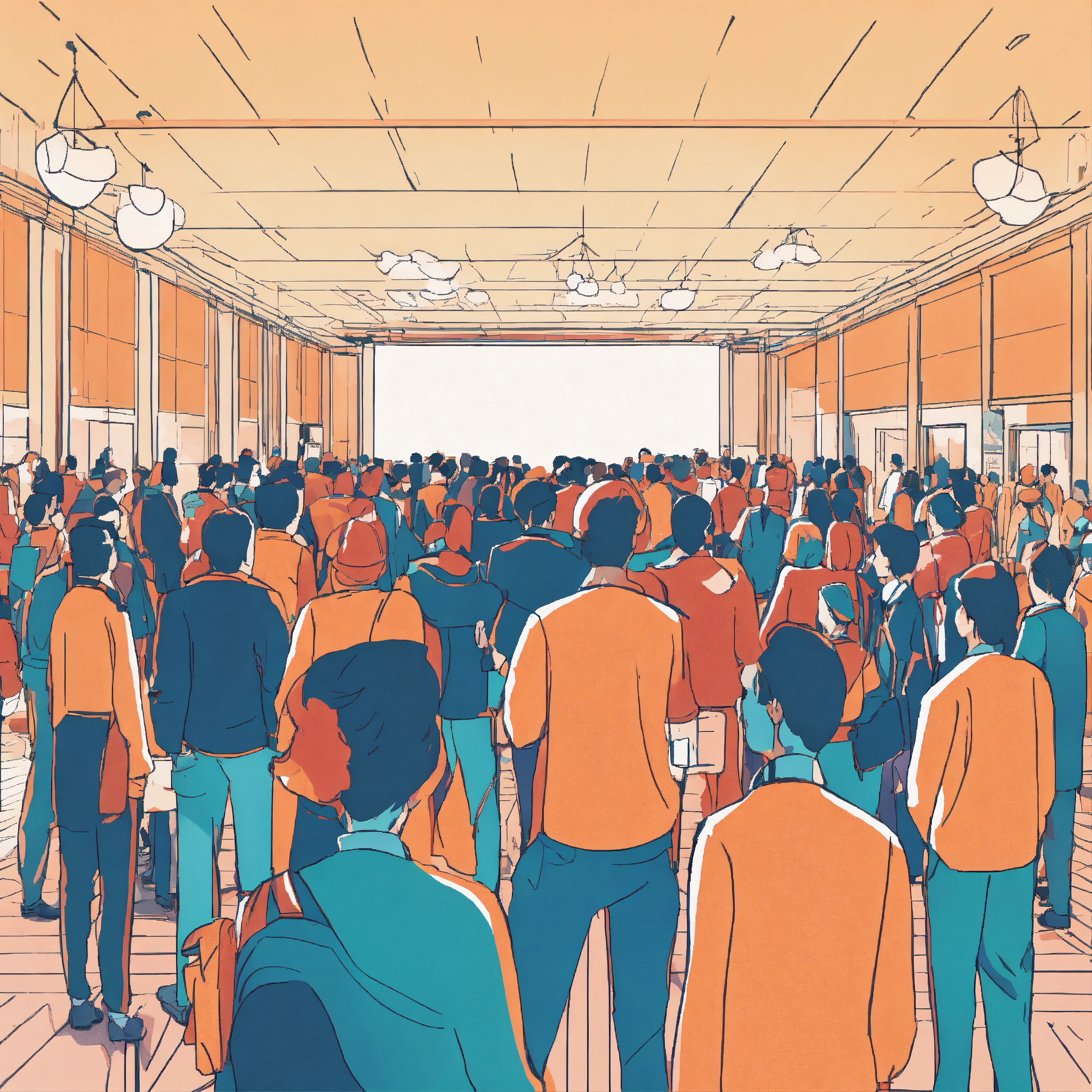 People gathering in a big hall, happy to see eachother, hand shaking, illustration, line art, zoom out image