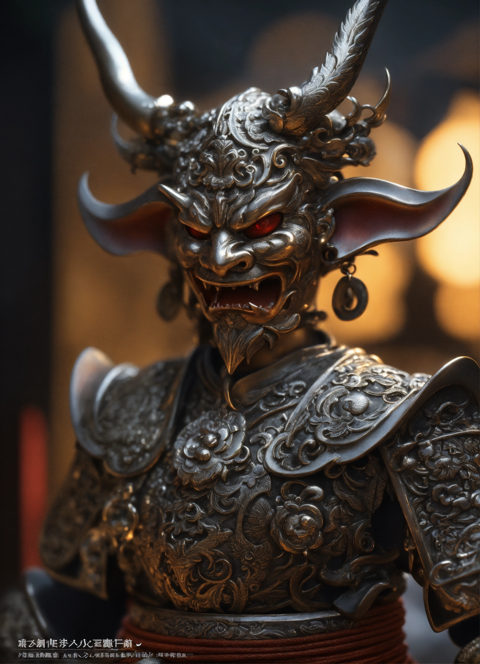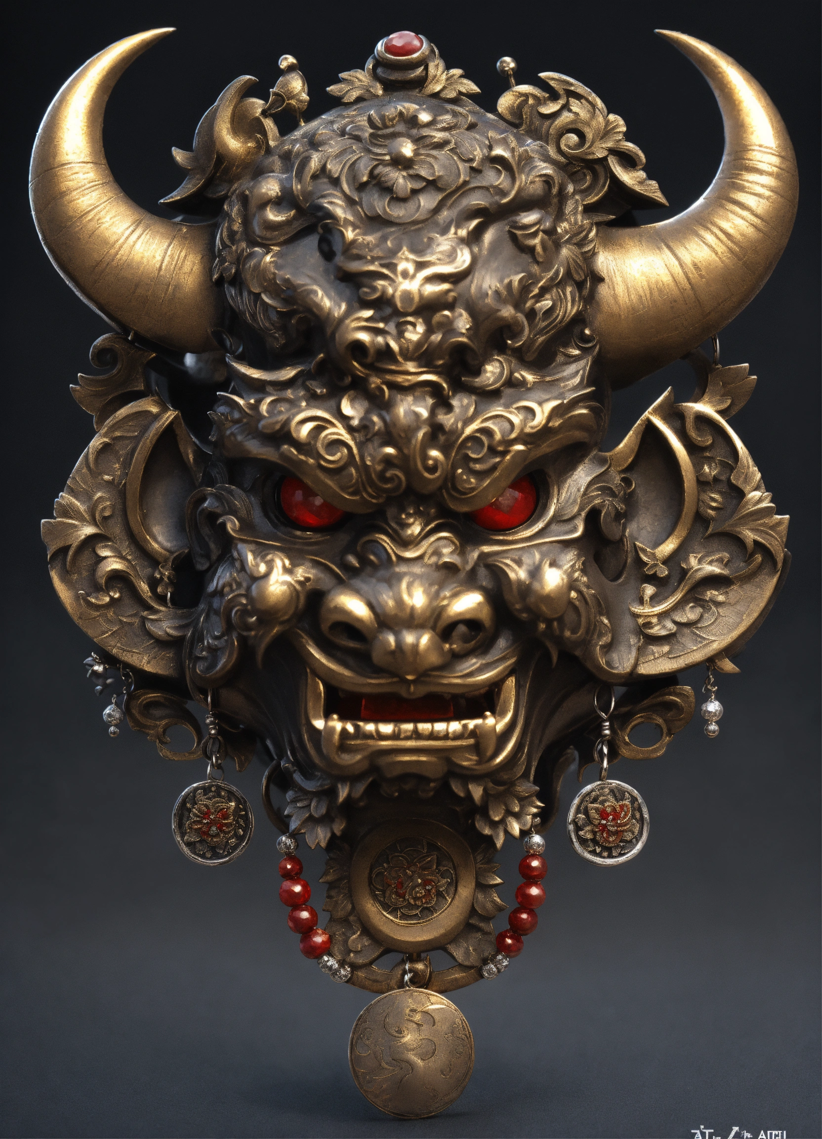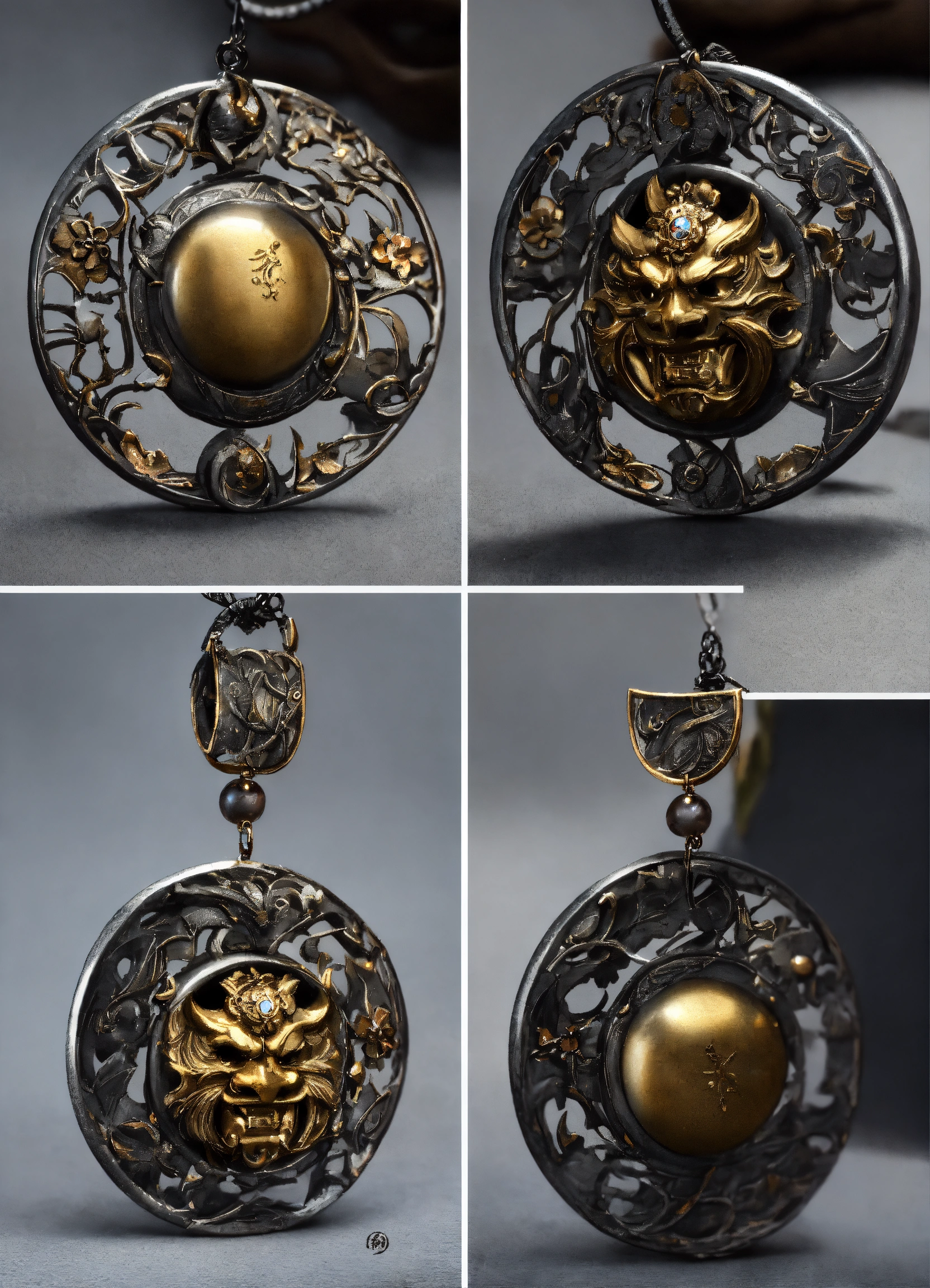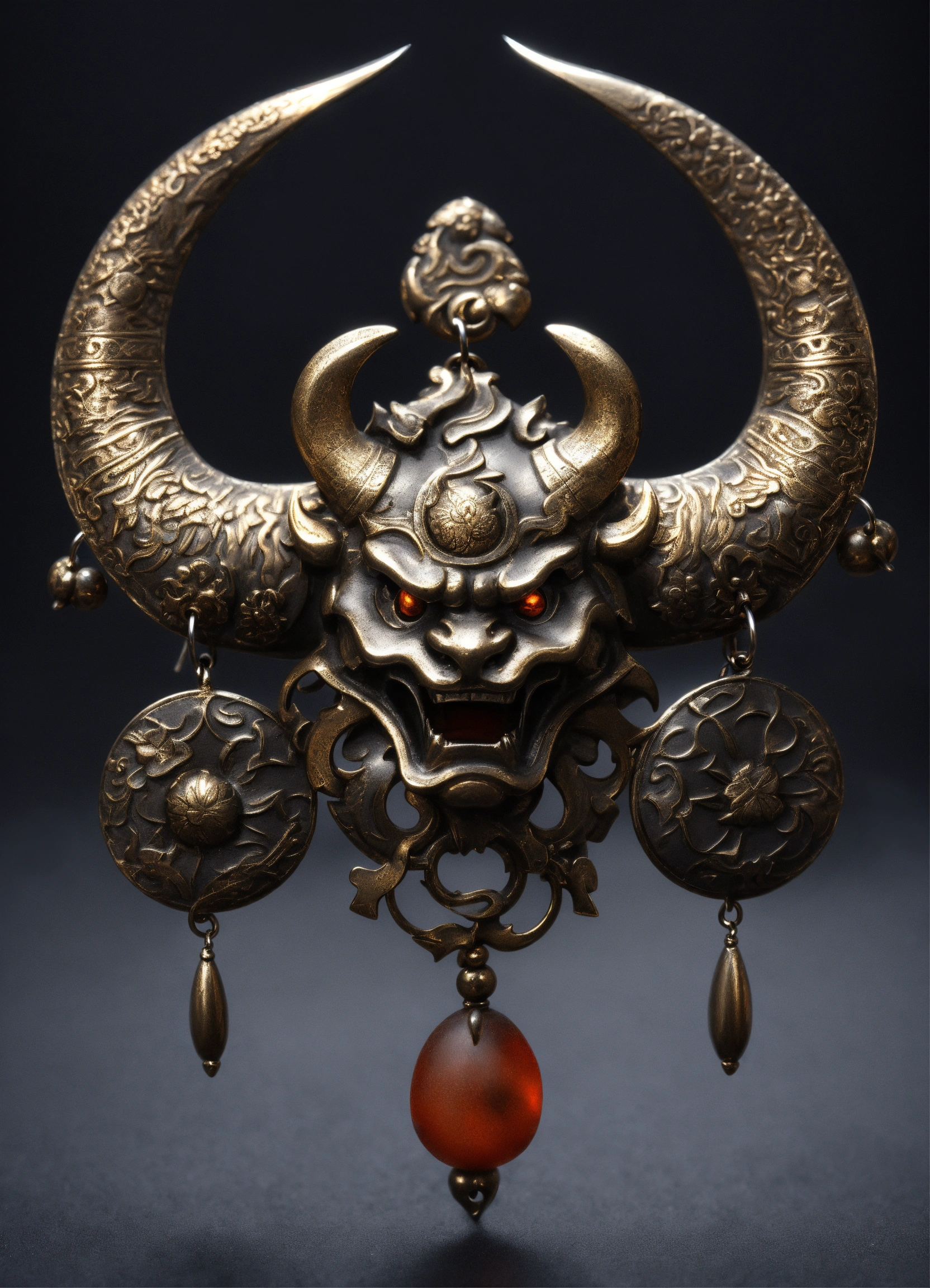 Meiji period demon earing, ford hallam style, shibuichi, tsuba, iron, silver, silver material, highly detailed, artstation, concept art, sharp focus
