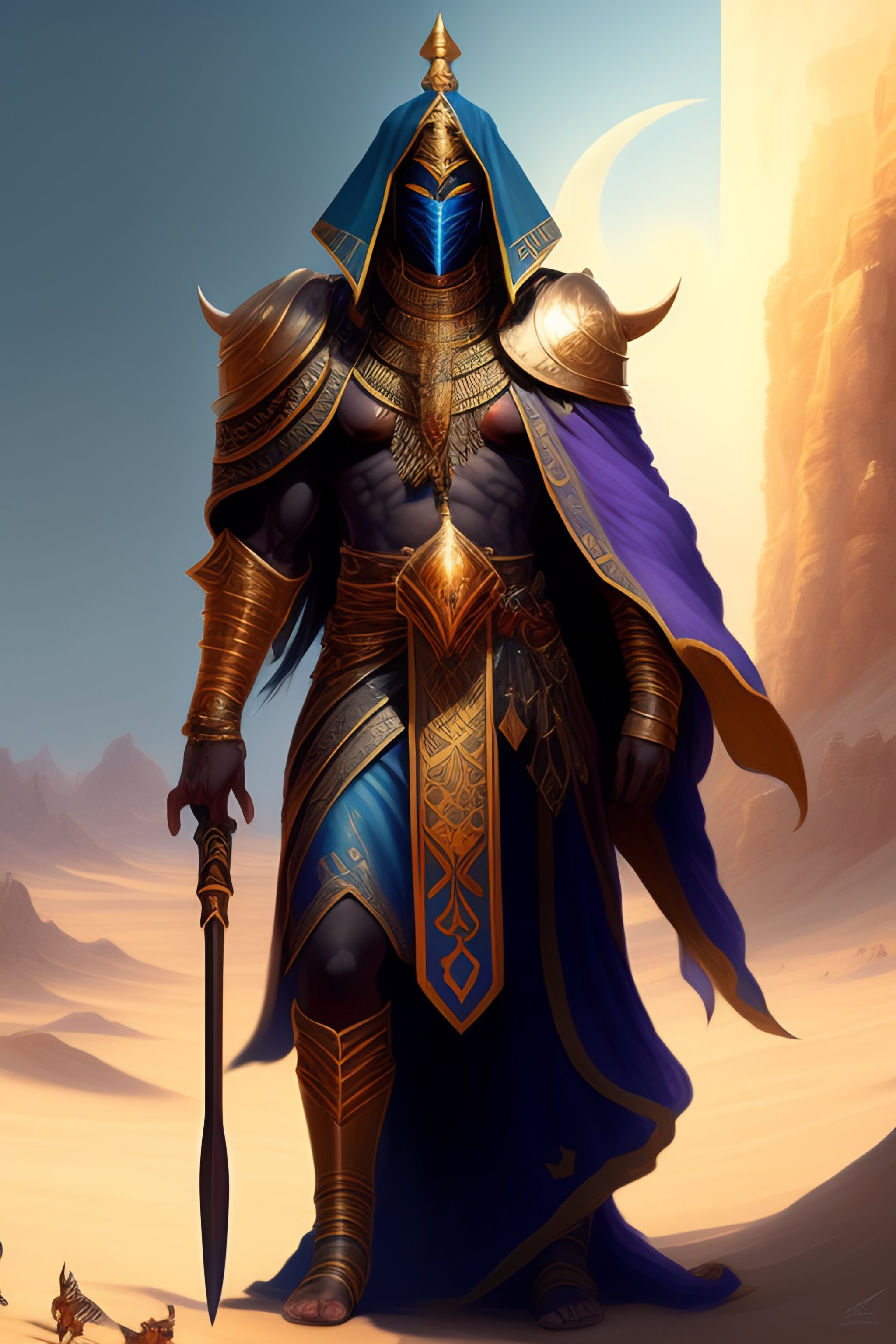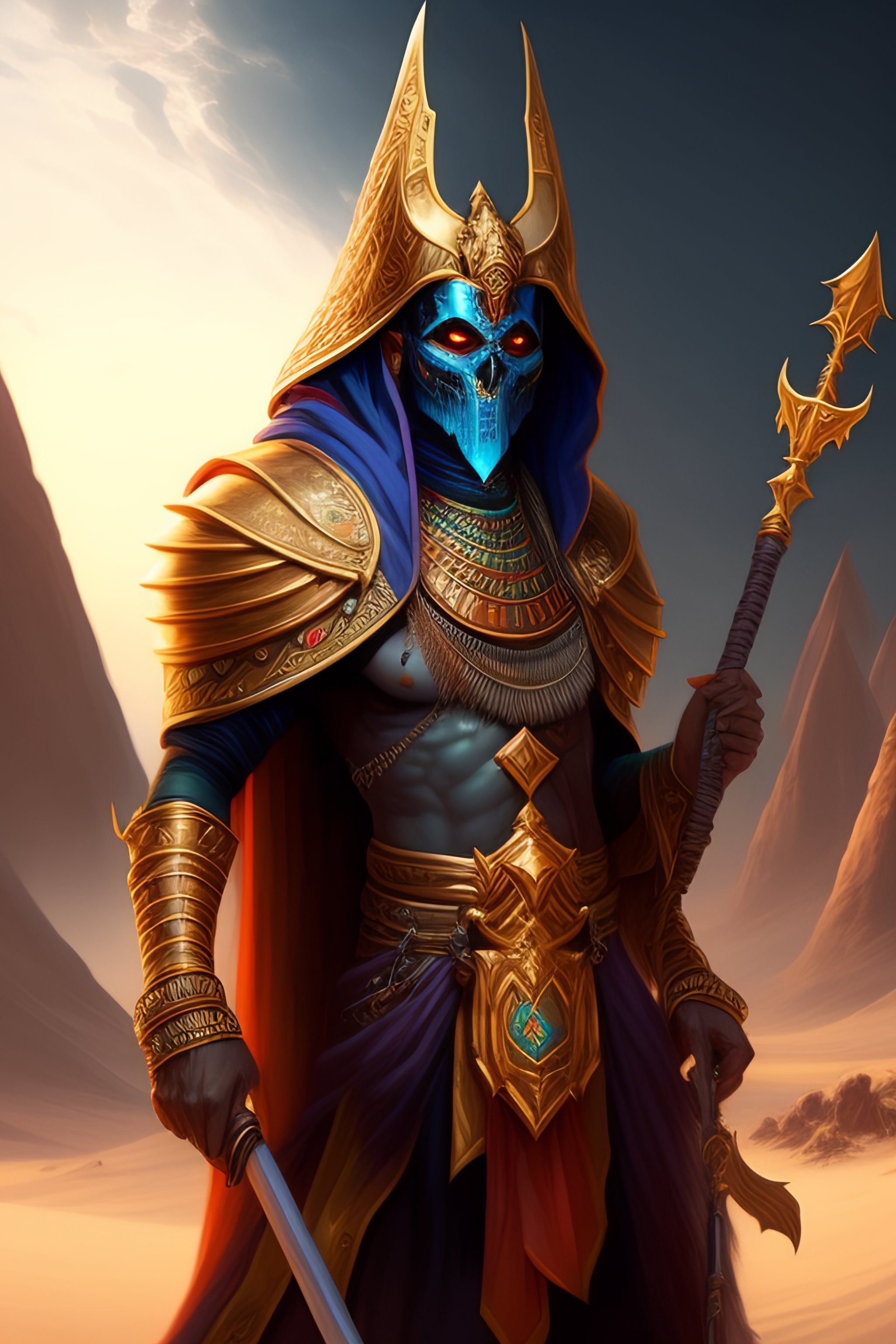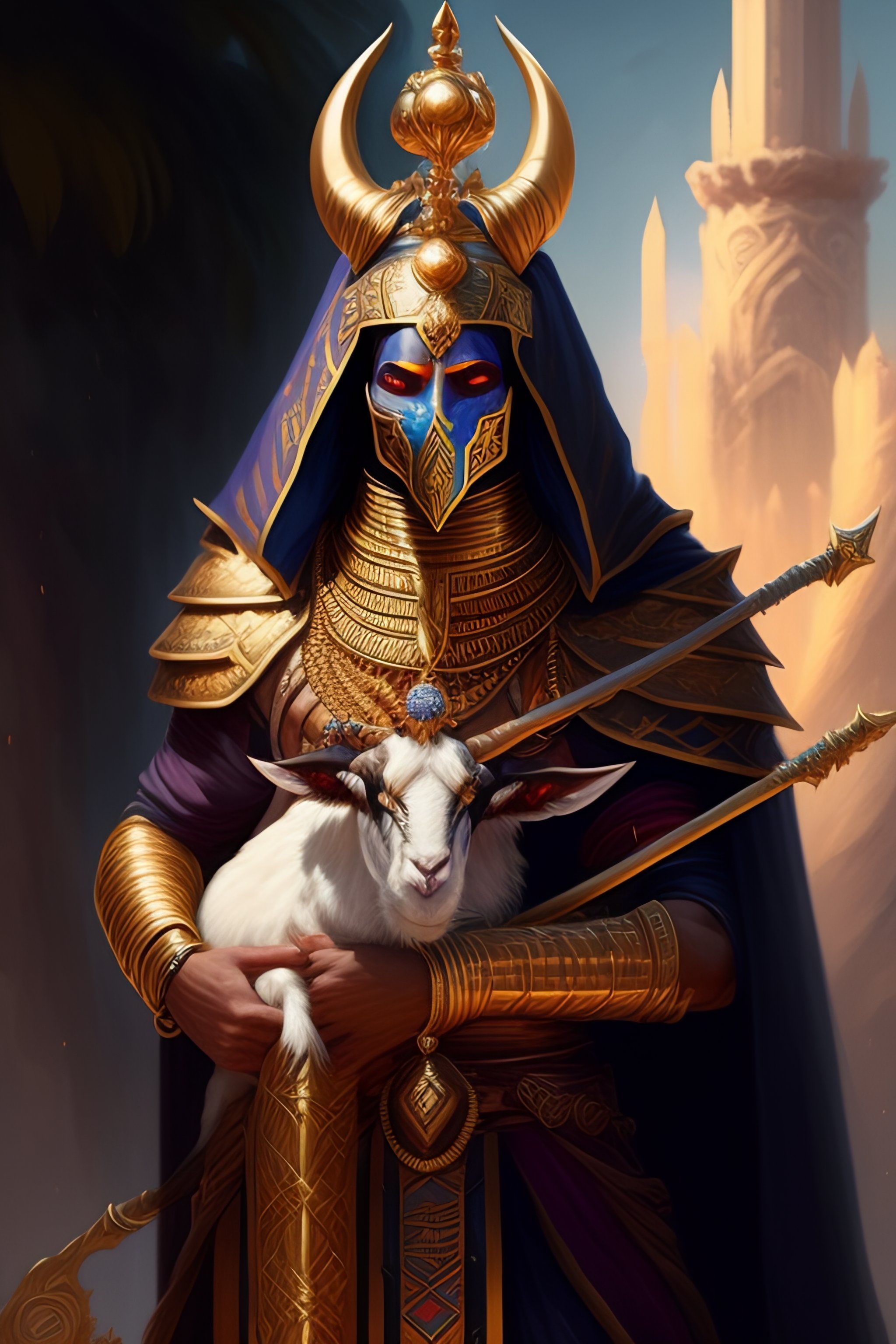 An undead desert lich pharaoh, holding a goat head staff, egyptian, beetle, deep focus, d & d, fantasy, intricate, elegant, highly detailed, digital painting, artstation, concept art, matte, sharp, illustration, hearthstone, art by artgerm and greg rutkowski and alphonse mucha