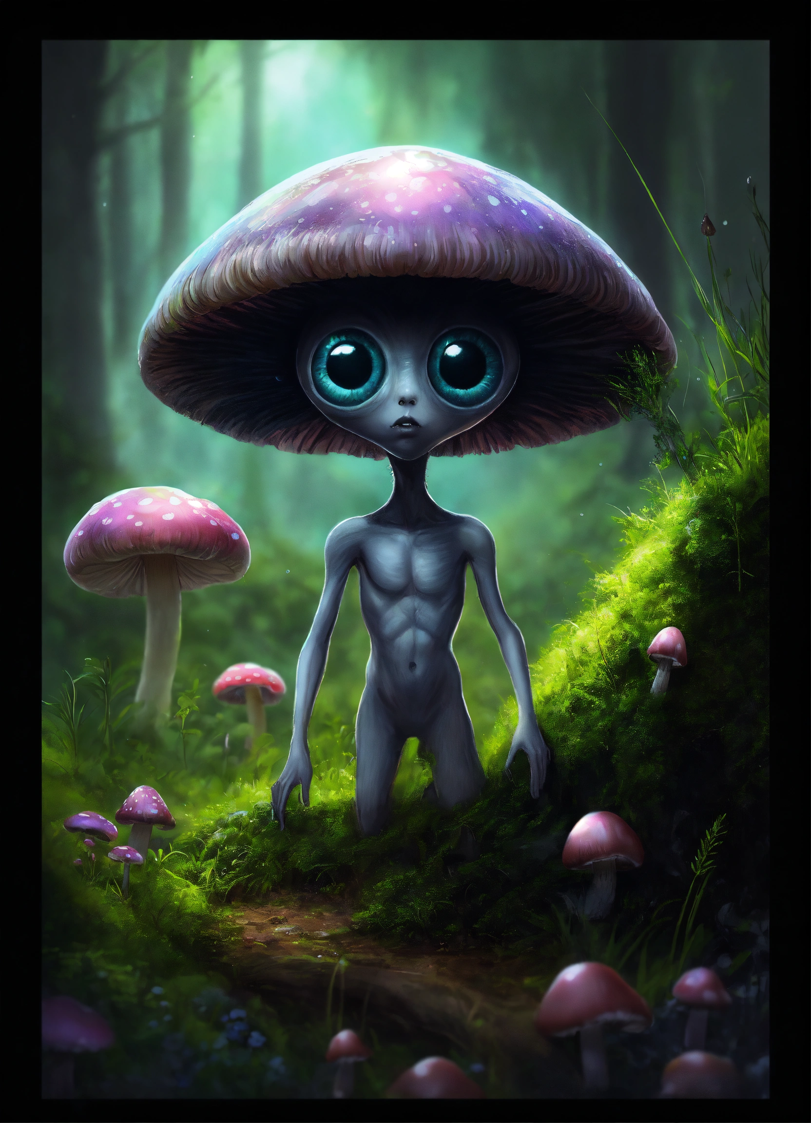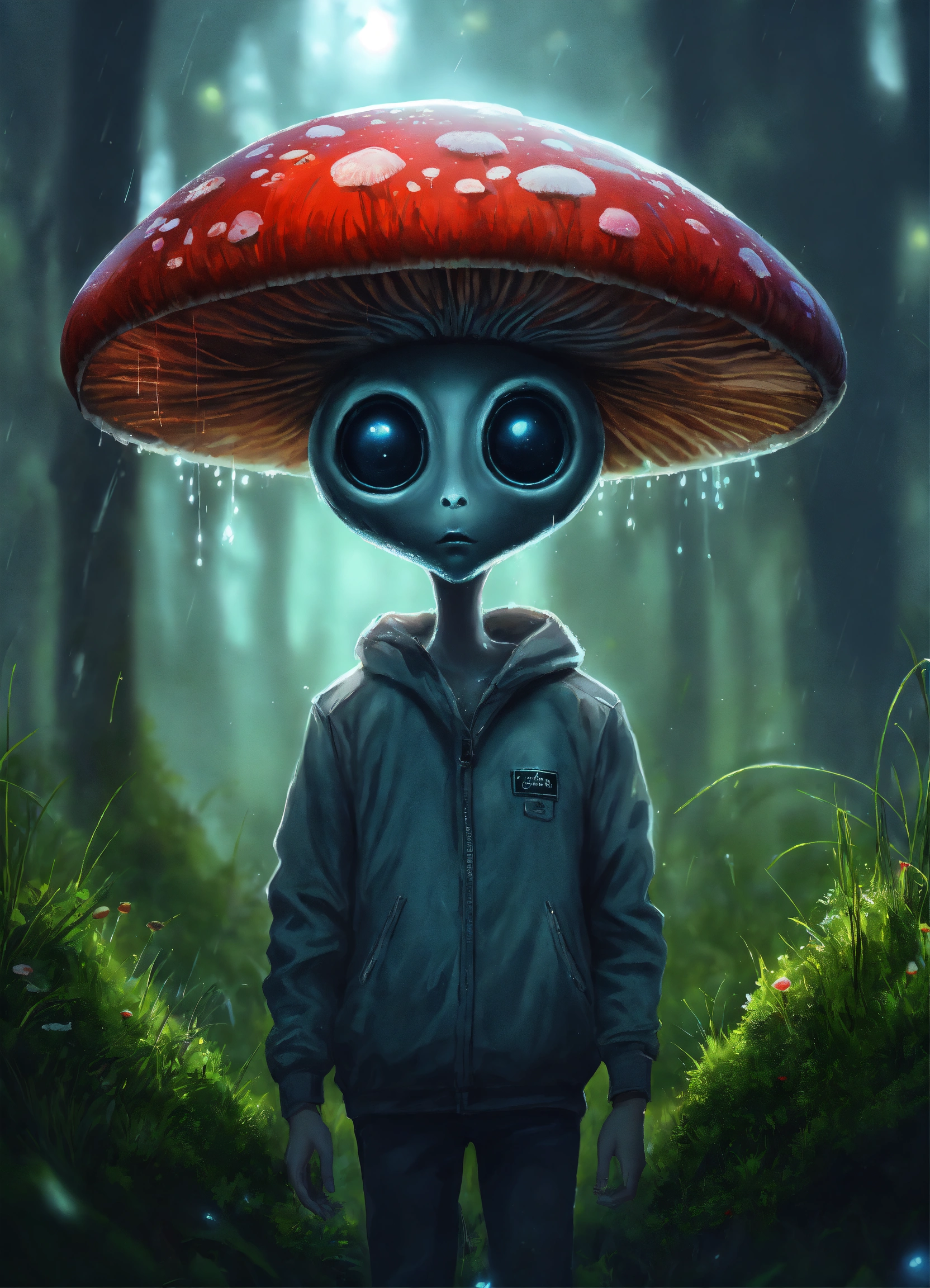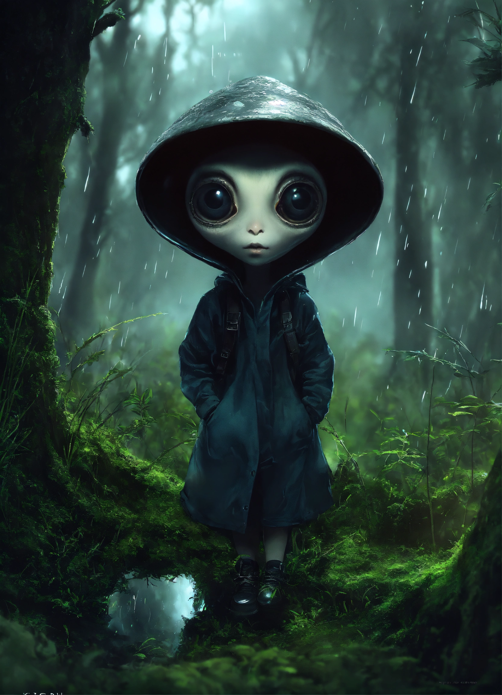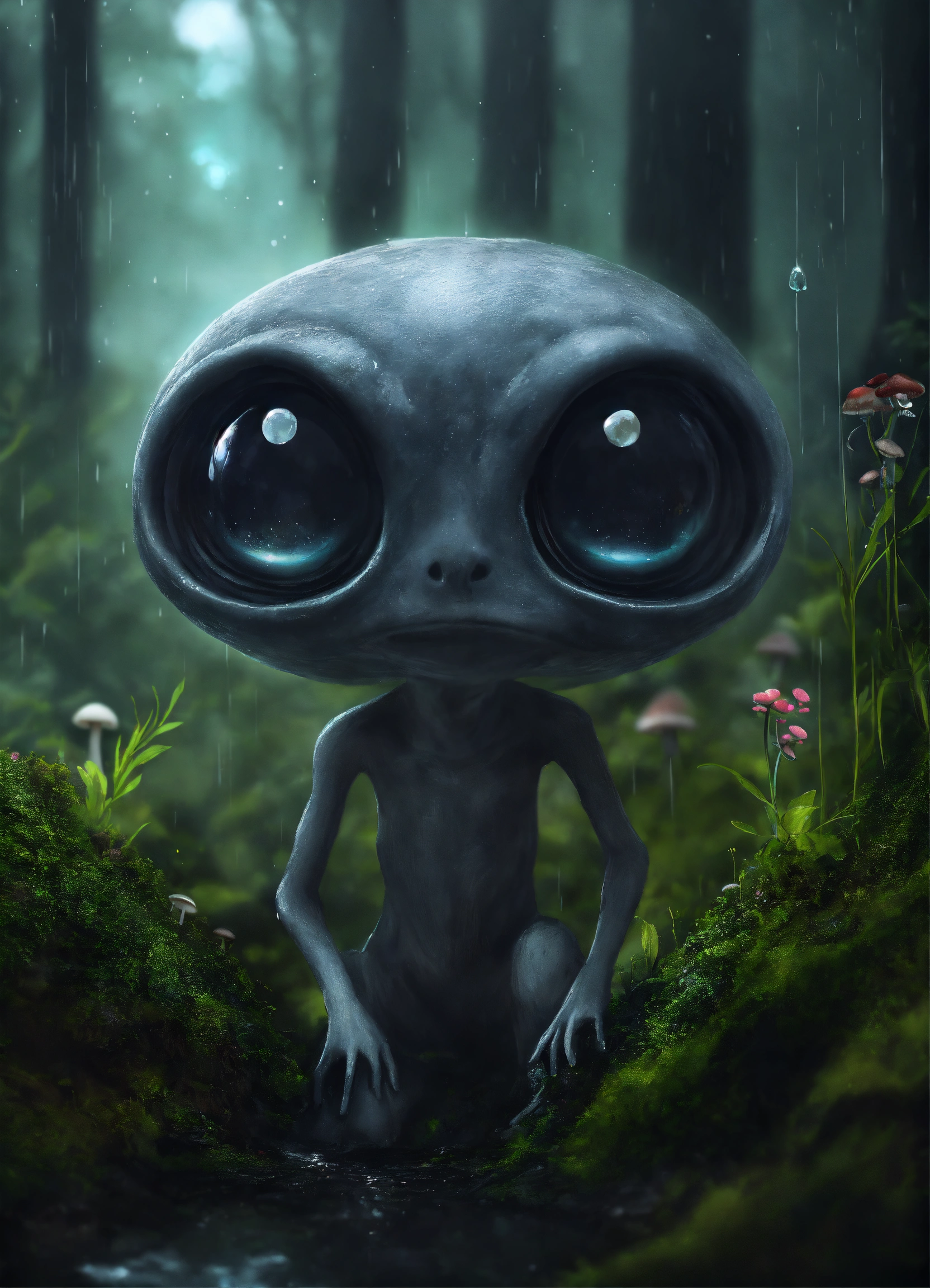 A grey alien, big eyes blacks, like a globin, mushrooms, grass, nigth, forest rain, hyperrealist, dark misteryous light digital illustration by ryden --s 50