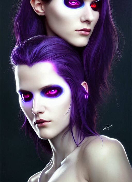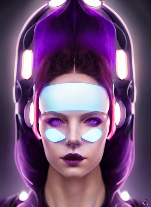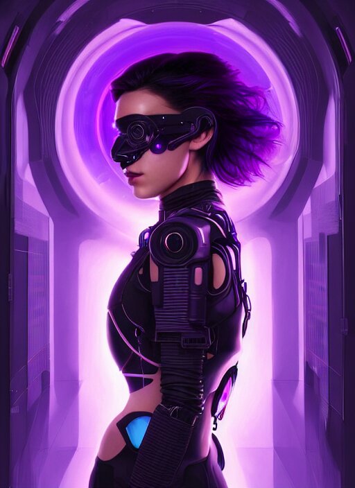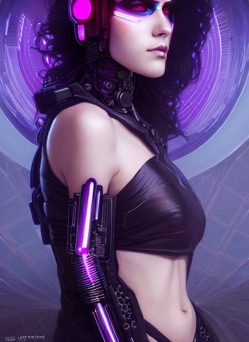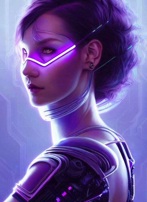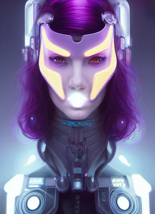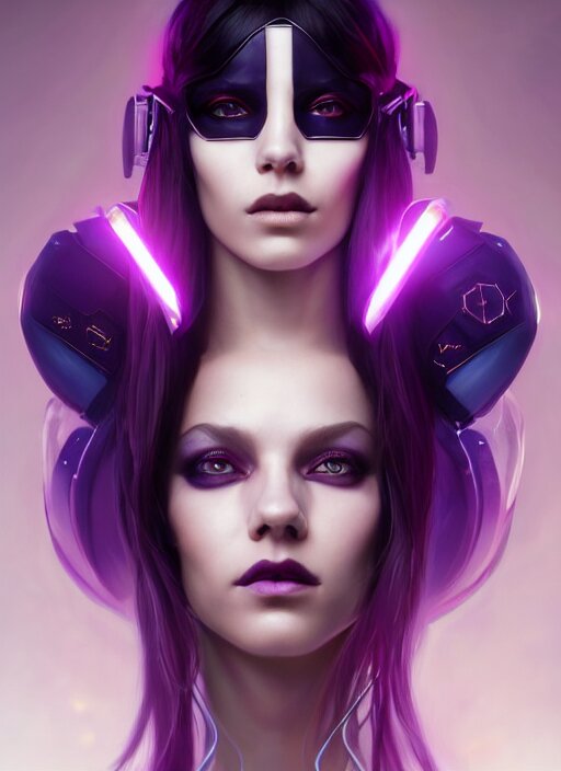 Symmetry portrait of a very beautiful caucasian young cyberpunk woman with dark purple hair wearing a mask, sci - fi, tech wear, glowing lights intricate, elegant, highly detailed, digital painting, artstation, concept art, smooth, sharp focus, illustration, art by artgerm and greg rutkowski and alphonse mucha