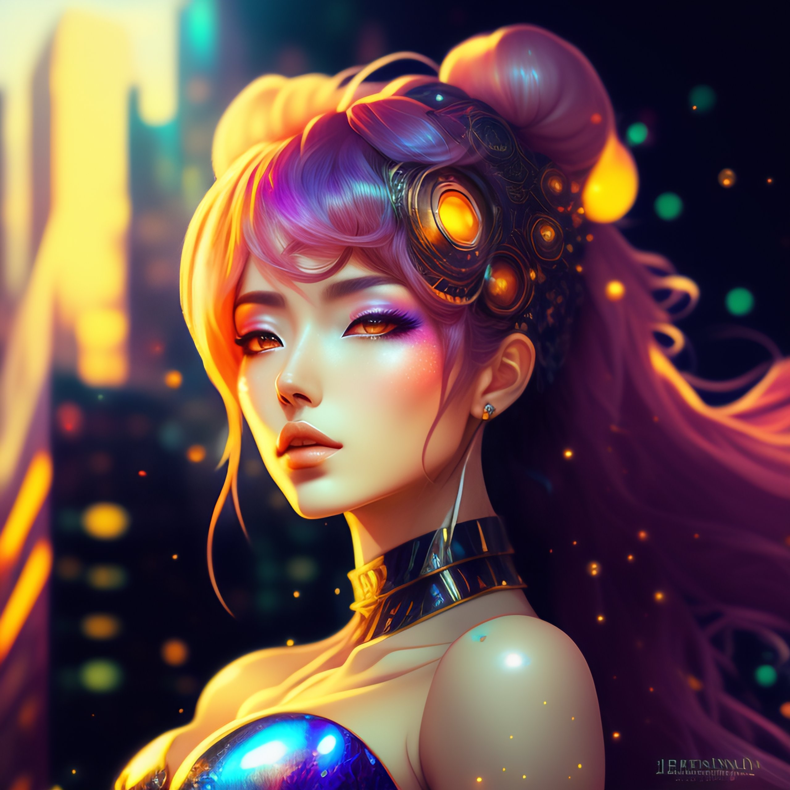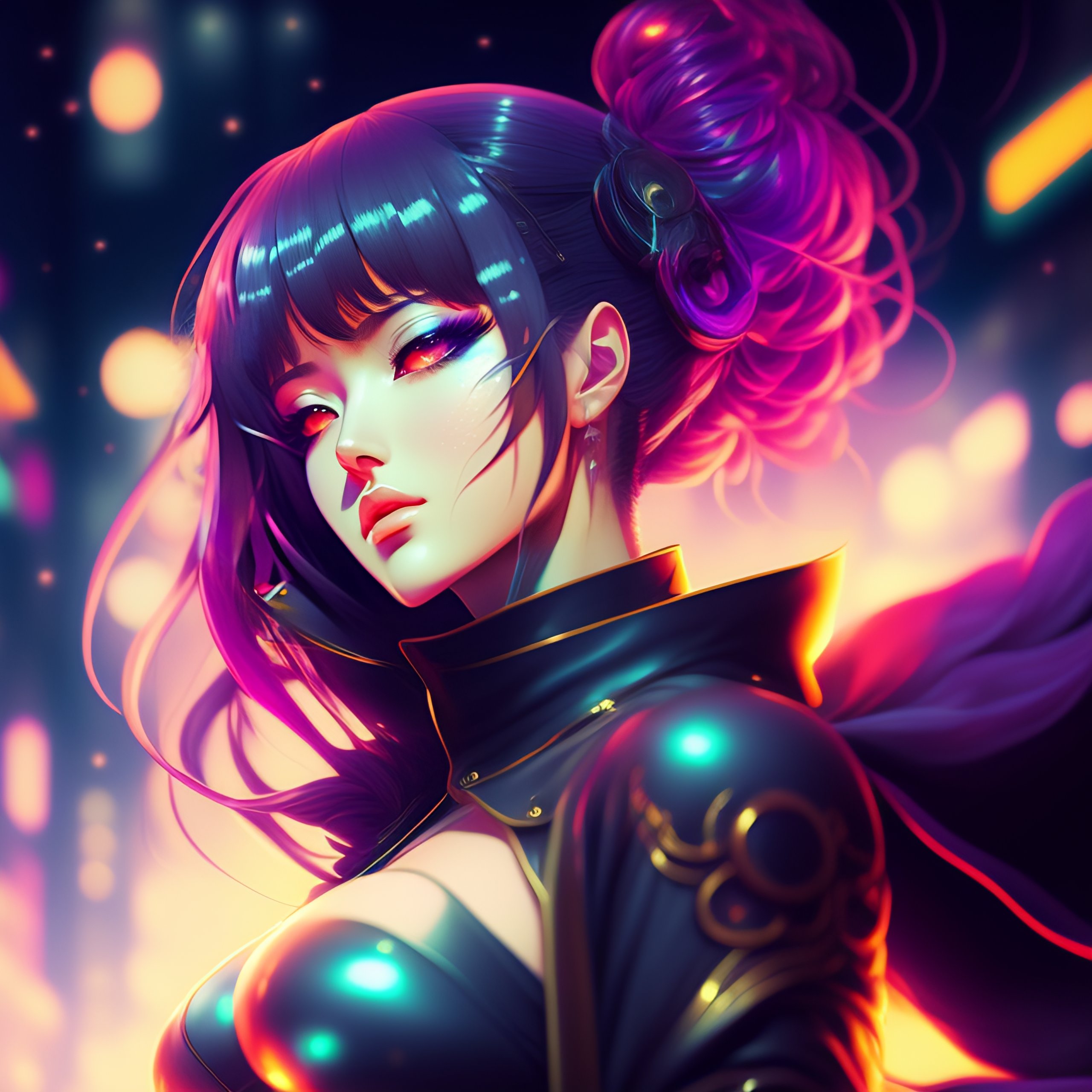 Dreamy mixed media artwork, hyperwave cover art, anime character design, low-angle:: personnification of the annual hypocrisy of false good resolutions, mad dancing, dynamic pose, expressive, jean-baptiste monge and vincent van gogh and anna dittmann art style:: pointillism, poster, dark light, minimalist, anime rendering, well detailed, cel shading, bokeh anime cyberpunk woman with