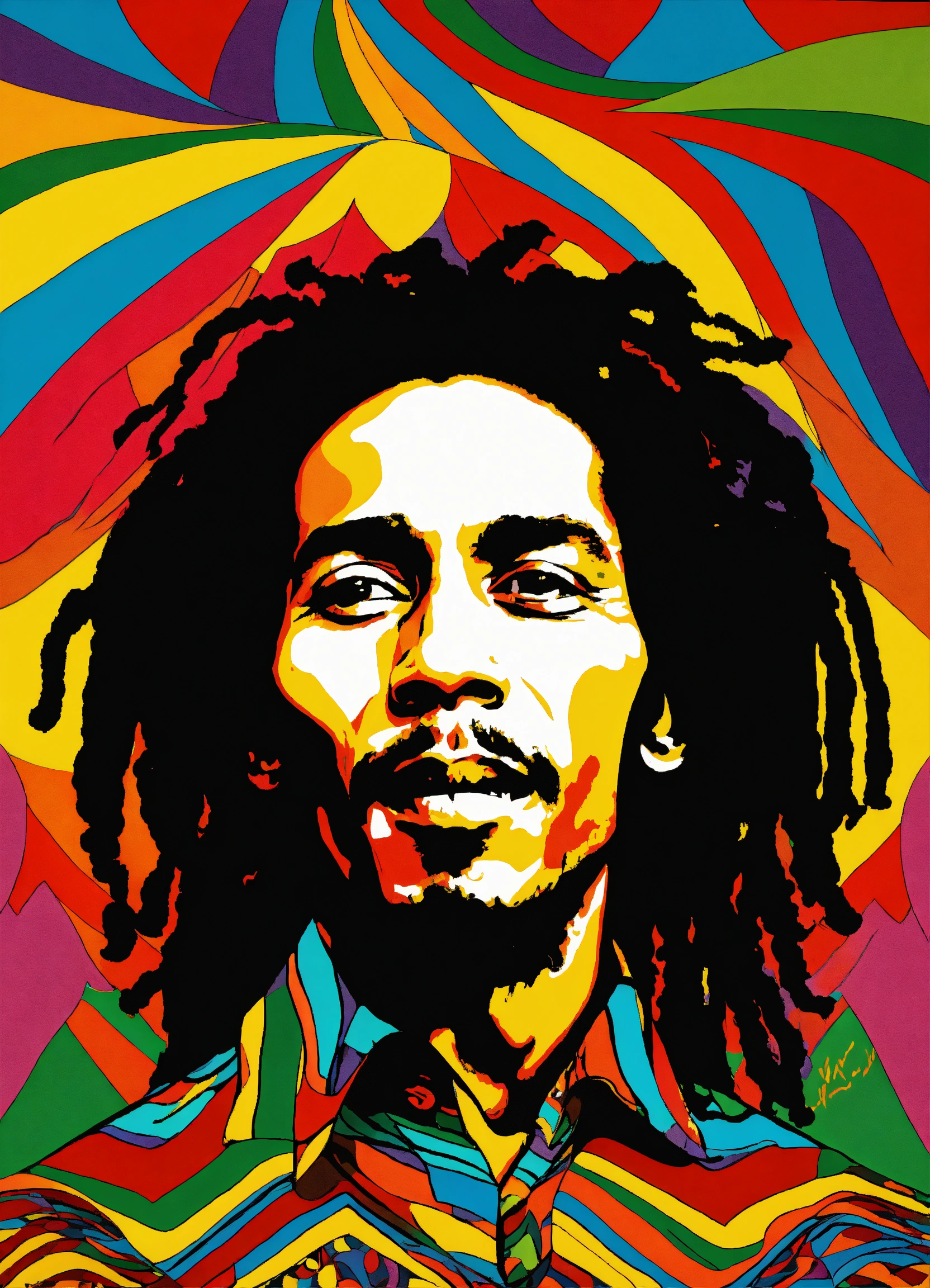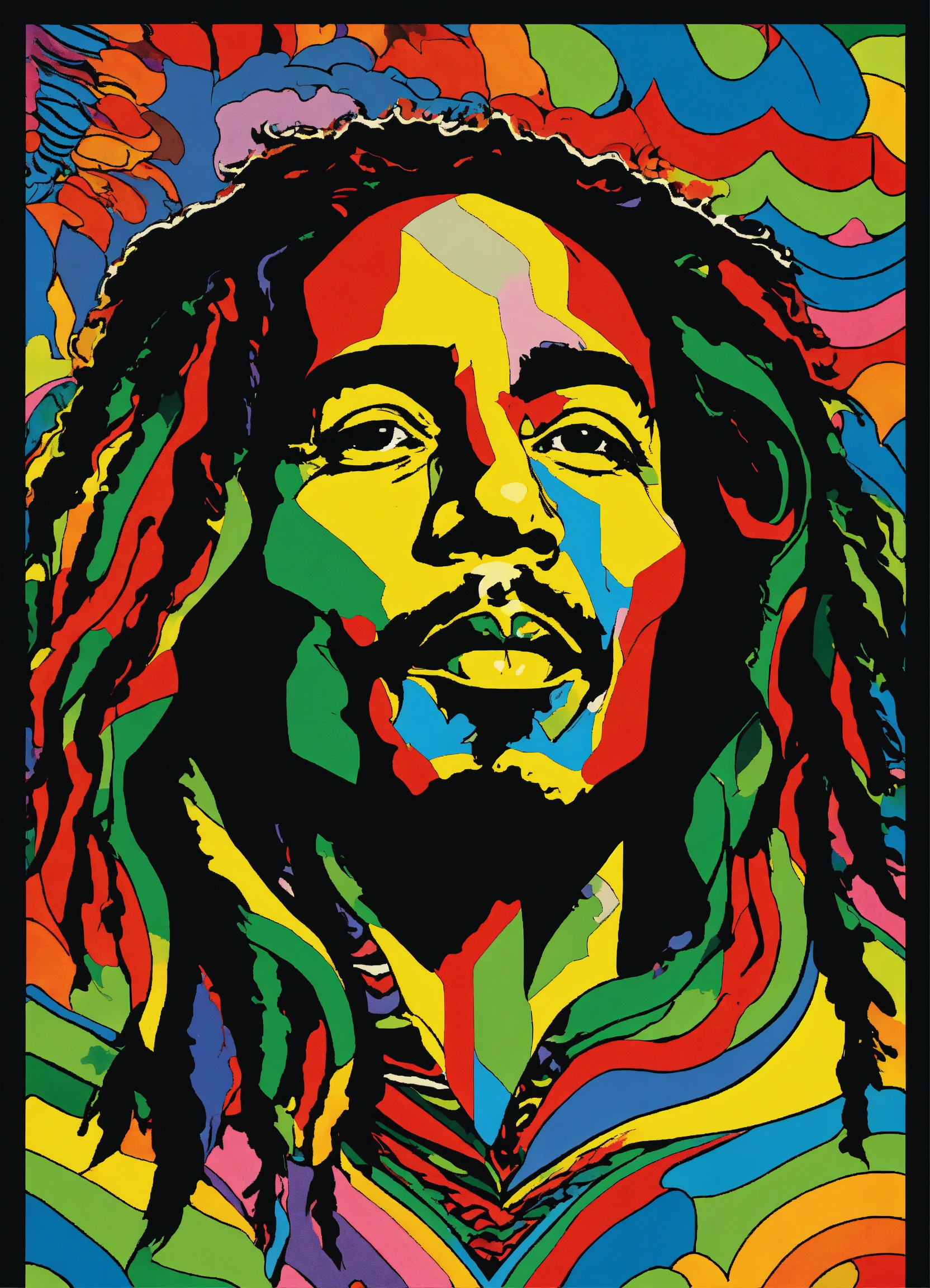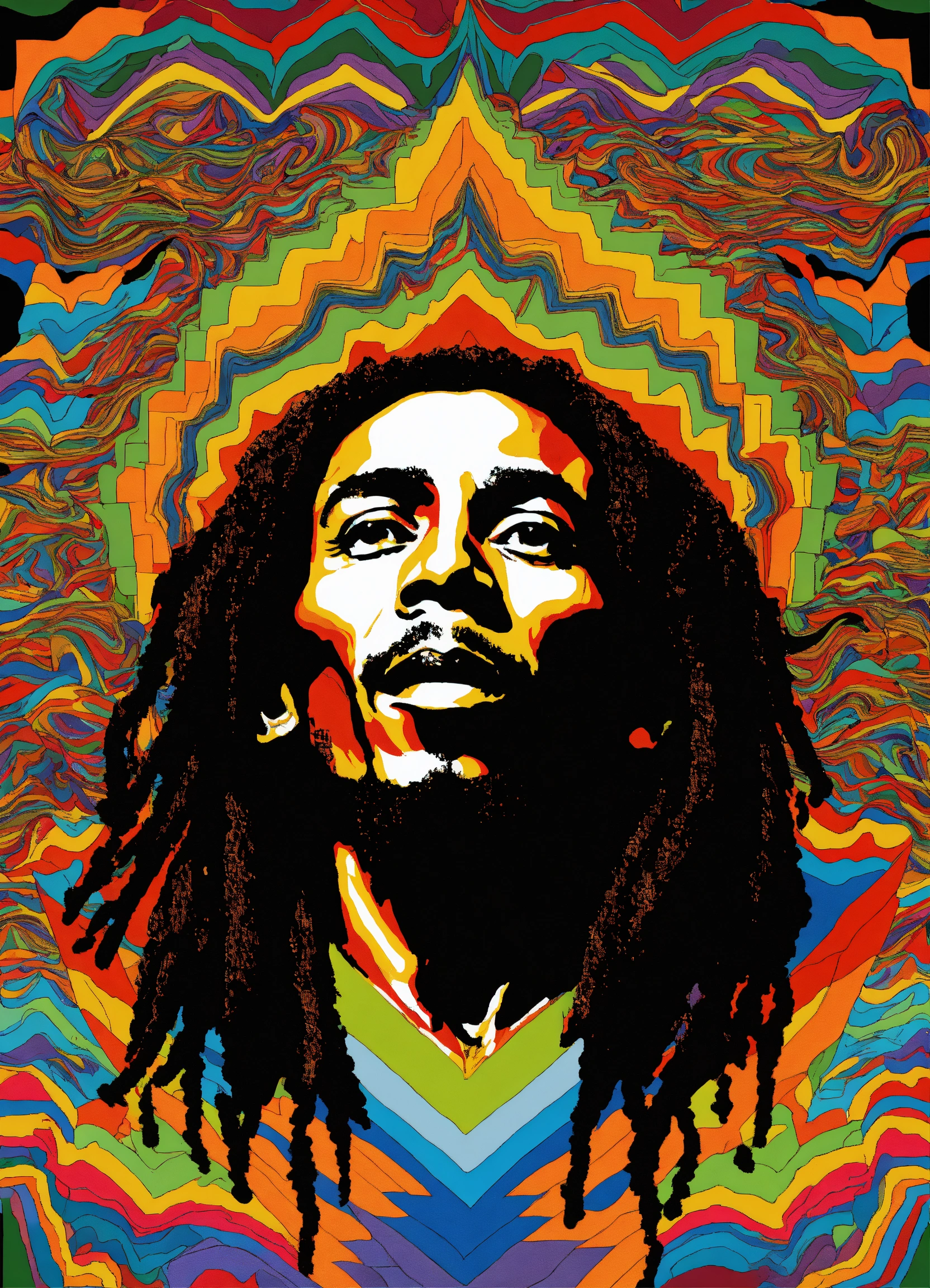 Bob marley, multi coloured, abstract, black and white chevron, coogi patterns, symmetrical frame, psychedelic waves of bliss, wavy by maurits cornelis escher