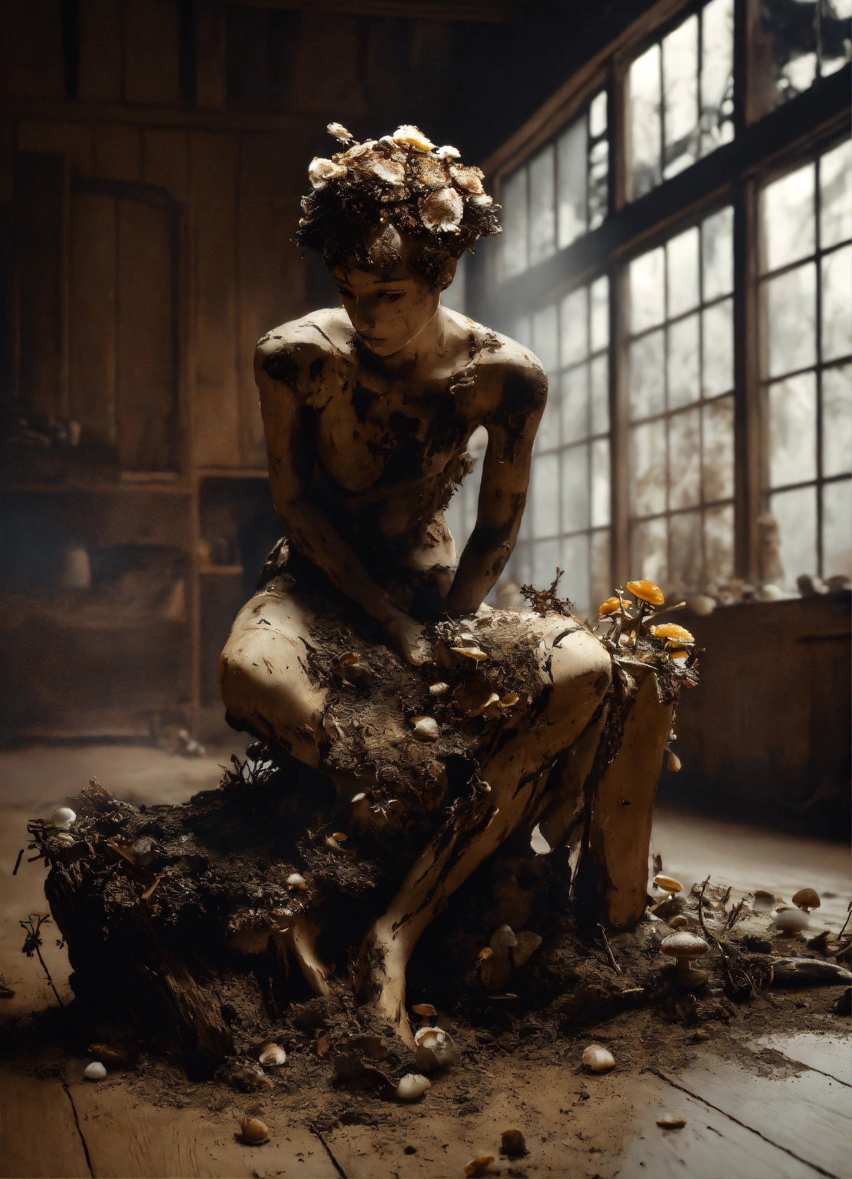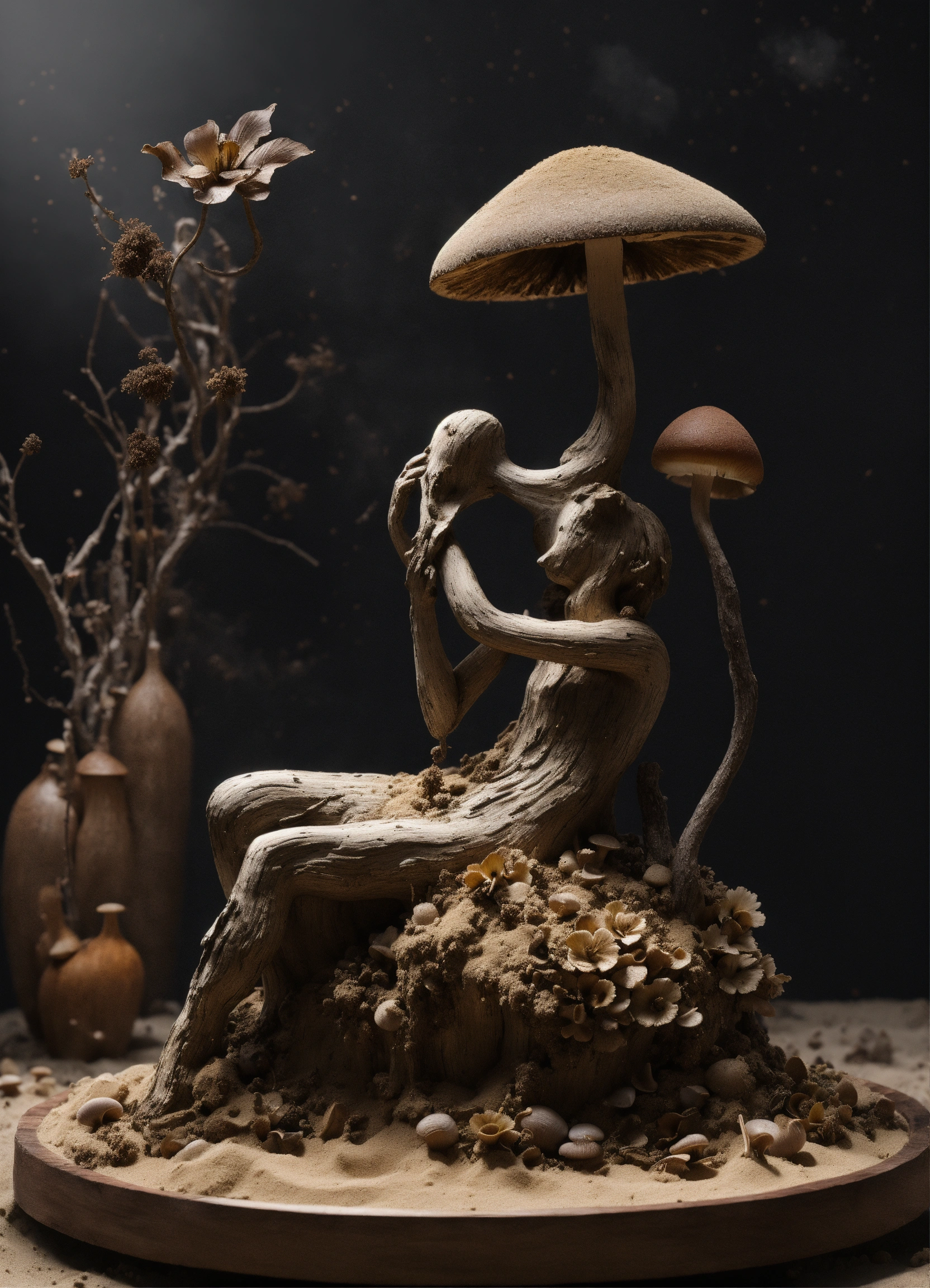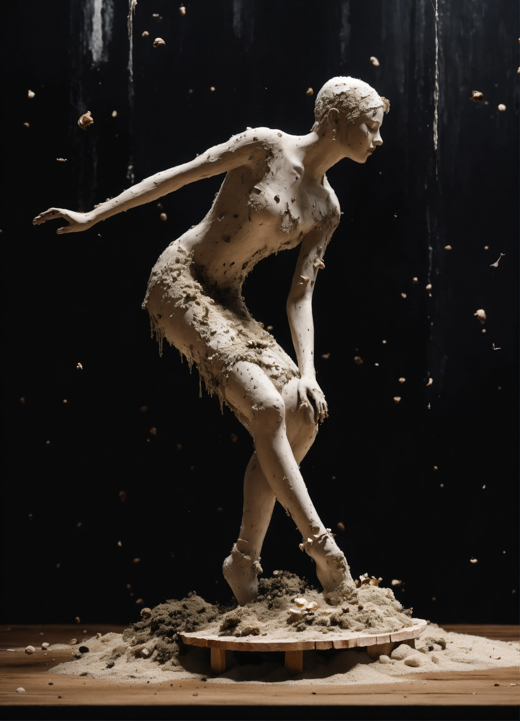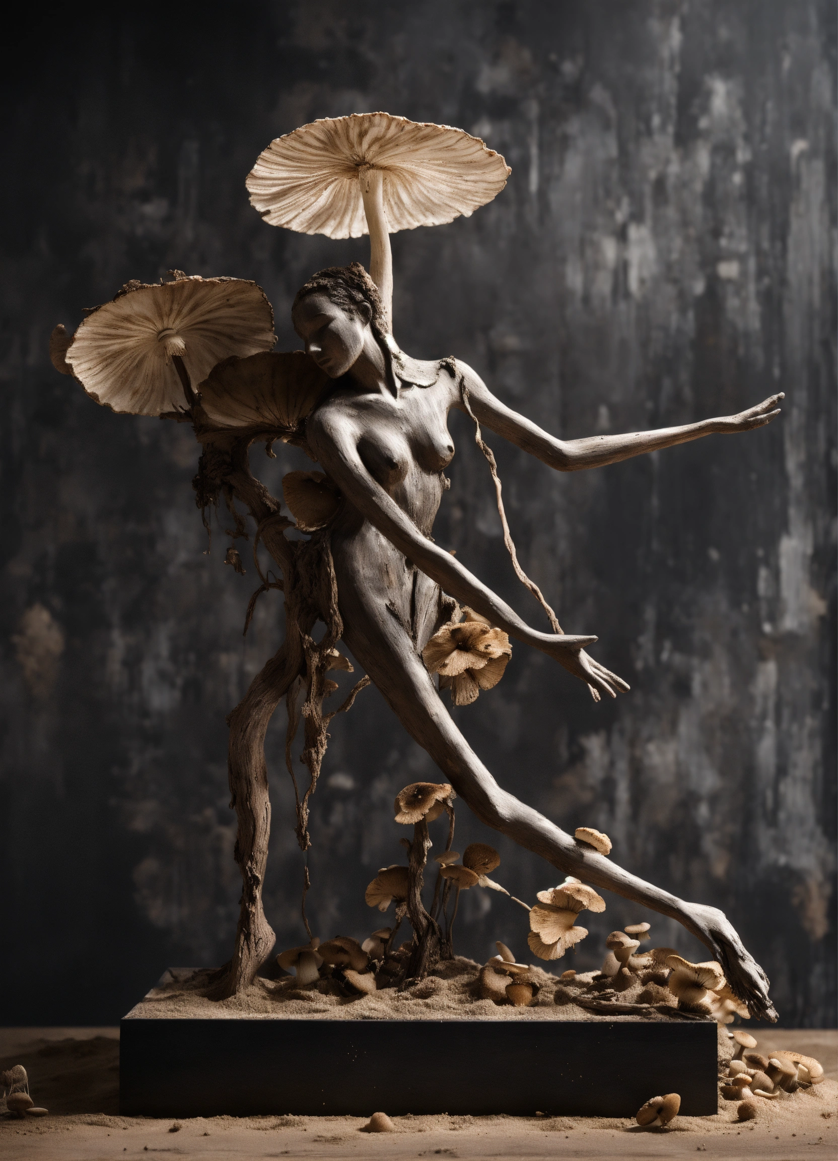A rotten wood sculpture of a abstract simple dancer in a lodge, mushrooms, black and white paint melted, dust, sand, dead flowers, hd render, beatyfull light, hyperrealist
