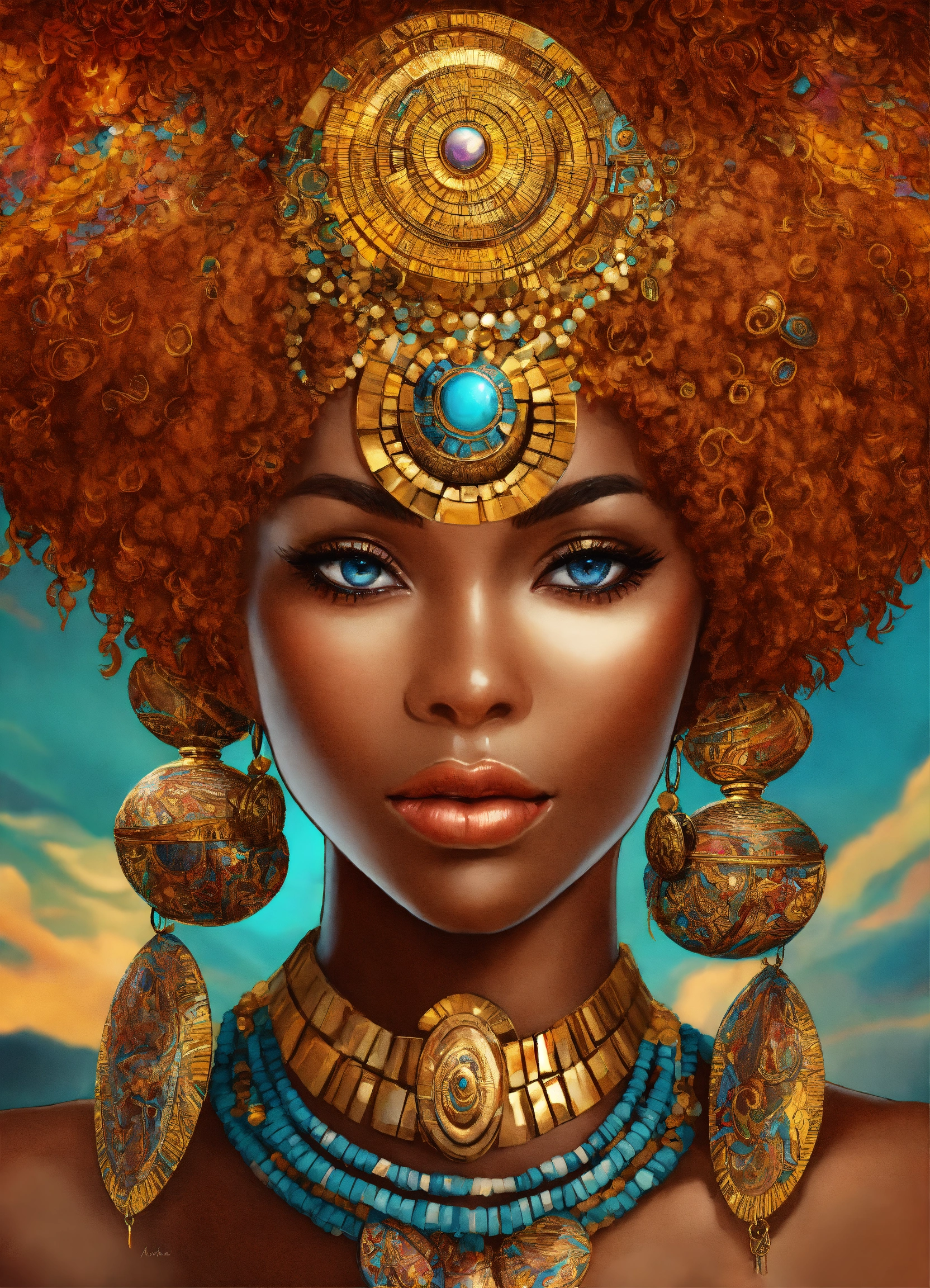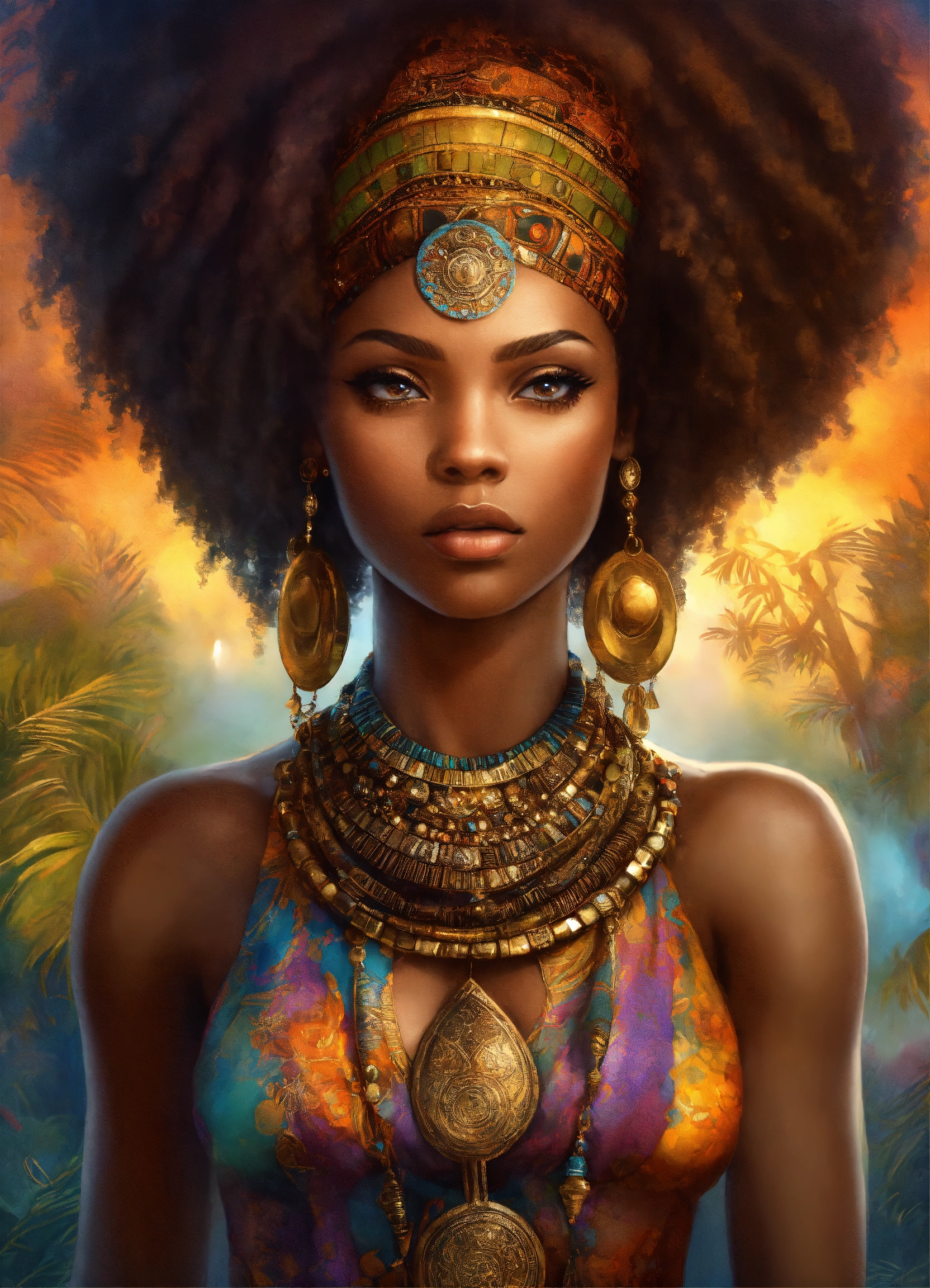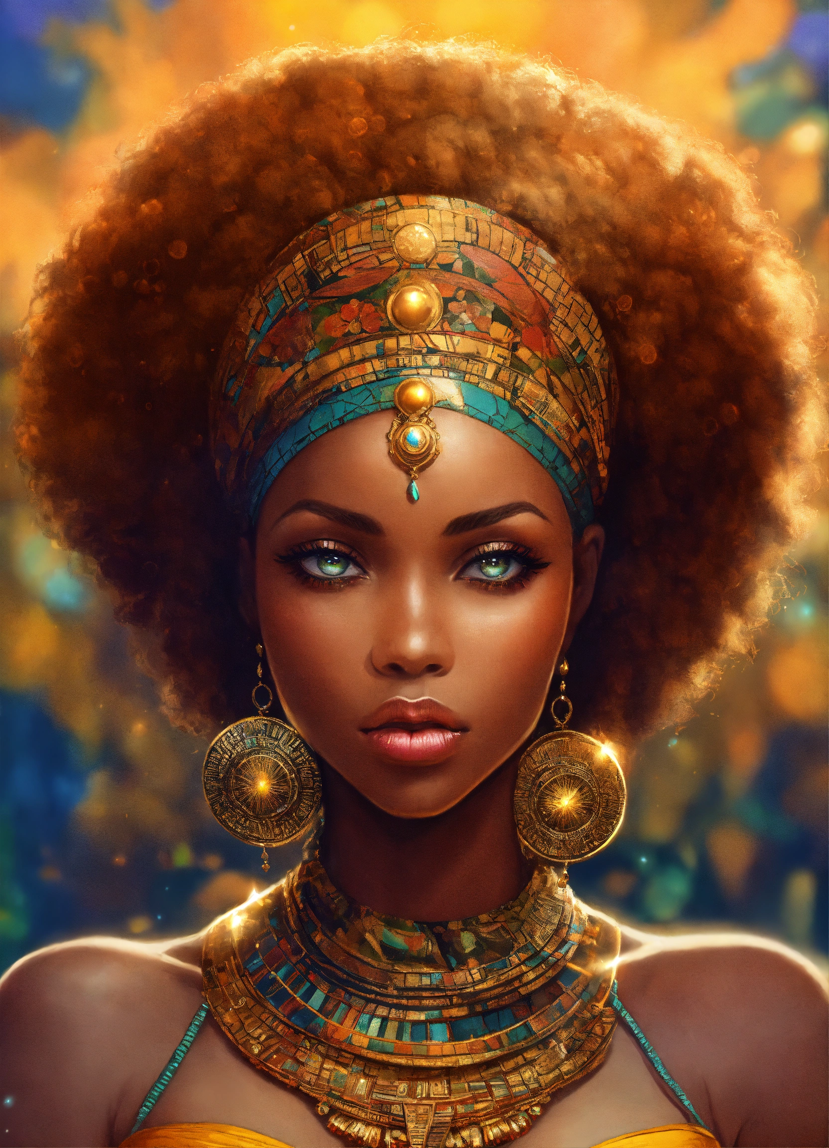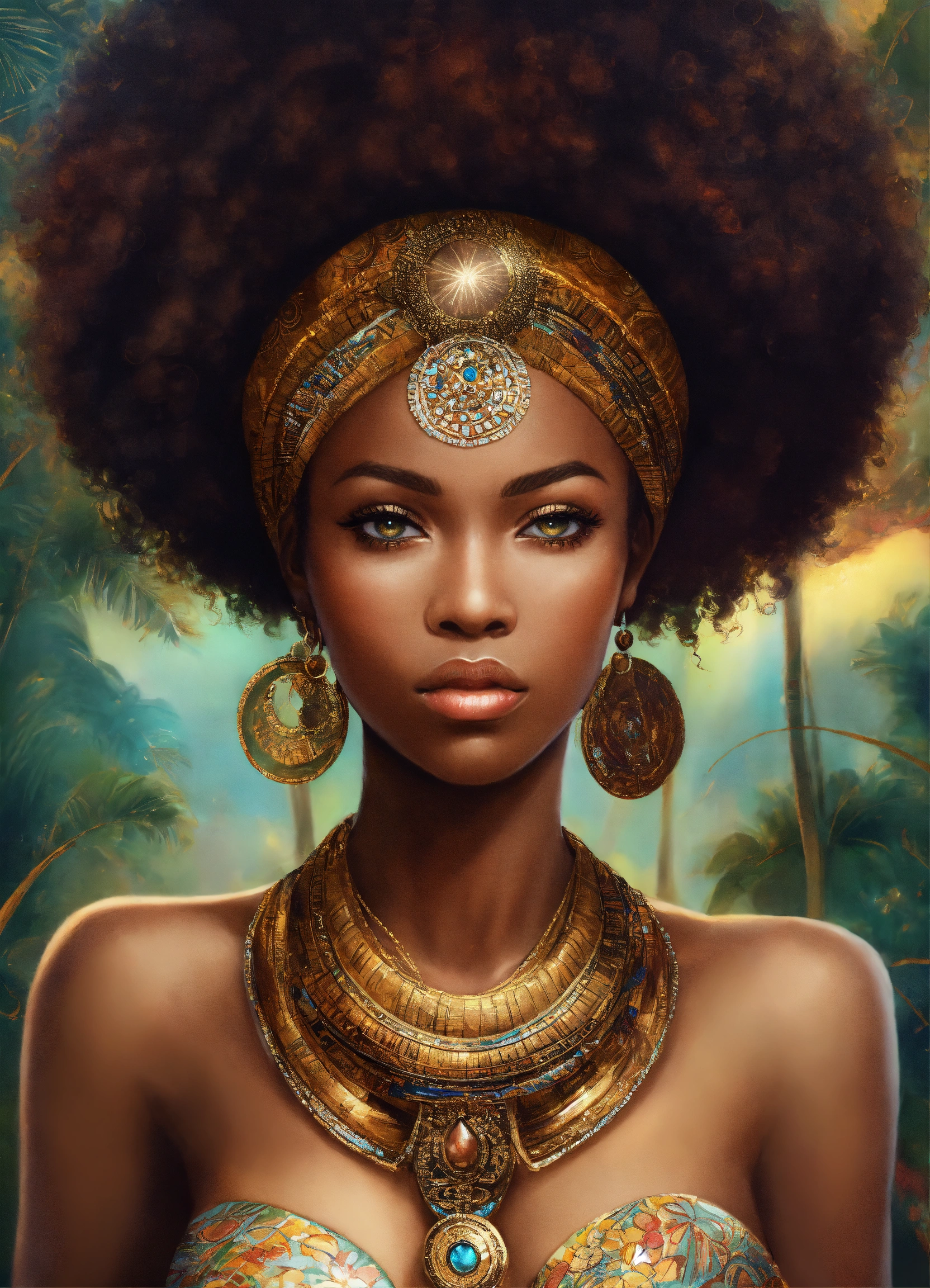 "african goddess", big afro, magical, head and shoulders portrait, intricately detailed eyes, fantasy art