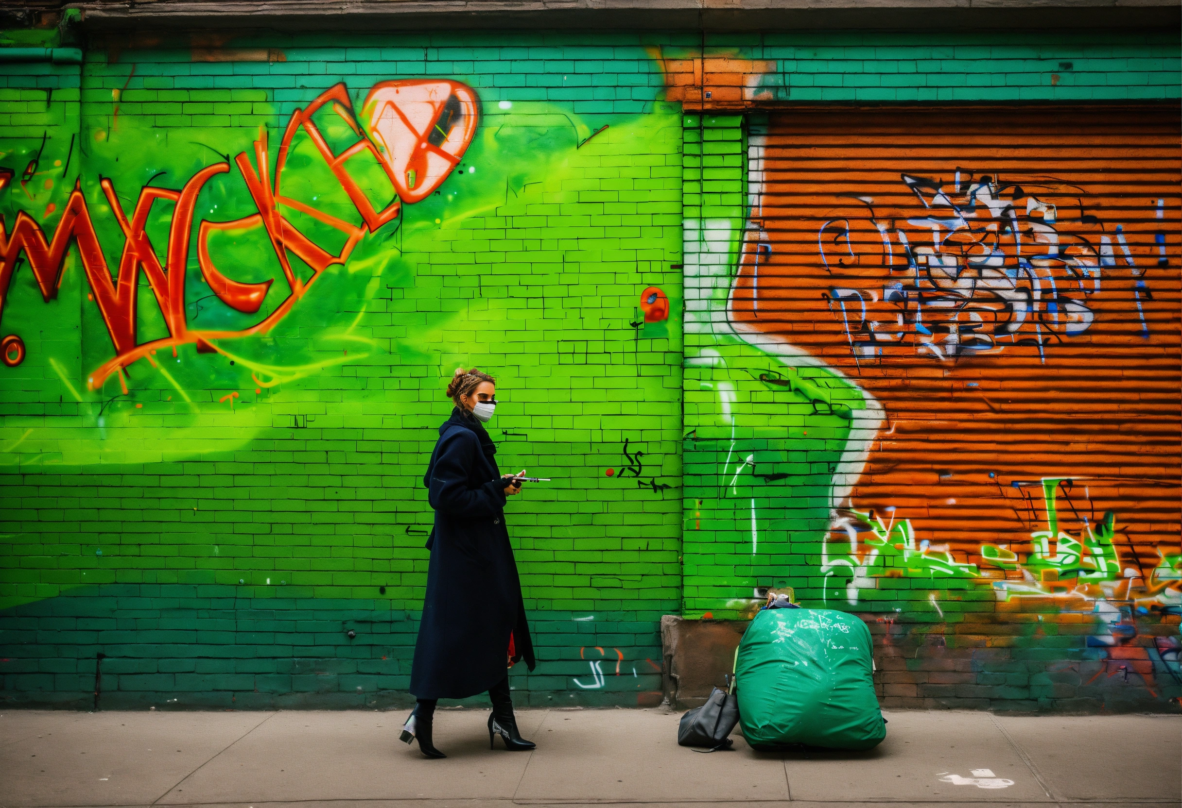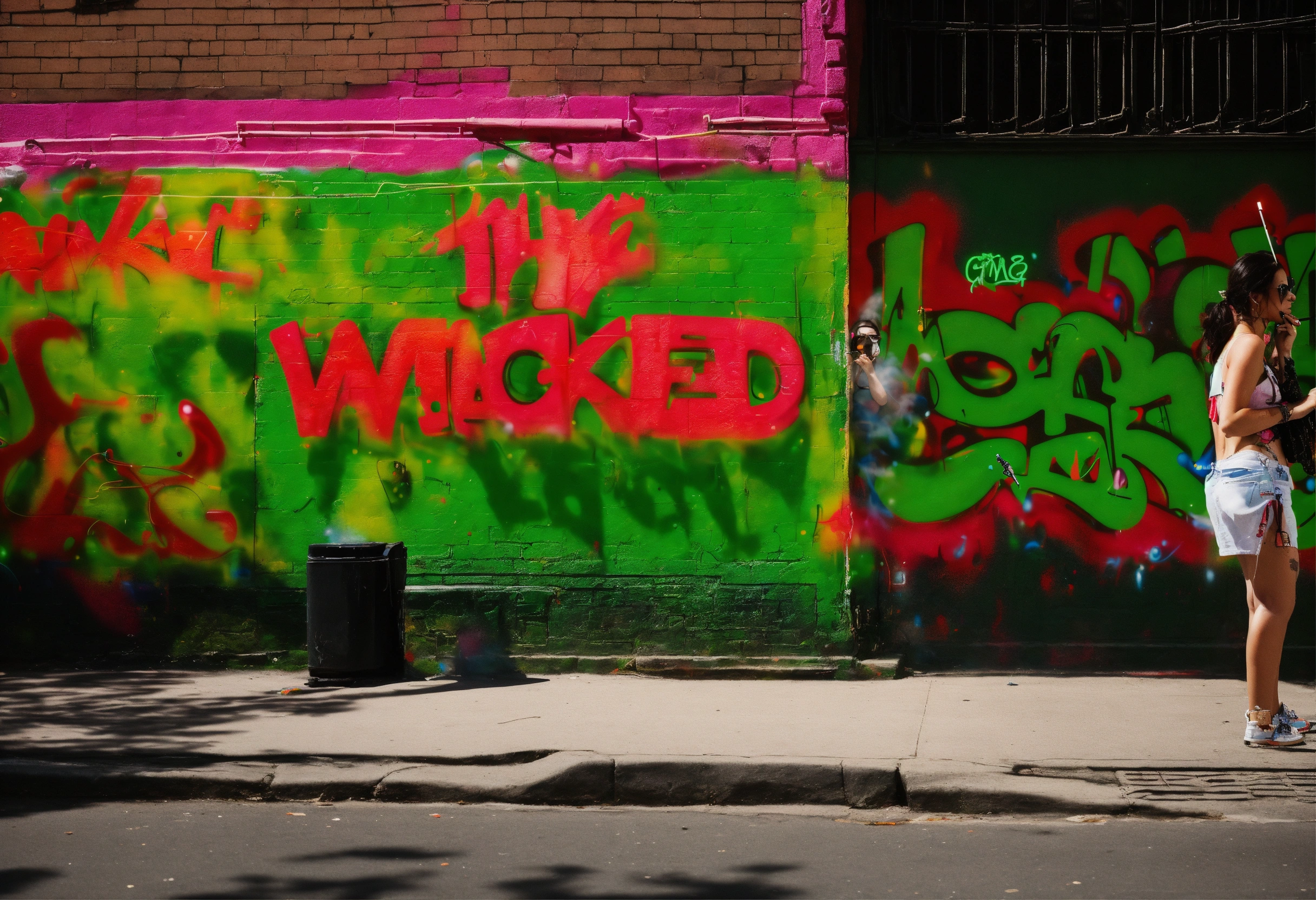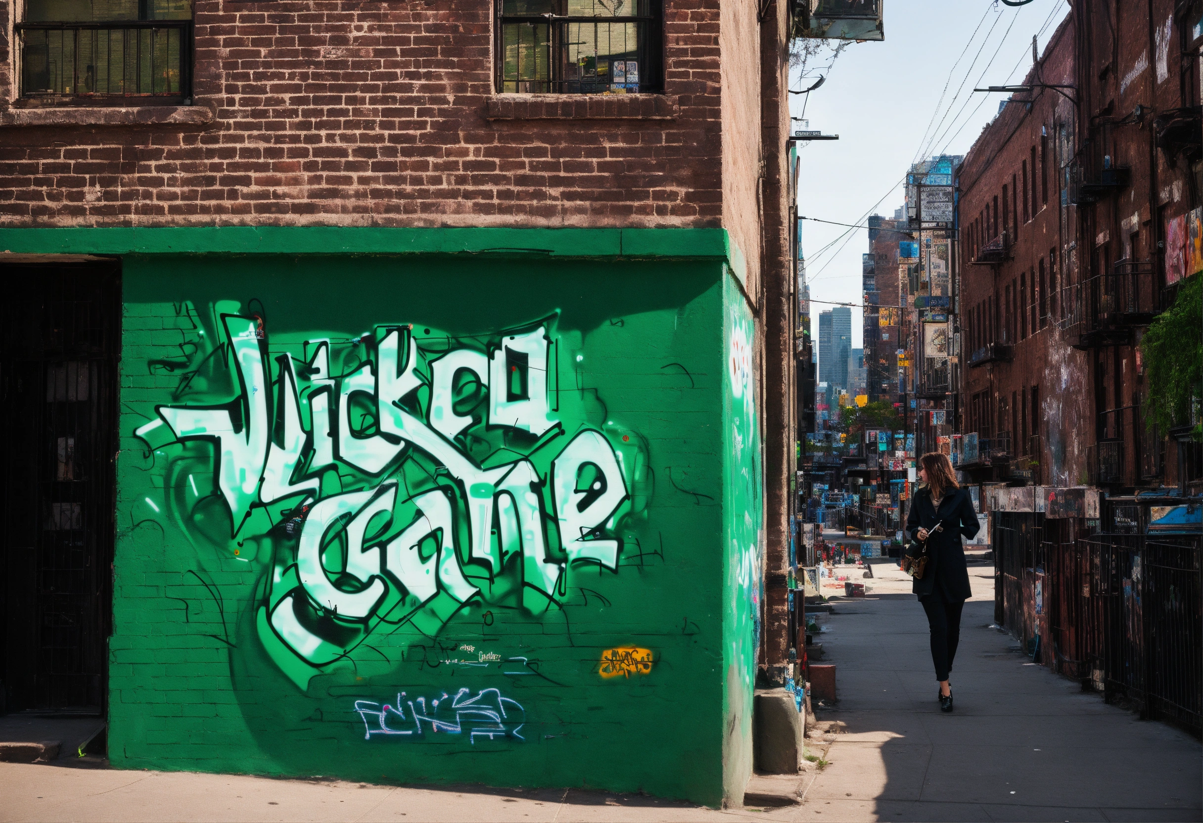 A graffiti saying wicked game in emerald on the wall in streets from new york with a woman smoking in front