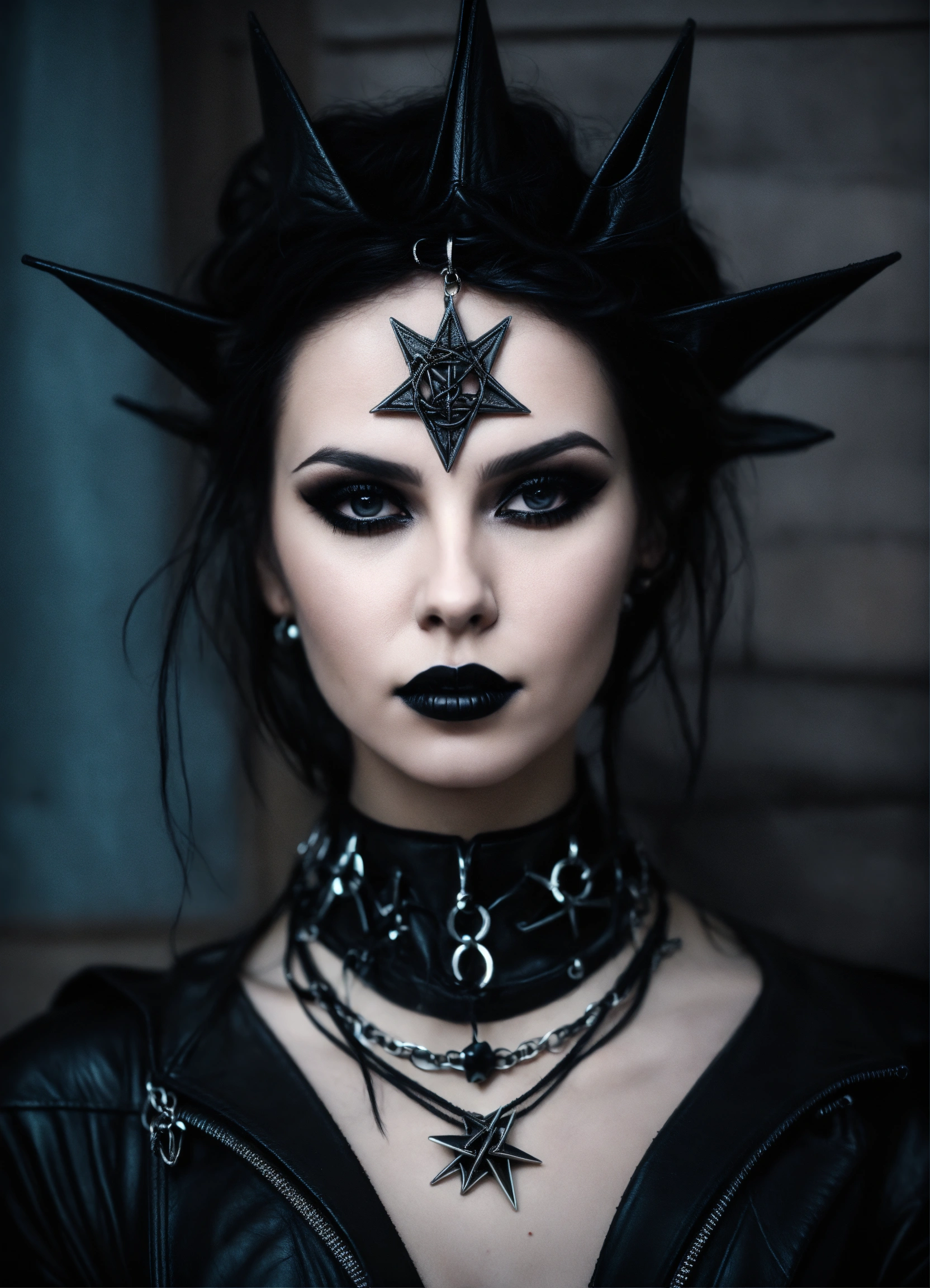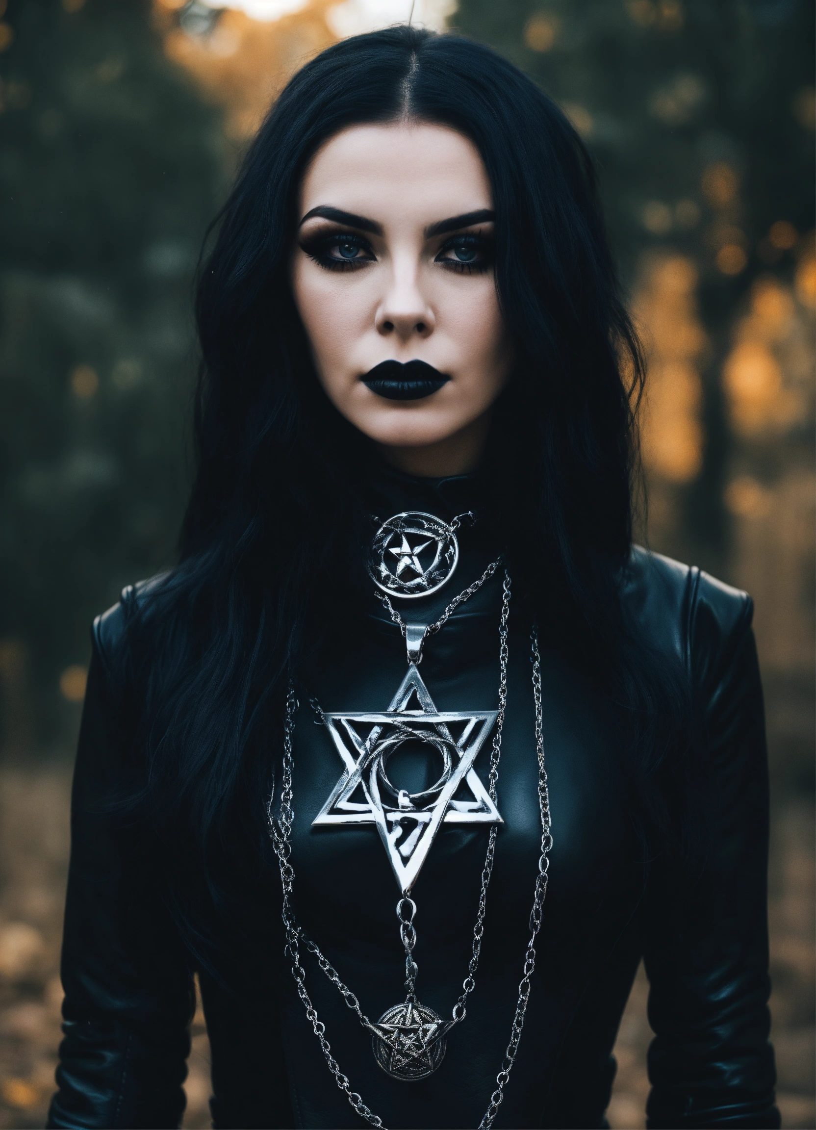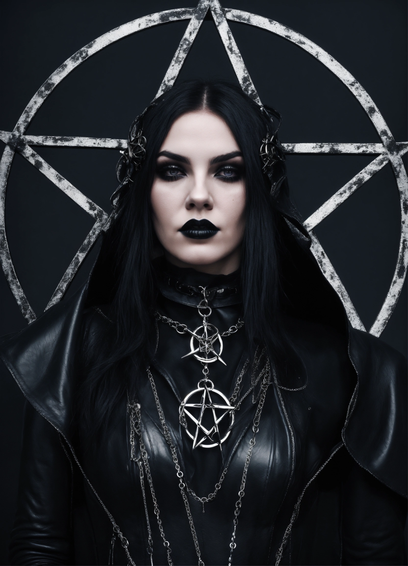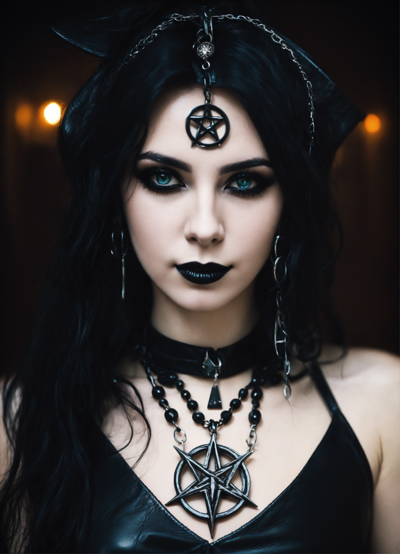 Beautiful extremely goth girl wearing black leather, hypnotizing, 5-point pentagram necklace on her neckline, dark sorceress who rules the universe all realms & all dimensions