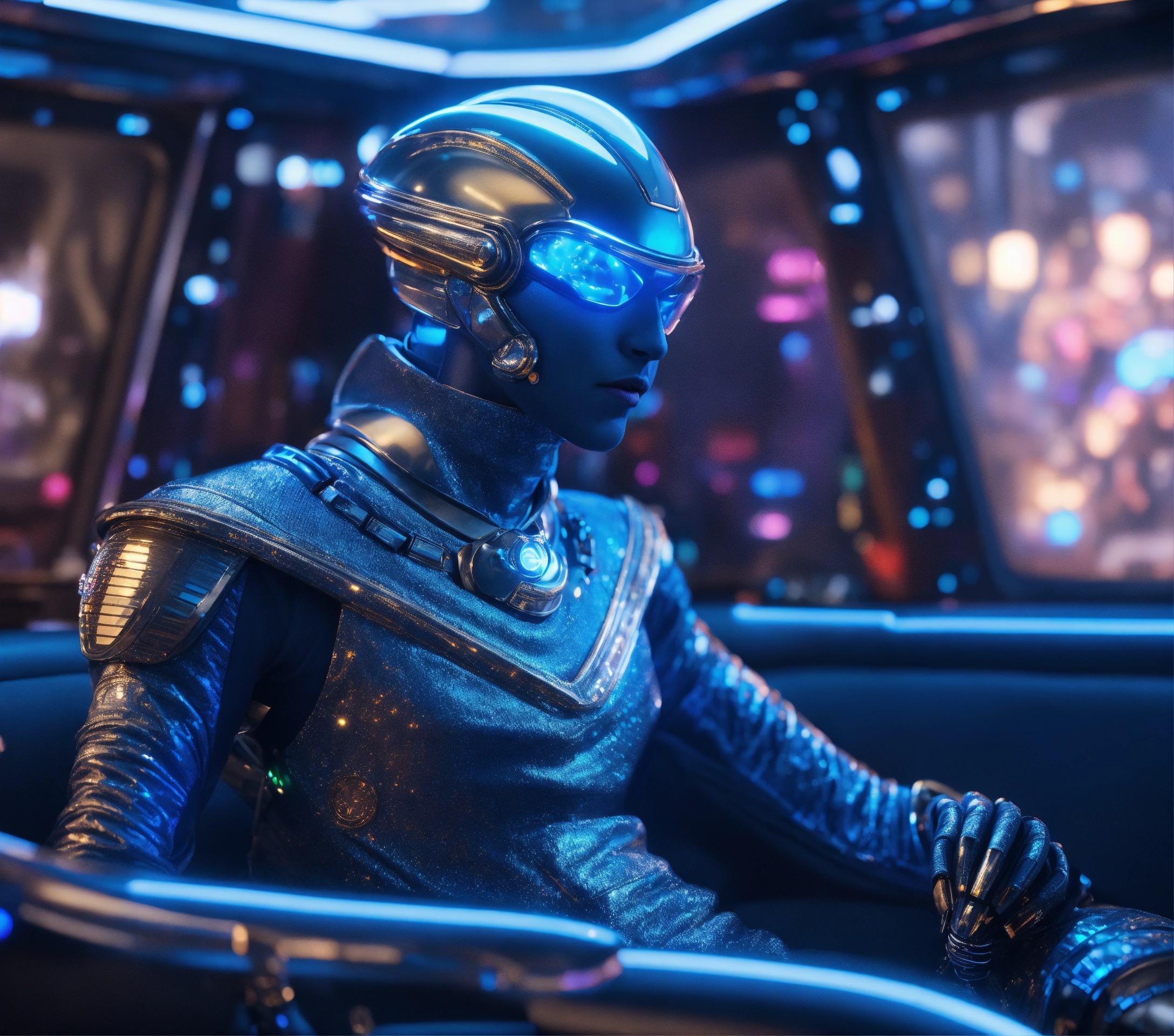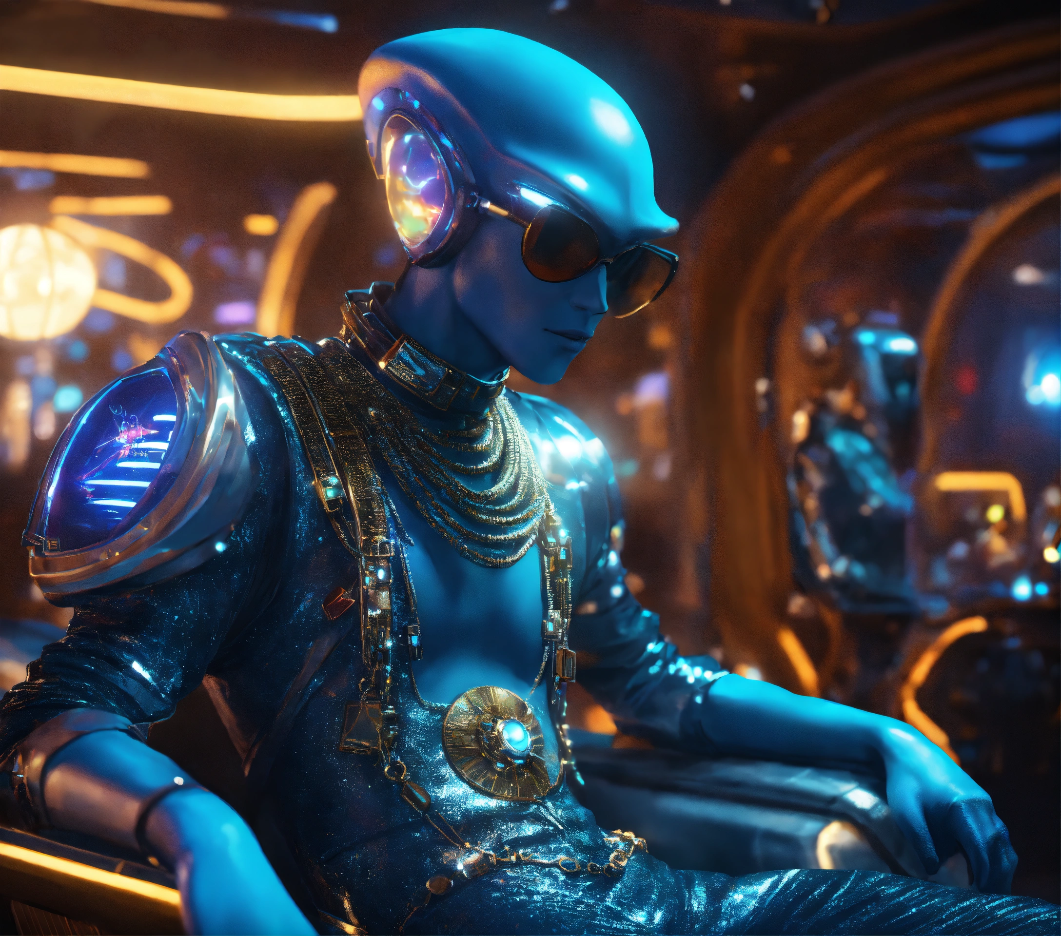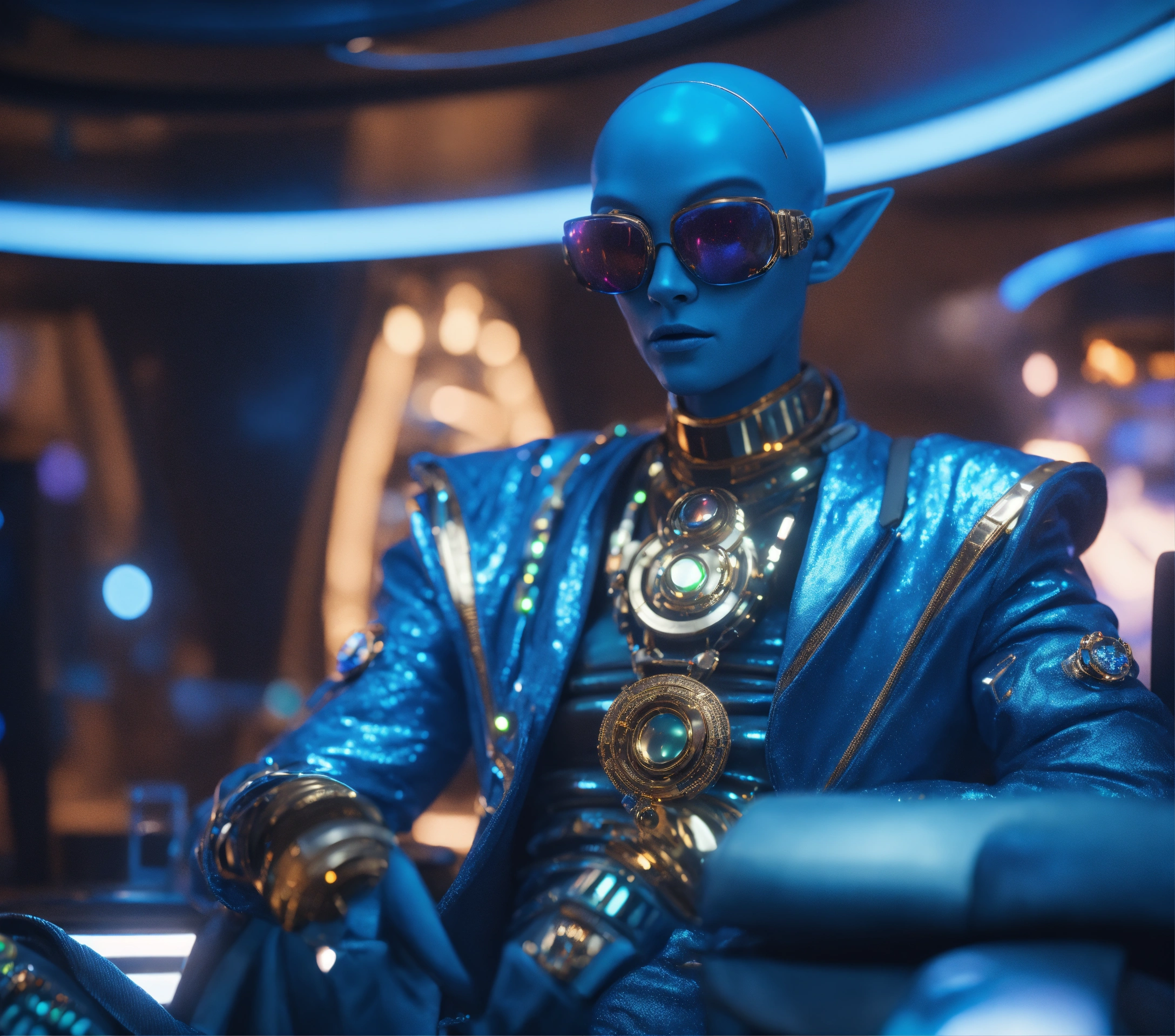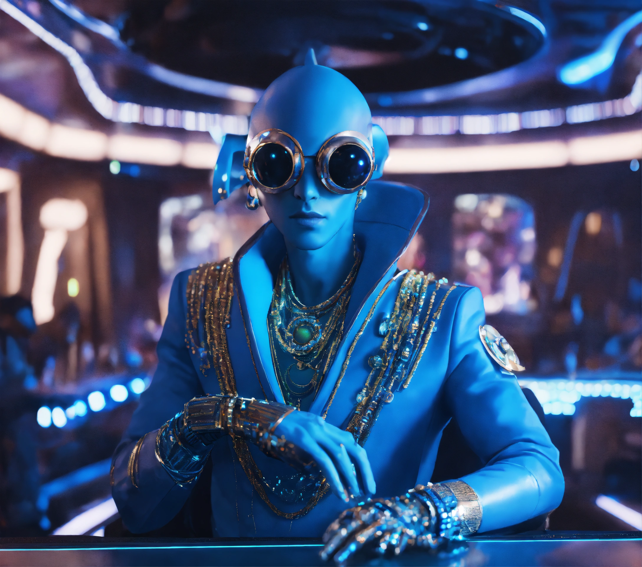Zoom out from a cool blue alien guy wearing space fashion with alot of jewelry lounging in a futuristic party on a space yacht, realistic, futuristic, sci fi, 8k, unreal engine, pixar