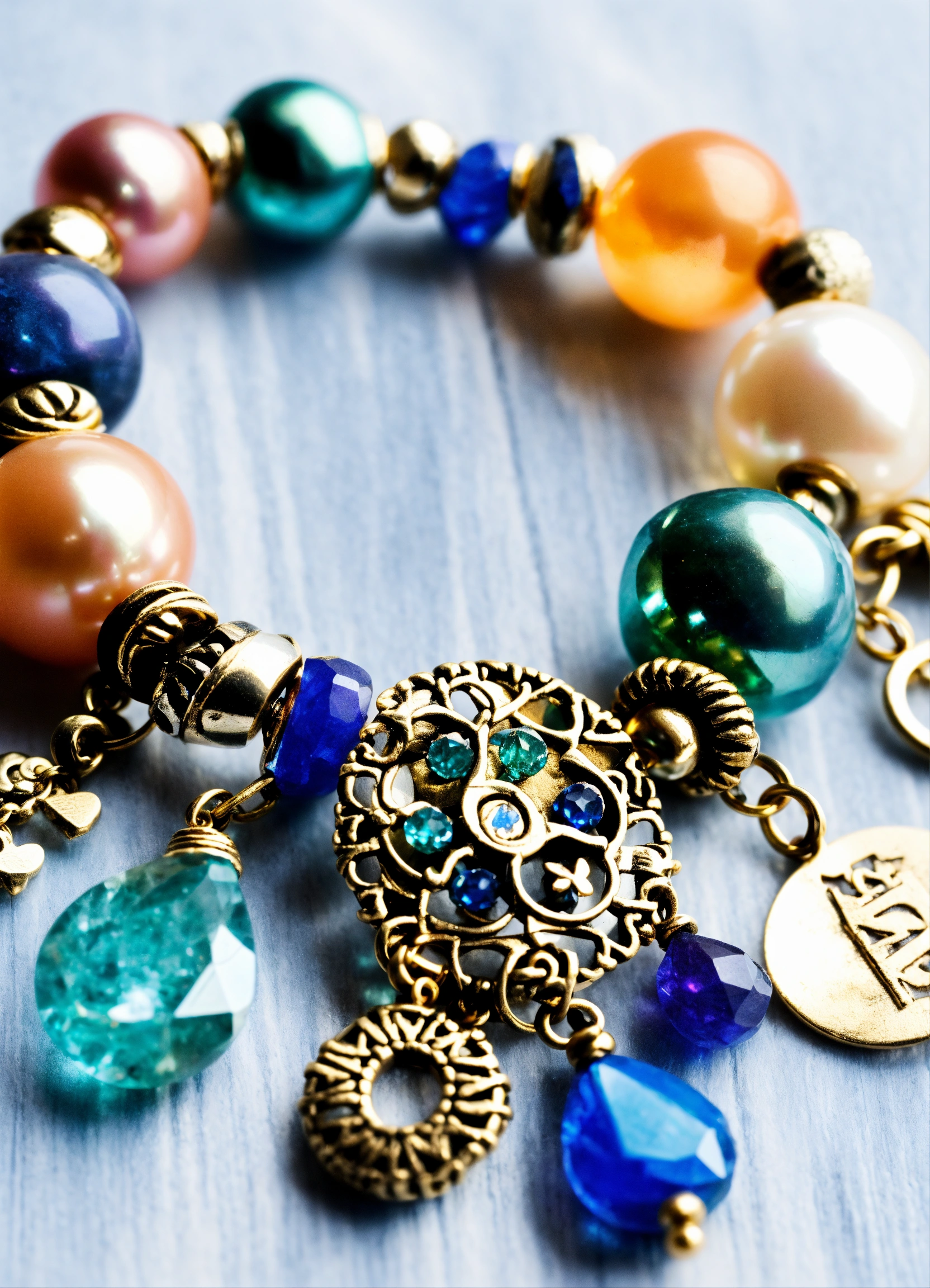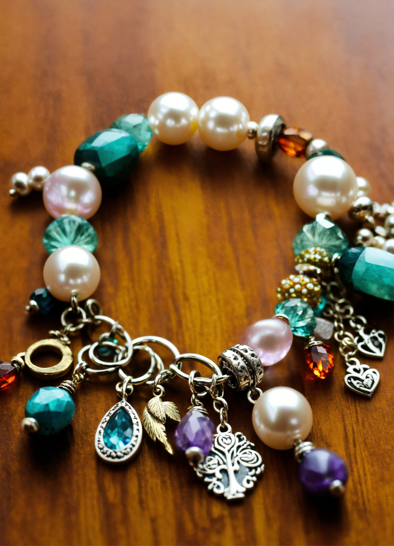 A mix of different types of charms and charms on a pearl and gemstone bracelet