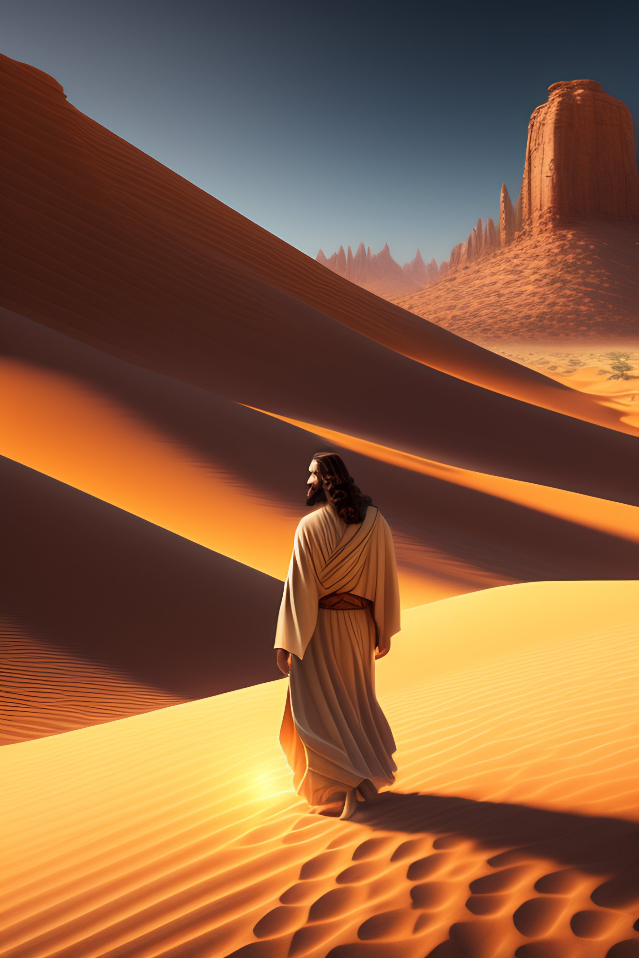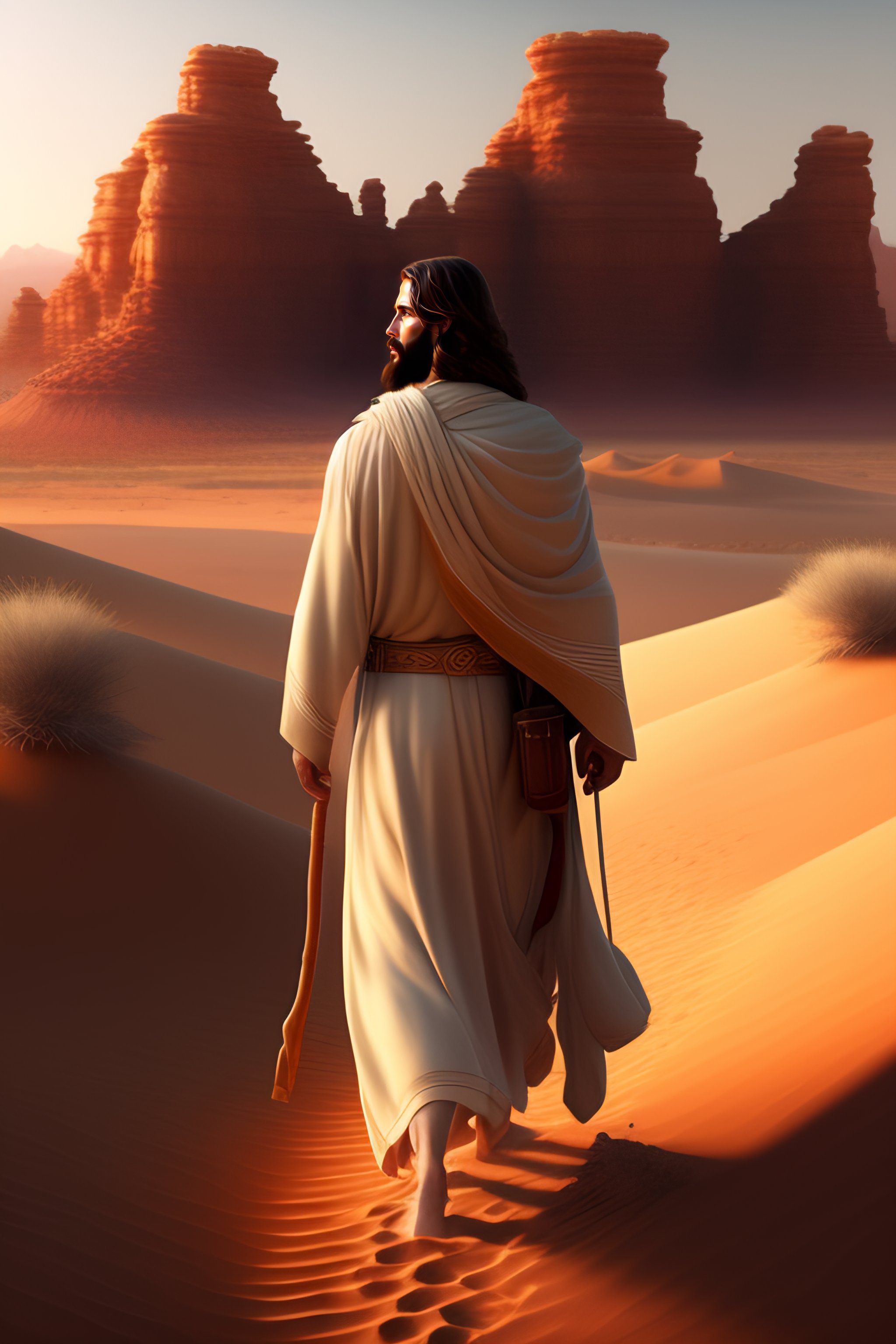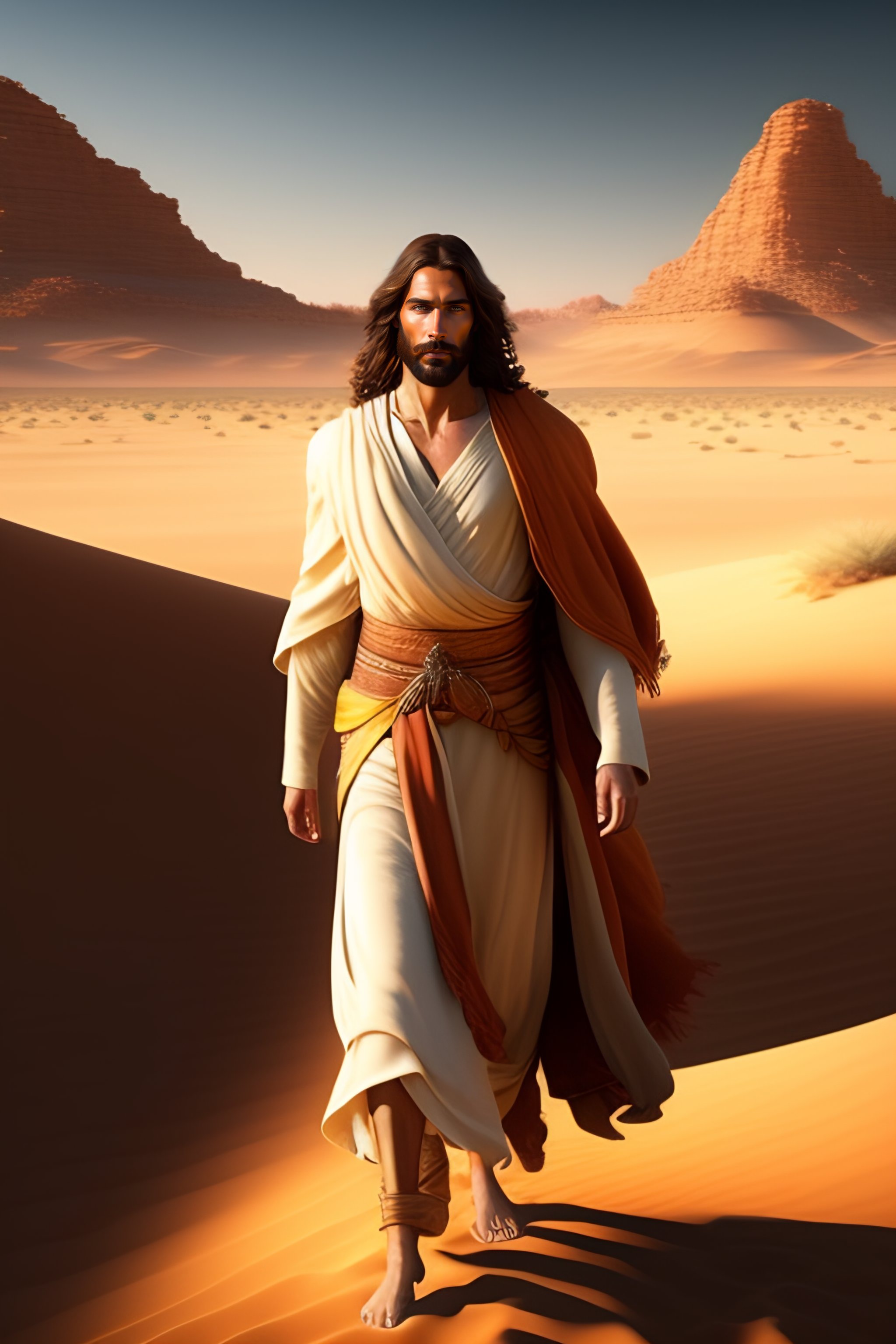 Painting of jesus christ walking in the desert, realistic, highly detailed, professional digital painting, artstation, concept art, unreal engine 5, photorealism, hd quality, 8k resolution, cinema 4d, 3d, beautiful, cinematic, art by artgerm and greg rutkowski and alphonse mucha and loish and wlop