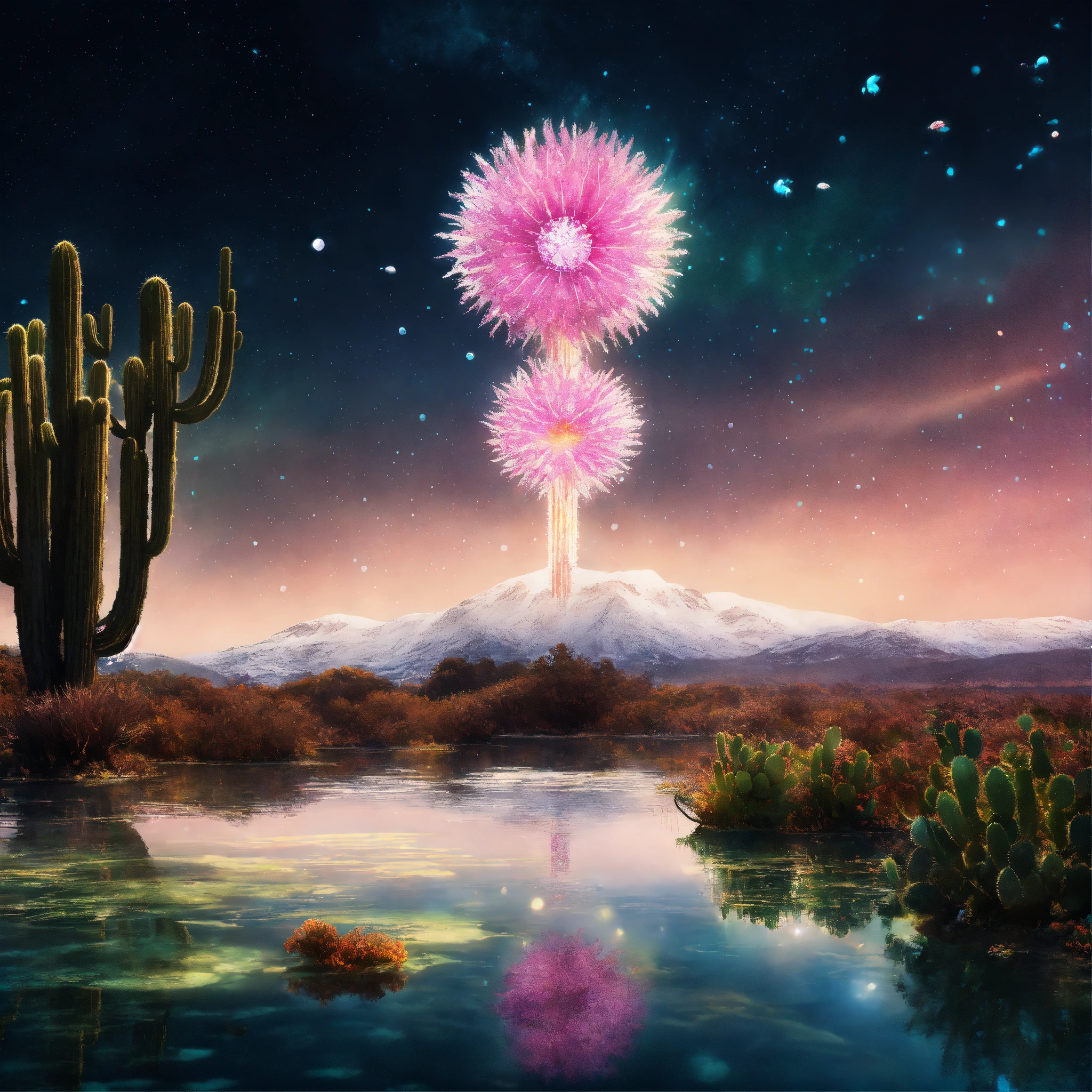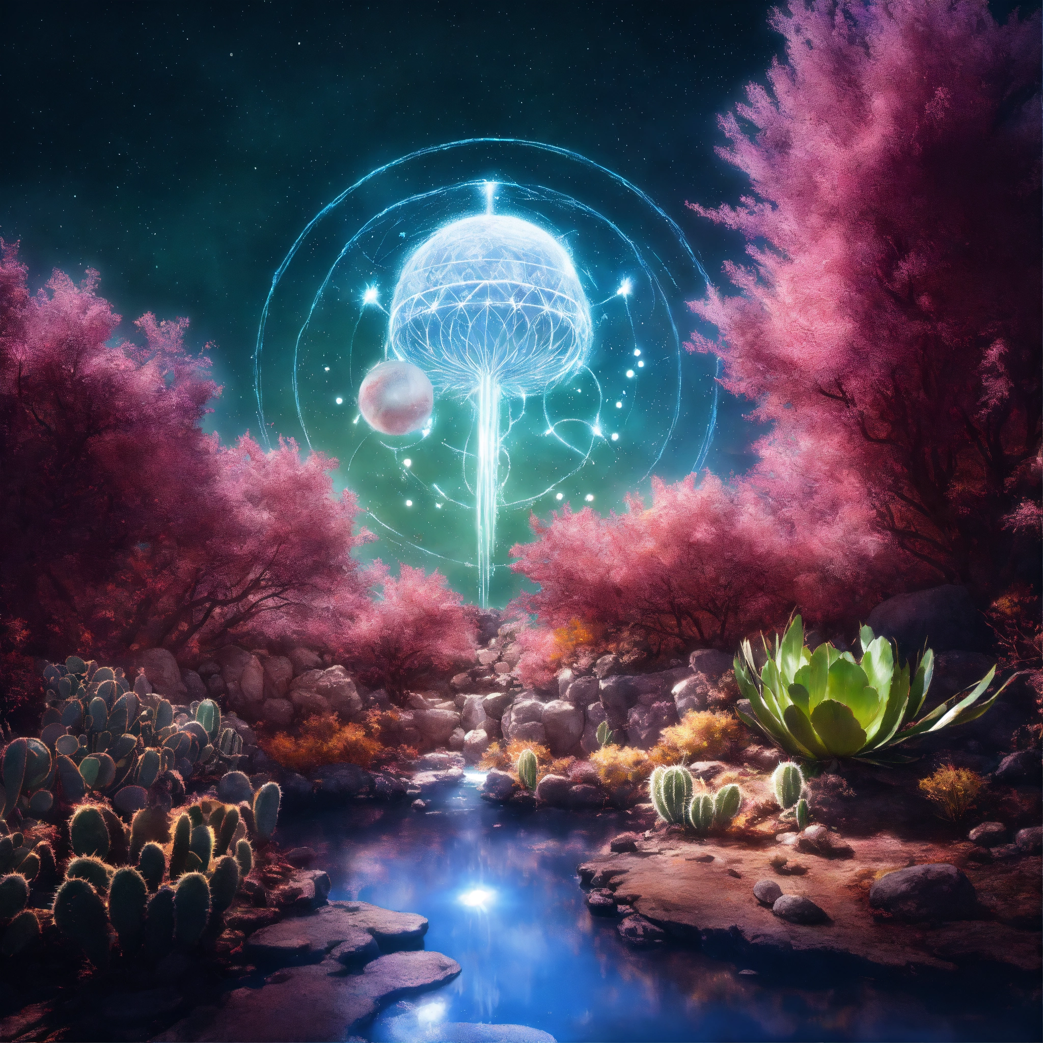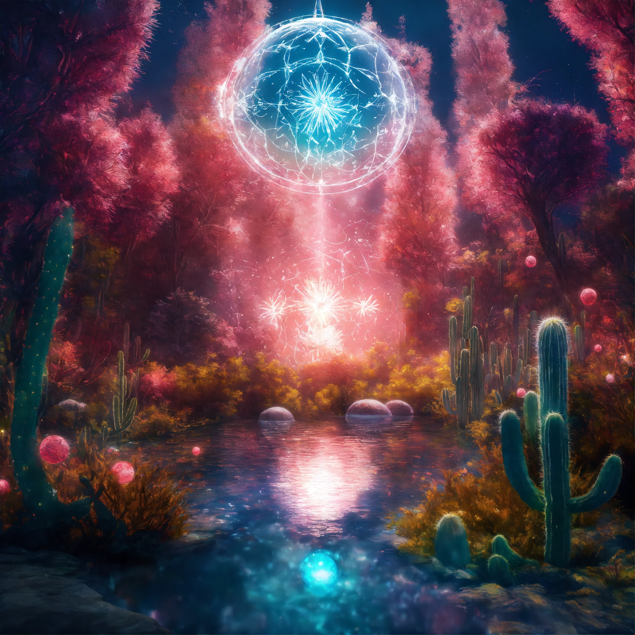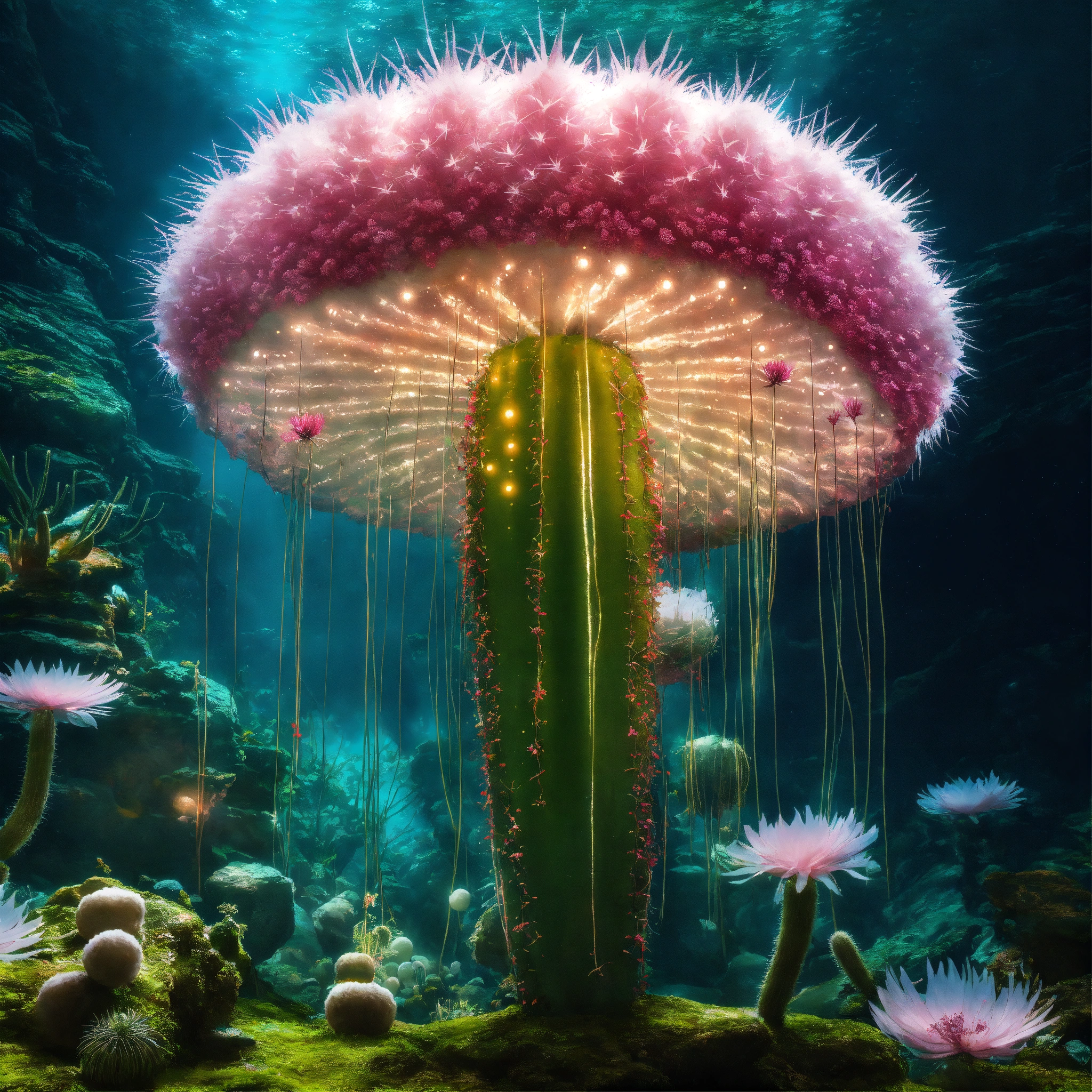 Underwater long exposure photography, a giant white cactus flying in the cosmos with orbs and portals and cactus, x-ray style, in the style of tim burton, lion king, the chronicles of narnia, beauty and the beast, and peter pan. with sacred geometric patterns on the body. enchanting aura. the chronicles of narnia, wizard of oz, and alice in wonderland background with snow mountains, and trees with pink leaves.