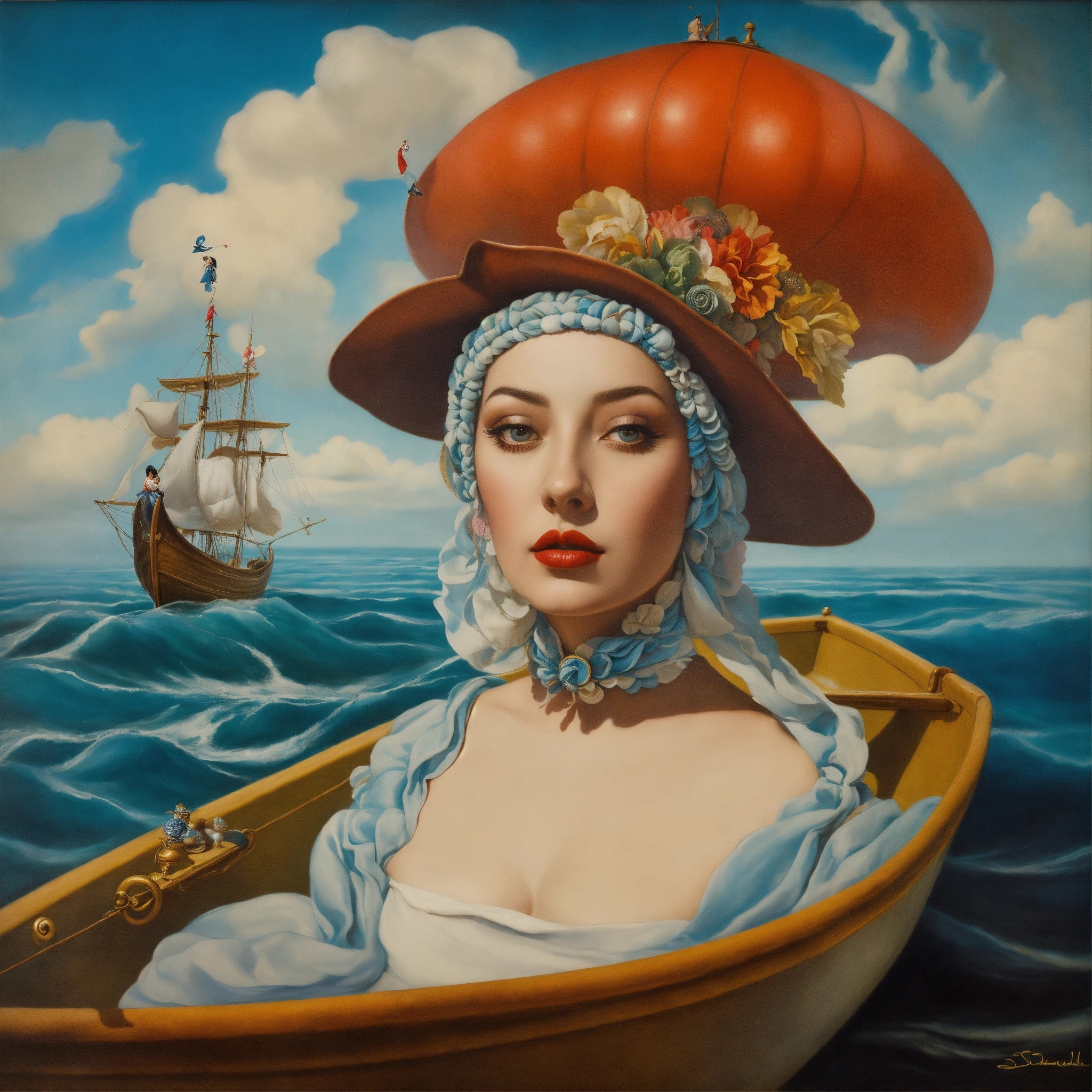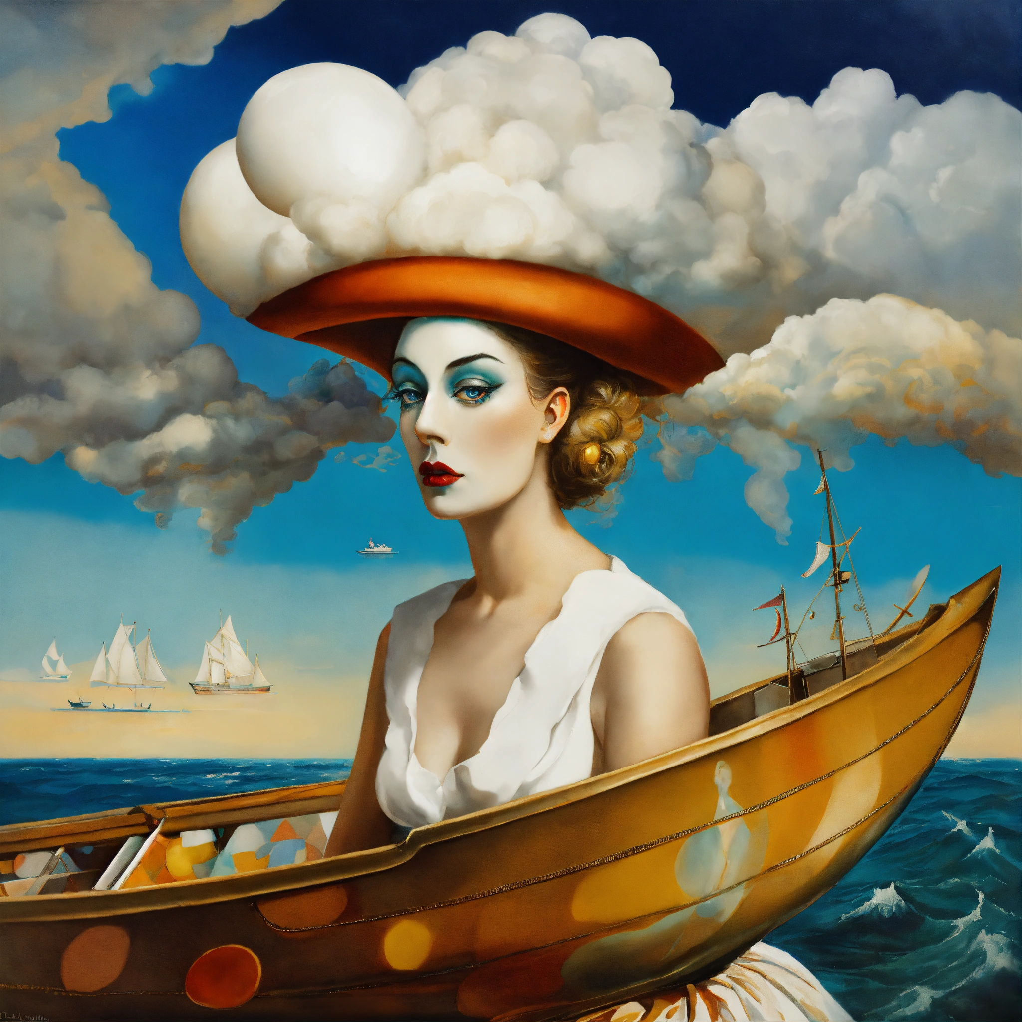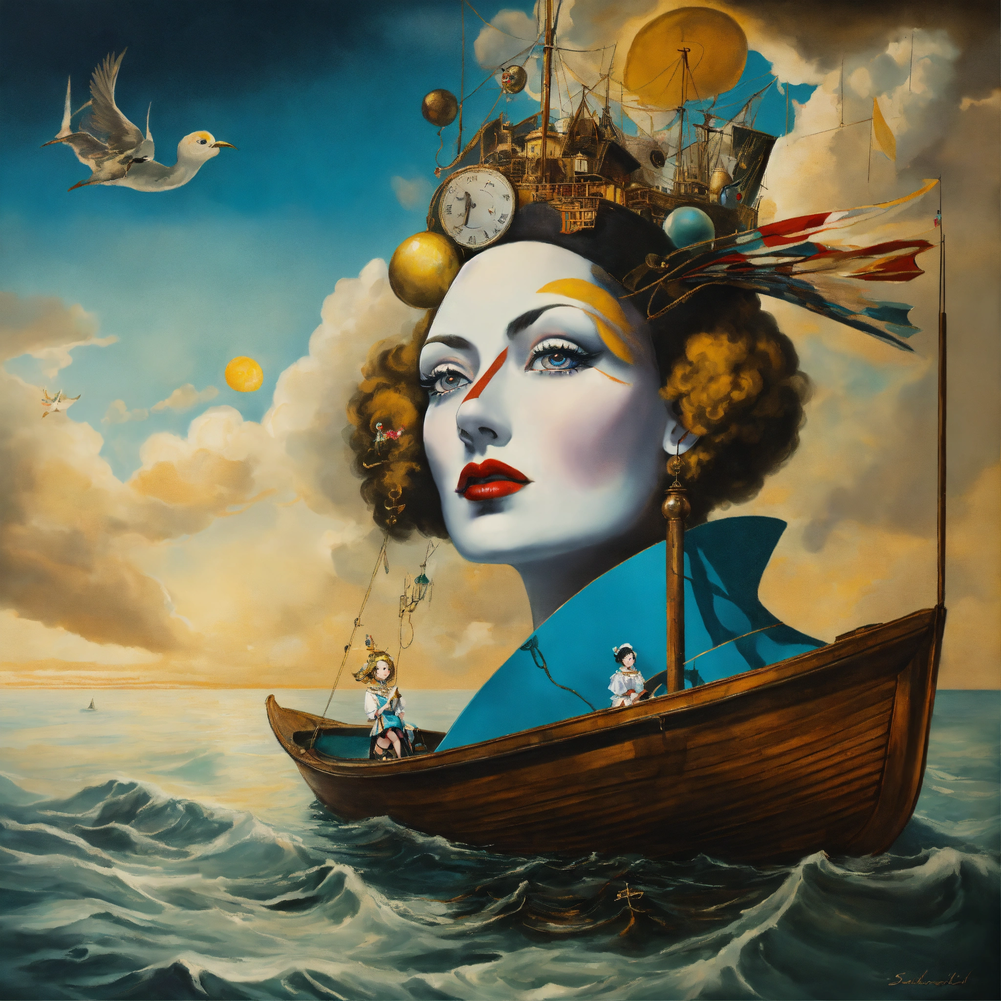 A close up portrait of elegant female humpty with pale white face with eyes looking straight at you. also a harlequin lady sitting in a boat on choppy sea scape by salvador dali. more surrealism and madness. much more surrealism and crazy designs. with surreal clouds, salvador dali clouds coming out of her head. more surrealism and crazy ideas. like a circus theme. much more surreal designs and electric colours.
