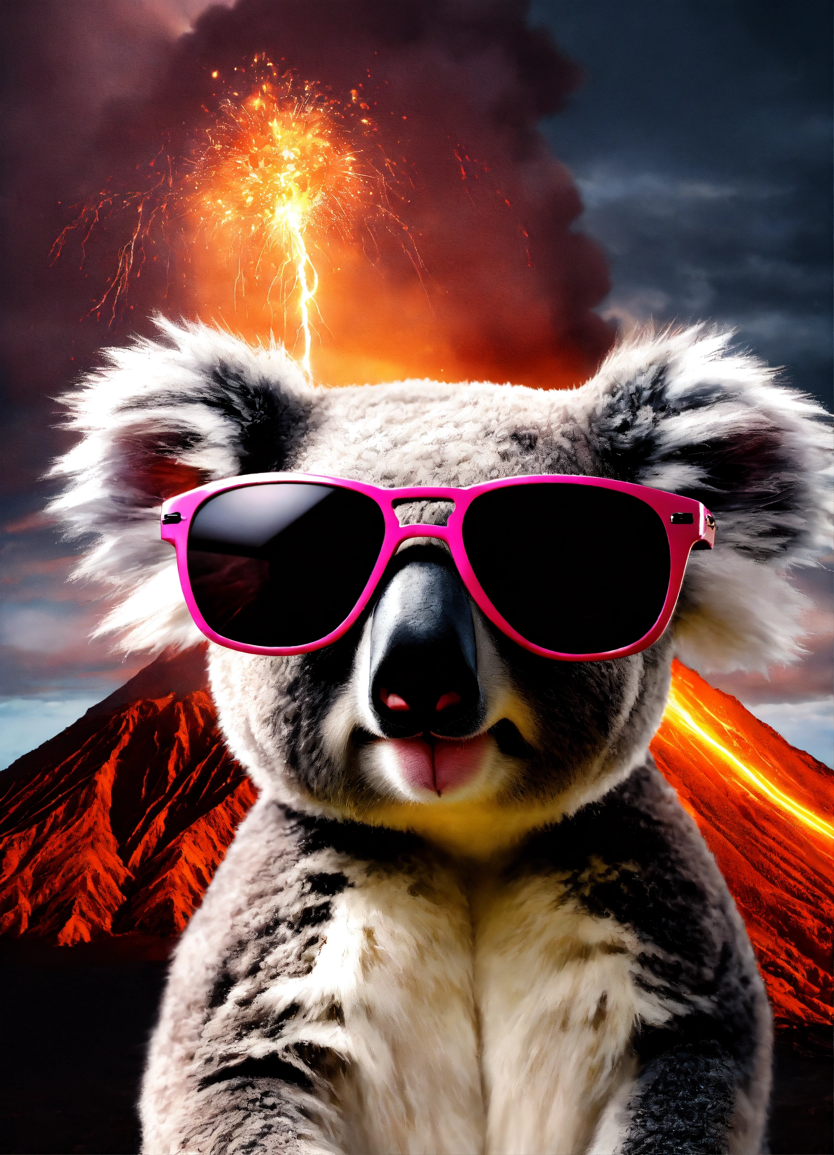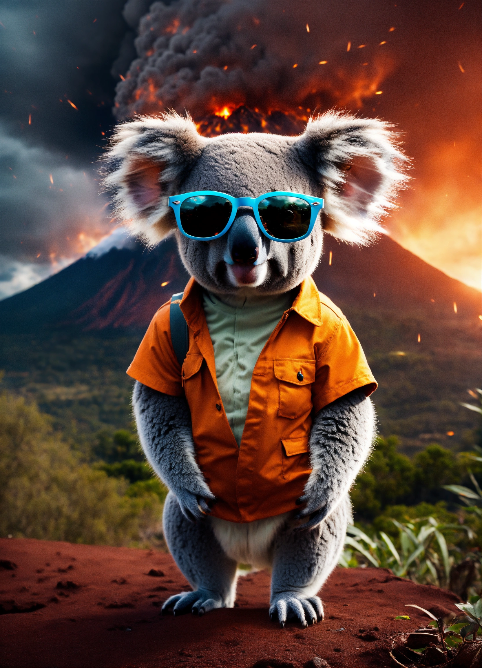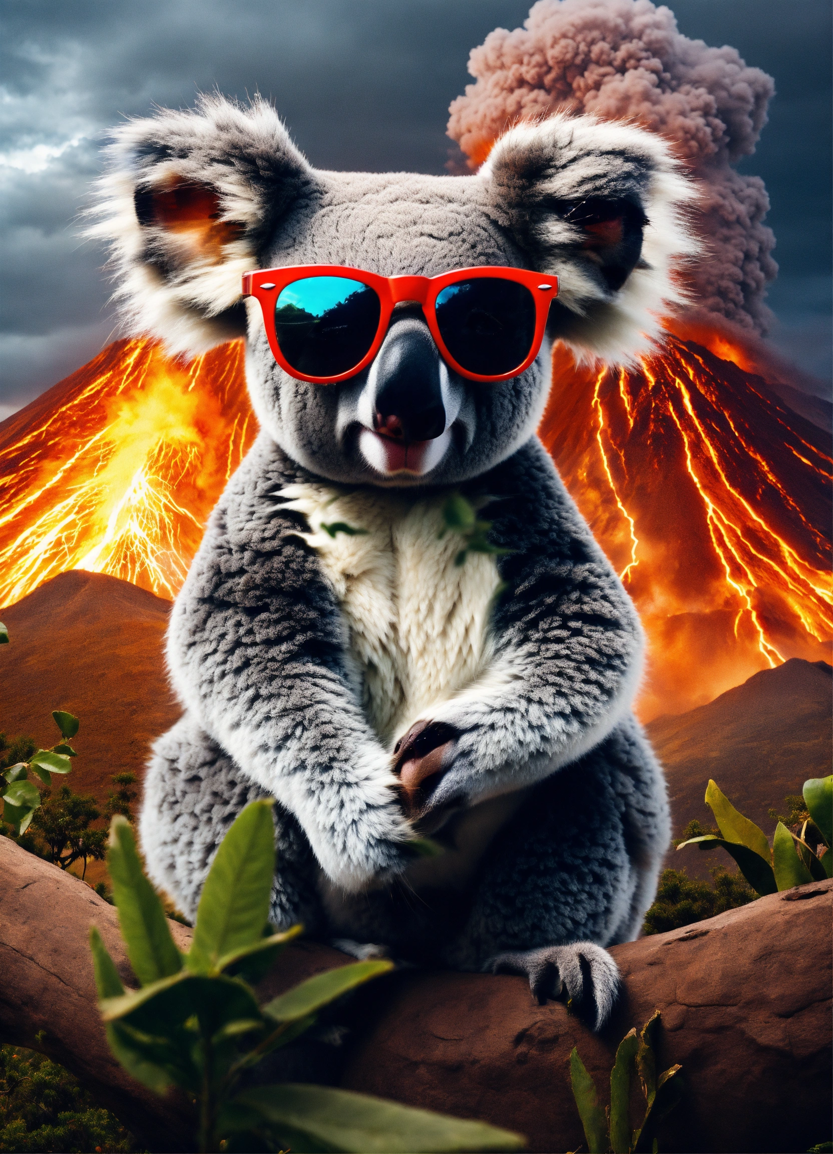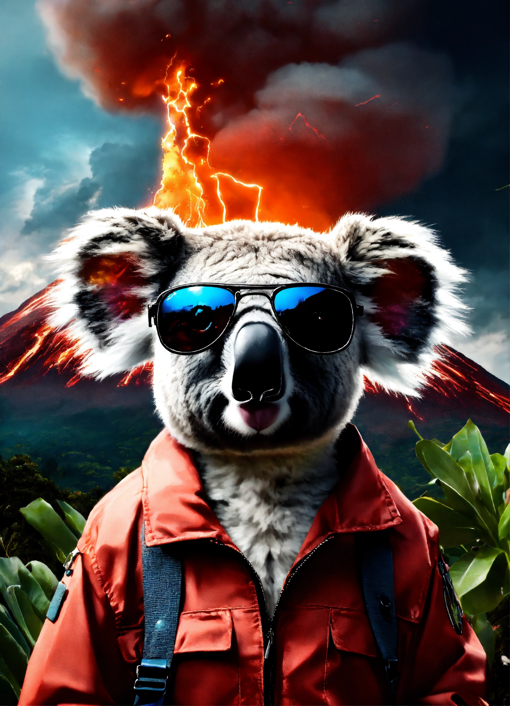 A koala with cool dude glasses raybans realistic in front of a volcano exploding with thunder stormy 8k quality