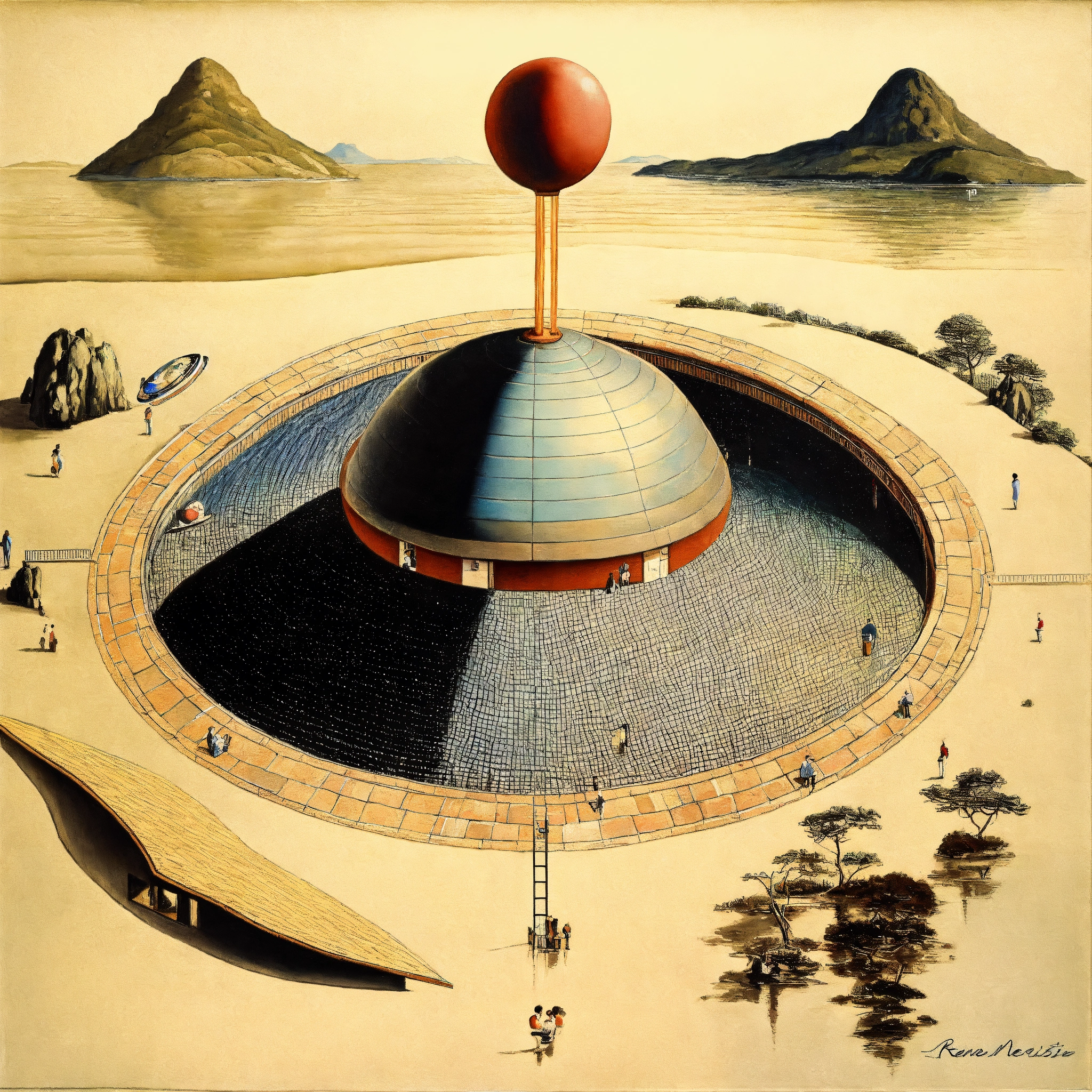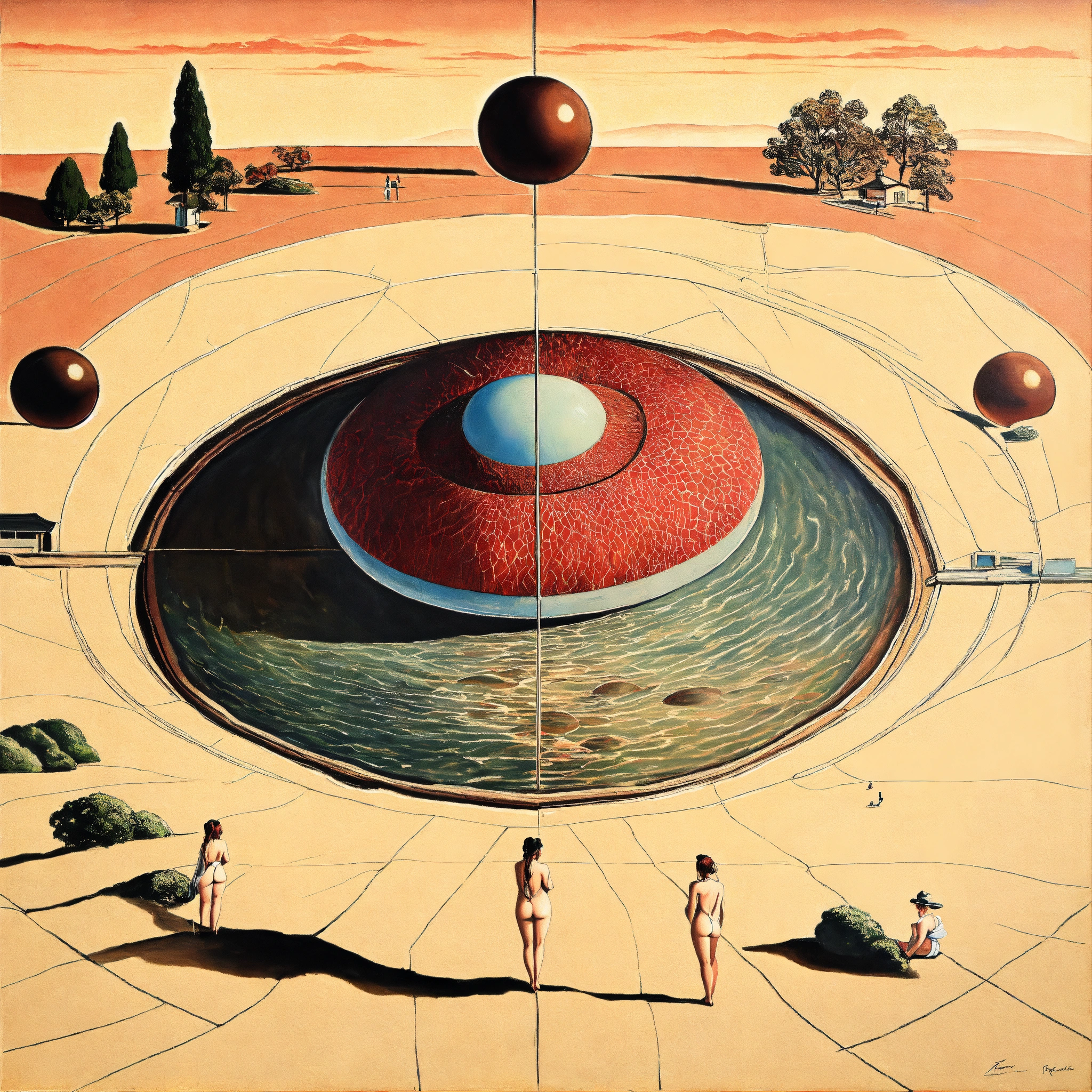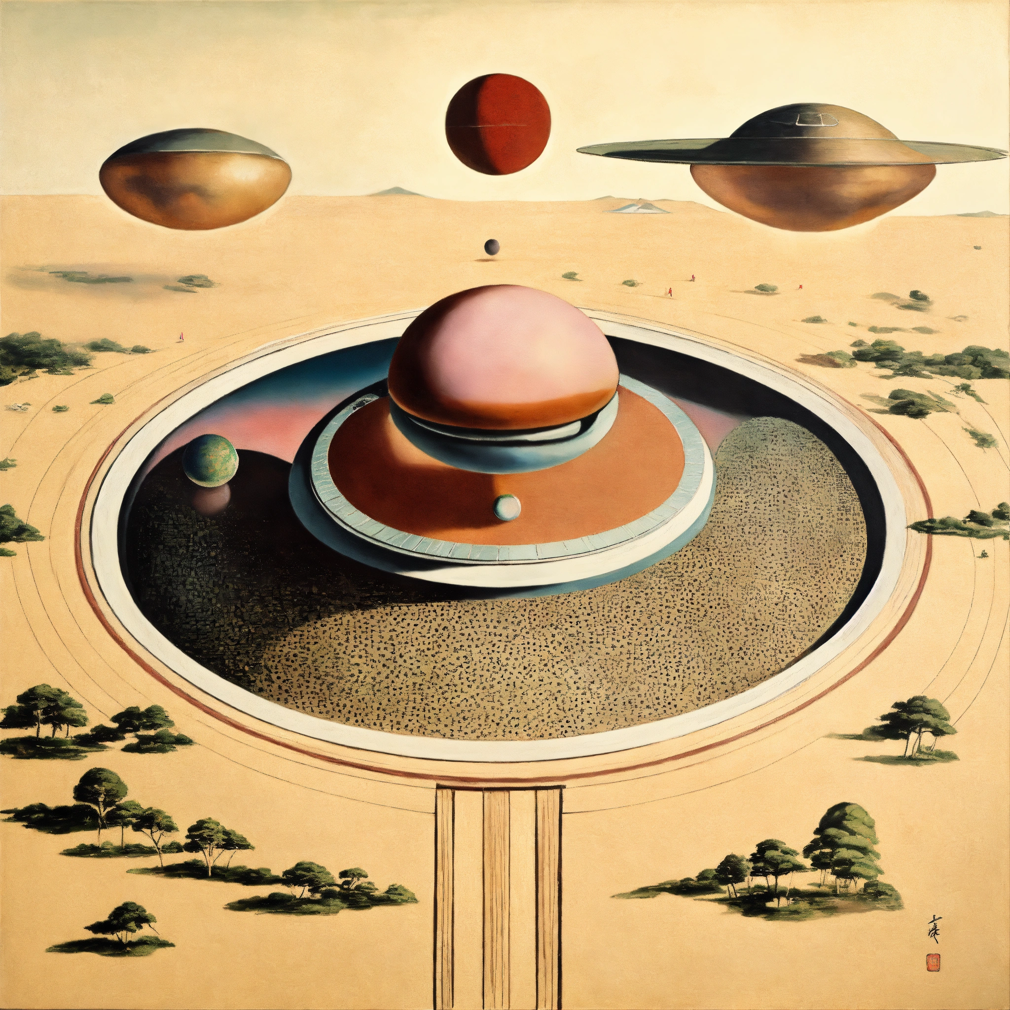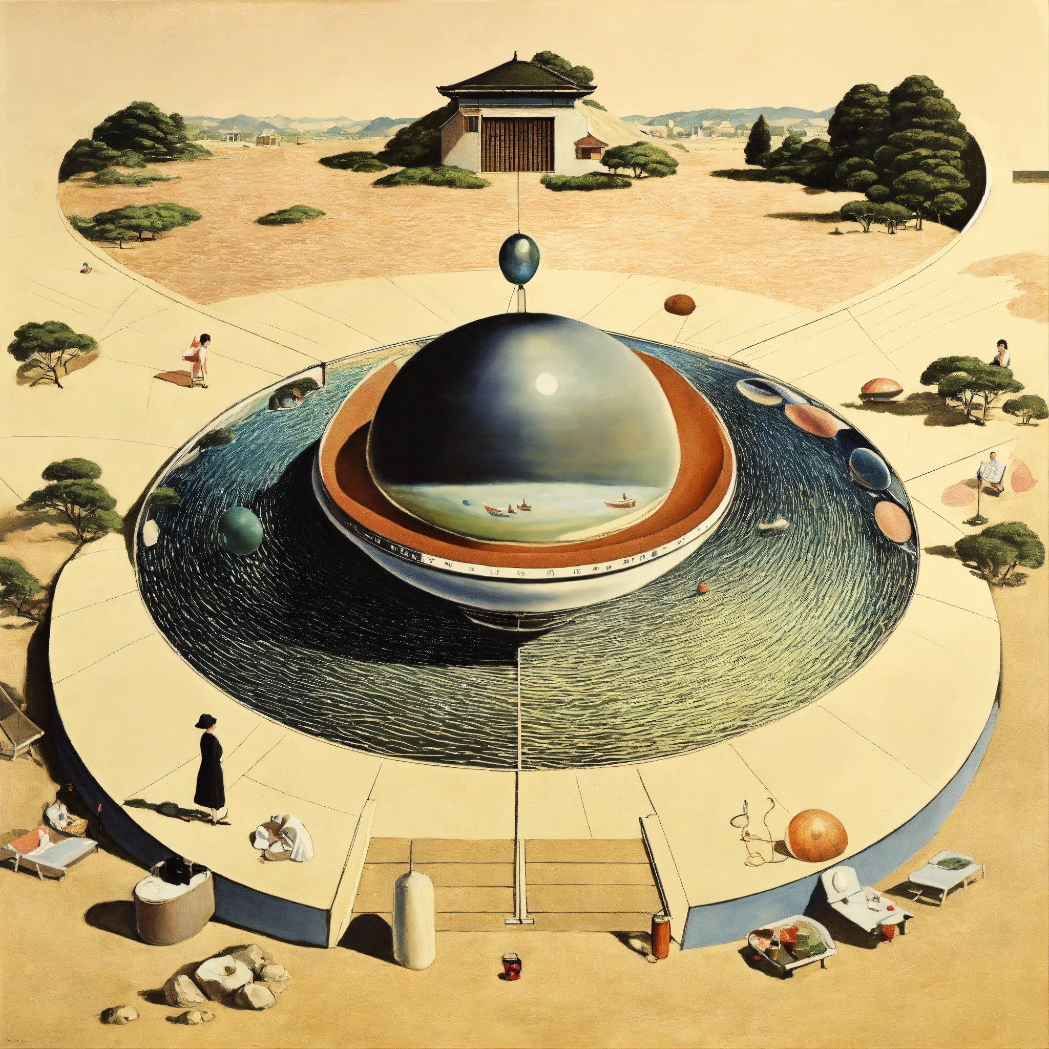 In a hyper realistic painting, the japanese venus offers a huge ufo to us and there is a swimming pool in her background, by rene magritte and raphael, a surrealistic setting, 64k cold colors, mute colors