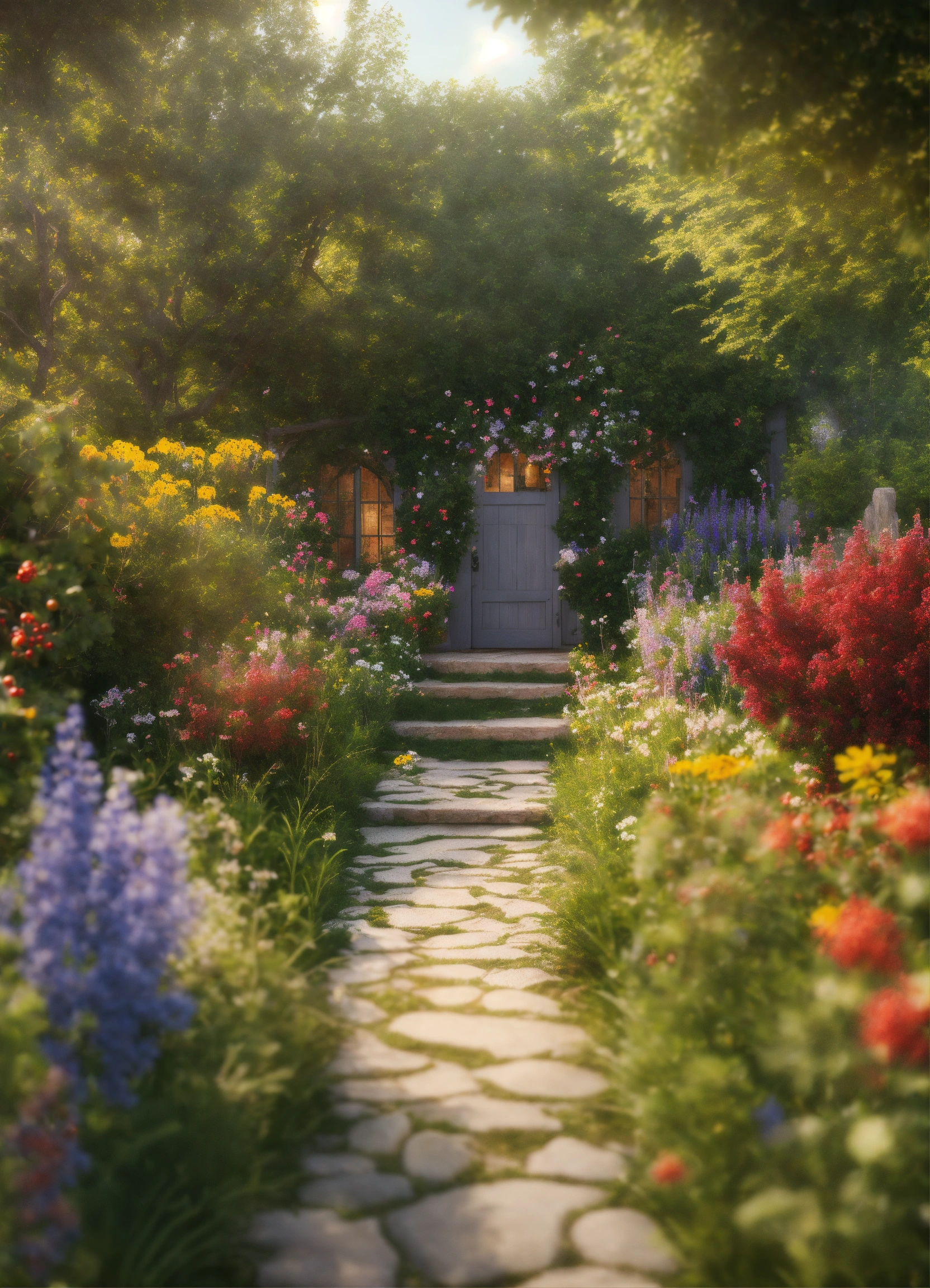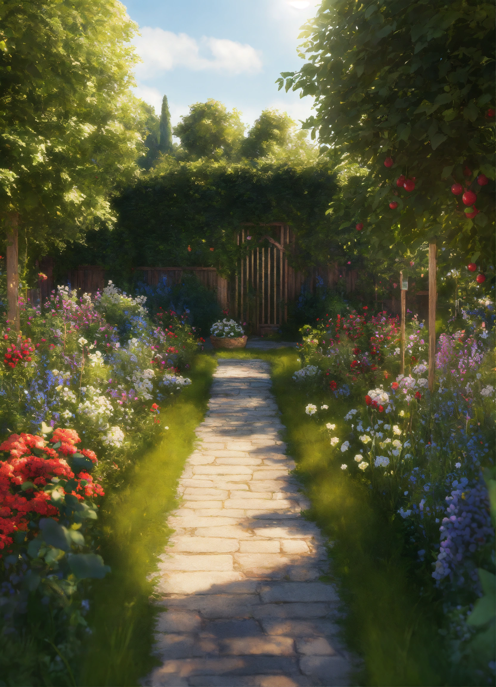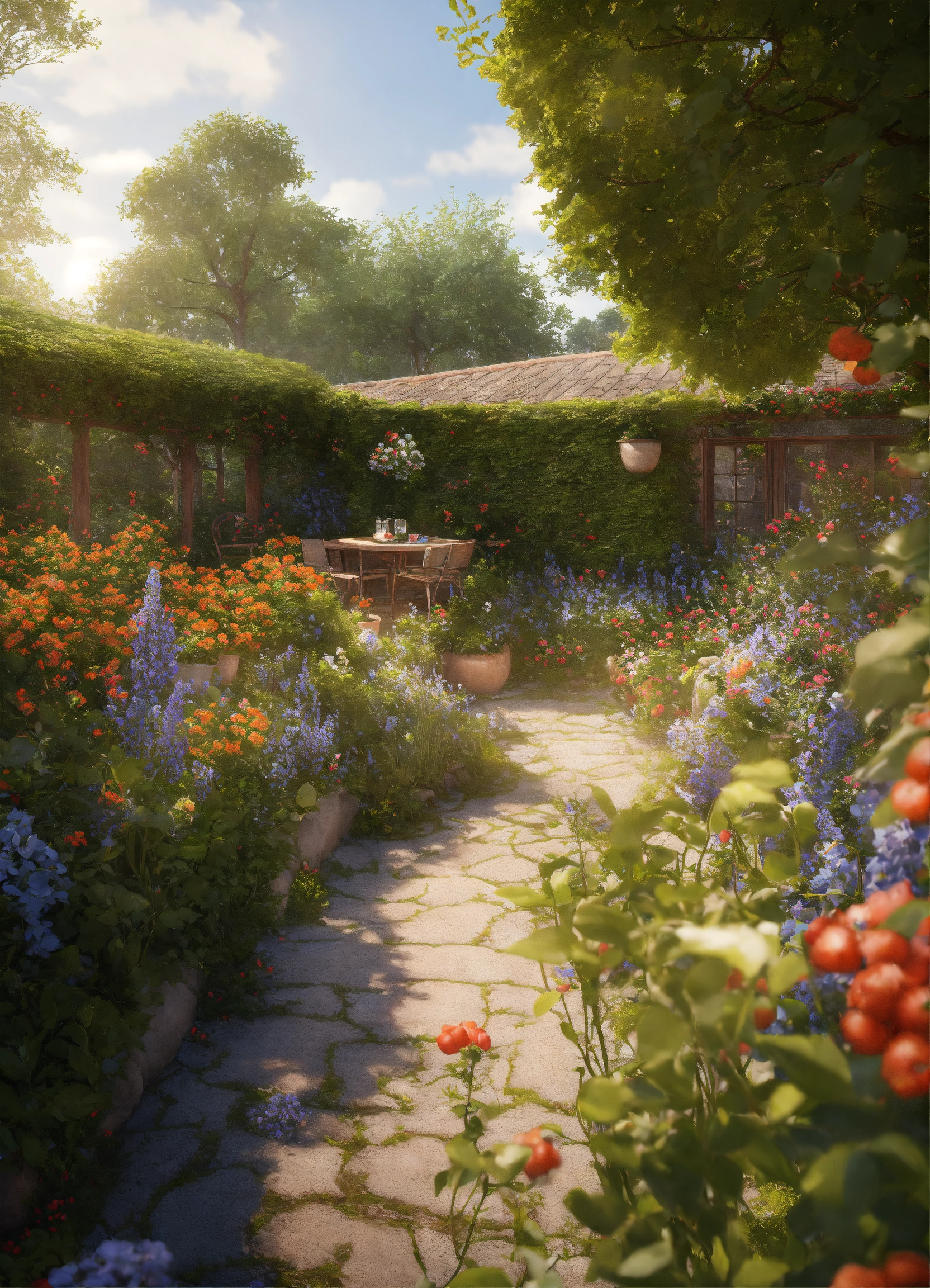 Illustrate seo inguk in a garden area with a lot of wildflowers, lush trees, and vines with berries. photorealistic 8k