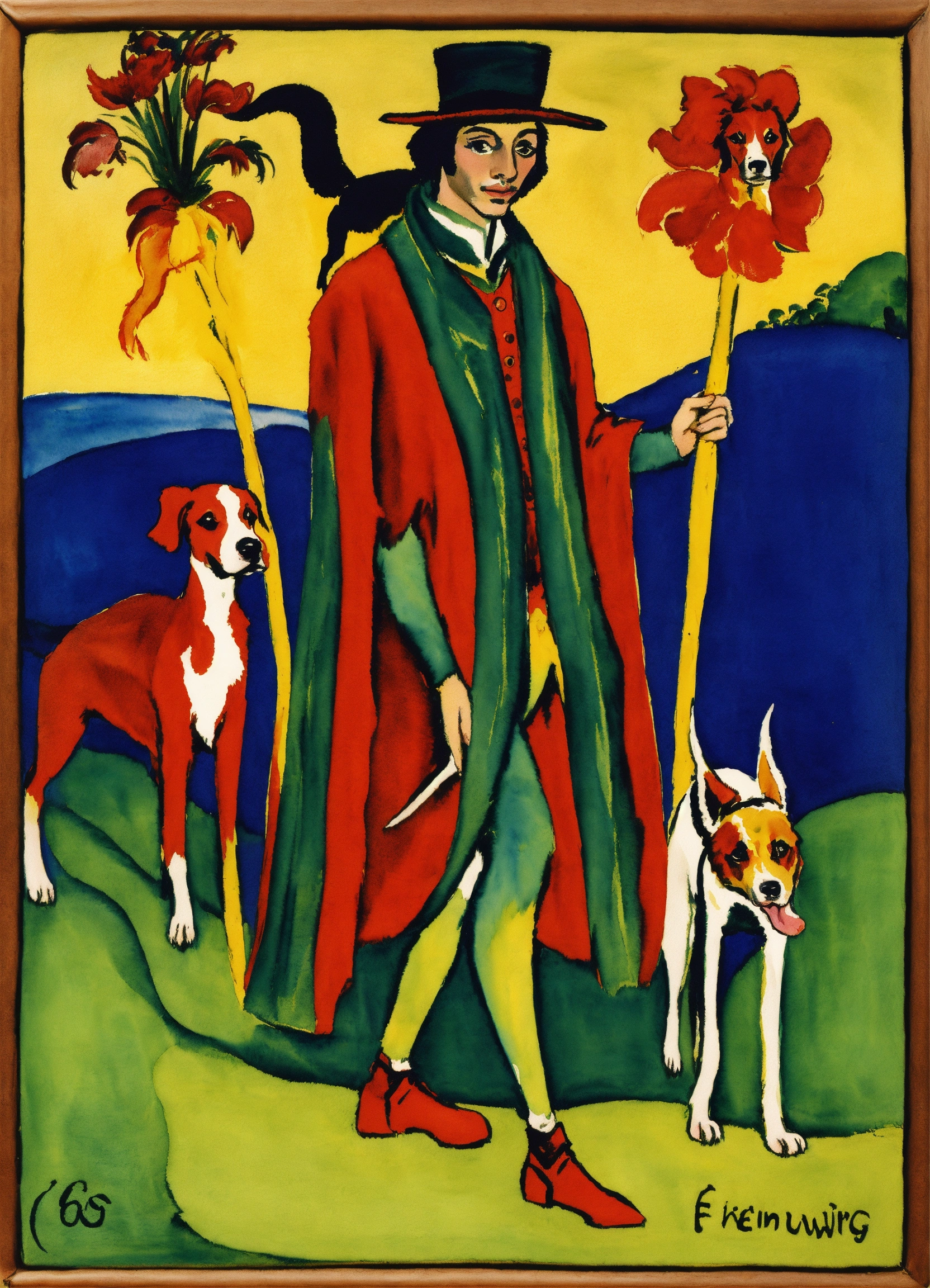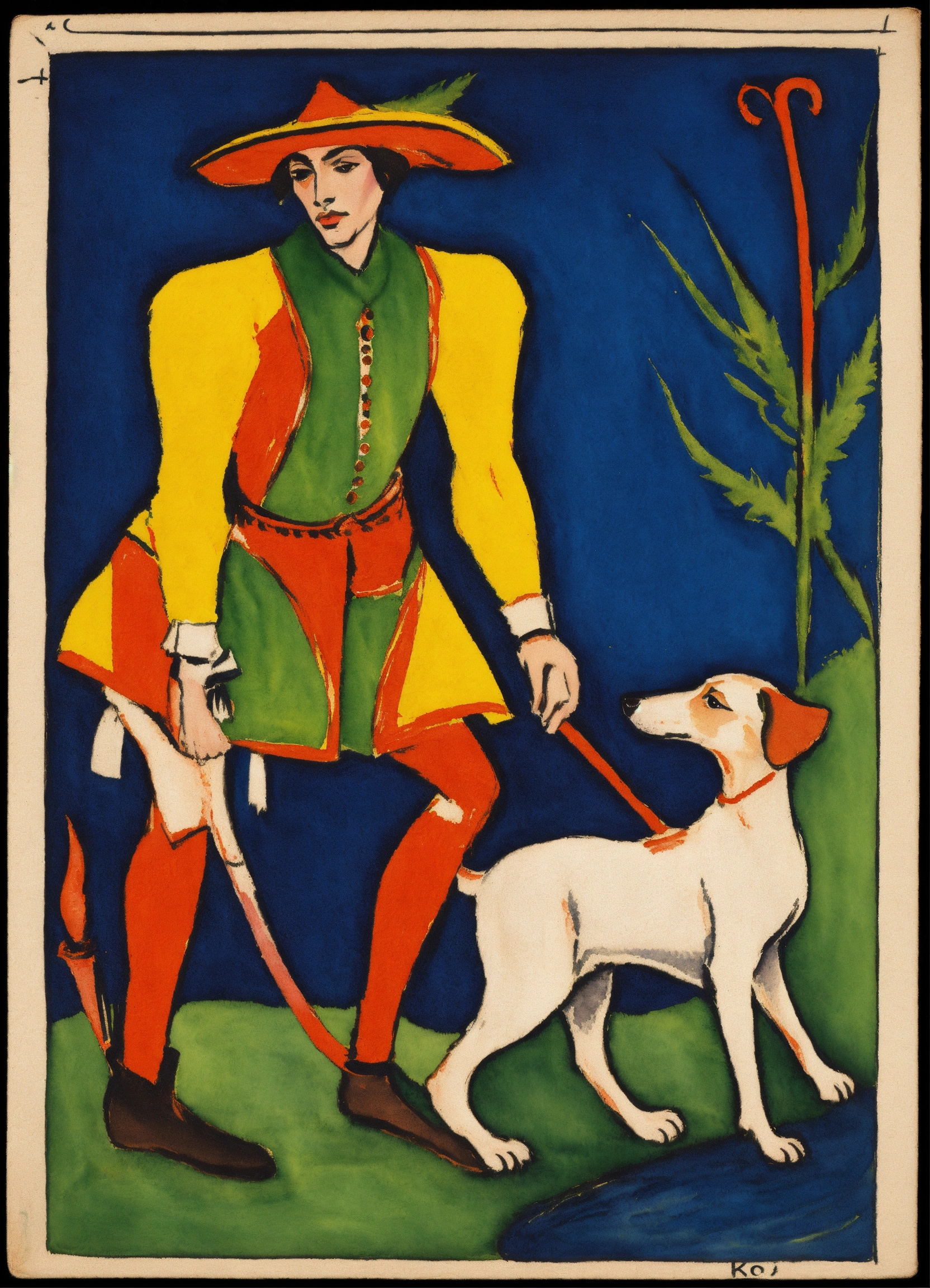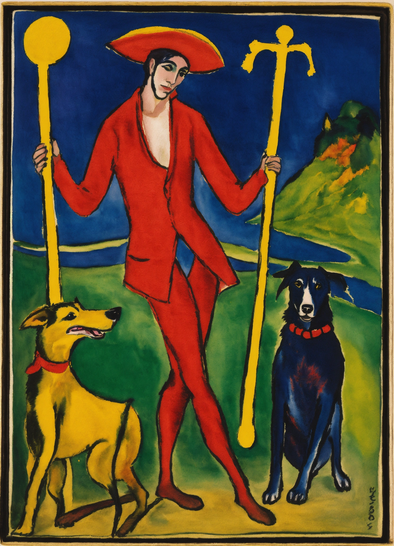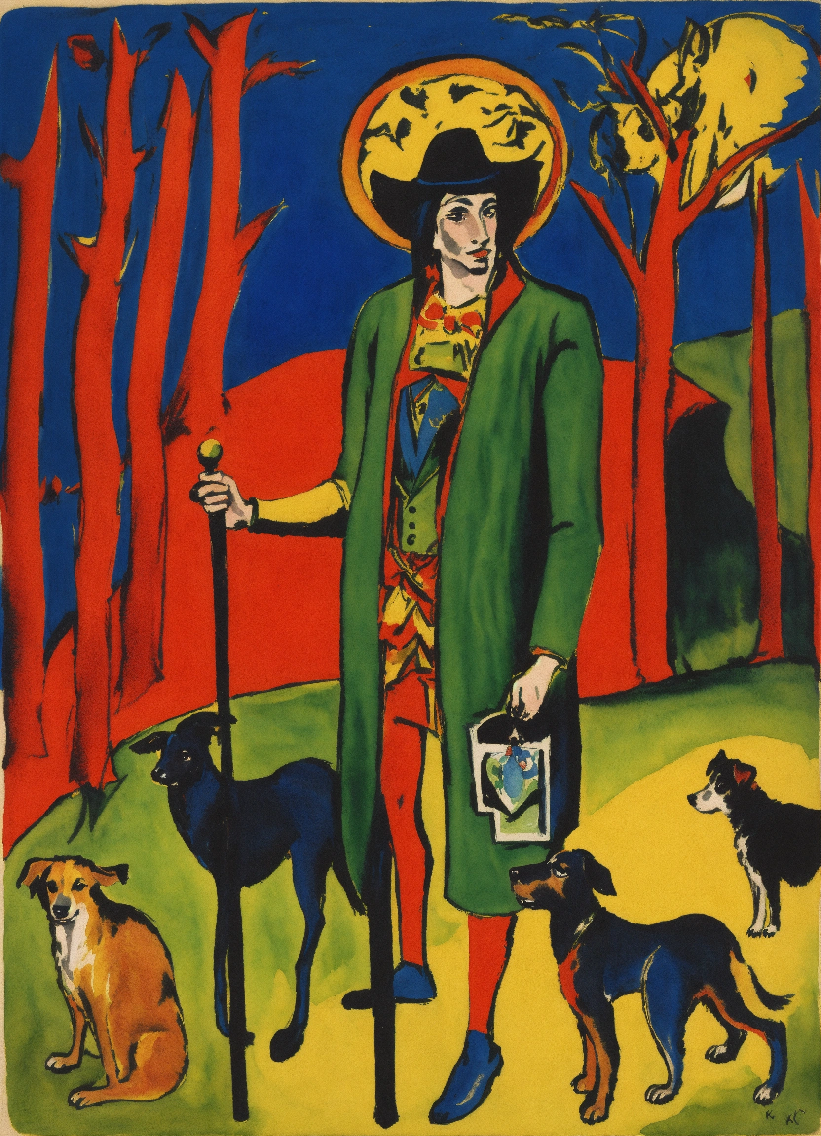 Ernst ludwig kirchner peinture, aquarelle, representation of the fool card, in the tarot. a character with a bundle followed by a dog that kills his calves