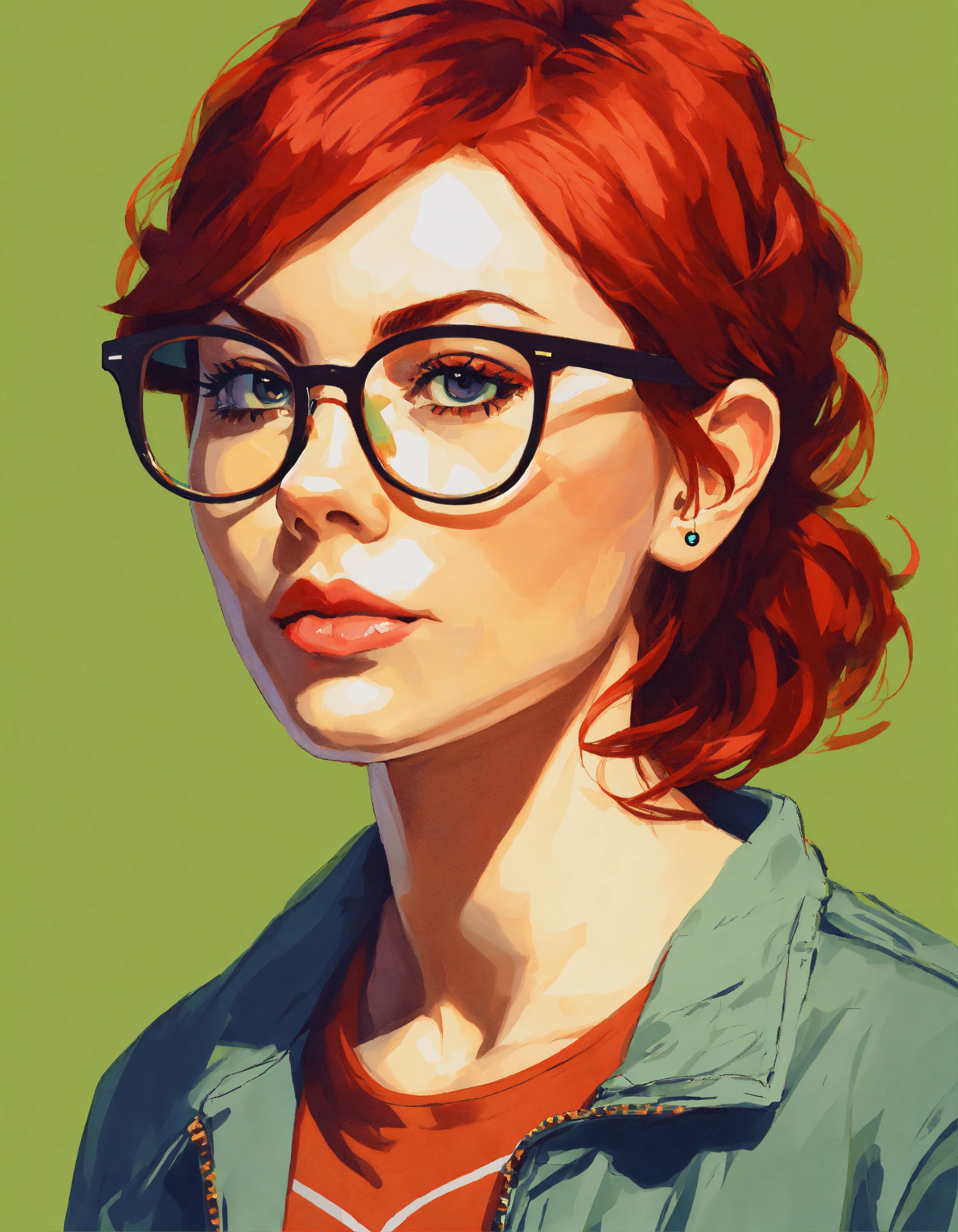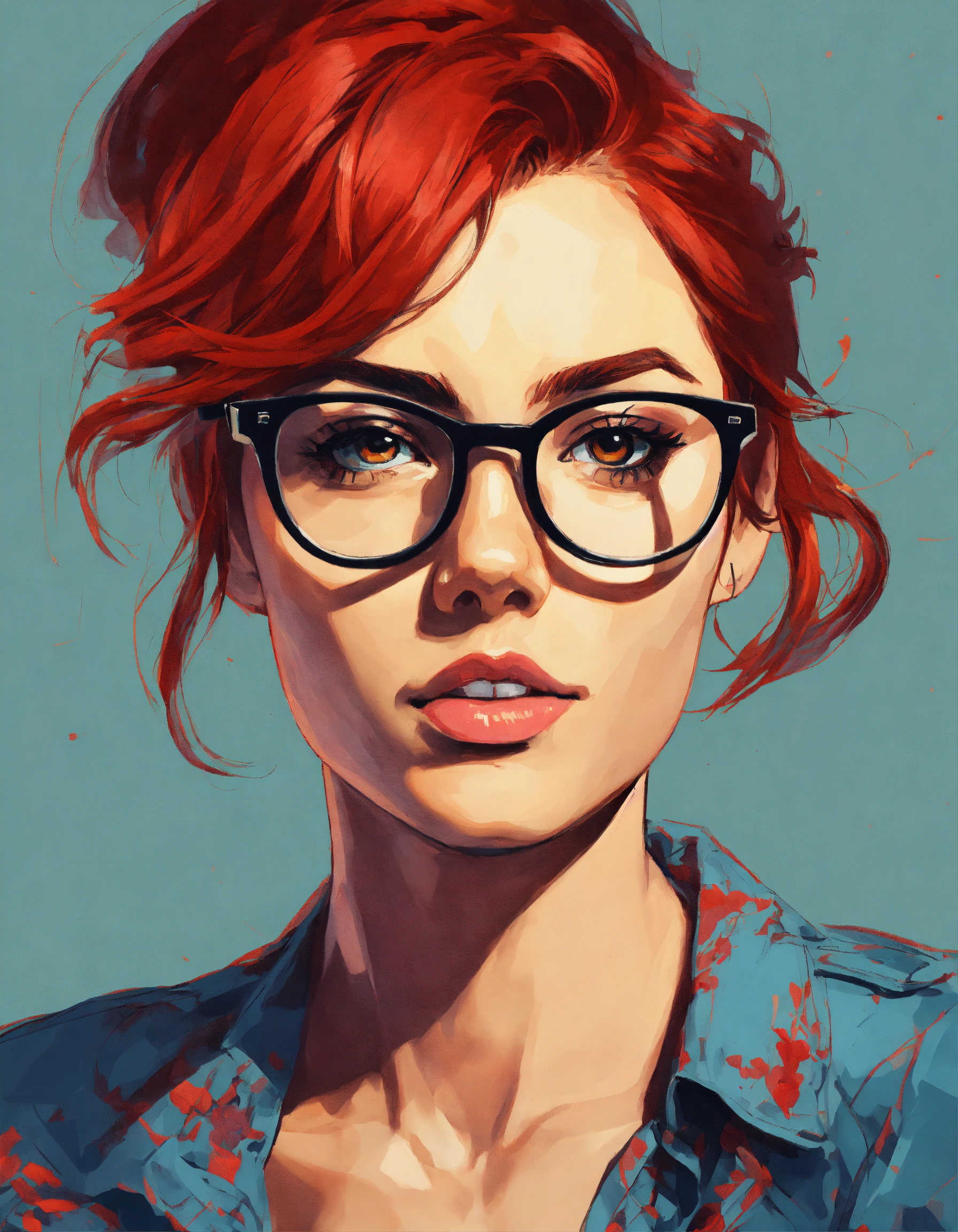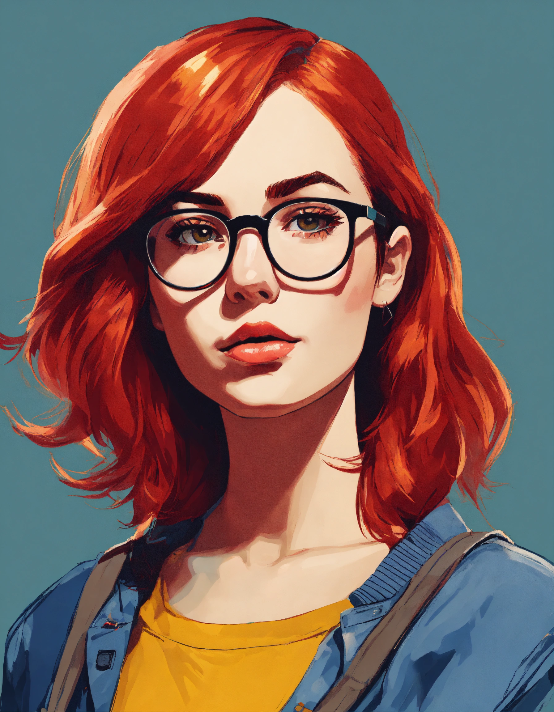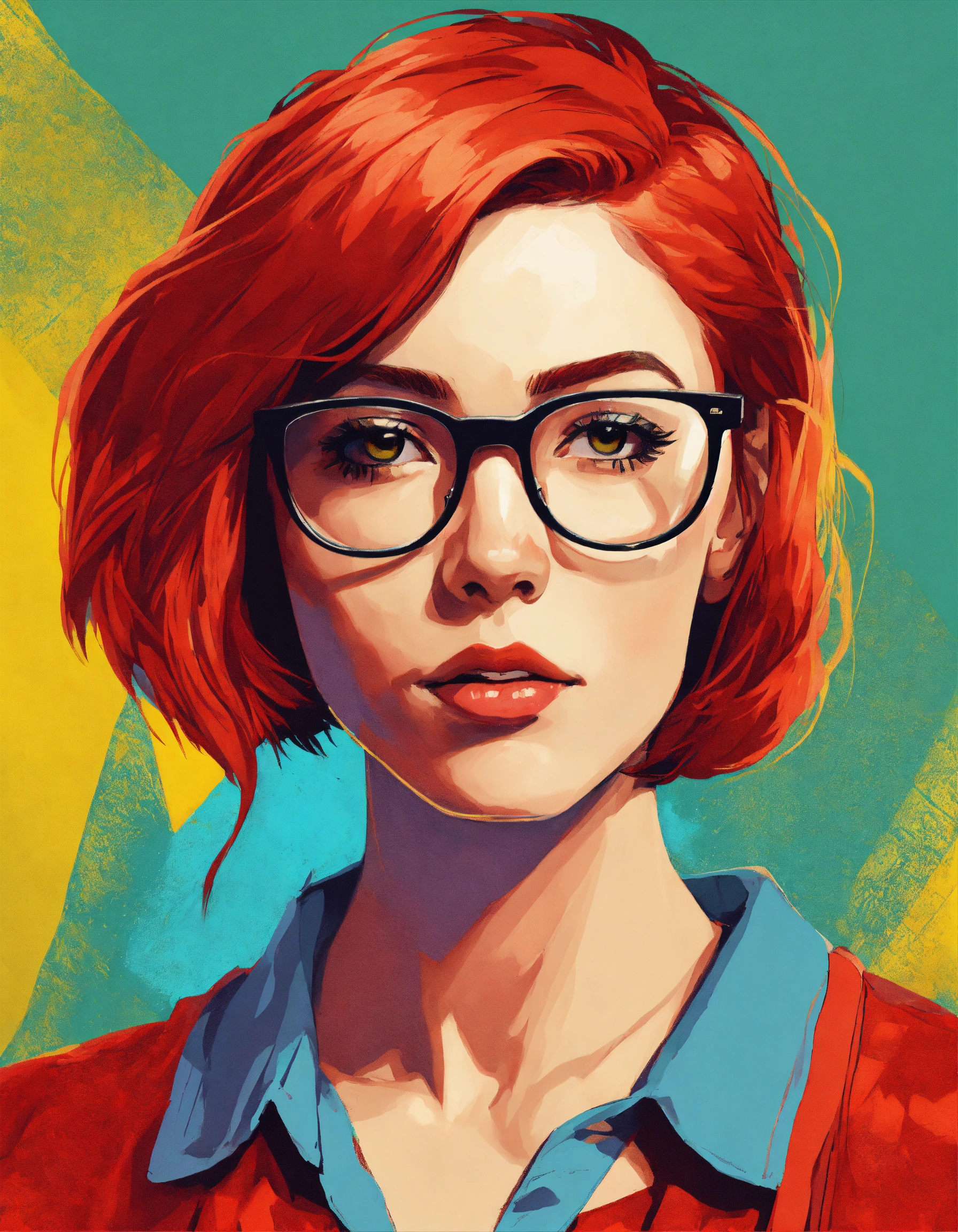 Female torso portrait avatar, with red hair wearing modern reading glasses, casual clothes, academic student, age 28, in pop art style, looking straight on at the camera.