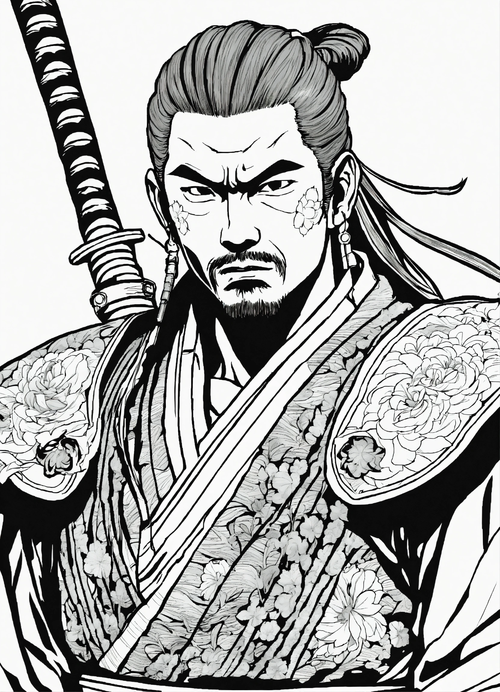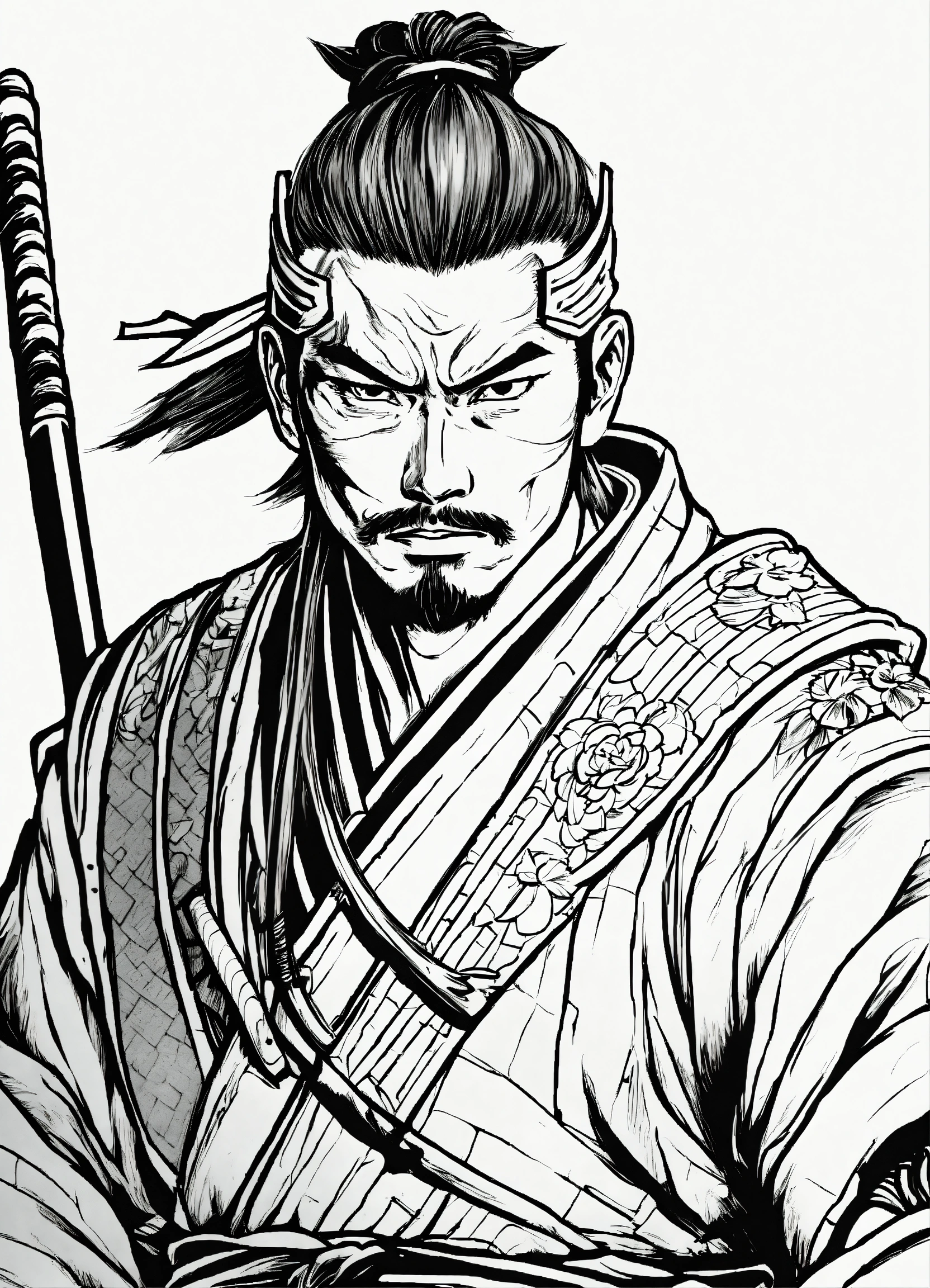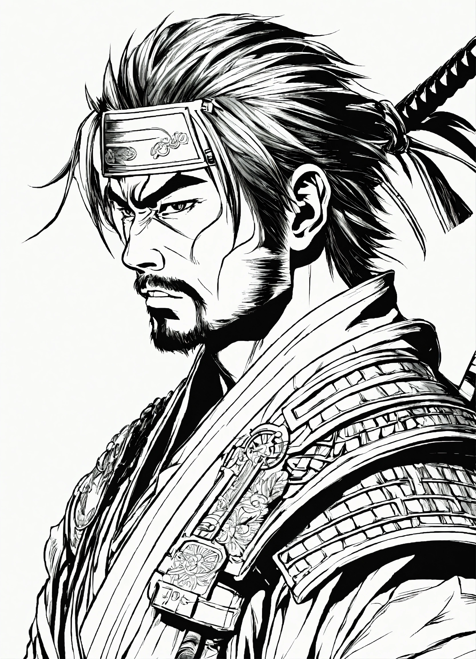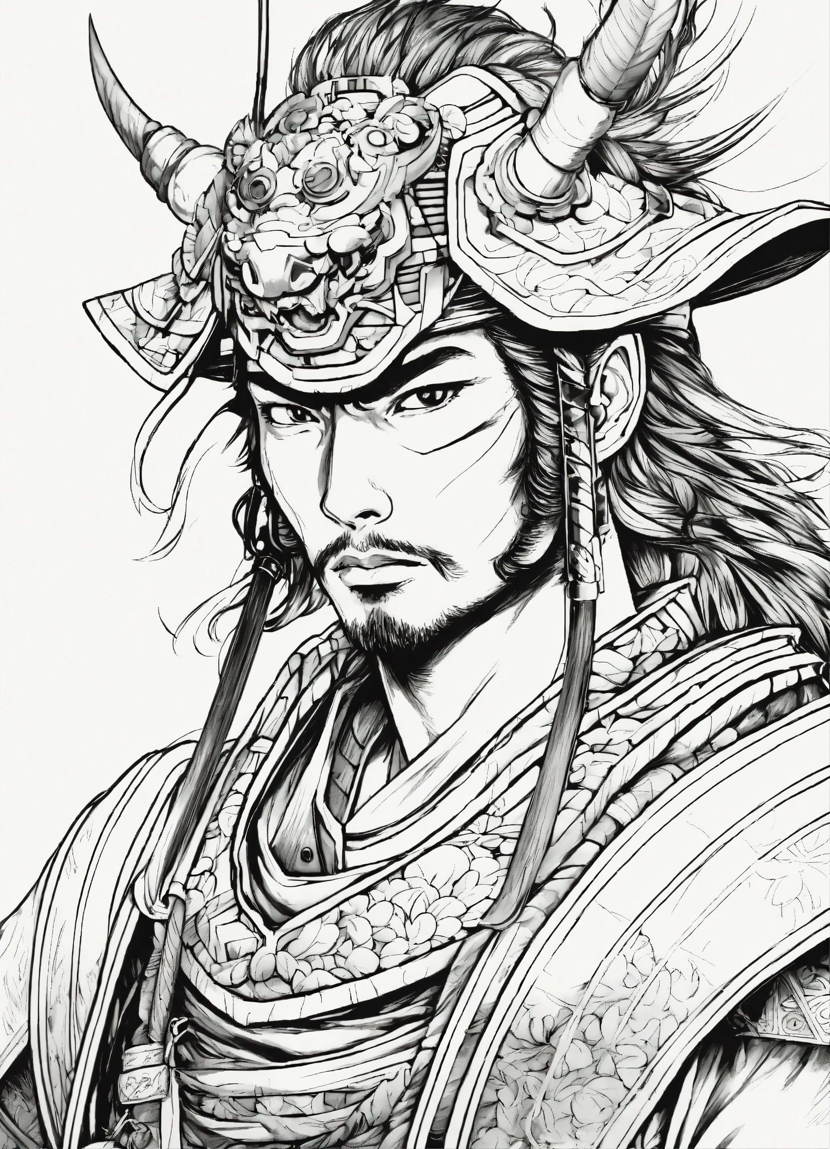 Generate a portrait of a samurai, 4k resolution, anime line art, in the style of akira toriyama, with clear lines, no shadows, on a pure white background suitable for a adult's coloring book.