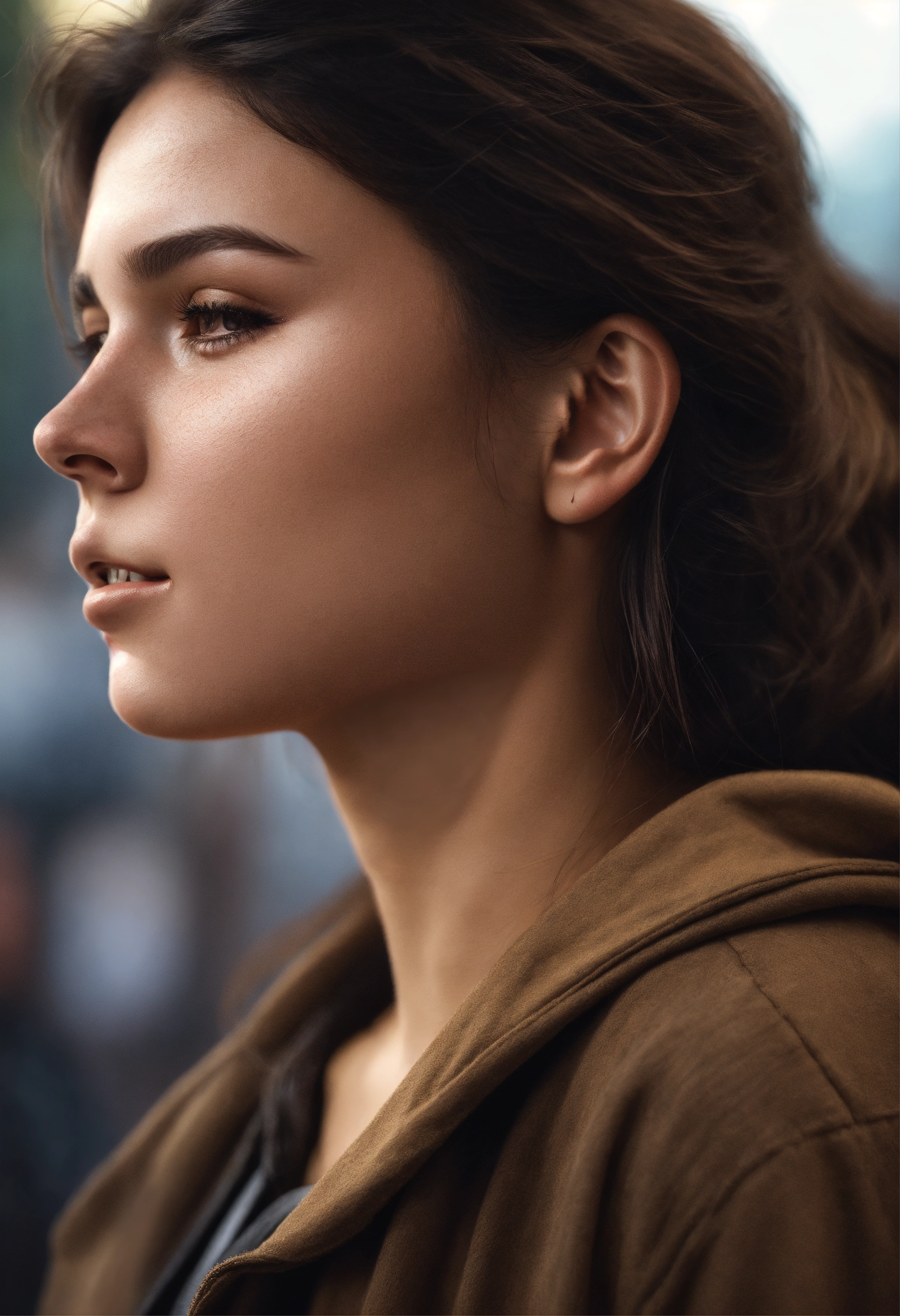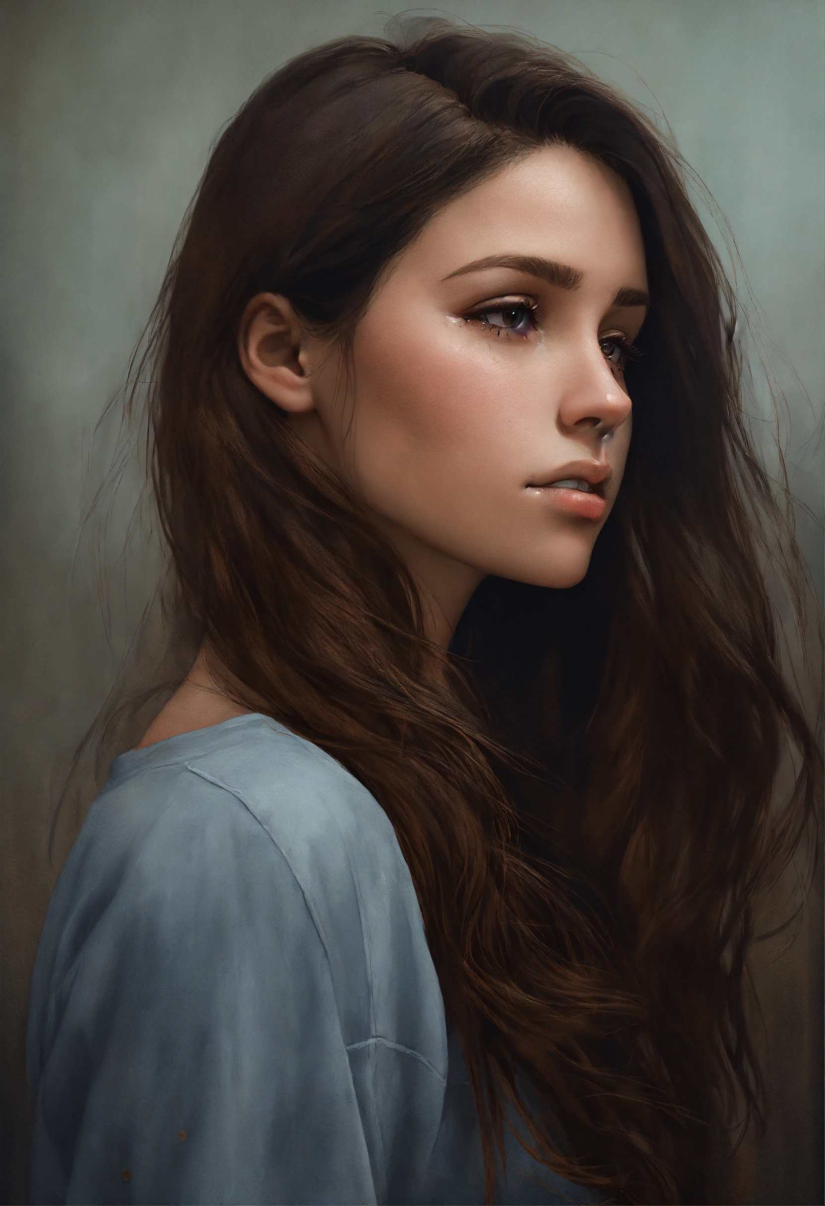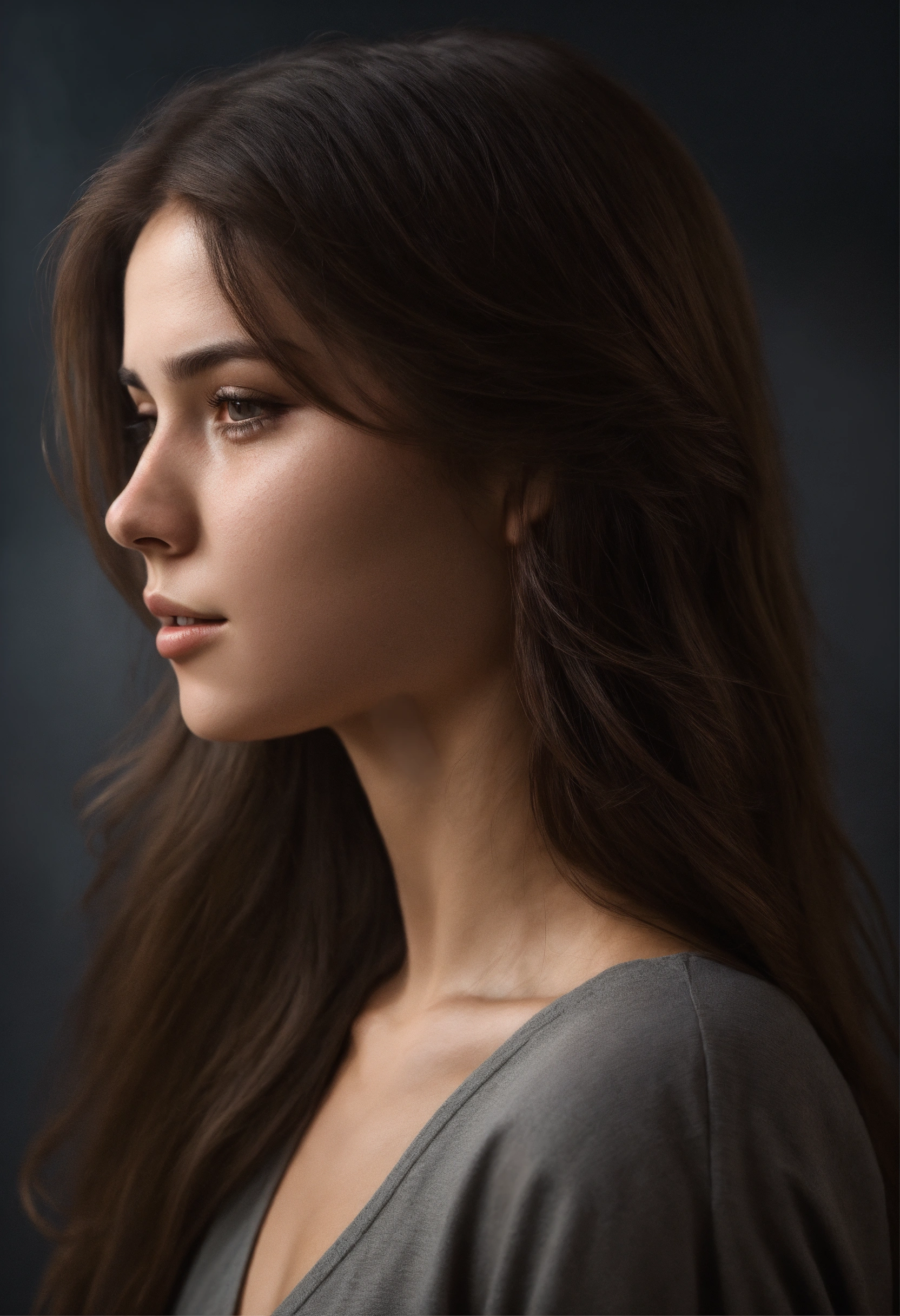 Beautiful sad face of a young woman with dark brown hair in profile, clear facial features, detailed image, realistic, real, realistic facial features, realistic photography