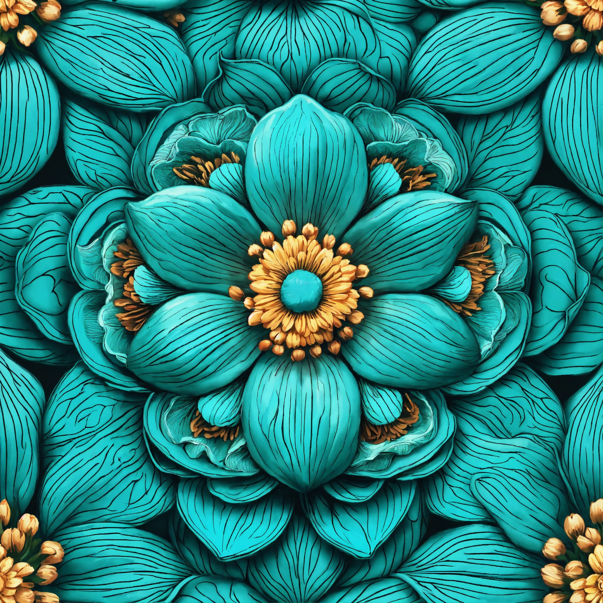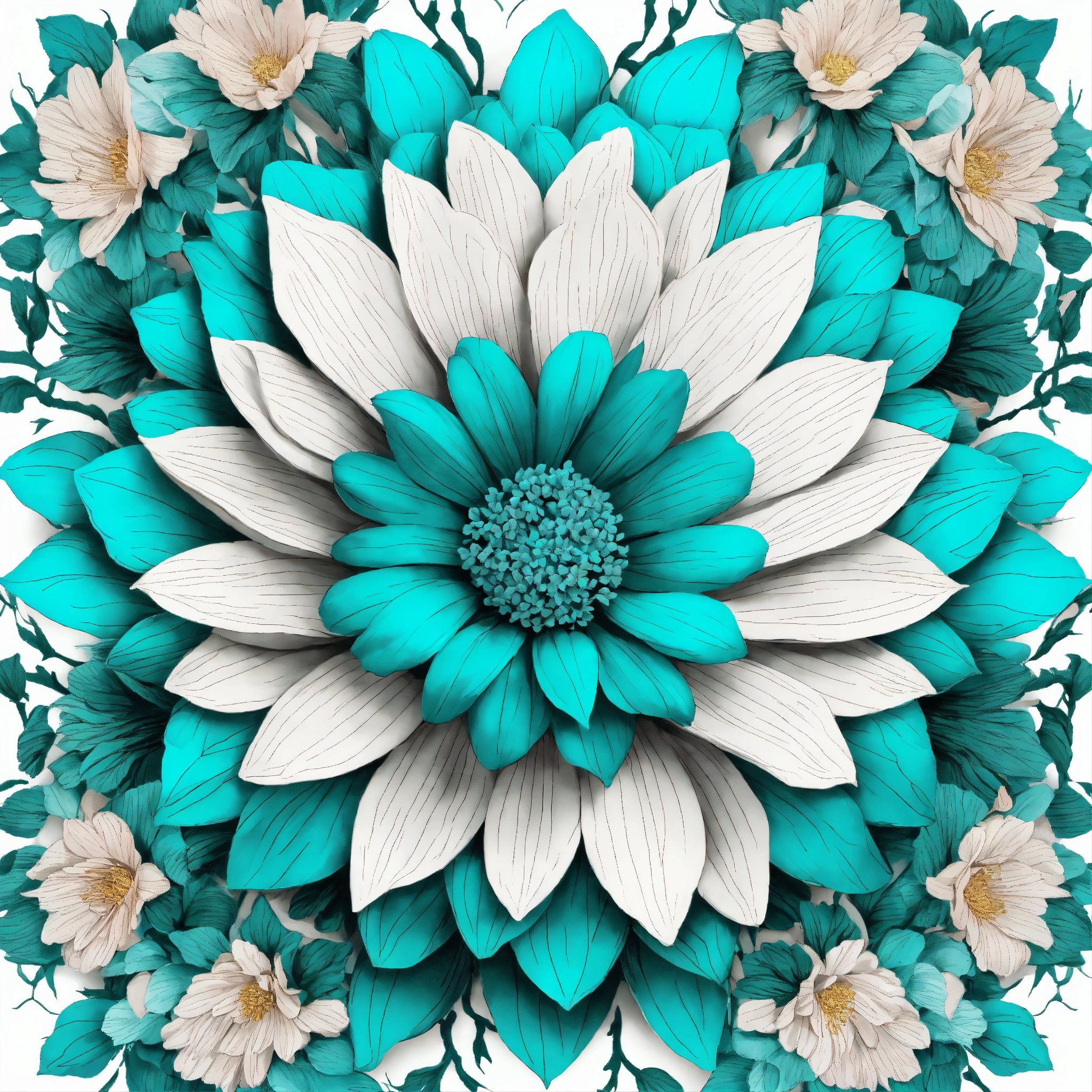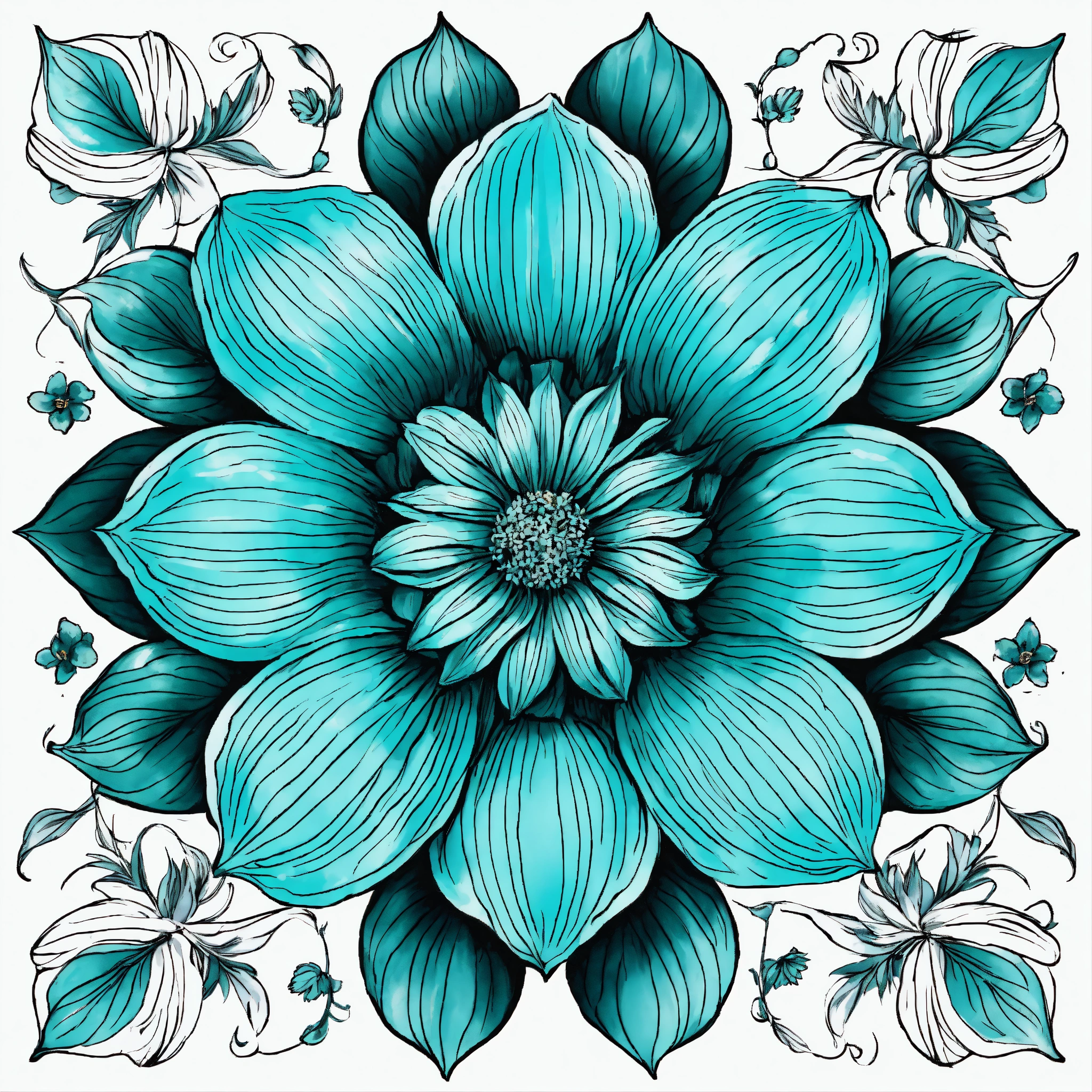 Large beautiful turquoise flower, hyperrealistic, facing front with smaller flowers surrounding, 2d, clipart. illustration done in pen, on a white background