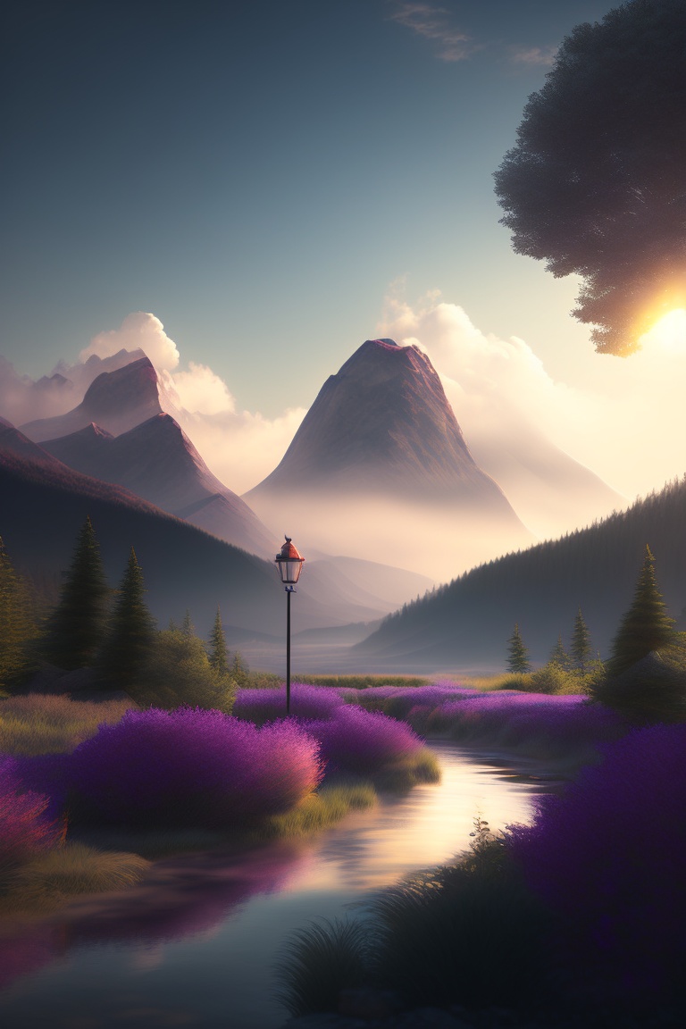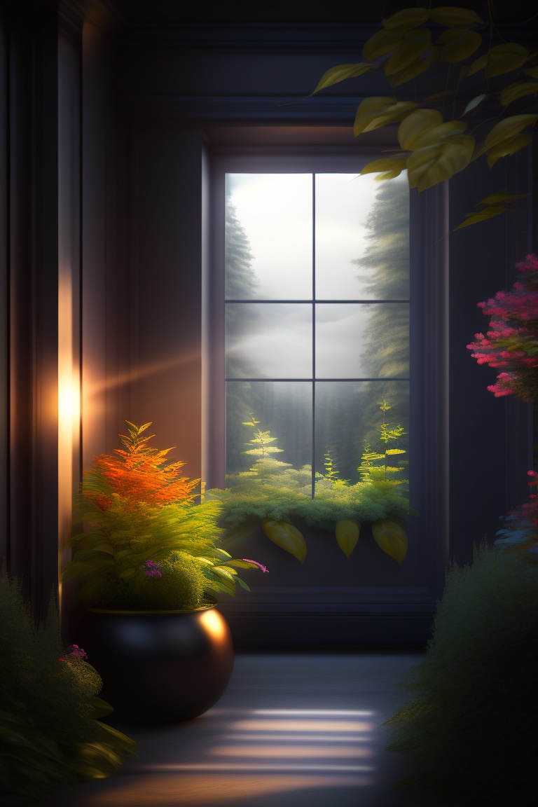 Digital image of a light and nature scene using v-ray. scene characteristics: foreboding and light emotions, with beautiful plants, beautiful light clouds or fog and light lighting. environment characteristics: social media platforms such as instagram and pinterest for inspiration and reference images. --style 4b --chaos 0 --q 2 --stylize 1000 --v 4 --style 4b --chaos 0 --q 2 --stylize 1000