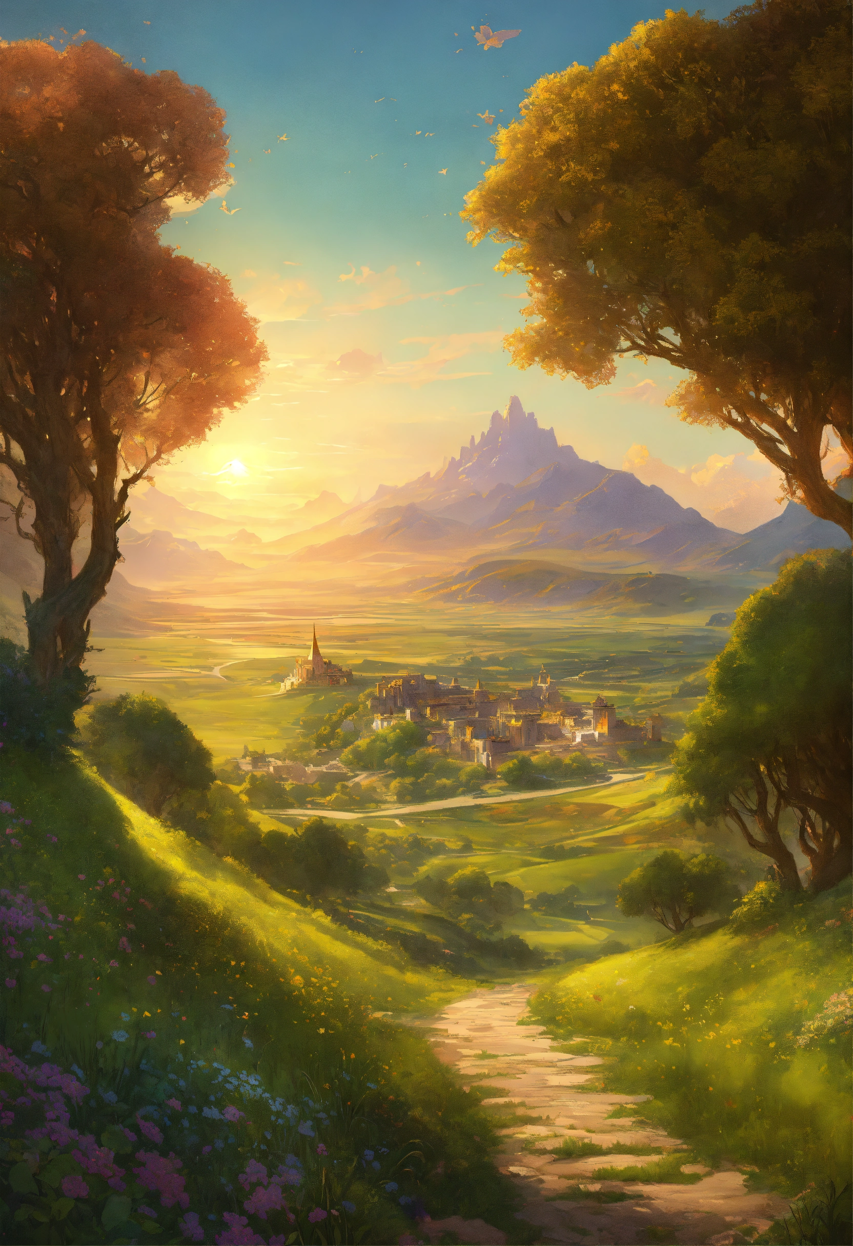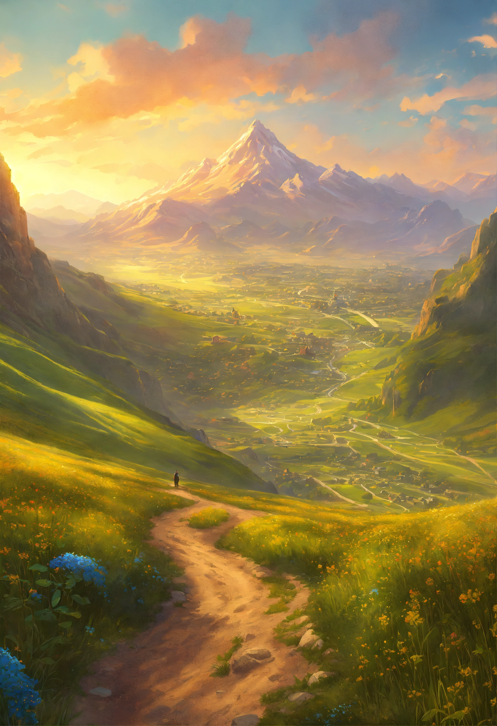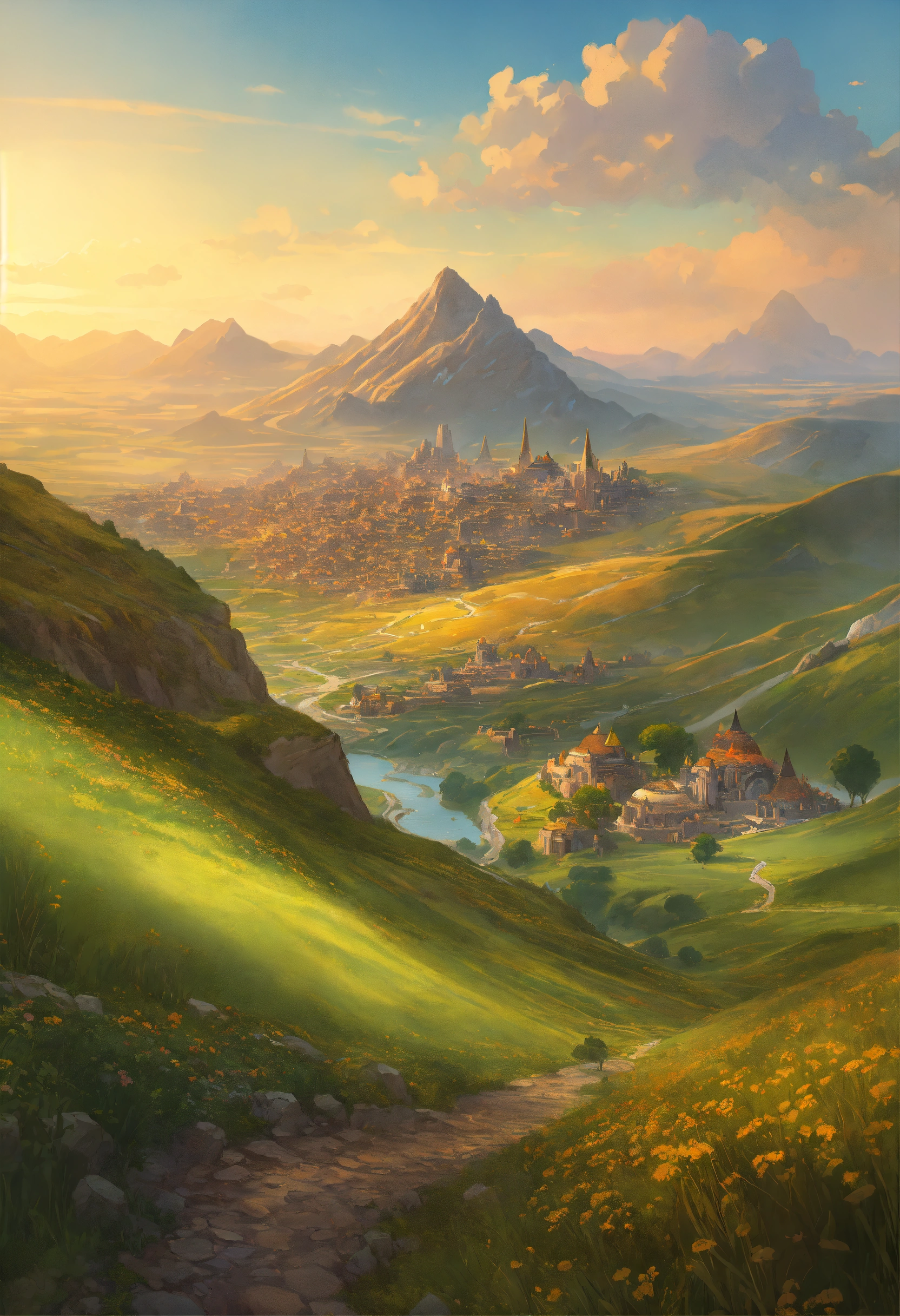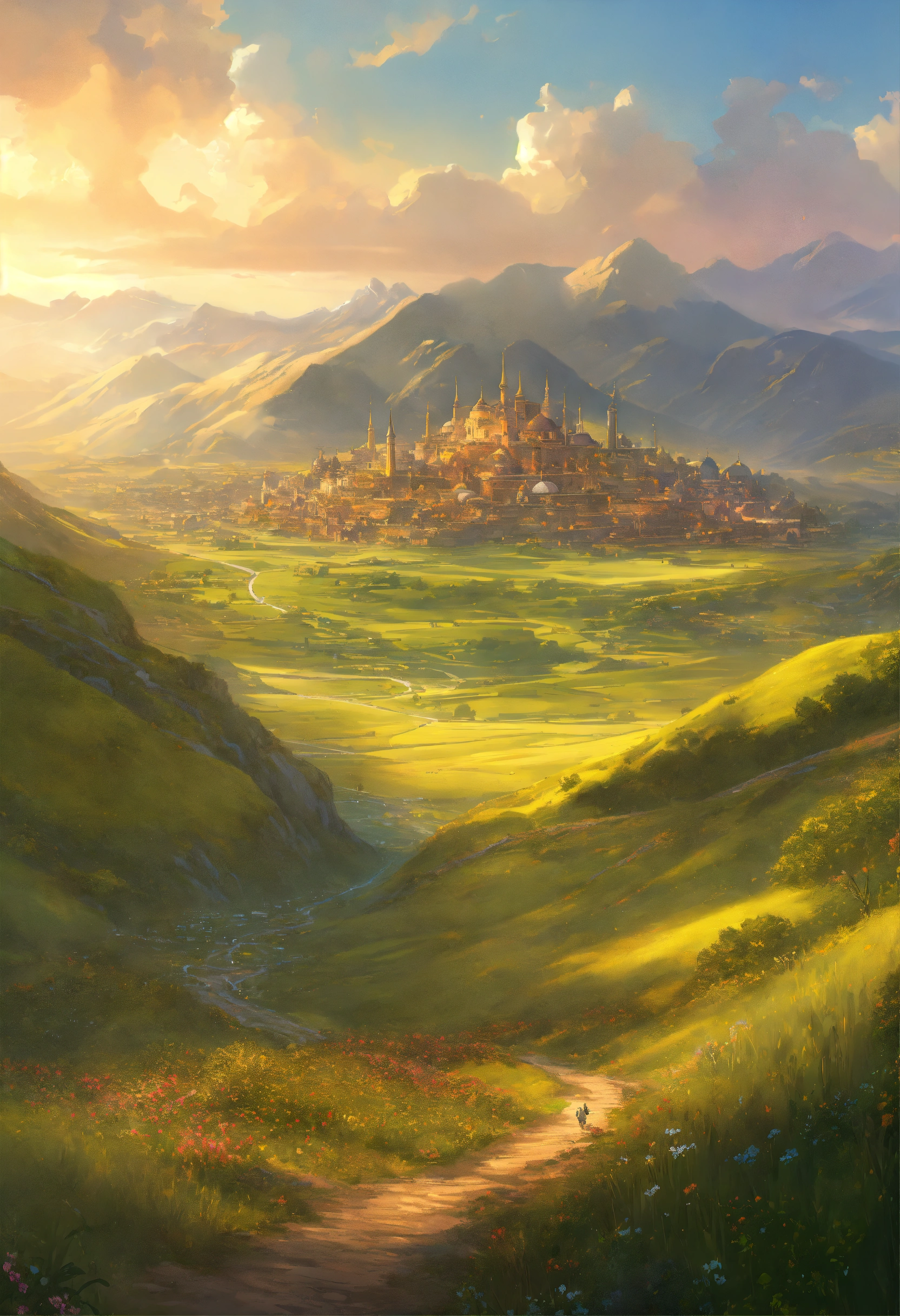 Grasslands with rolling hills, mystical, glowing gems, samarkand style hobbit city, busy road leading to city, highly detailed, digital painting, artstation, concept art, smooth, sharp focus, illustration, art by artgerm and greg rutkowski and alphonse mucha, erte, 8 k