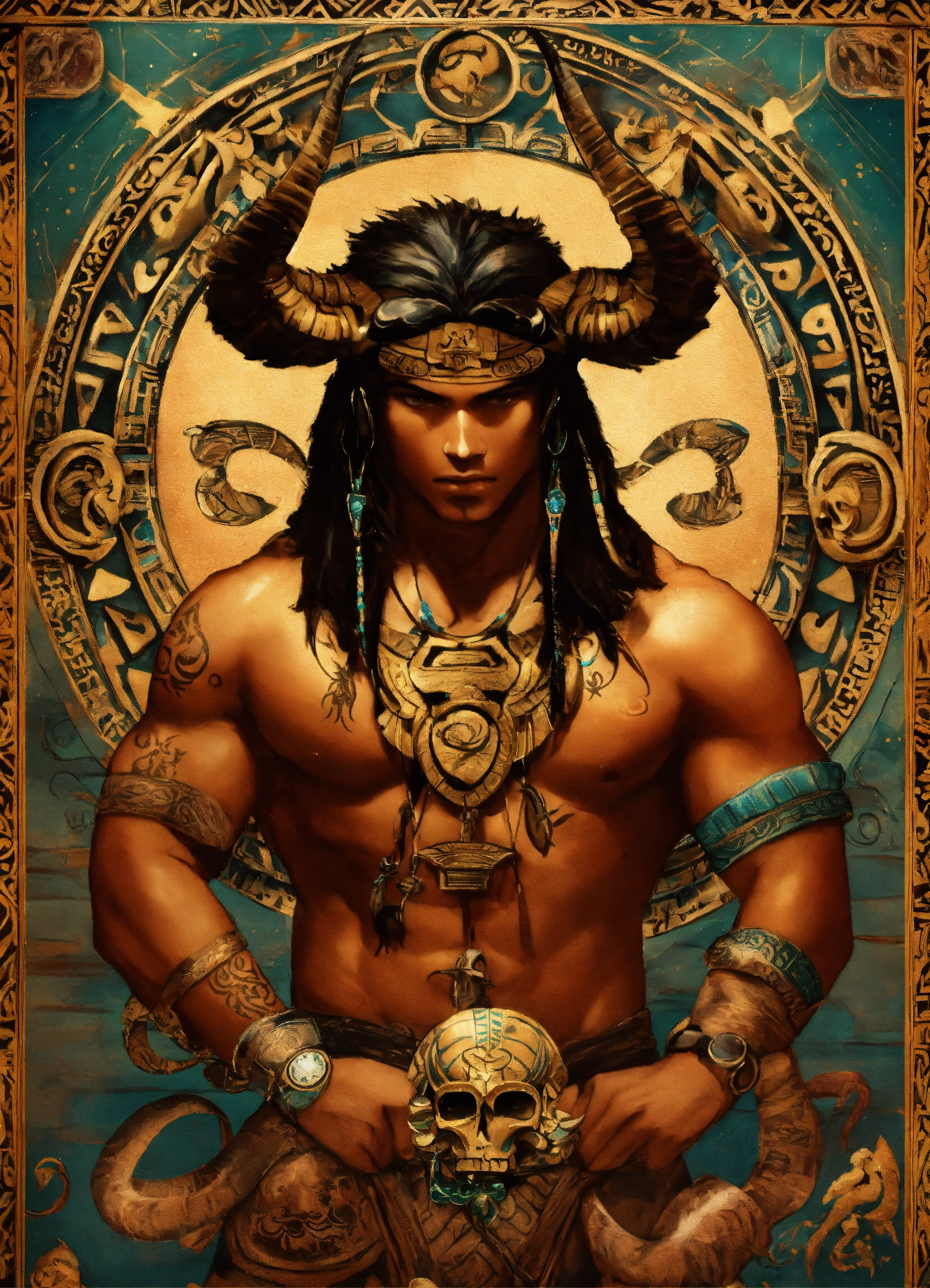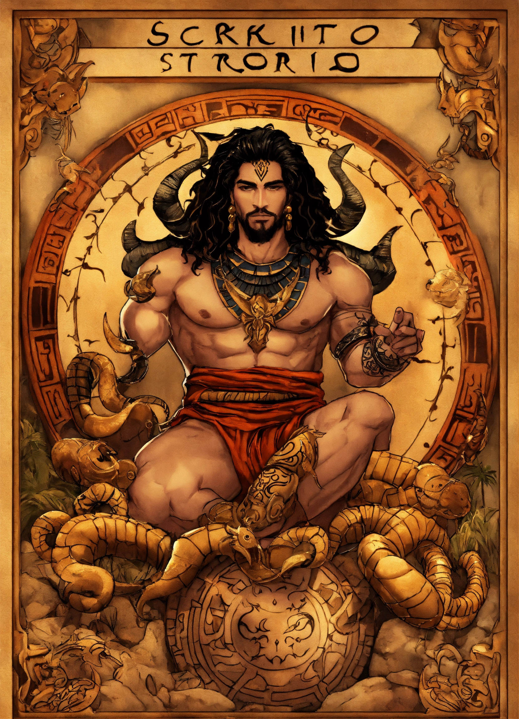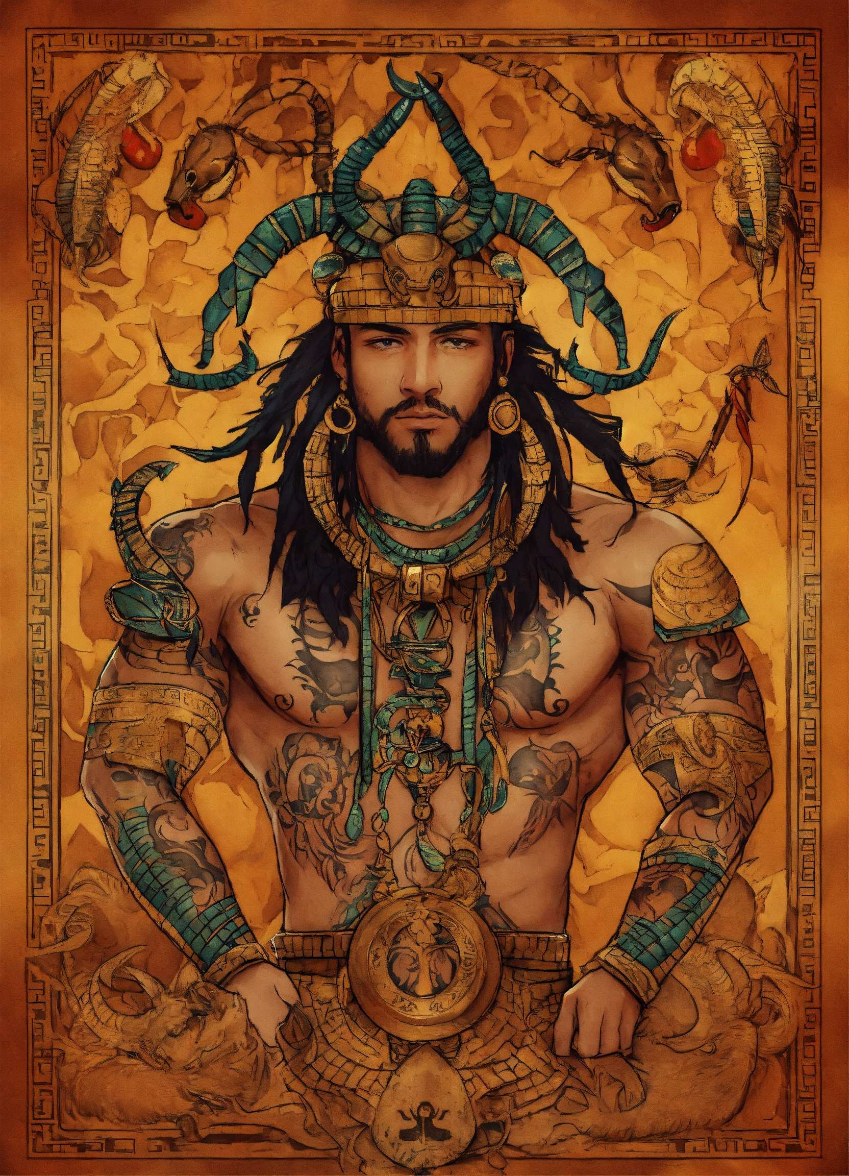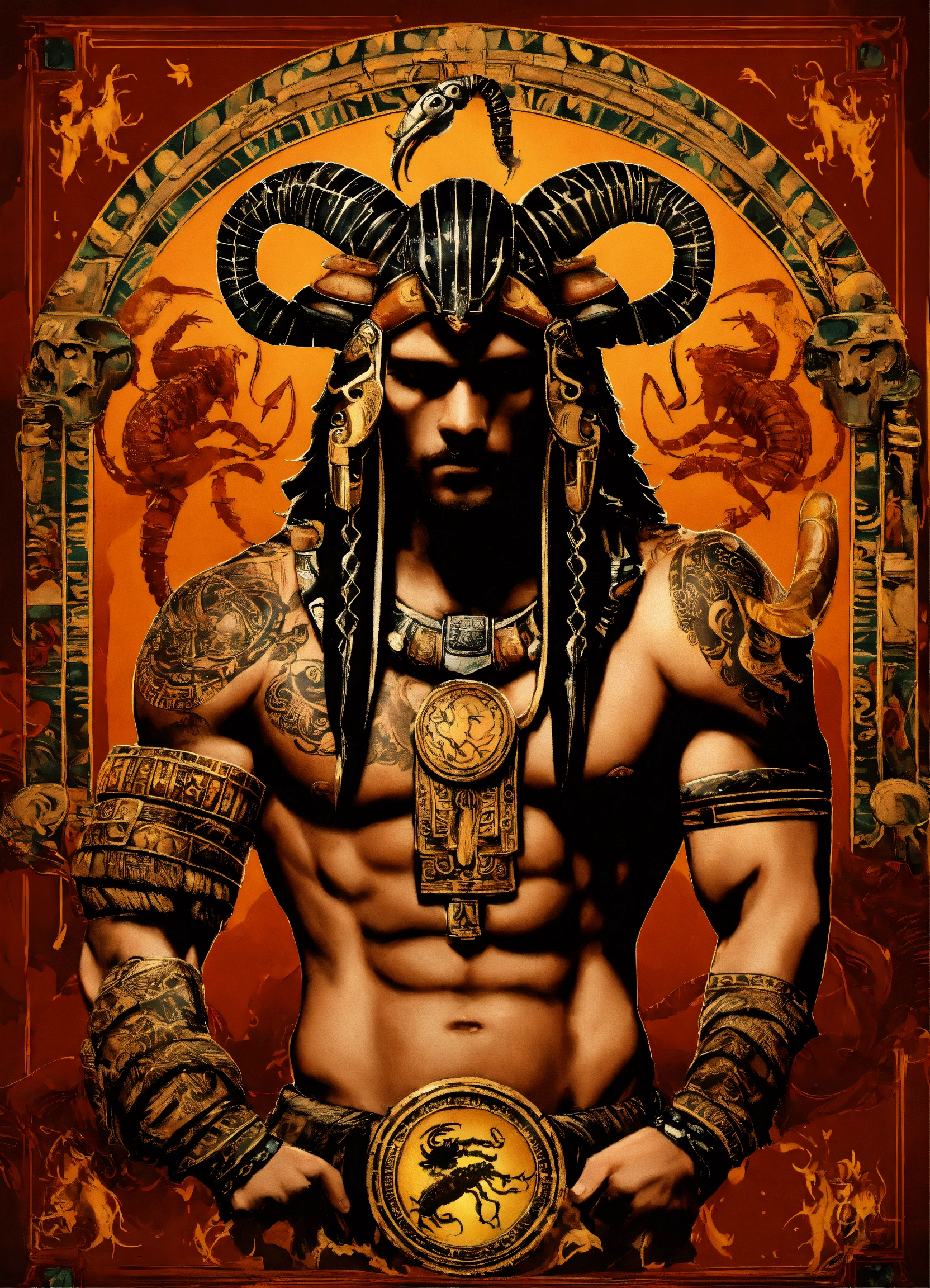 Scorpio zodiac theme with pluto background aztec man with scorpion tattoos and holding a scorpion