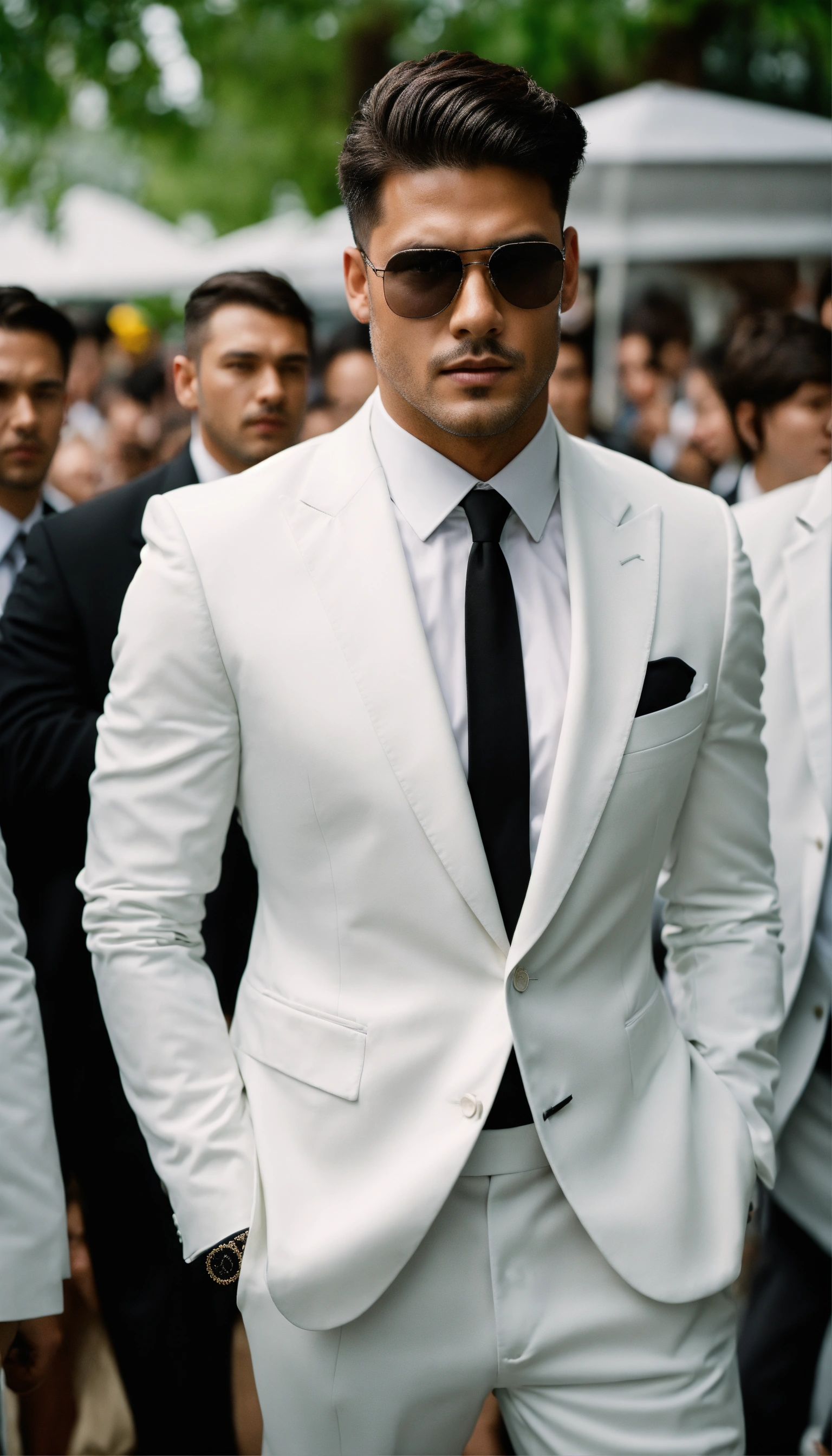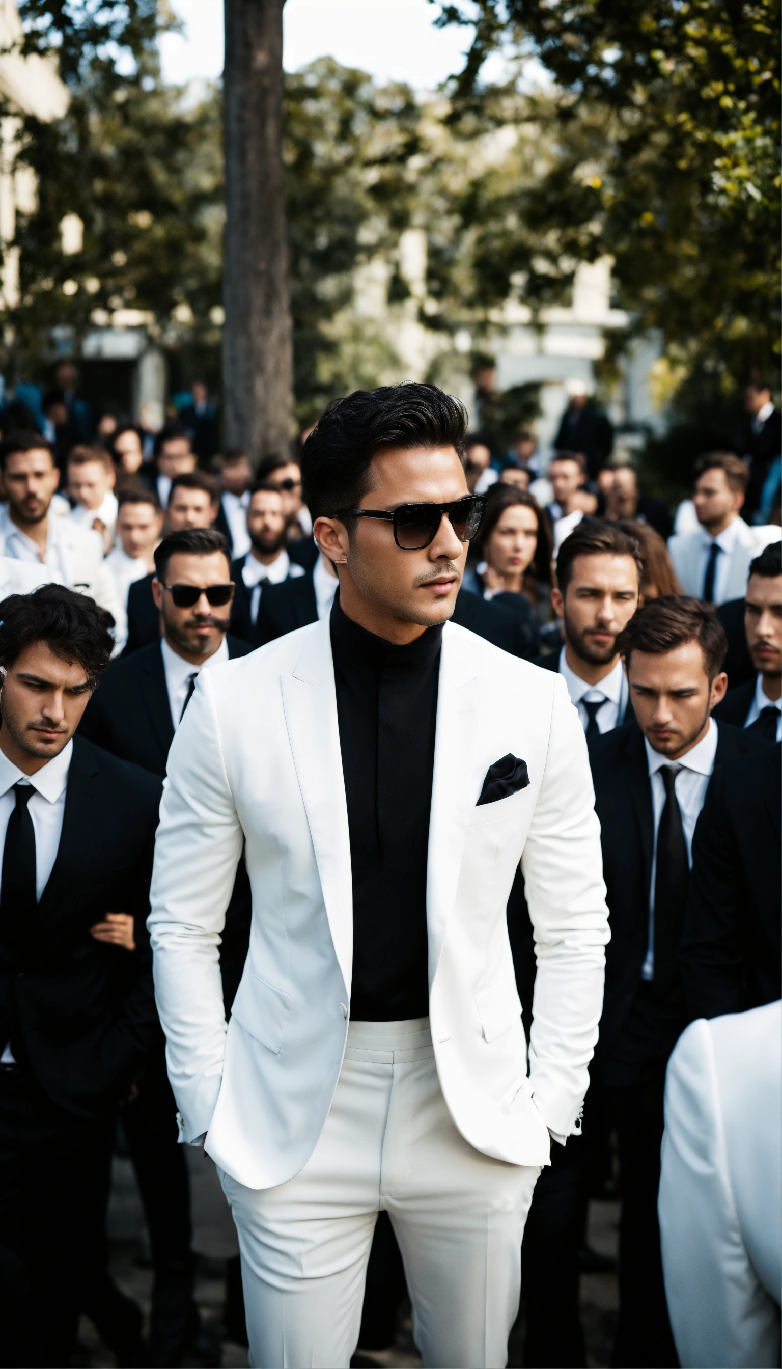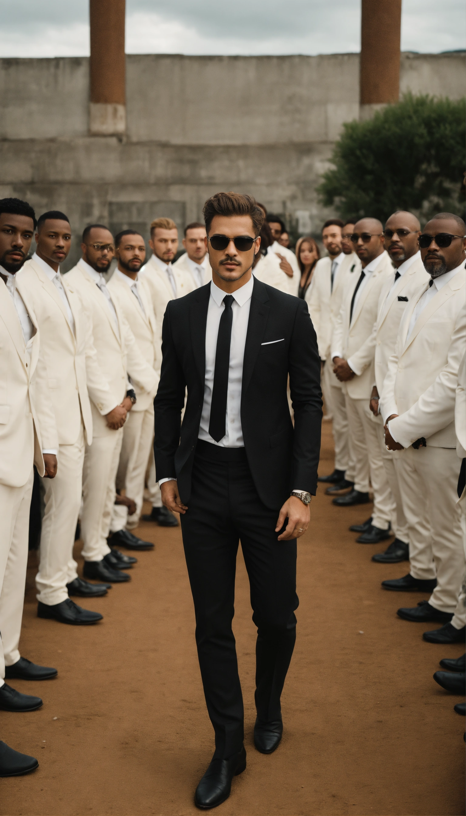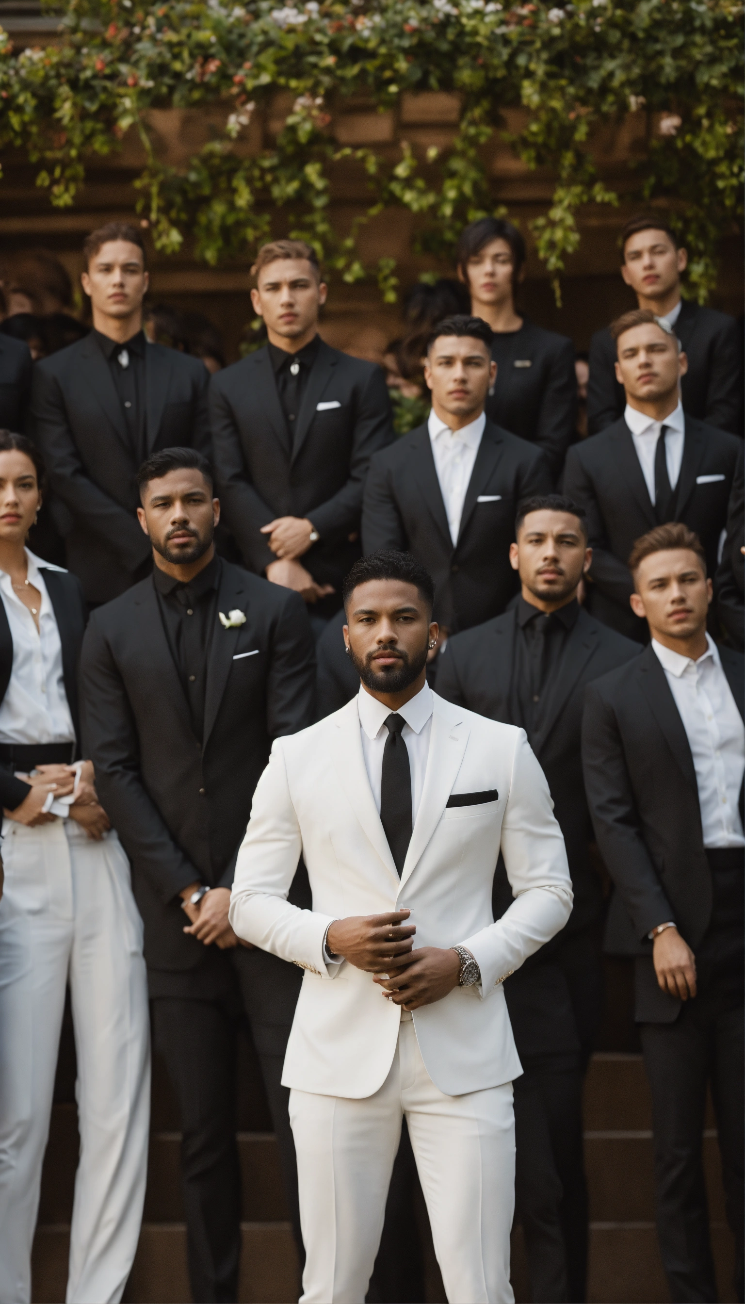 Confident man wearing an all black suit standing in middle of a group of people wearing white suits