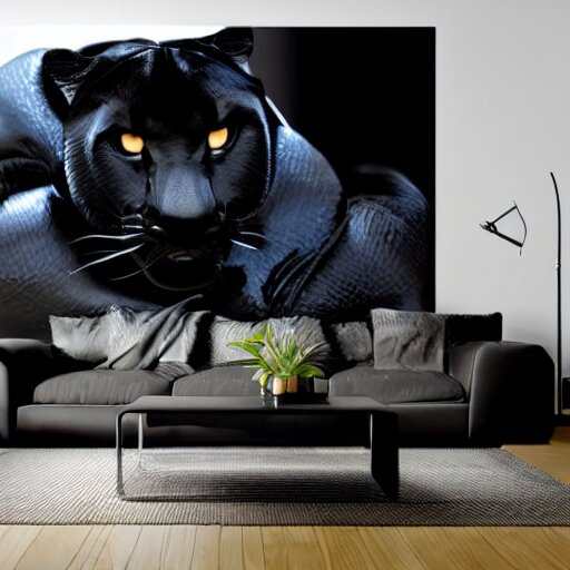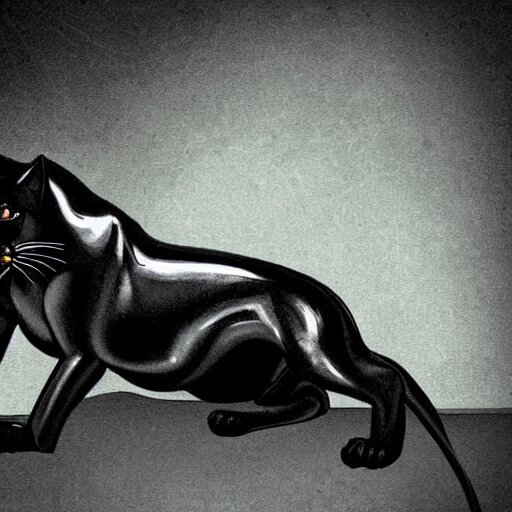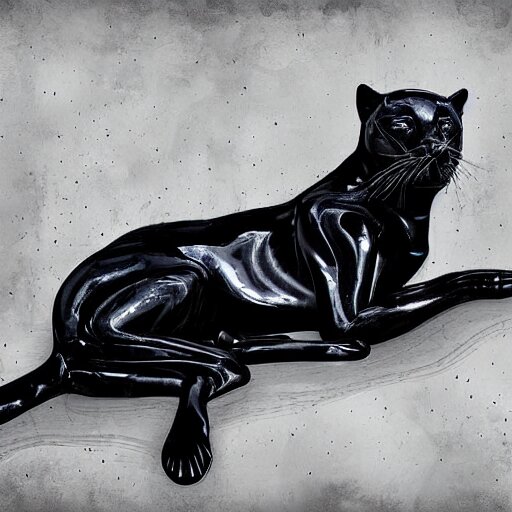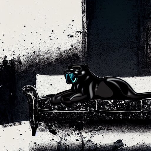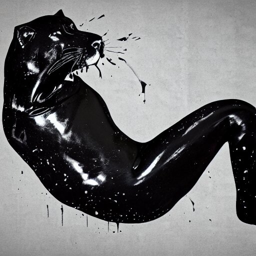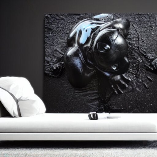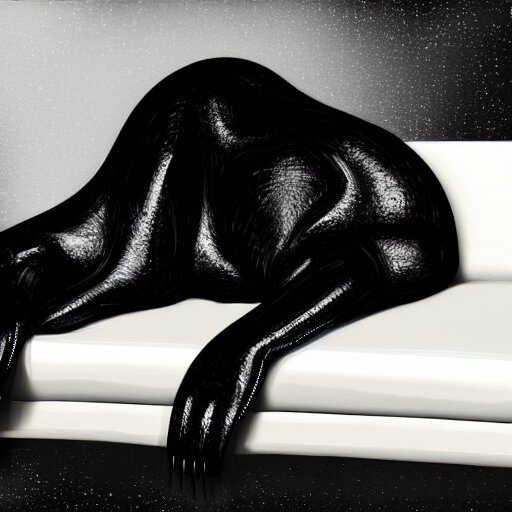 A shiny black goo covered panther laying on a tar covered white couch in a living room, dripping and drooling black goo. digital art