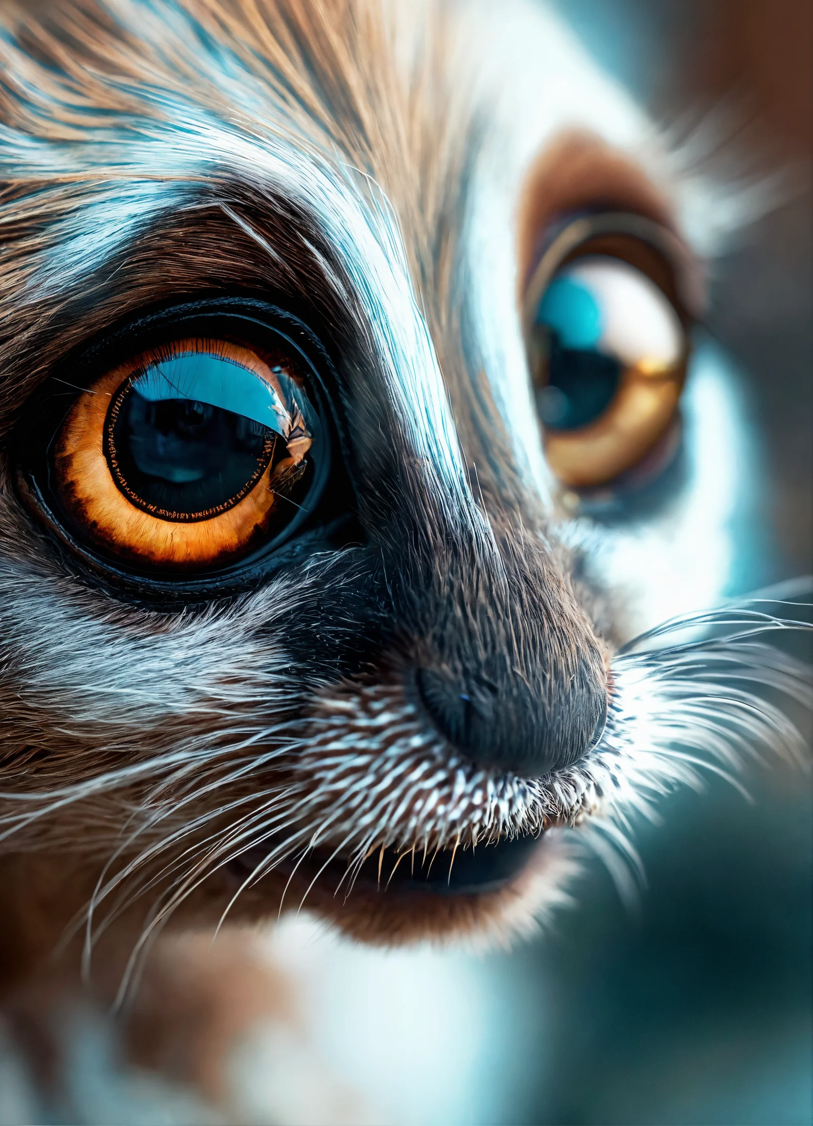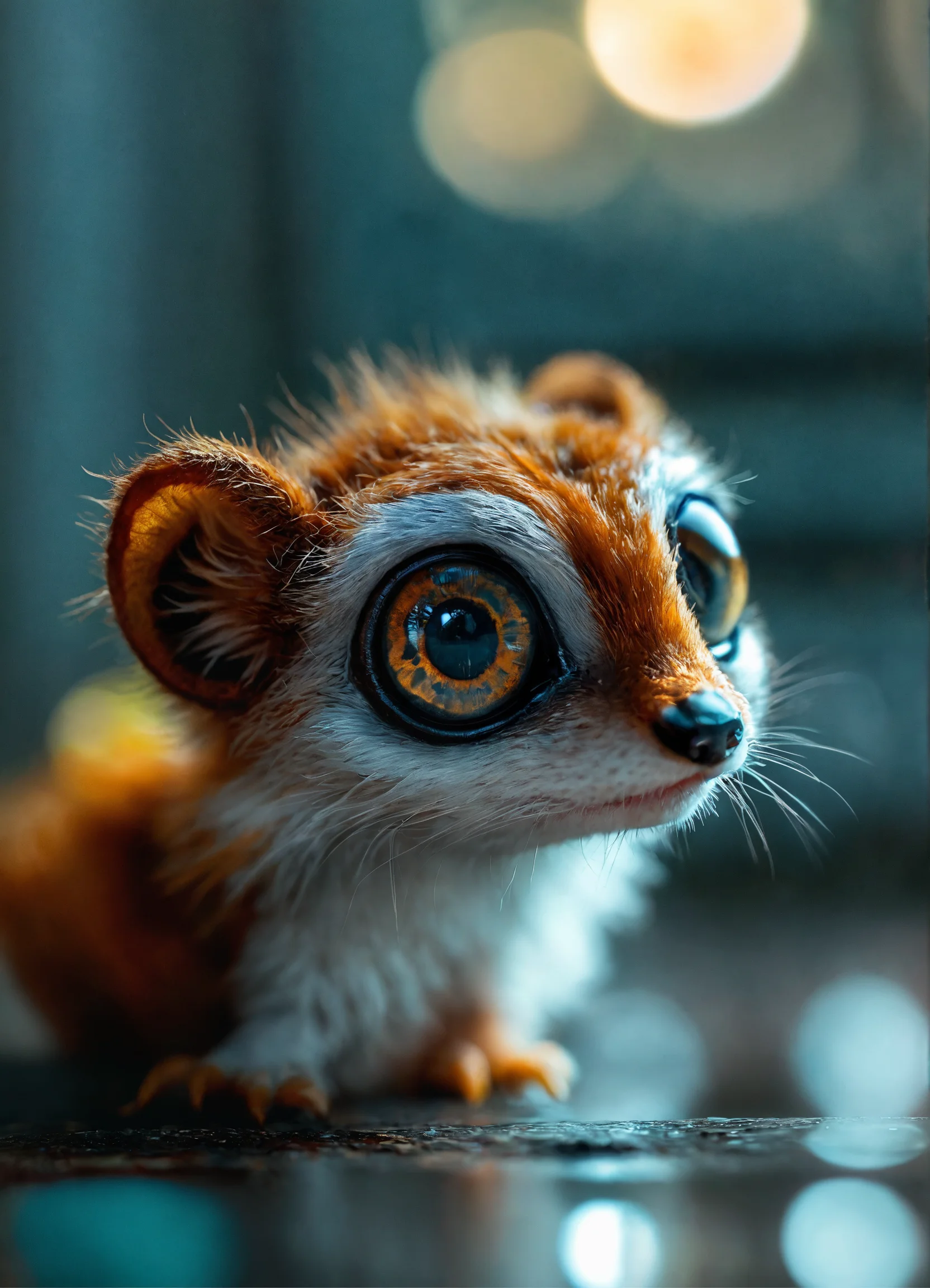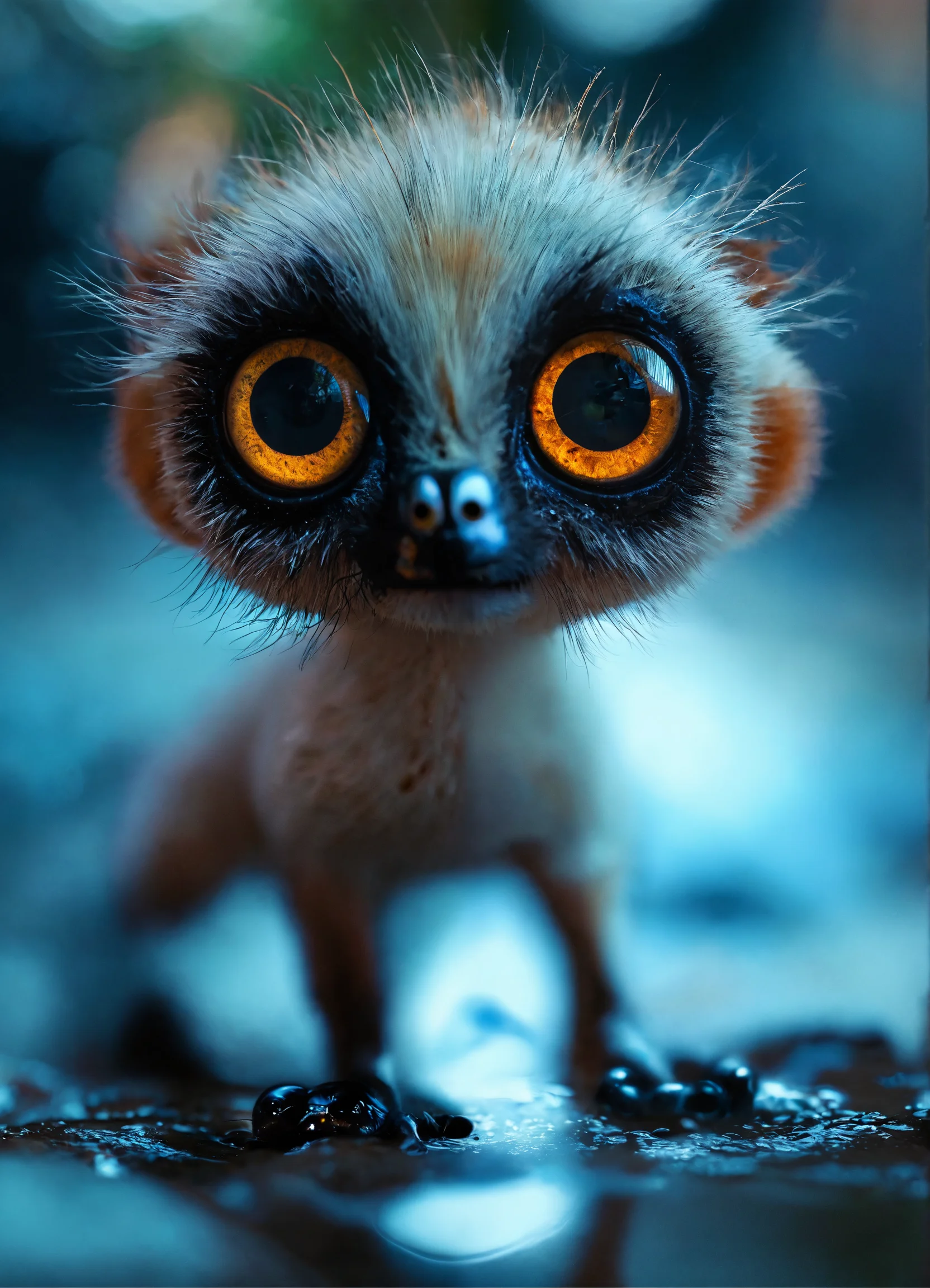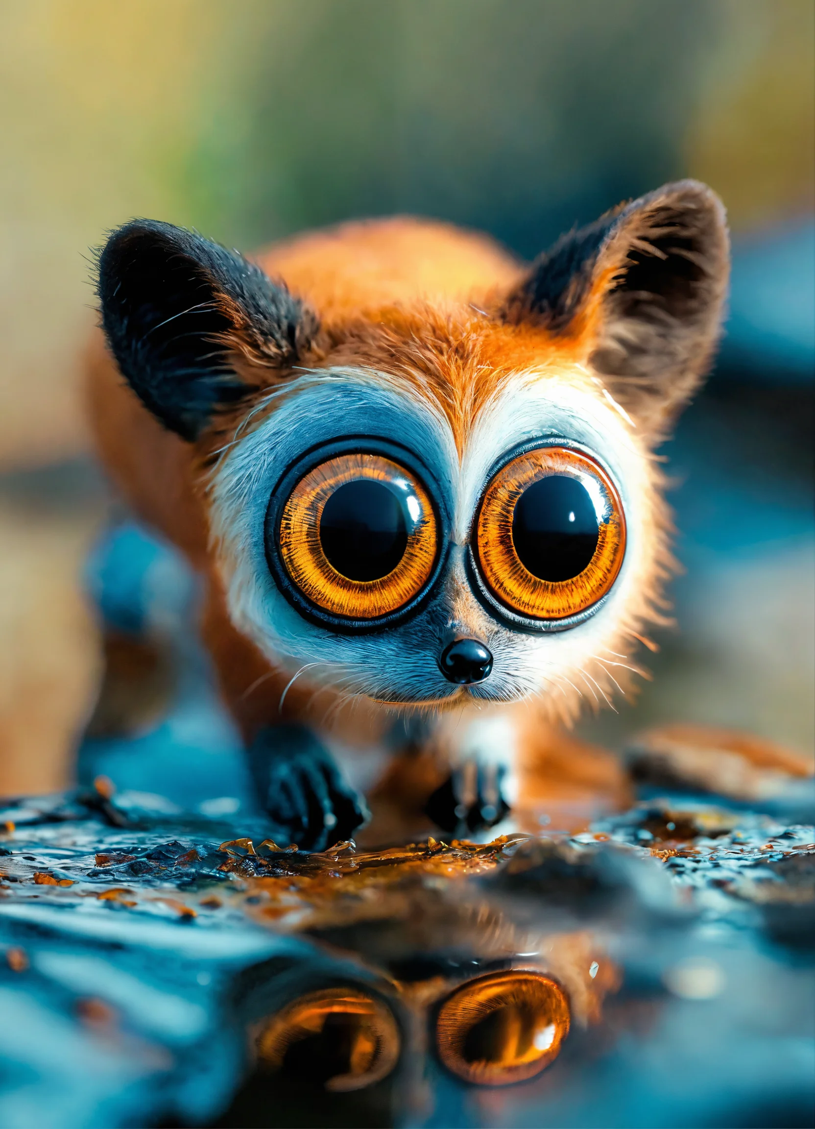 Cute animal with big reflective eyes, realistic, photographed in soft light, long exposure, 8k resolution image, glossy and shiny.