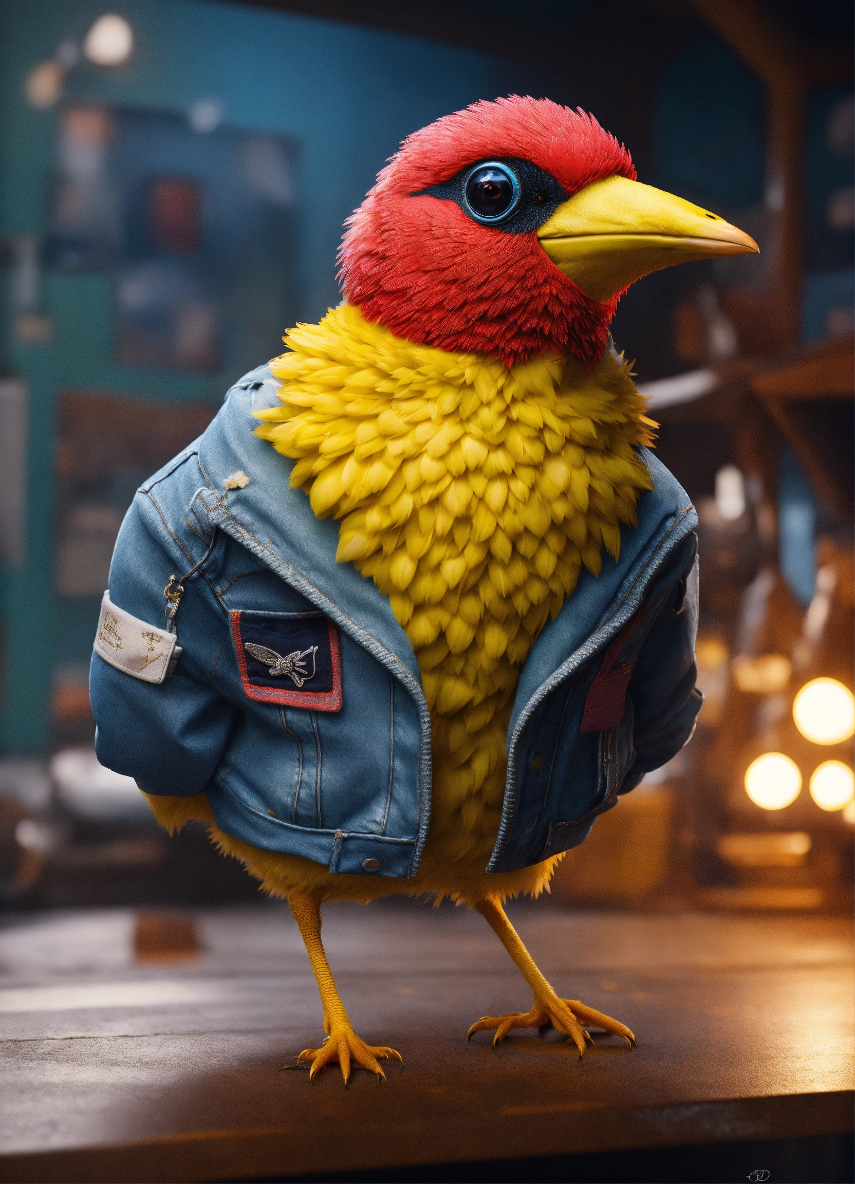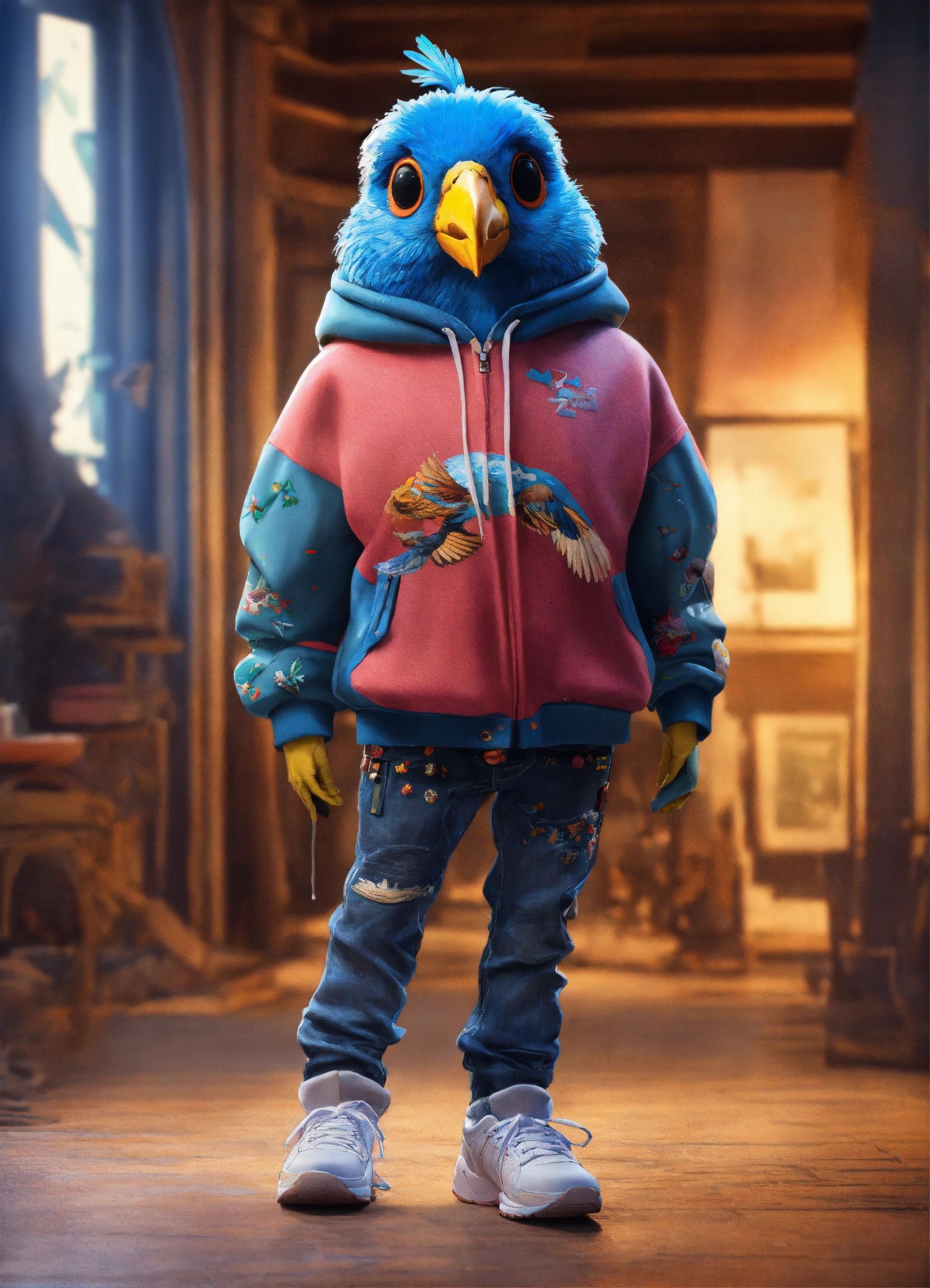 Extremely realistic dressed bird. in a sweatshirt, jeans and sneakers. volumetric lighting, maximalist photo illustrations, 8k concept art, meticulously detailed, complex, expansive, fantastical.